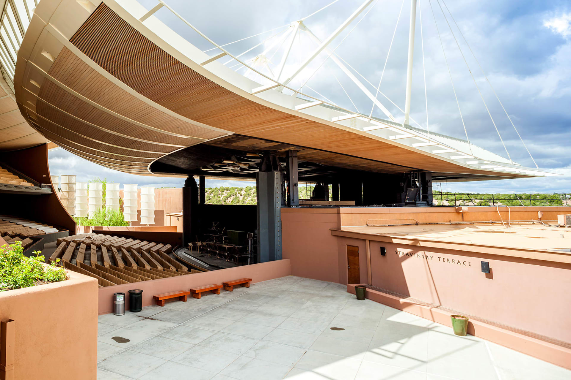 Featuring a sweeping, “shape of the sound” stage and roof design that informs the crisp, clear acoustics, it is open on three sides. Panoramic views of the Sangre de Cristo Mountains in the east and the Jemez Mountains in the west serve to enhance the onstage performances. Stunning sunsets and dramatic lightning storms often serve as the backdrop for the operas onstage.