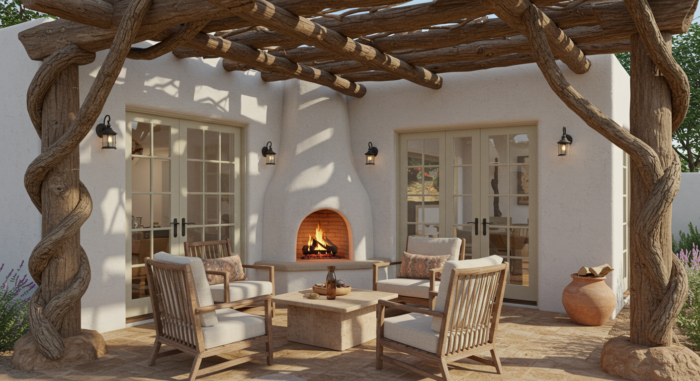 Next to the adobe structure, one of the most recognizable elements of the Santa Fe style is both indoor and outdoor Kiva fireplaces. Sometimes referred to as “adobe fireplaces,” “beehive fireplaces,” or “pueblo fireplaces,” the Kiva fireplace generally has a curved beehive look and is smooth in appearance.