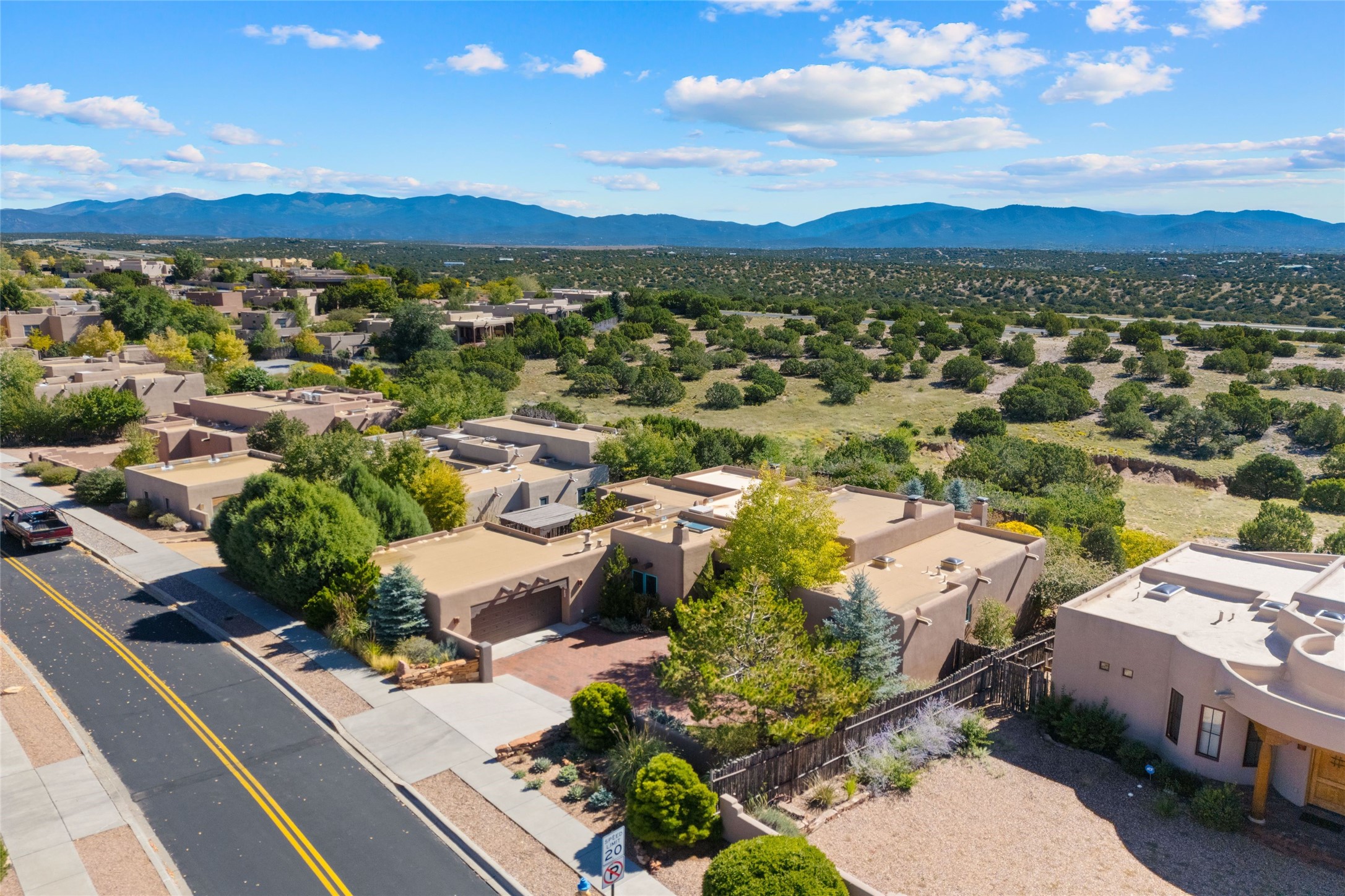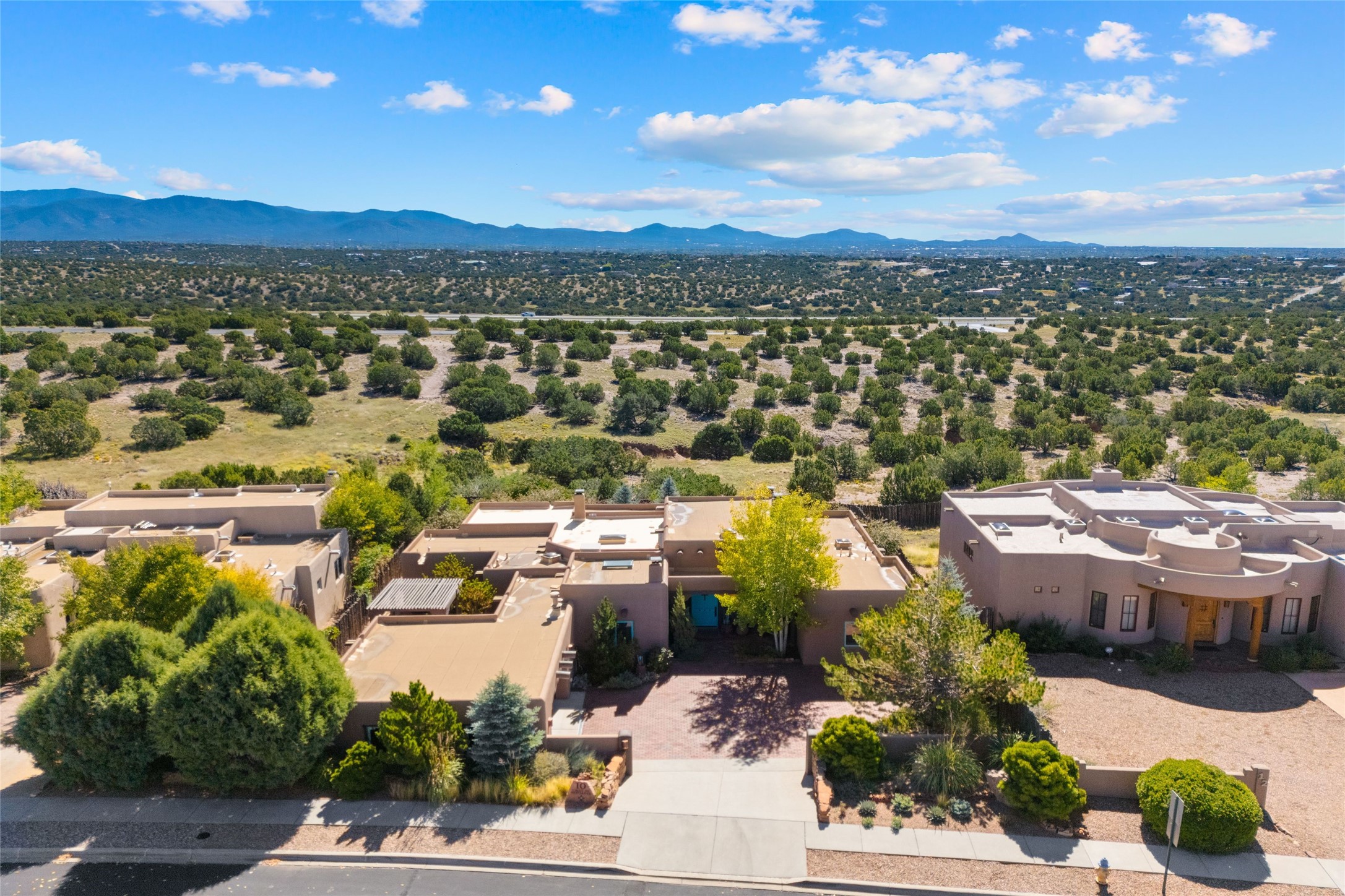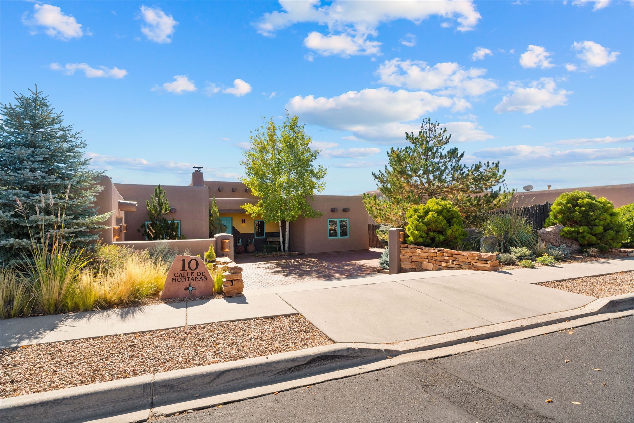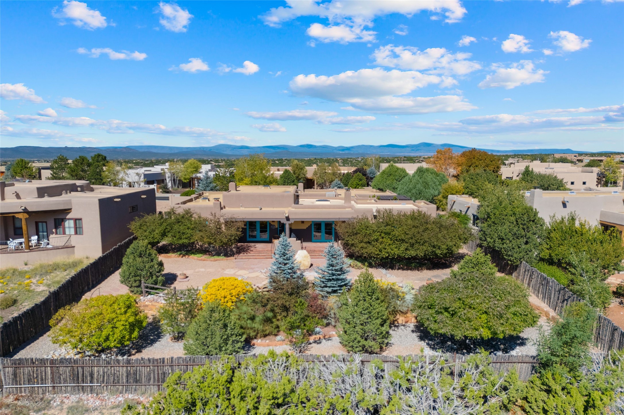 Striking Aldea 3-bedroom, 2.5-bath home bordering rolling green open spaces and surrounded by a National Wildlife Certified Wildlife Habitat. Protected, unobstructed views of the majestic Sangre de Cristo mountains. Located on a cul-de-sac, this beautifully landscaped property features a meticulously maintained yard equipped with a 4-zone drip irrigation system, showcasing Austrian pines, blue spruces, and an array of vibrant plants and trees--curb appeal galore. Step inside to find a harmonious blend of rustic charm and modern convenience, highlighted by exposed beams, high ceilings with vigas, nichos and four fireplaces, creating cozy and inviting spaces throughout. Updated kitchen, complete with a coffered ceiling. The split bedroom plan offers privacy and comfort for families or guests. Plus, a bonus room/office provides extra space for work or creative endeavors. Large laundry room leads to an oversized 2-car garage featuring custom built-in shelving. Outdoor living is enhanced by a hot spring 6-person above-ground heated hot tub with pergola and a serene backyard fountain, both of which will convey to the new owner. Aldea is a vibrant community offering an array of amenities. Enjoy tennis and pickleball courts, a playground, a basketball court, a labyrinth, bocce ball, and scenic walking trails. The community building serves as a hub for exercise classes, meetings, and social gatherings, fostering a sense of community.