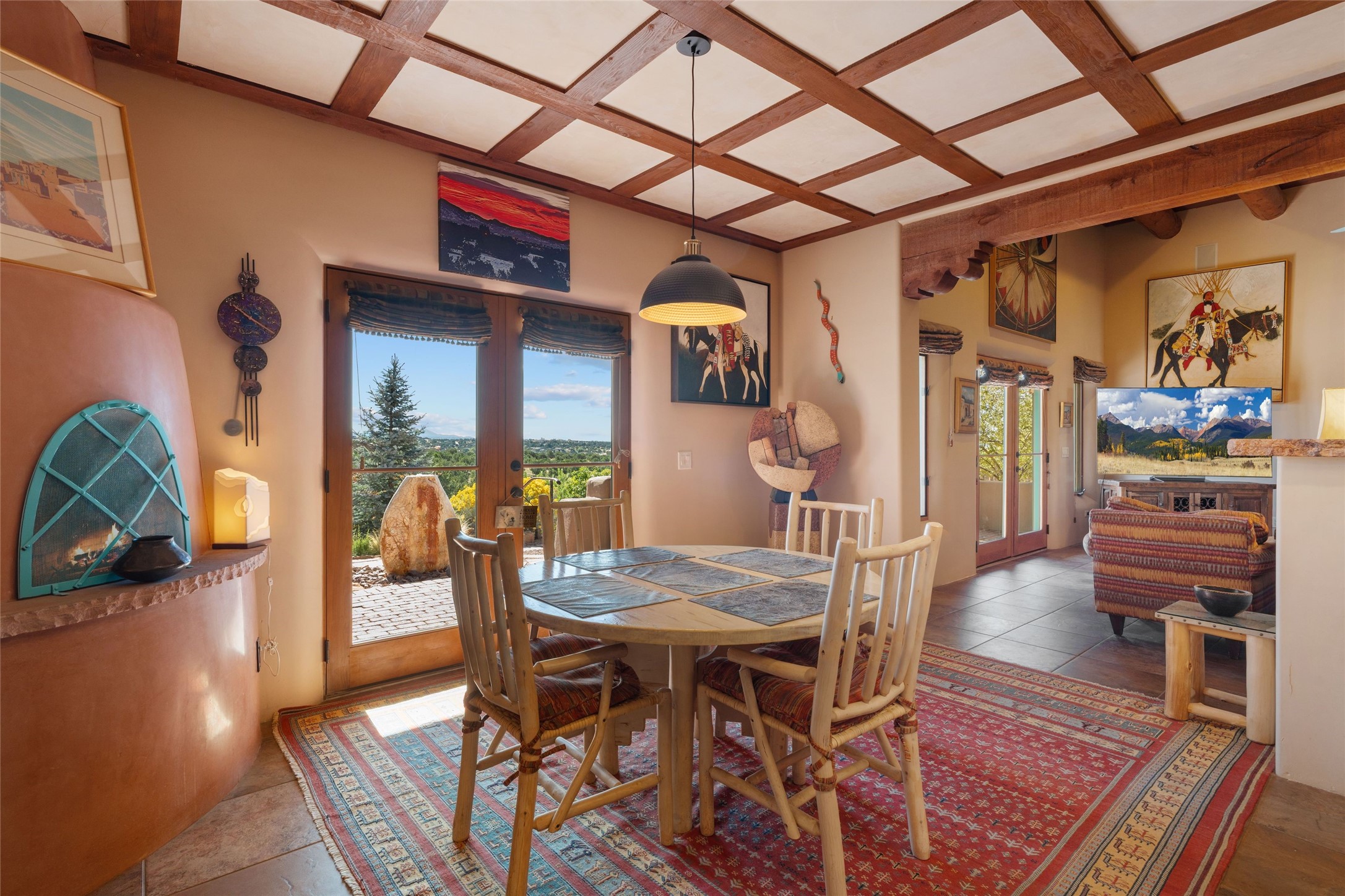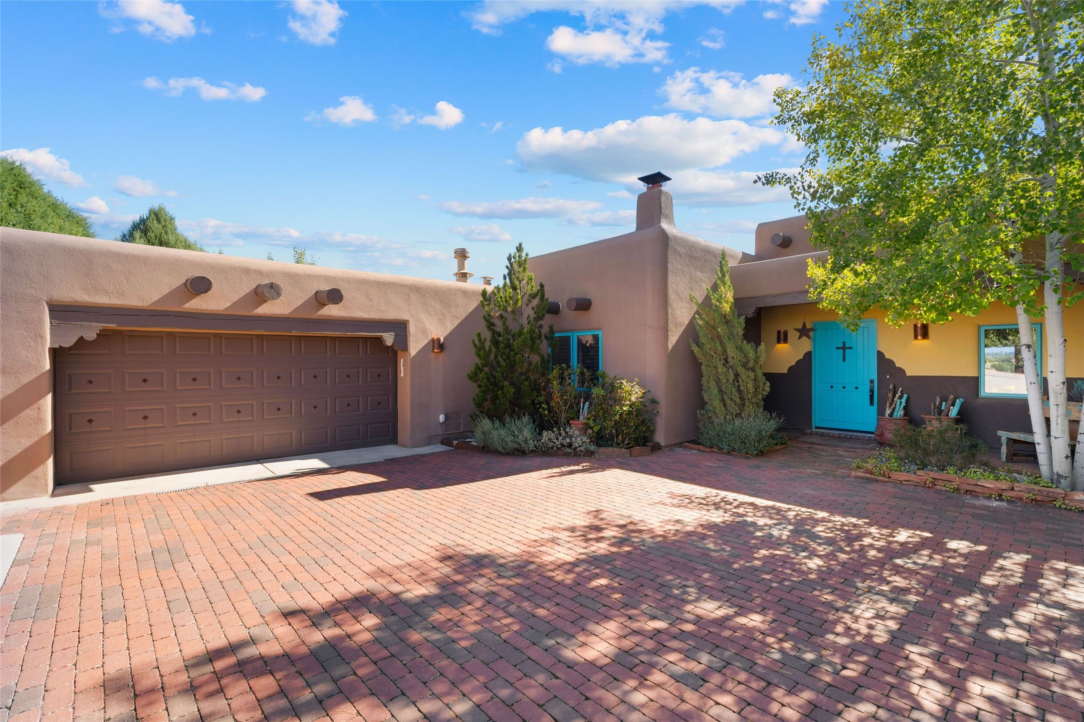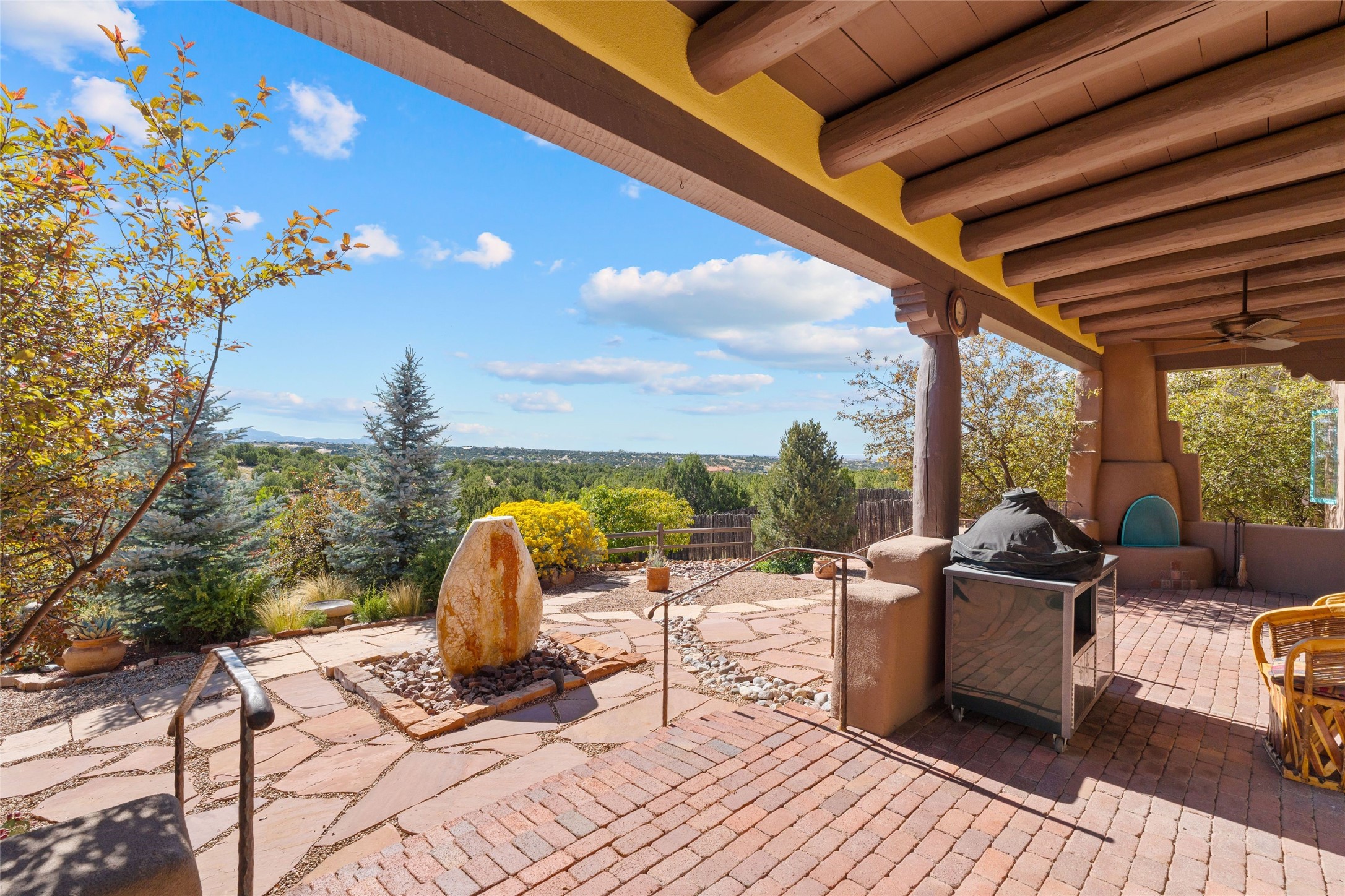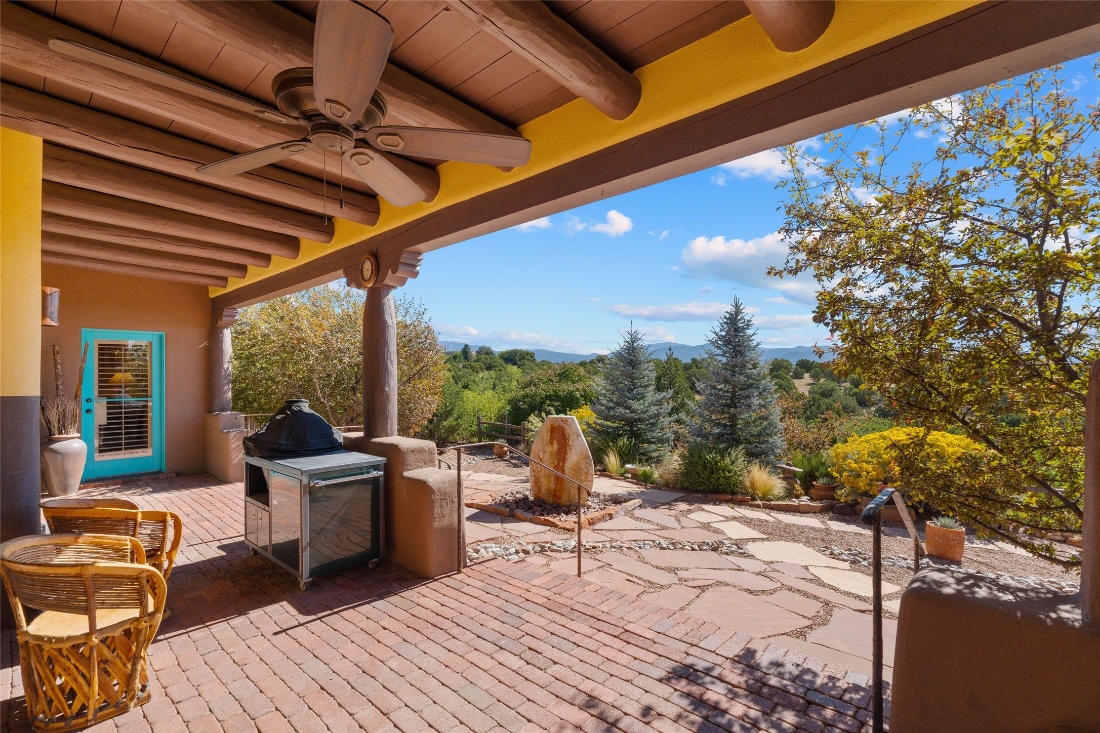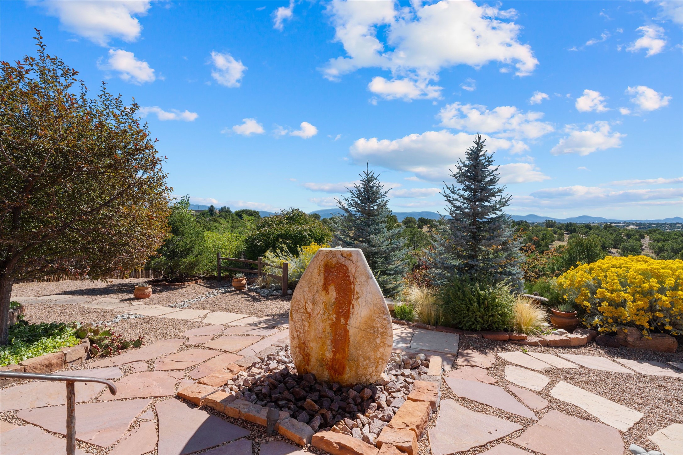 Striking Aldea 3-bedroom, 2.5-bath home bordering rolling green open spaces and surrounded by a National Wildlife Certified Wildlife Habitat. Protected, unobstructed views of the majestic Sangre de Cristo mountains. Located on a cul-de-sac, this beautifully landscaped property features a meticulously maintained yard equipped with a 4-zone drip irrigation system, showcasing Austrian pines, blue spruces, and an array of vibrant plants and trees--curb appeal galore. Step inside to find a harmonious blend of rustic charm and modern convenience, highlighted by exposed beams, high ceilings with vigas, nichos and four fireplaces, creating cozy and inviting spaces throughout. Updated kitchen, complete with a coffered ceiling. The split bedroom plan offers privacy and comfort for families or guests. Plus, a bonus room/office provides extra space for work or creative endeavors. Large laundry room leads to an oversized 2-car garage featuring custom built-in shelving. Outdoor living is enhanced by a hot spring 6-person above-ground heated hot tub with pergola and a serene backyard fountain, both of which will convey to the new owner. Aldea is a vibrant community offering an array of amenities. Enjoy tennis and pickleball courts, a playground, a basketball court, a labyrinth, bocce ball, and scenic walking trails. The community building serves as a hub for exercise classes, meetings, and social gatherings, fostering a sense of community.