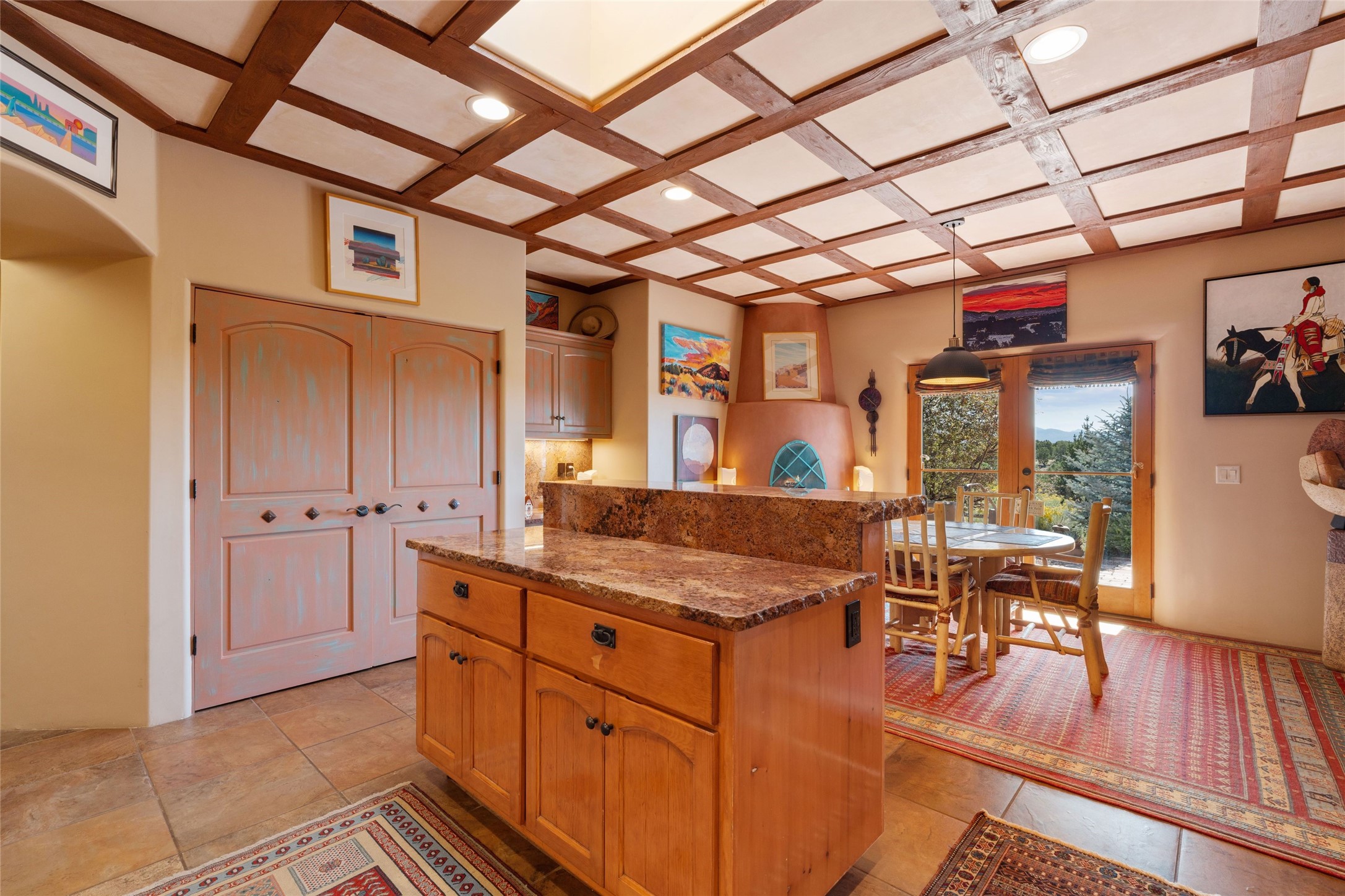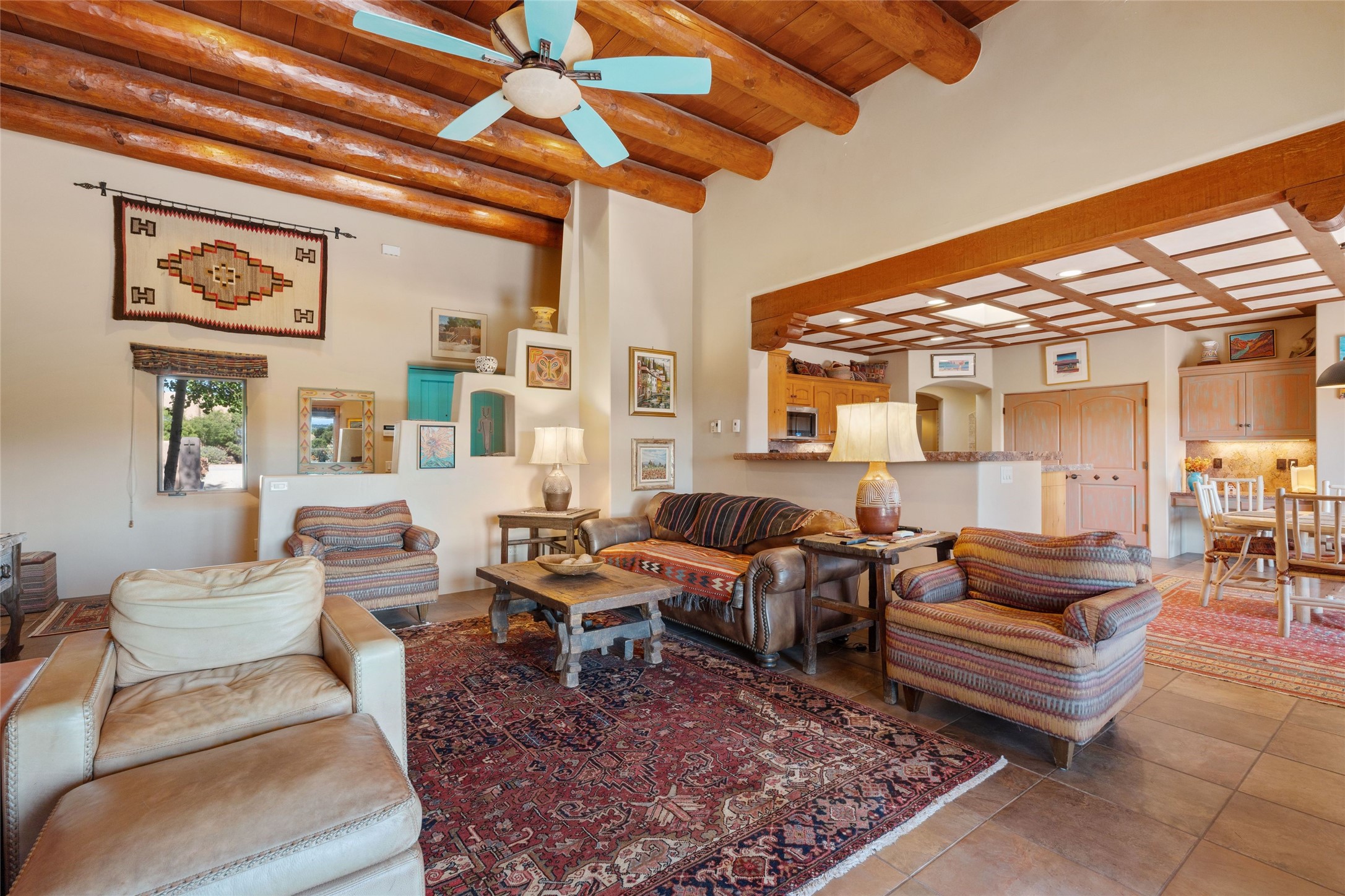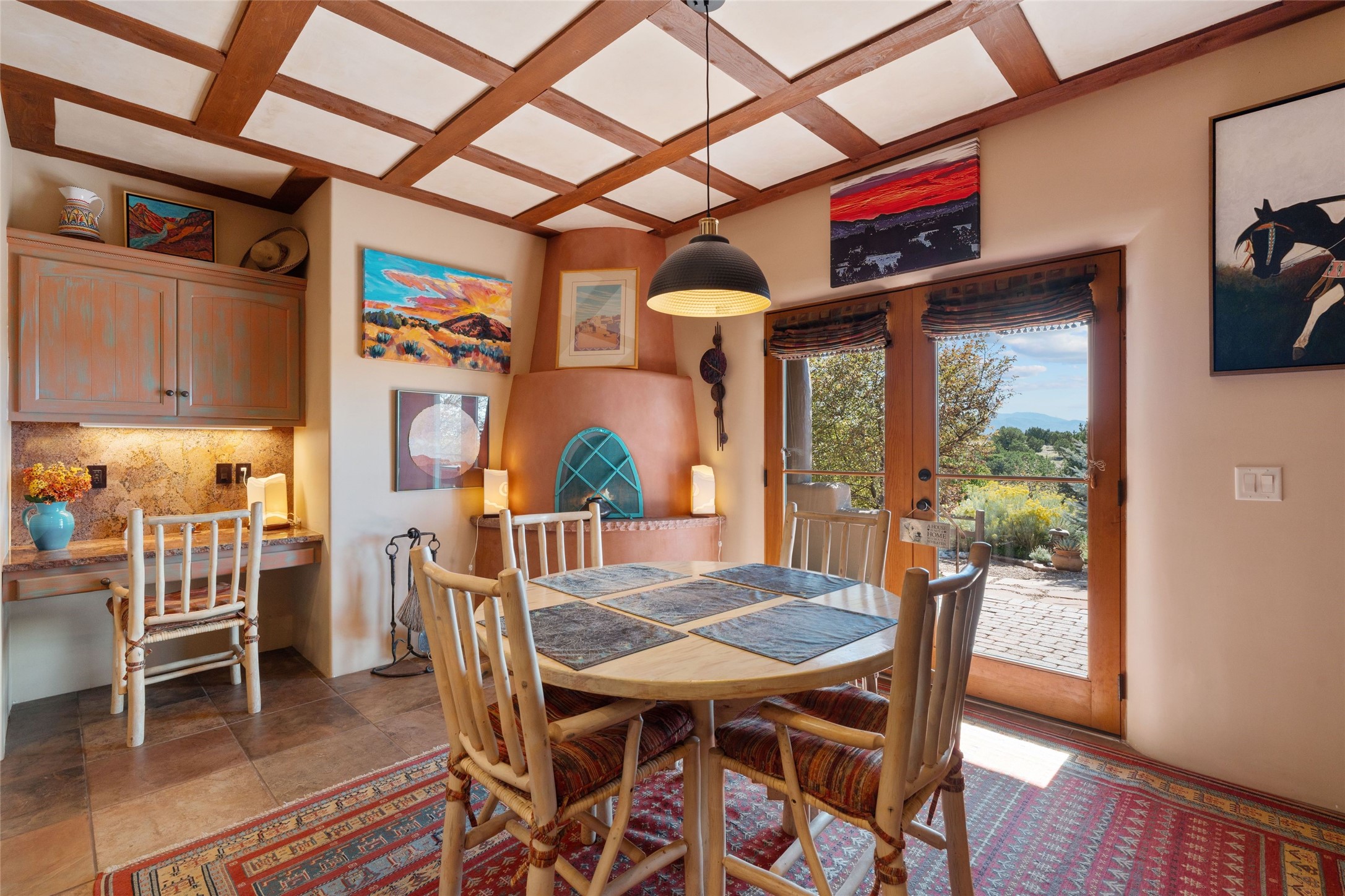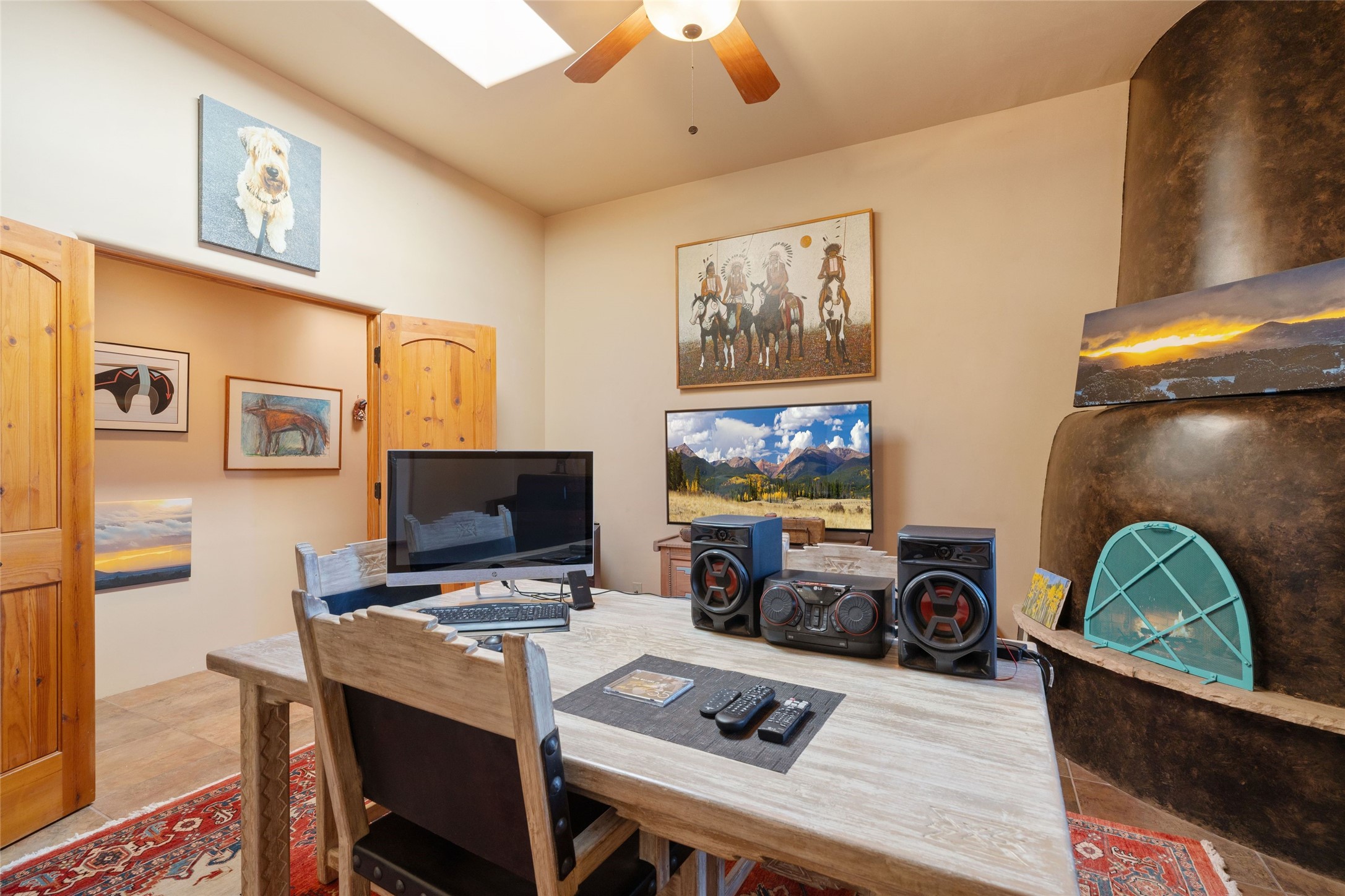 Striking Aldea 3-bedroom, 2.5-bath home bordering rolling green open spaces and surrounded by a National Wildlife Certified Wildlife Habitat. Protected, unobstructed views of the majestic Sangre de Cristo mountains. Located on a cul-de-sac, this beautifully landscaped property features a meticulously maintained yard equipped with a 4-zone drip irrigation system, showcasing Austrian pines, blue spruces, and an array of vibrant plants and trees--curb appeal galore. Step inside to find a harmonious blend of rustic charm and modern convenience, highlighted by exposed beams, high ceilings with vigas, nichos and four fireplaces, creating cozy and inviting spaces throughout. Updated kitchen, complete with a coffered ceiling. The split bedroom plan offers privacy and comfort for families or guests. Plus, a bonus room/office provides extra space for work or creative endeavors. Large laundry room leads to an oversized 2-car garage featuring custom built-in shelving. Outdoor living is enhanced by a hot spring 6-person above-ground heated hot tub with pergola and a serene backyard fountain, both of which will convey to the new owner. Aldea is a vibrant community offering an array of amenities. Enjoy tennis and pickleball courts, a playground, a basketball court, a labyrinth, bocce ball, and scenic walking trails. The community building serves as a hub for exercise classes, meetings, and social gatherings, fostering a sense of community.