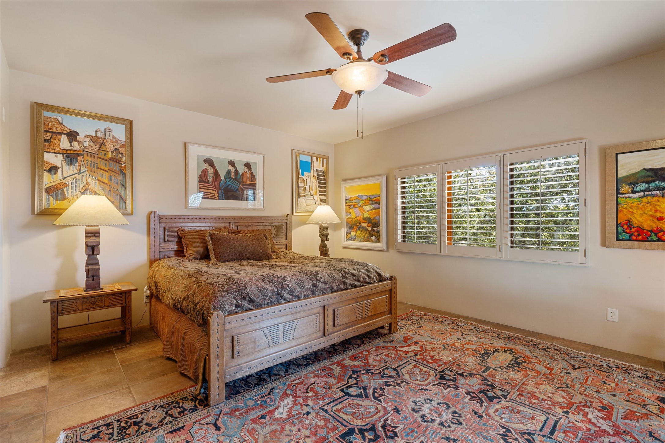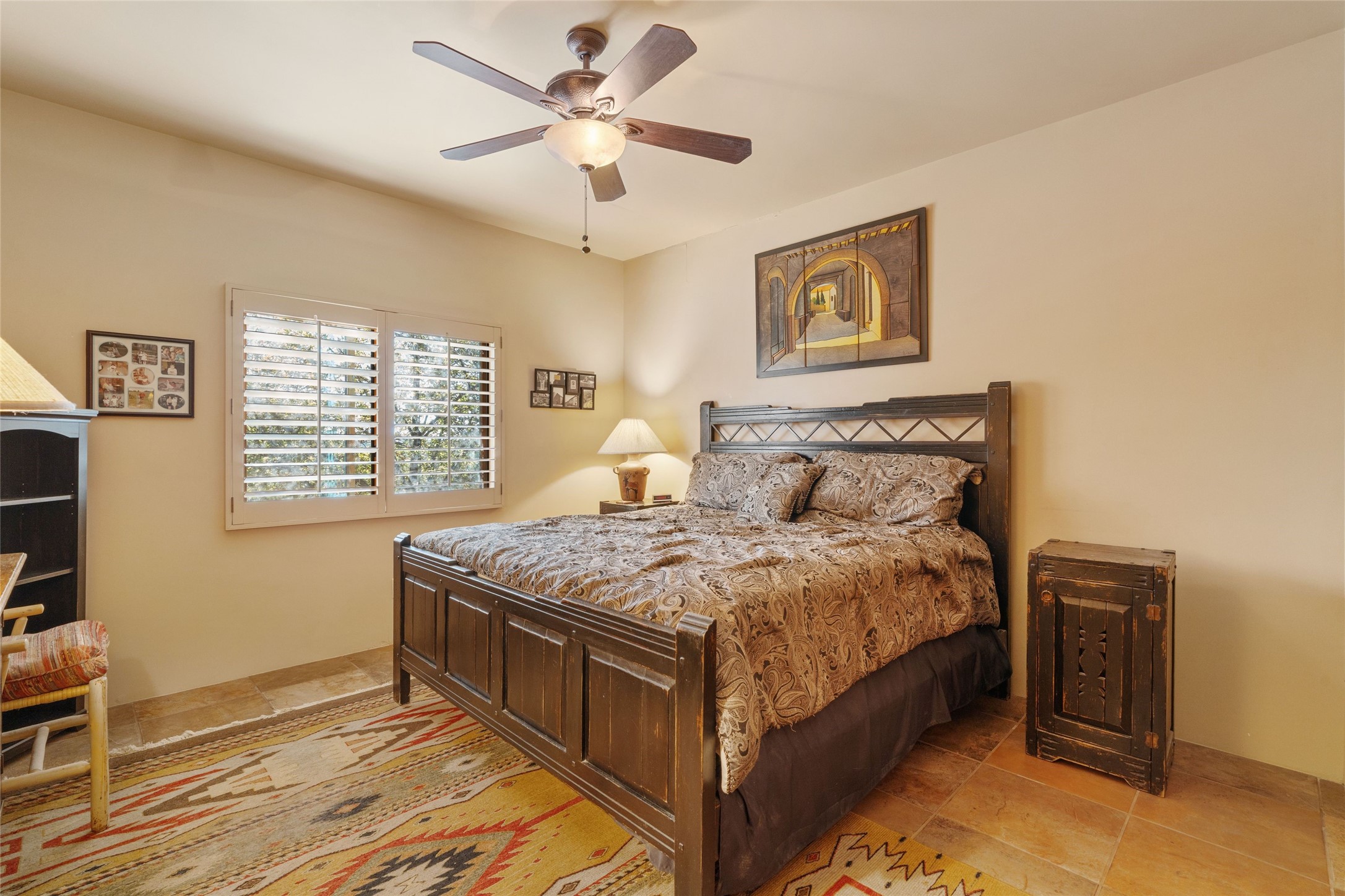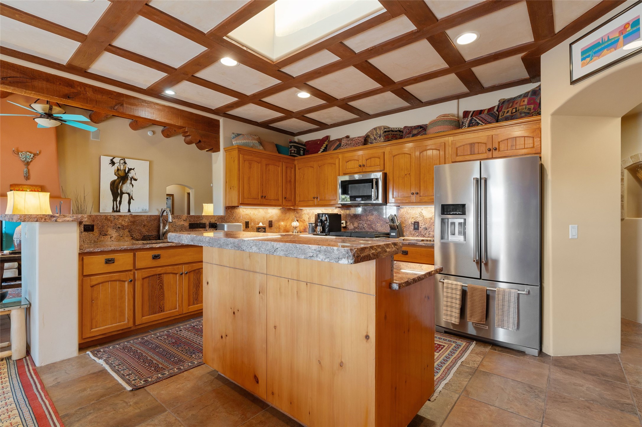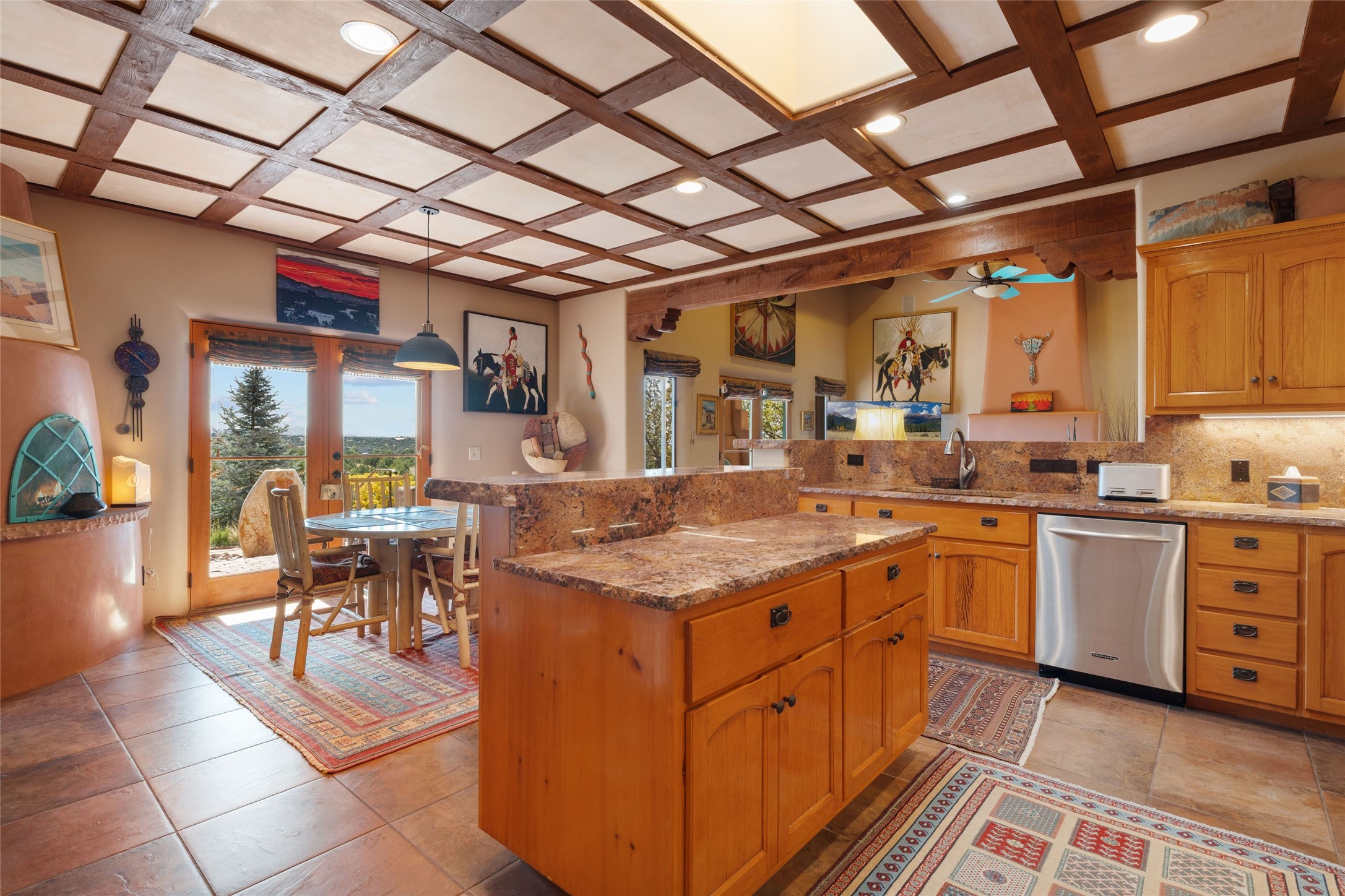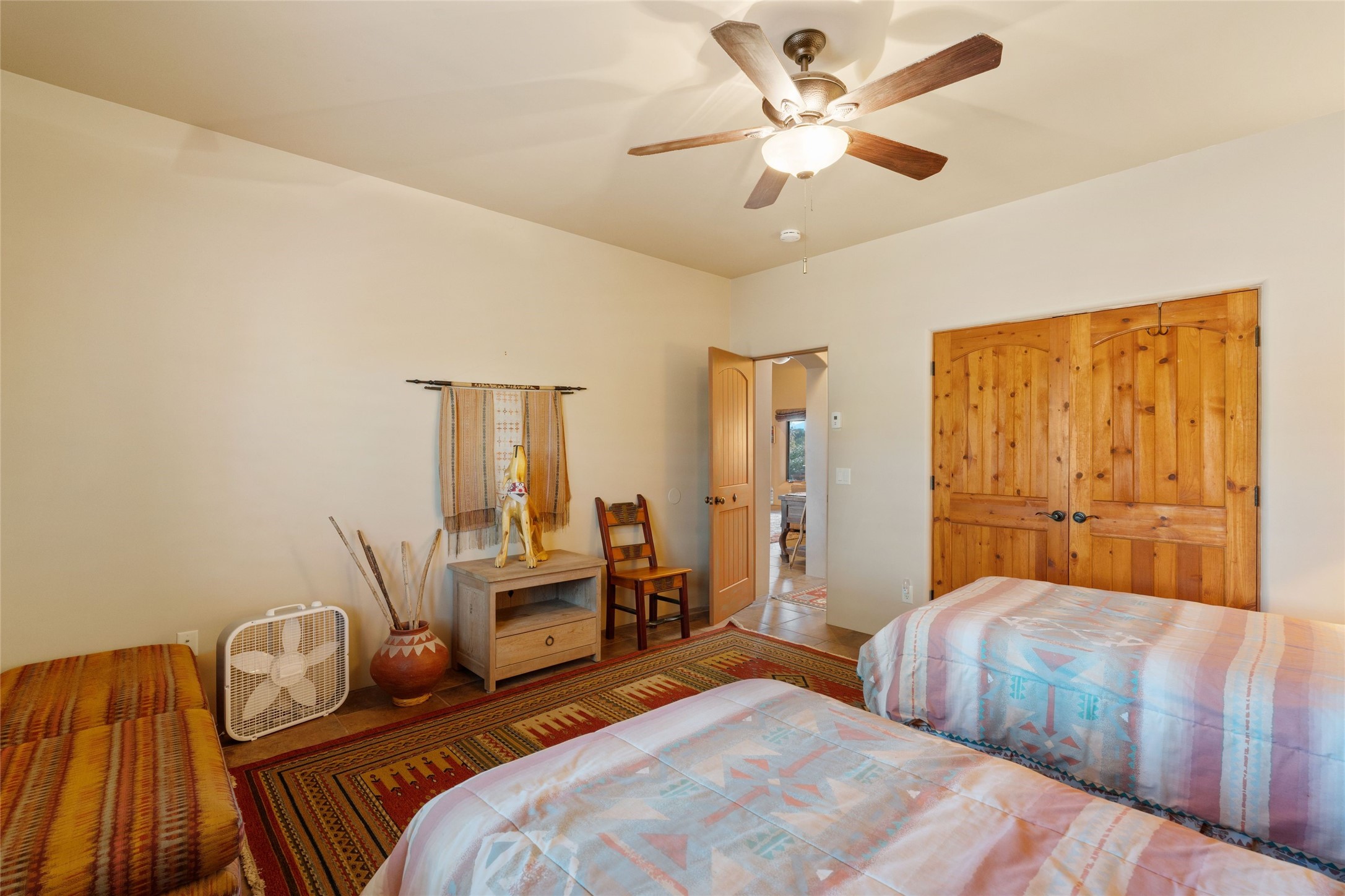 Striking Aldea 3-bedroom, 2.5-bath home bordering rolling green open spaces and surrounded by a National Wildlife Certified Wildlife Habitat. Protected, unobstructed views of the majestic Sangre de Cristo mountains. Located on a cul-de-sac, this beautifully landscaped property features a meticulously maintained yard equipped with a 4-zone drip irrigation system, showcasing Austrian pines, blue spruces, and an array of vibrant plants and trees--curb appeal galore. Step inside to find a harmonious blend of rustic charm and modern convenience, highlighted by exposed beams, high ceilings with vigas, nichos and four fireplaces, creating cozy and inviting spaces throughout. Updated kitchen, complete with a coffered ceiling. The split bedroom plan offers privacy and comfort for families or guests. Plus, a bonus room/office provides extra space for work or creative endeavors. Large laundry room leads to an oversized 2-car garage featuring custom built-in shelving. Outdoor living is enhanced by a hot spring 6-person above-ground heated hot tub with pergola and a serene backyard fountain, both of which will convey to the new owner. Aldea is a vibrant community offering an array of amenities. Enjoy tennis and pickleball courts, a playground, a basketball court, a labyrinth, bocce ball, and scenic walking trails. The community building serves as a hub for exercise classes, meetings, and social gatherings, fostering a sense of community.
