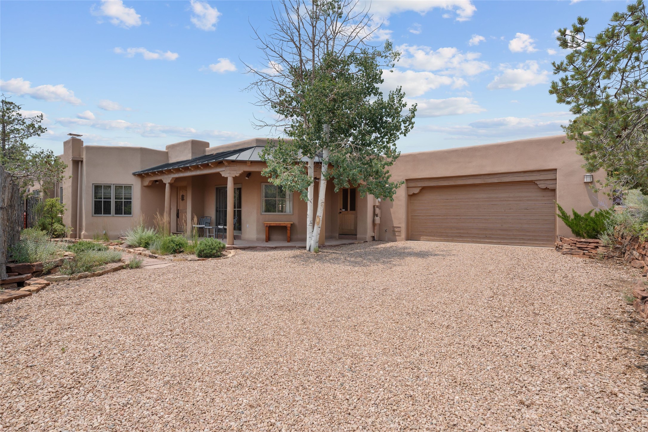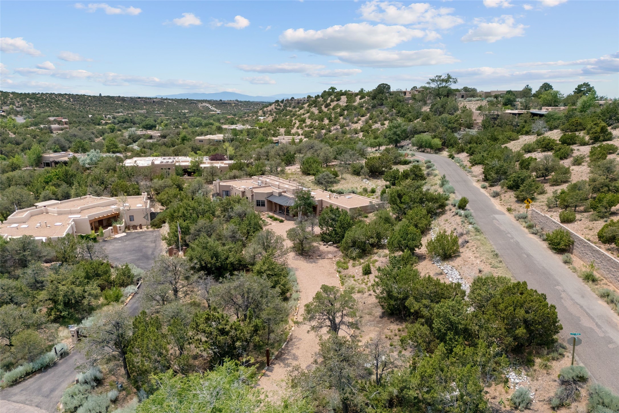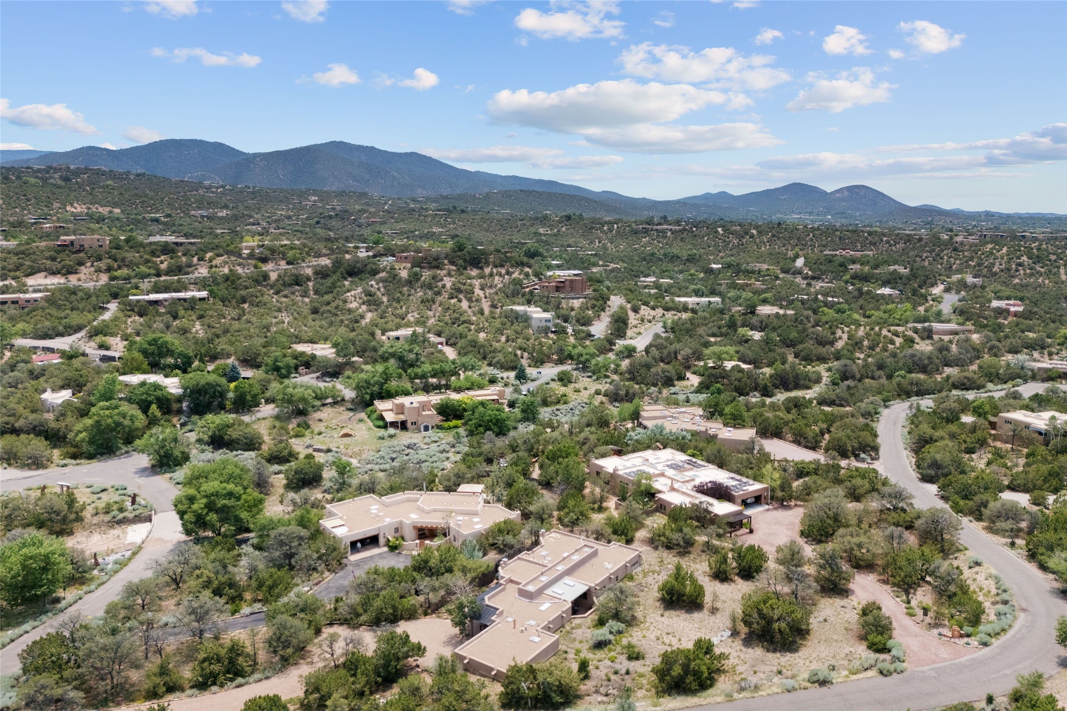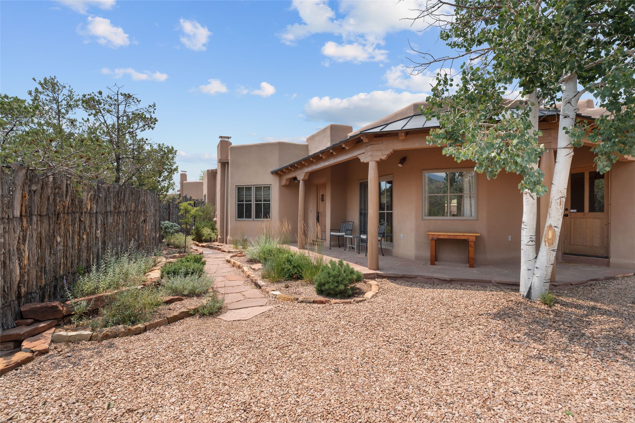 Prime Northside 3-bedroom, 2.5 home sited amidst Aspen and Pinon trees with stunning views of the Sangre de Cristo Mountains. This single-level residence features no interior steps. Embracing the iconic Santa Fe style, the home showcases Saltillo tile floors, banco seating, and elegant plaster walls, complemented by traditional vigas and latillas. Two kiva fireplaces add warmth and character. The separate dining area offers captivating views of the Sangres, creating a delightful backdrop for mealtime. The updated kitchen is designed with a large island for casual seating and French doors that open to a covered patio, ideal for outdoor dining or relaxation. The primary suite features its own kiva fireplace, along with a separate office or exercise space and an outdoor patio. Additionally, the home includes a two-car garage with extra storage, enhancing convenience. Surrounded by natural landscaping, this property offers a tranquil setting while being just under two miles from the vibrant heart of downtown Santa Fe.