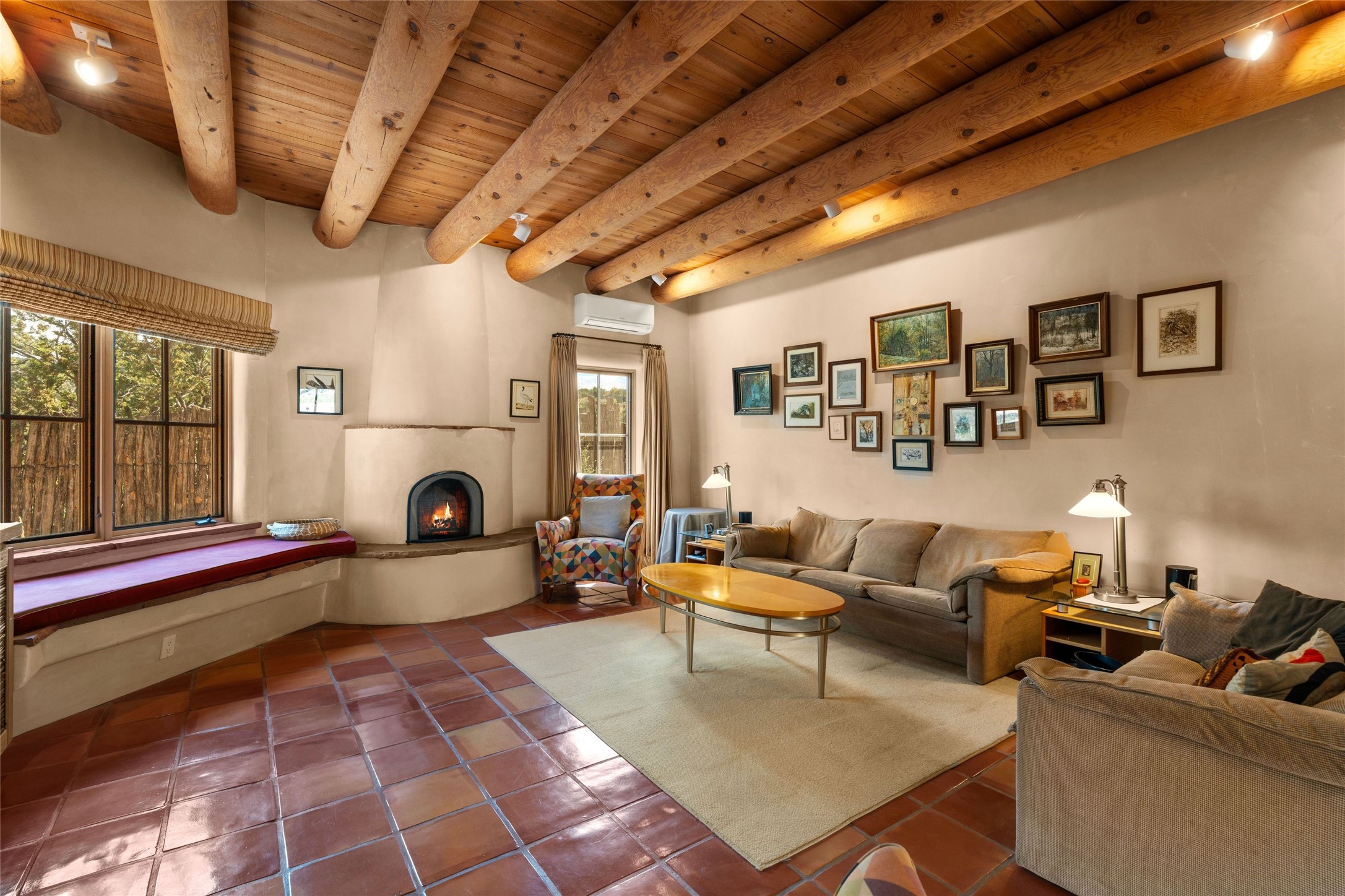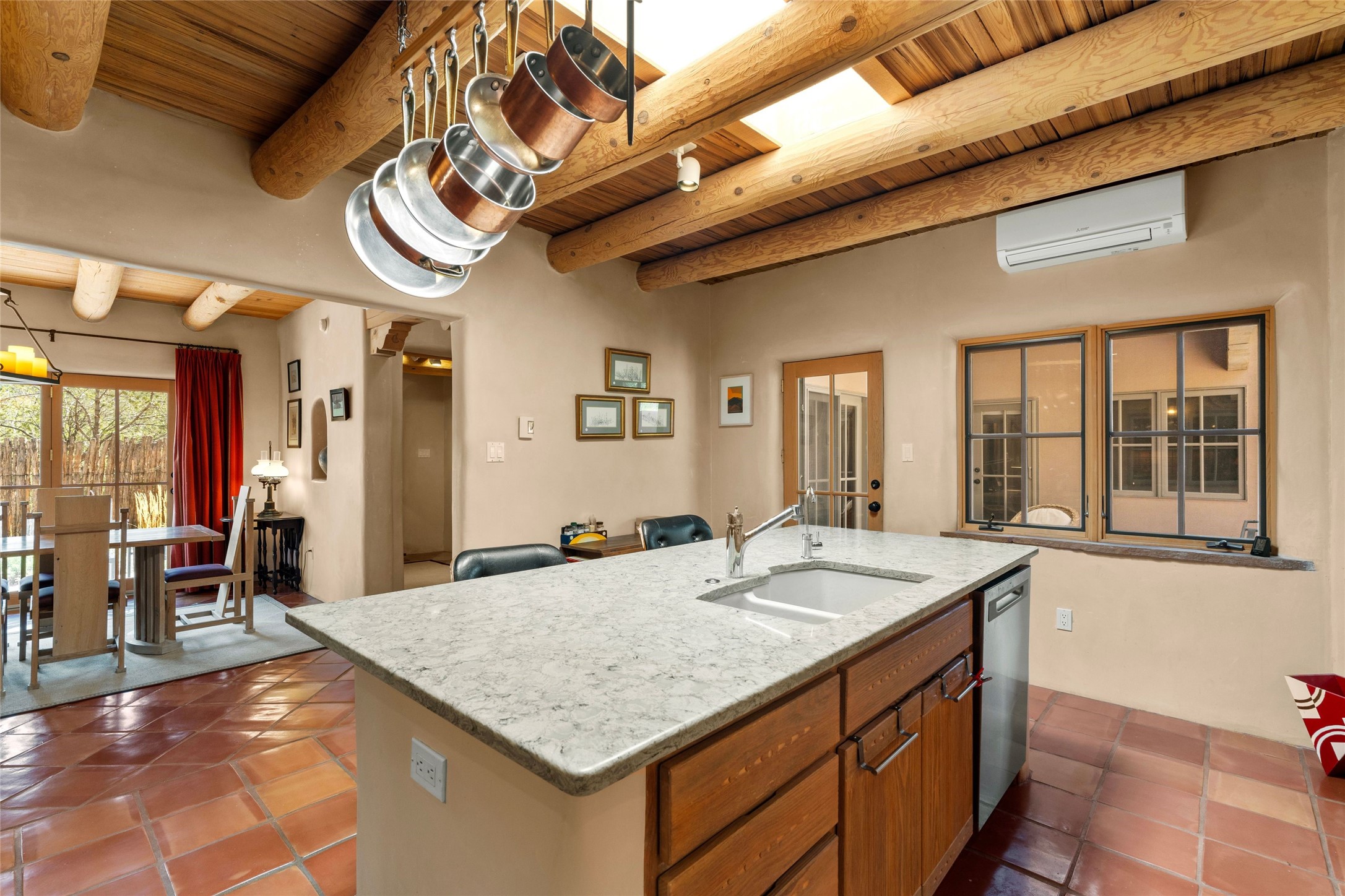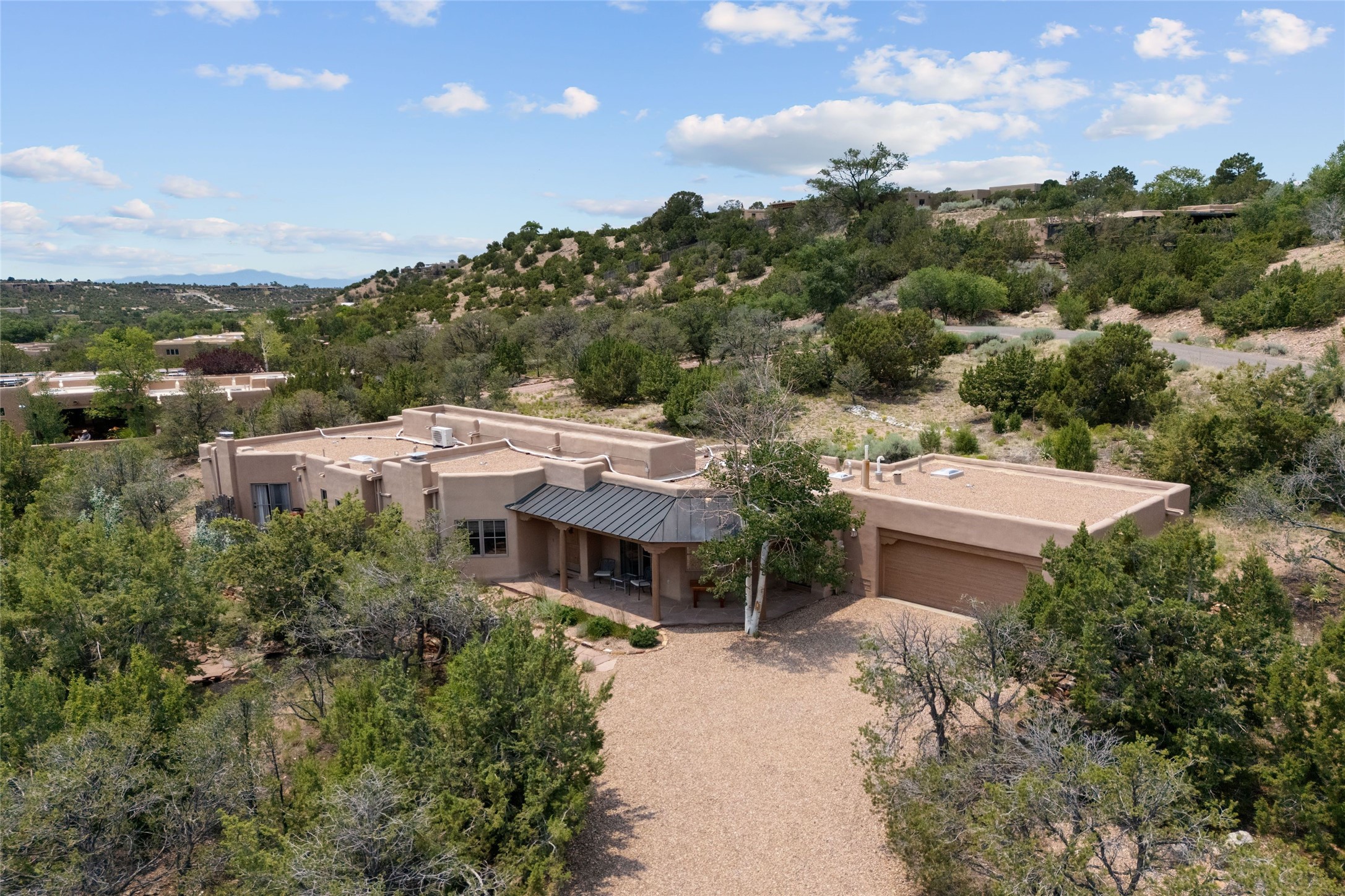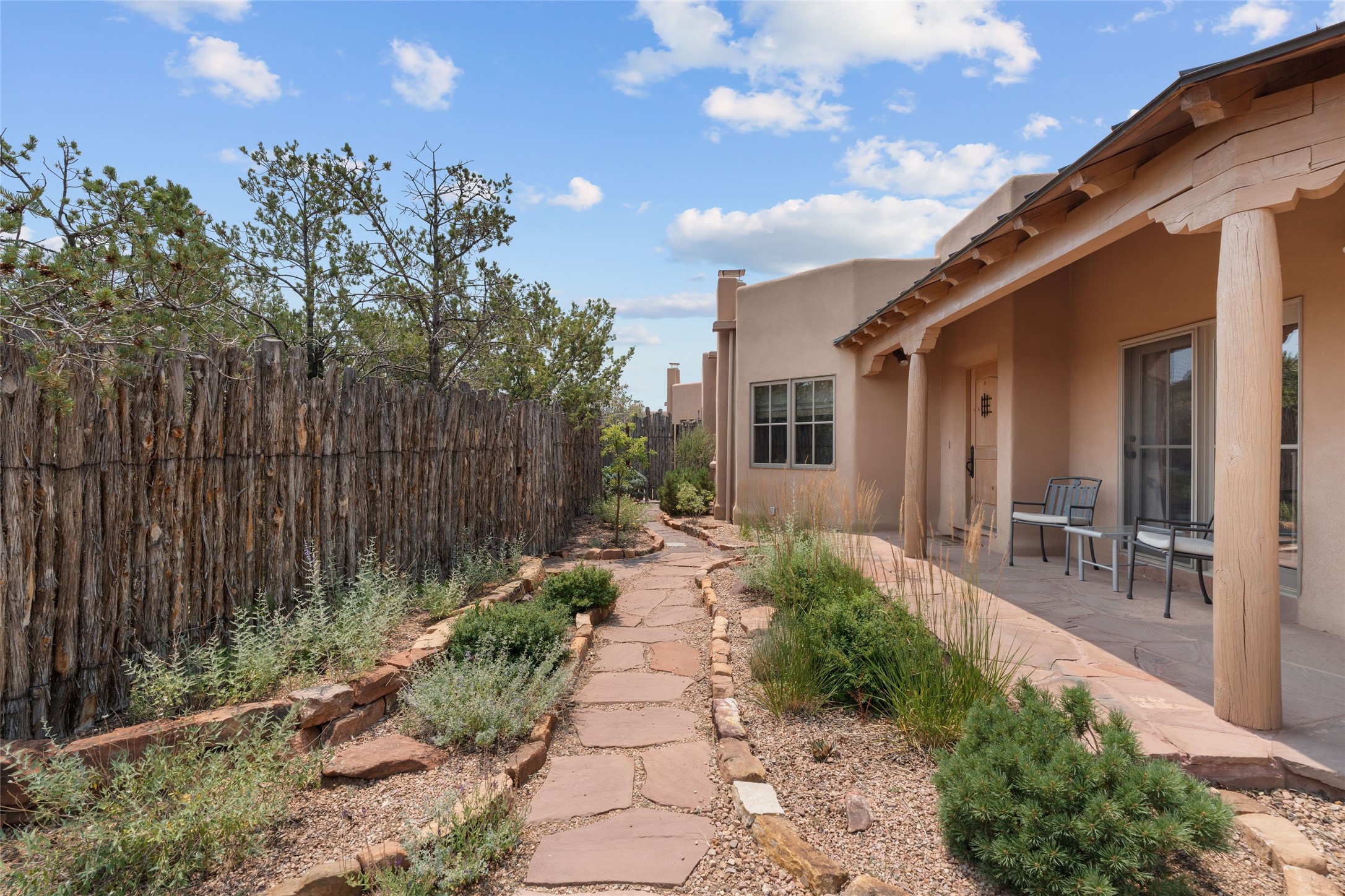 Prime Northside 3-bedroom, 2.5 home sited amidst Aspen and Pinon trees with stunning views of the Sangre de Cristo Mountains. This single-level residence features no interior steps. Embracing the iconic Santa Fe style, the home showcases Saltillo tile floors, banco seating, and elegant plaster walls, complemented by traditional vigas and latillas. Two kiva fireplaces add warmth and character. The separate dining area offers captivating views of the Sangres, creating a delightful backdrop for mealtime. The updated kitchen is designed with a large island for casual seating and French doors that open to a covered patio, ideal for outdoor dining or relaxation. The primary suite features its own kiva fireplace, along with a separate office or exercise space and an outdoor patio. Additionally, the home includes a two-car garage with extra storage, enhancing convenience. Surrounded by natural landscaping, this property offers a tranquil setting while being just under two miles from the vibrant heart of downtown Santa Fe.