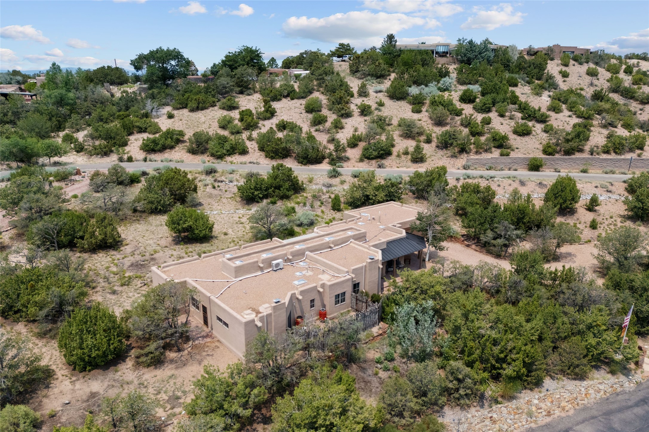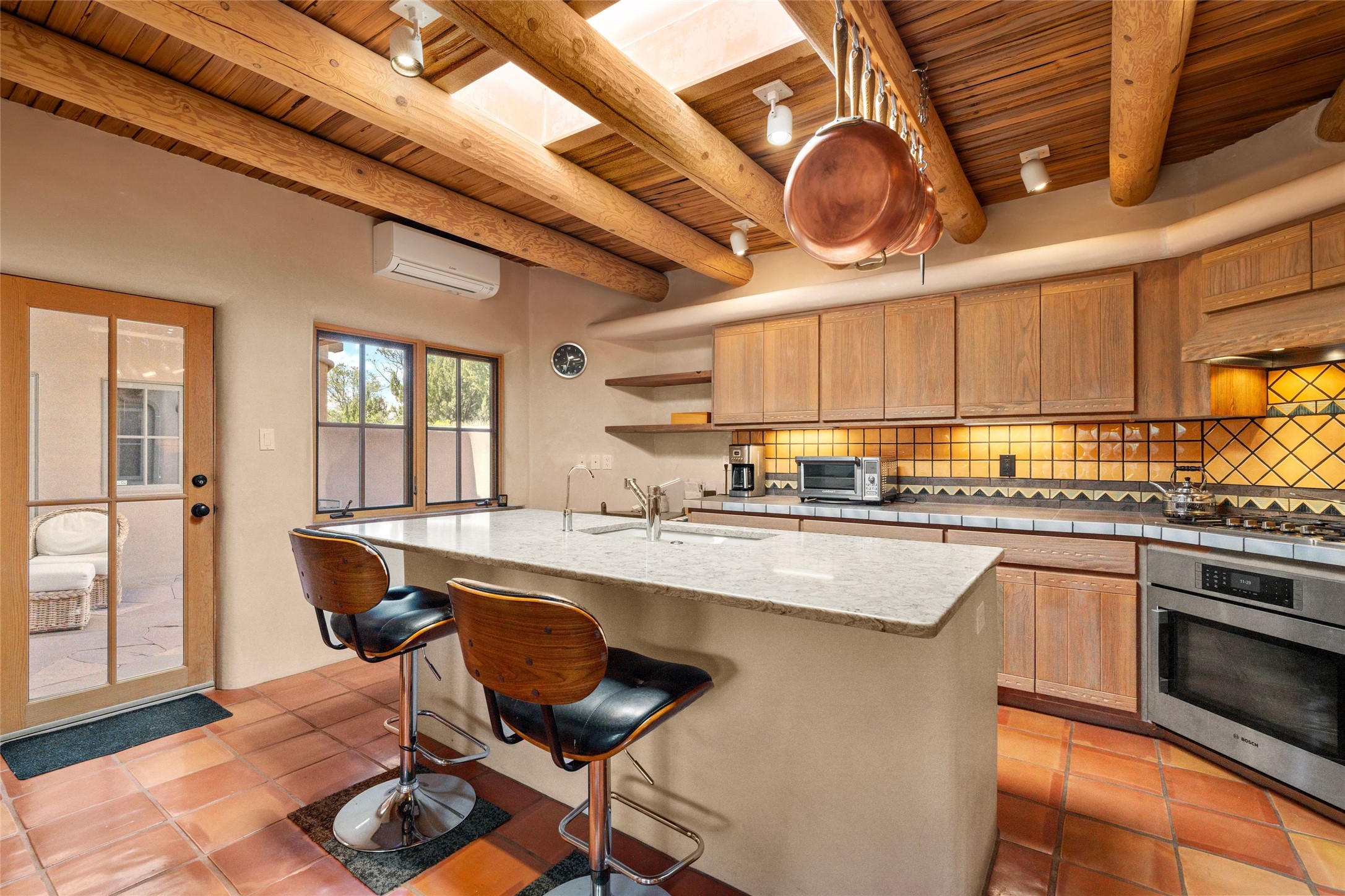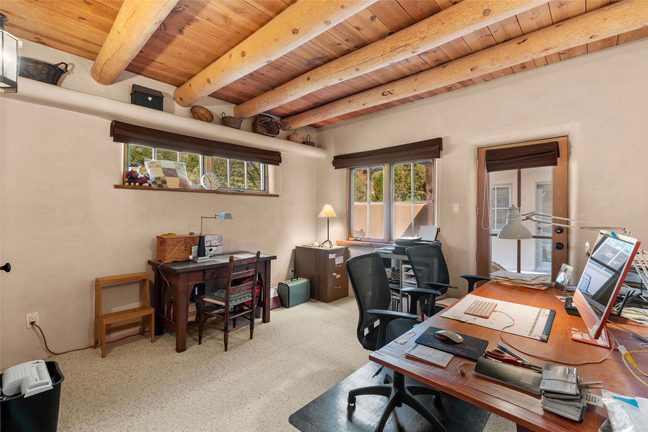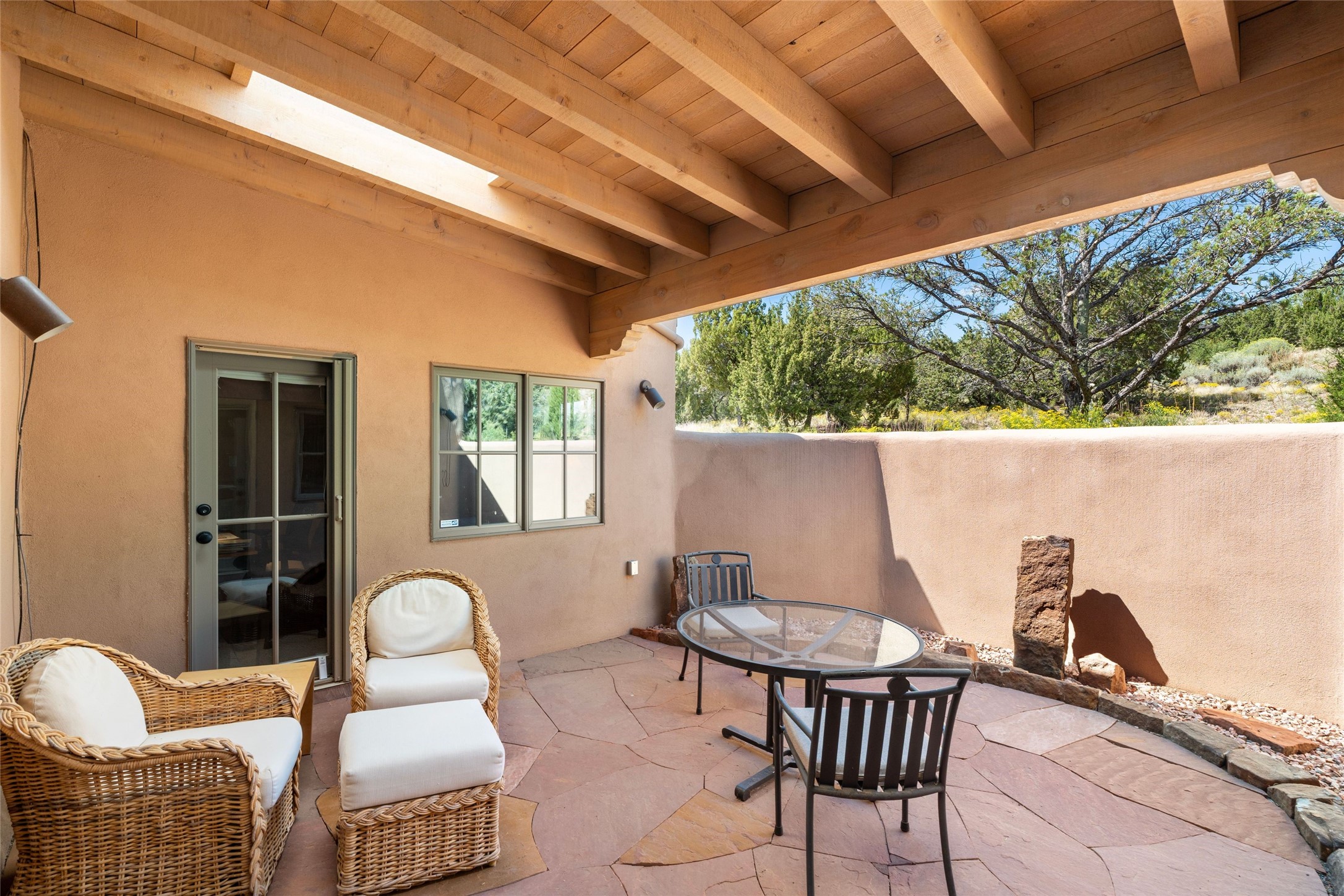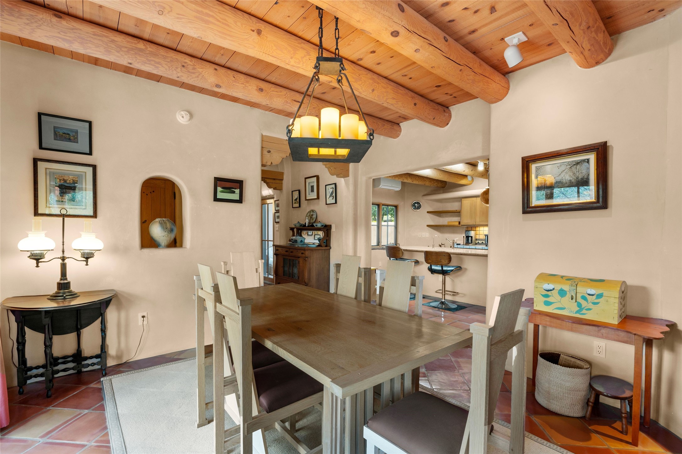 Prime Northside 3-bedroom, 2.5 home sited amidst Aspen and Pinon trees with stunning views of the Sangre de Cristo Mountains. This single-level residence features no interior steps. Embracing the iconic Santa Fe style, the home showcases Saltillo tile floors, banco seating, and elegant plaster walls, complemented by traditional vigas and latillas. Two kiva fireplaces add warmth and character. The separate dining area offers captivating views of the Sangres, creating a delightful backdrop for mealtime. The updated kitchen is designed with a large island for casual seating and French doors that open to a covered patio, ideal for outdoor dining or relaxation. The primary suite features its own kiva fireplace, along with a separate office or exercise space and an outdoor patio. Additionally, the home includes a two-car garage with extra storage, enhancing convenience. Surrounded by natural landscaping, this property offers a tranquil setting while being just under two miles from the vibrant heart of downtown Santa Fe.