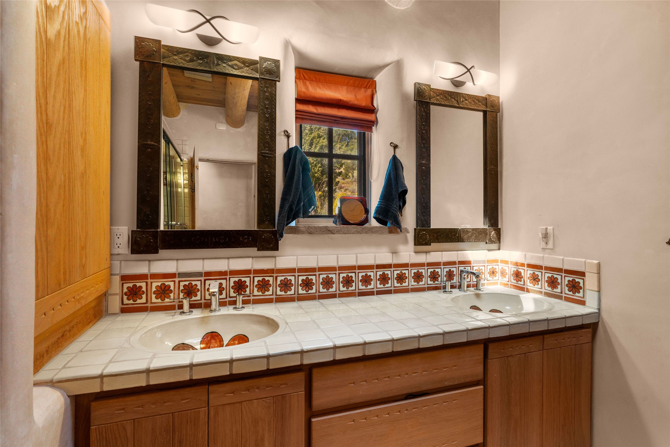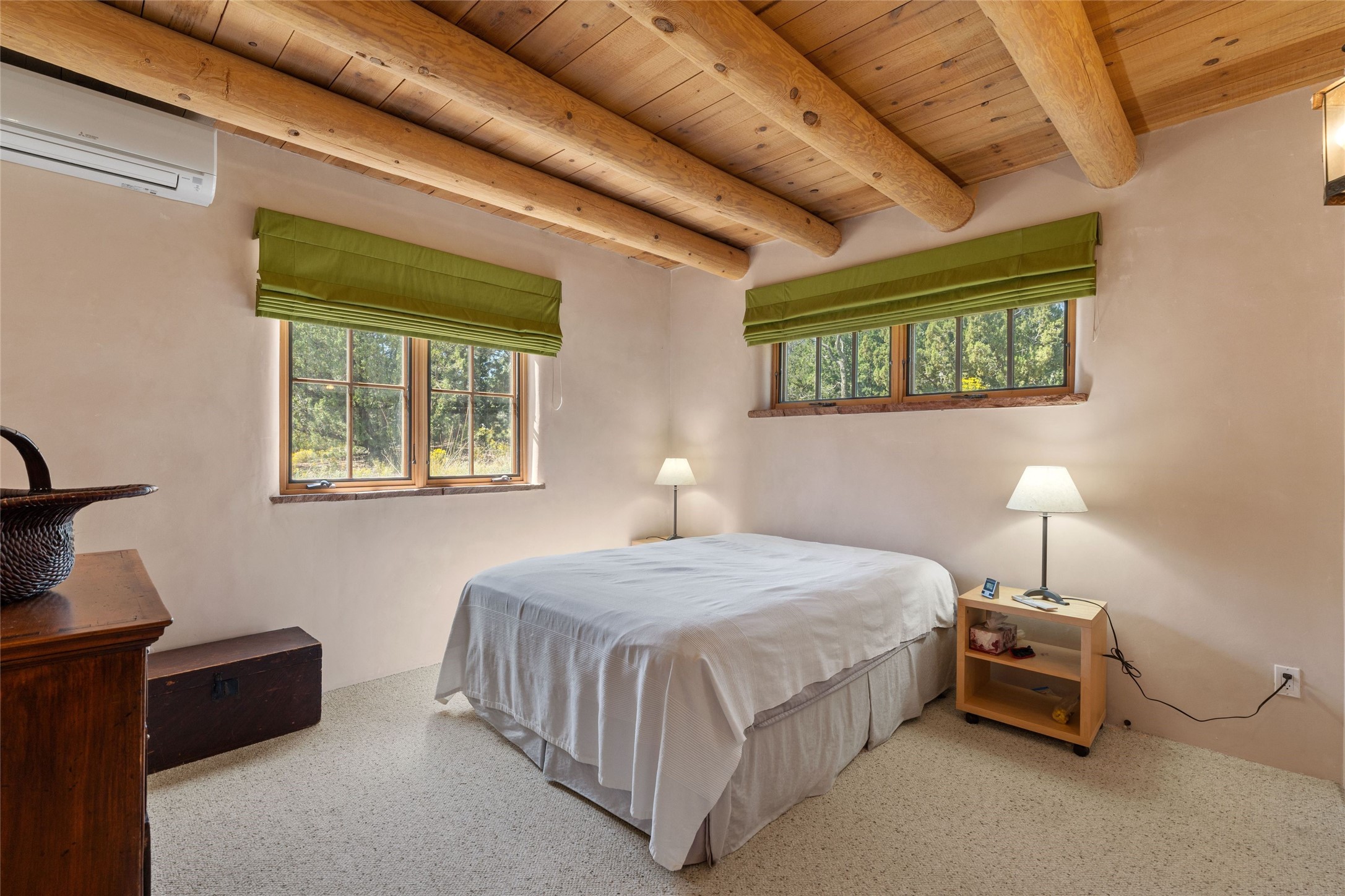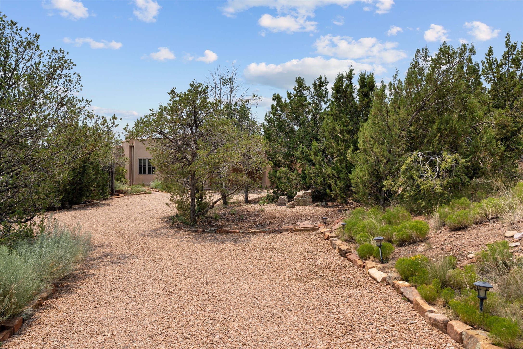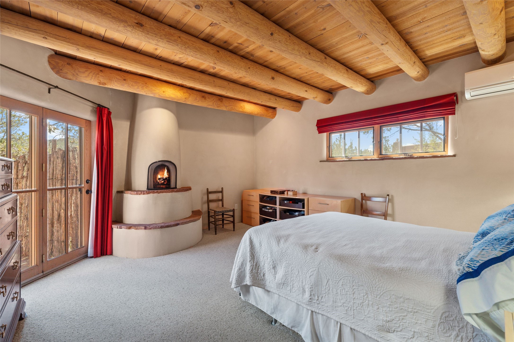 Prime Northside 3-bedroom, 2.5 home sited amidst Aspen and Pinon trees with stunning views of the Sangre de Cristo Mountains. This single-level residence features no interior steps. Embracing the iconic Santa Fe style, the home showcases Saltillo tile floors, banco seating, and elegant plaster walls, complemented by traditional vigas and latillas. Two kiva fireplaces add warmth and character. The separate dining area offers captivating views of the Sangres, creating a delightful backdrop for mealtime. The updated kitchen is designed with a large island for casual seating and French doors that open to a covered patio, ideal for outdoor dining or relaxation. The primary suite features its own kiva fireplace, along with a separate office or exercise space and an outdoor patio. Additionally, the home includes a two-car garage with extra storage, enhancing convenience. Surrounded by natural landscaping, this property offers a tranquil setting while being just under two miles from the vibrant heart of downtown Santa Fe.