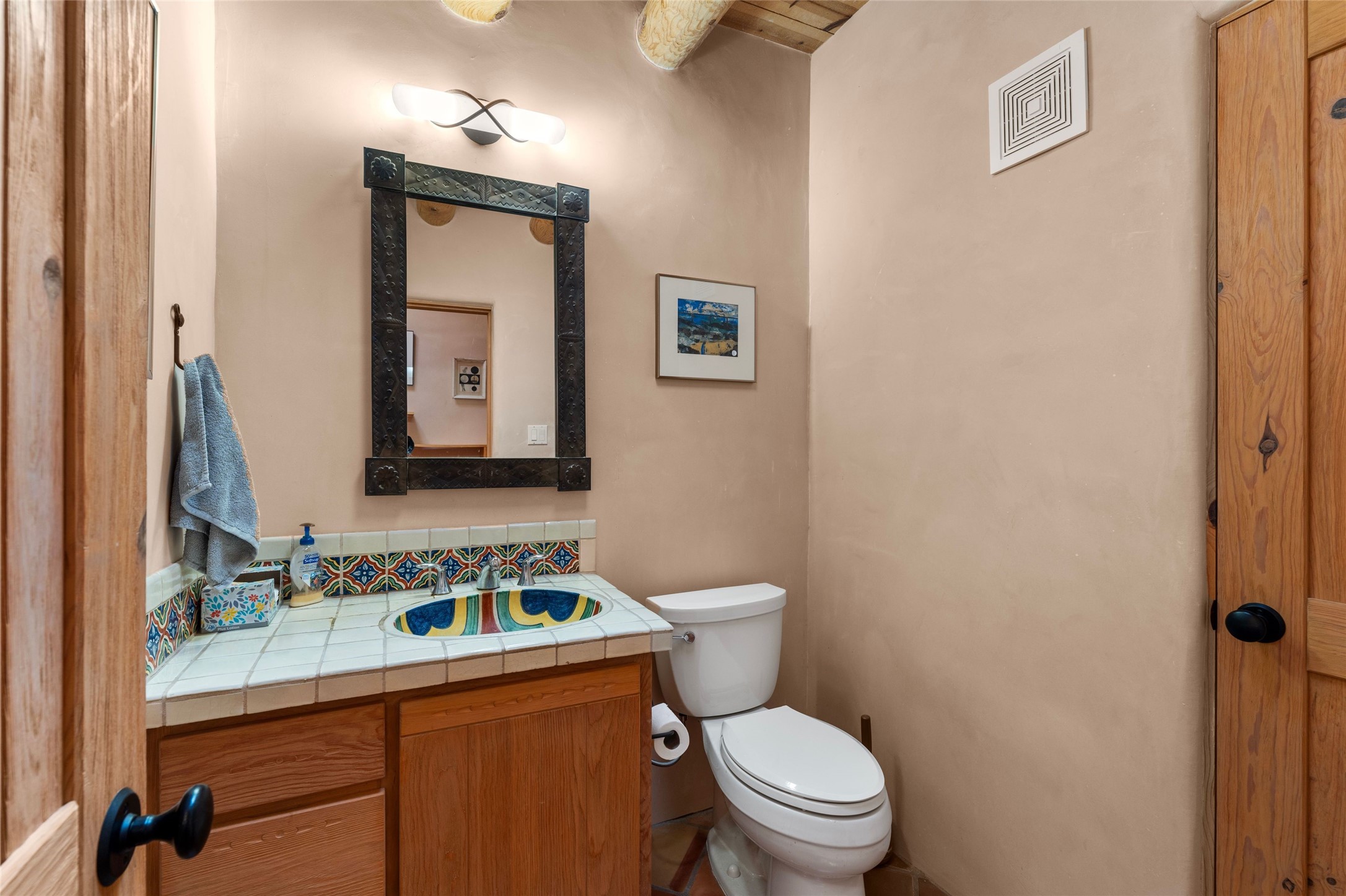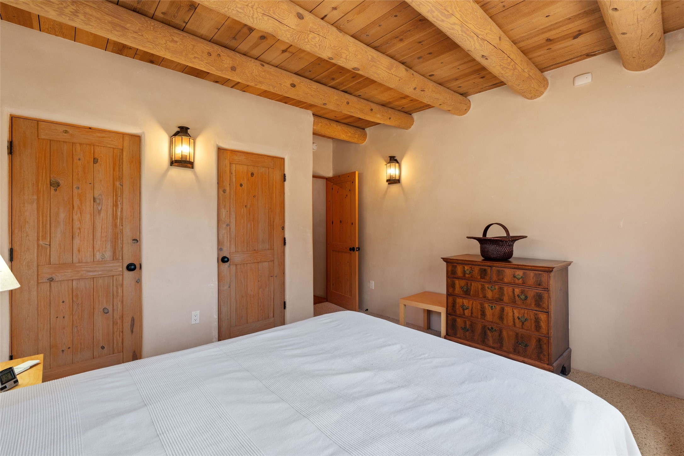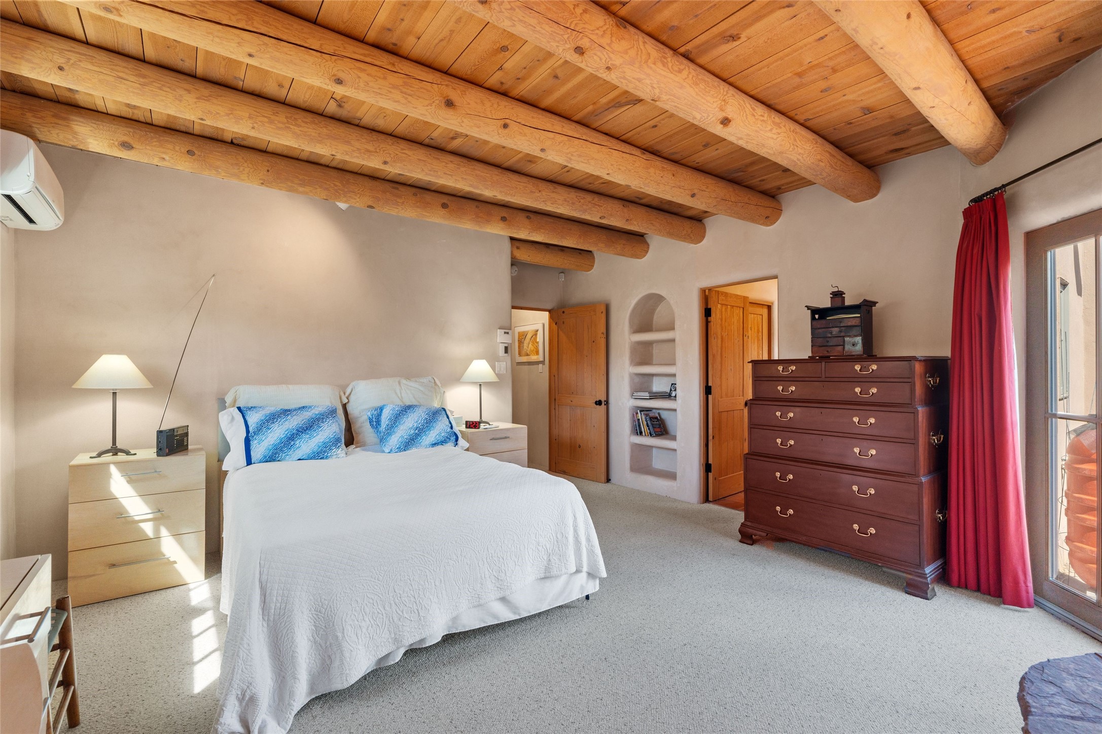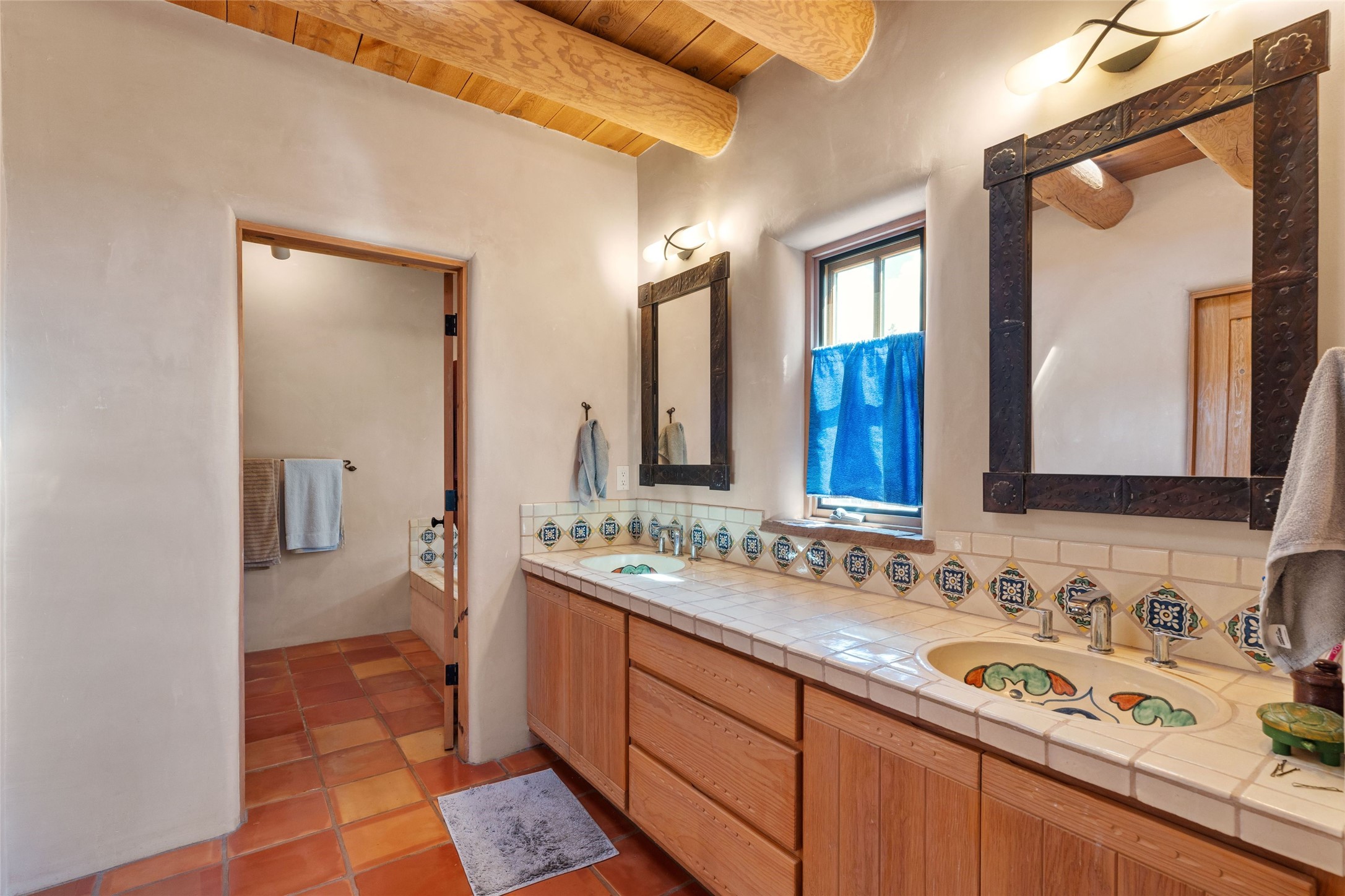 Prime Northside 3-bedroom, 2.5 home sited amidst Aspen and Pinon trees with stunning views of the Sangre de Cristo Mountains. This single-level residence features no interior steps. Embracing the iconic Santa Fe style, the home showcases Saltillo tile floors, banco seating, and elegant plaster walls, complemented by traditional vigas and latillas. Two kiva fireplaces add warmth and character. The separate dining area offers captivating views of the Sangres, creating a delightful backdrop for mealtime. The updated kitchen is designed with a large island for casual seating and French doors that open to a covered patio, ideal for outdoor dining or relaxation. The primary suite features its own kiva fireplace, along with a separate office or exercise space and an outdoor patio. Additionally, the home includes a two-car garage with extra storage, enhancing convenience. Surrounded by natural landscaping, this property offers a tranquil setting while being just under two miles from the vibrant heart of downtown Santa Fe.