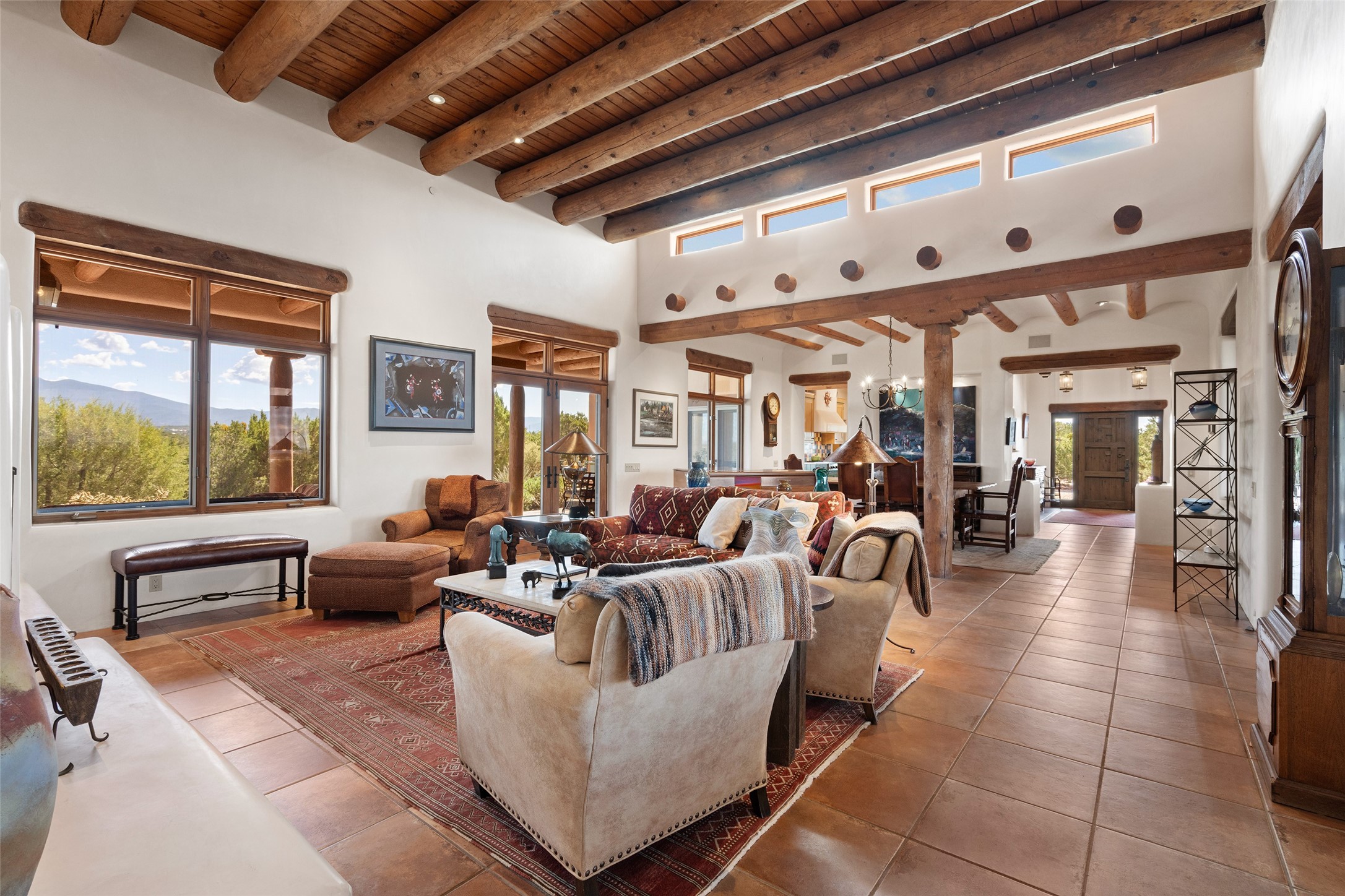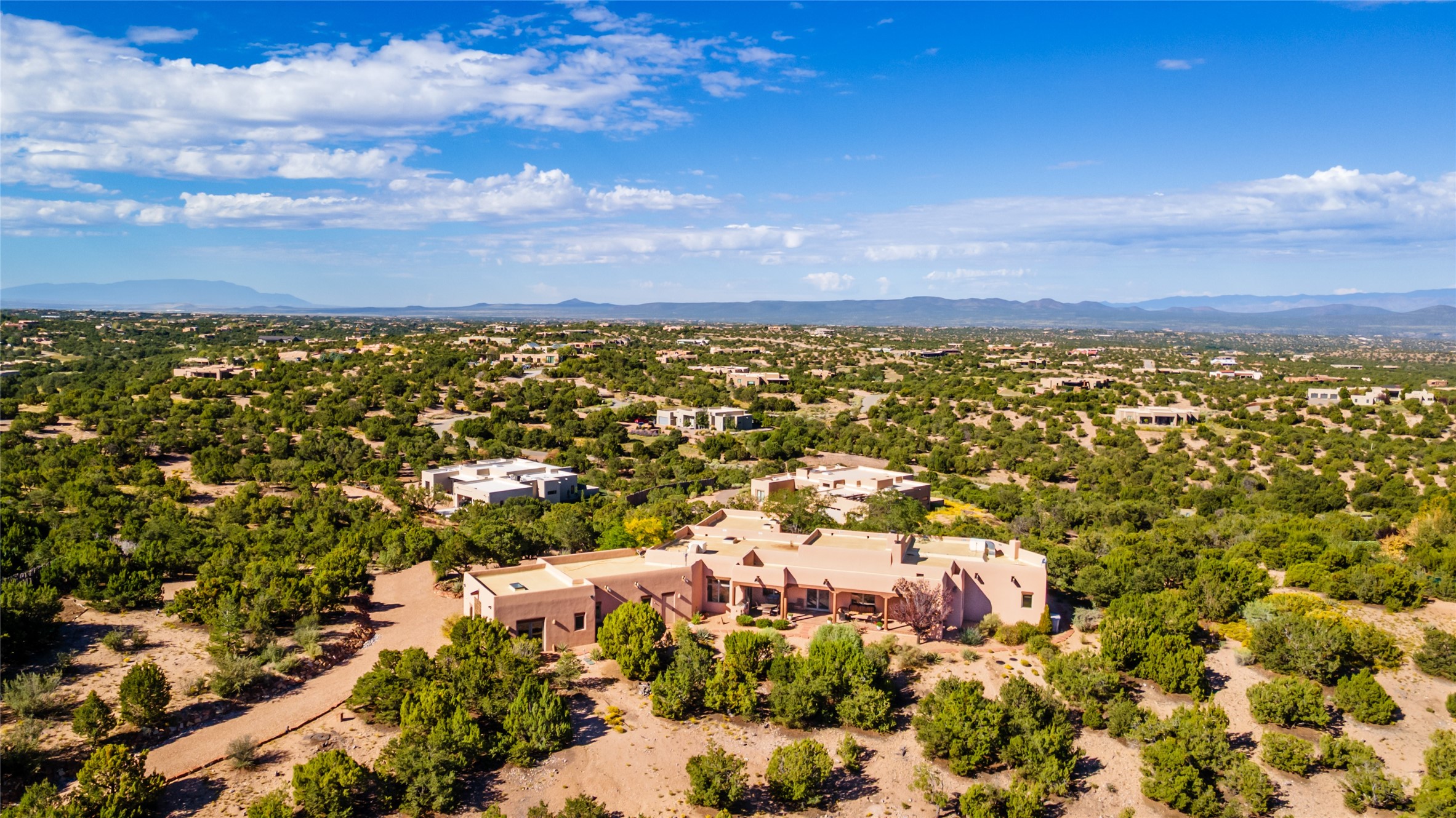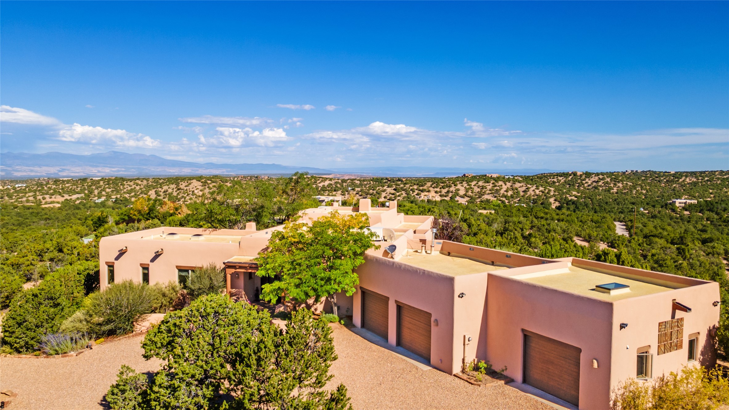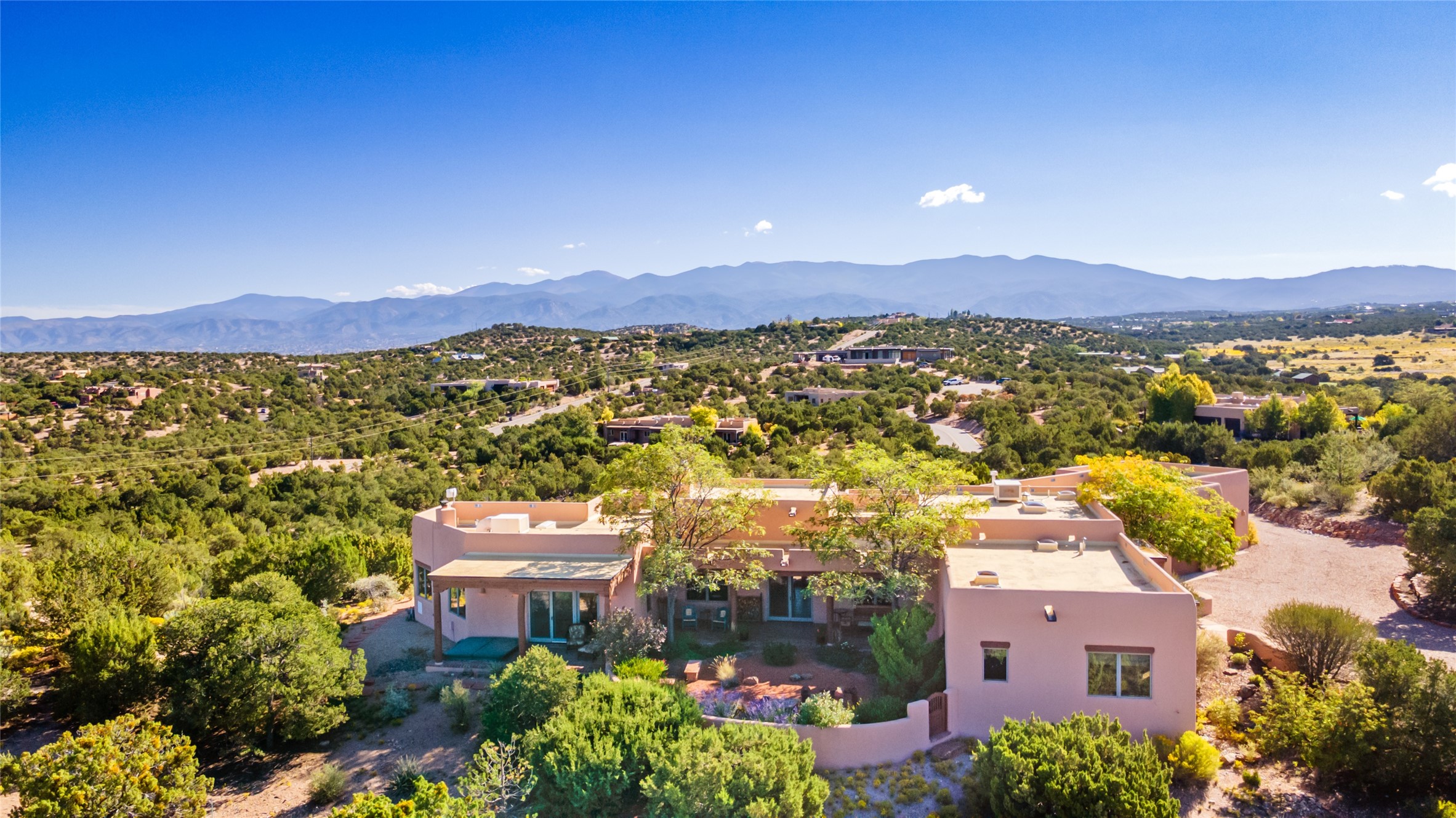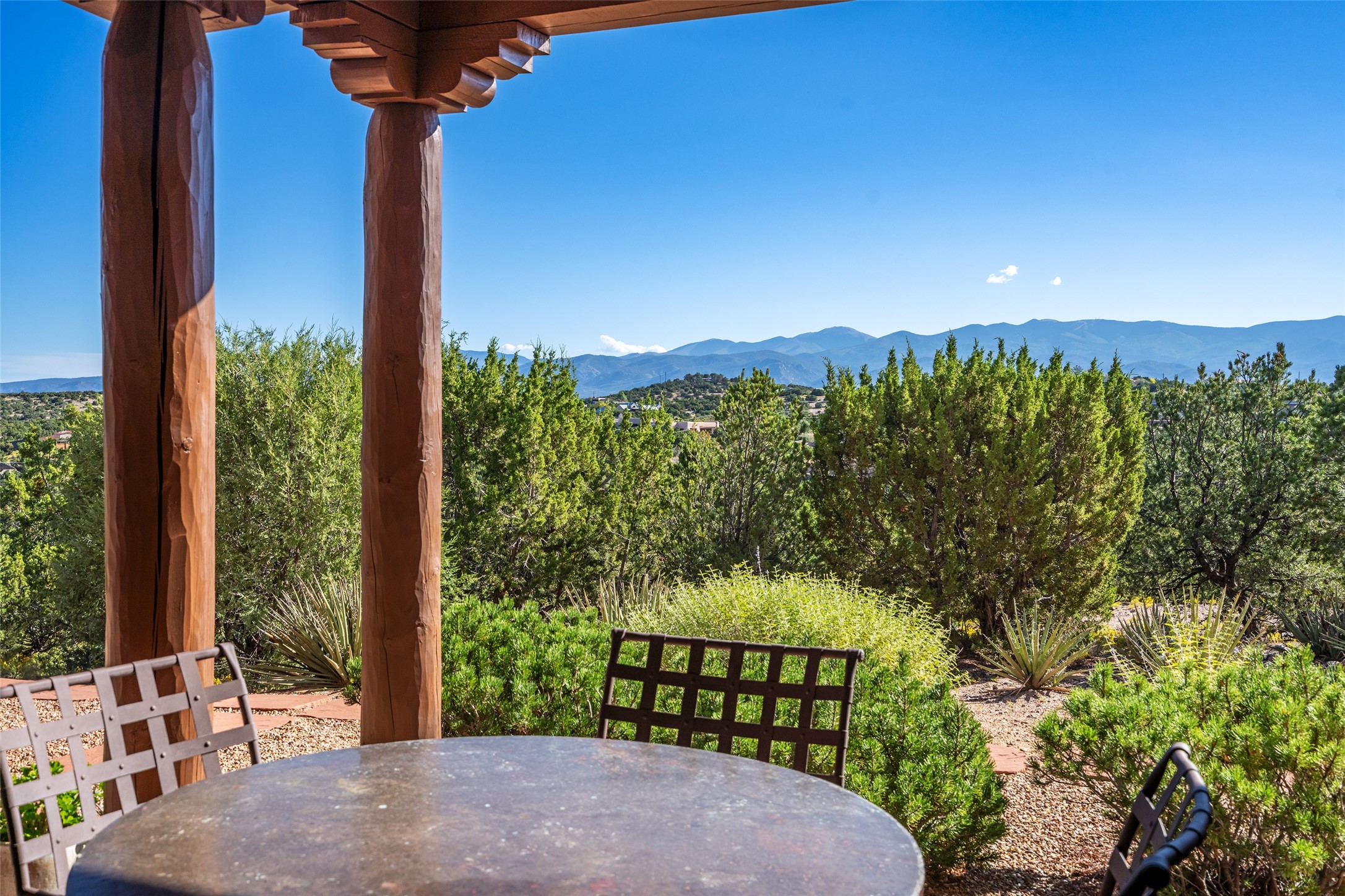 SWEEPING VIEWS OF BOTH EASTERN AND WESTERN MOUNTAIN RANGES ON AN ELEVATED LOT IN SUNDANCE ESTATES WHERE THE NIGHT SKY IS JUST AS BEAUTIFUL AS THE DAY. Designed by Richard Martinez to be a haven with warm architectural accents and superb Santa Fe touches. Set in the coveted Sundance Estates neighborhood, this stunning 3-bedroom, 3-bath home embodies timeless Santa Fe style. Absolutely full of natural light, this 3,351 sqft residence sits on 2.5 acres of mature landscaping, offering peace, privacy, and natural beauty. Inside, traditional vigas, beams, and coved ceilings are paired with creamy plaster walls, wood and tile floors, and radiant heating throughout. Four wood-burning fireplaces anchor the warm and inviting living spaces, while the gourmet kitchen is a delightful and colorful place to cook together or just cozy up with a cup of coffee and the newspaper. It features high-end appliances, and scads of counterspace and storage. Formal and informal dining areas, and seamless flow to outdoor dining patios give this residence high appeal for entertaining. The primary suite offers serenity with breathtaking views, while guest accommodations have their own wing and are equally welcoming with views and privacy. Outdoor living is elevated with multiple patios, a hot tub, and manicured grounds designed for relaxation and entertaining. A 3-car garage and additional driveway parking for 5 vehicles provide convenience. The third bay of the garage was built as a fabulous studio space and could be an art studio, gym, yoga spot, crafts room - you name it! This property is a masterful balance of traditional craftsmanship and modern comfort - an exceptional haven for refined easy Southwestern living.