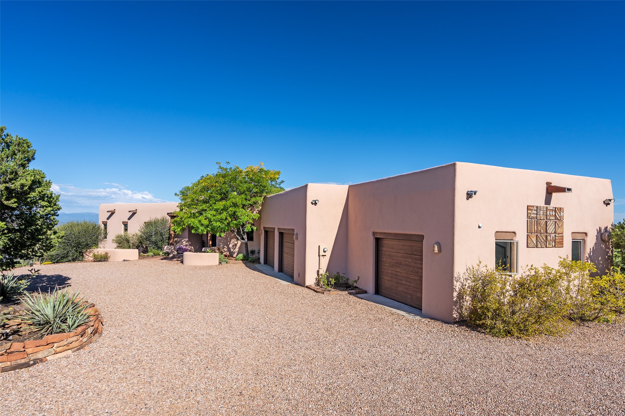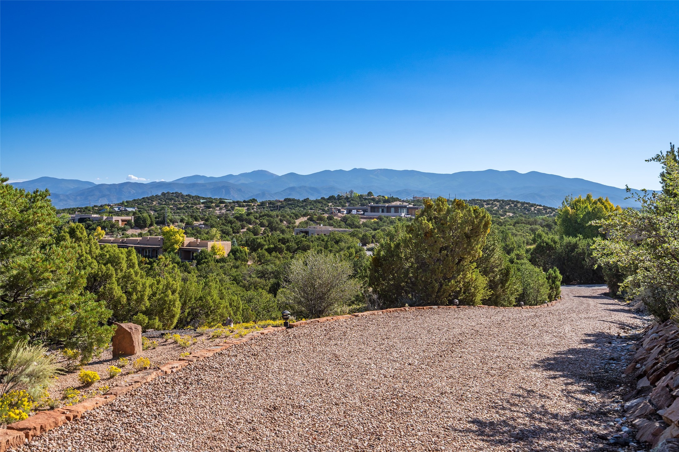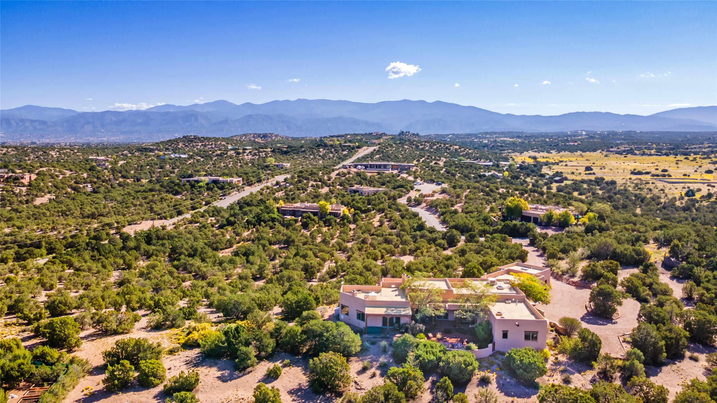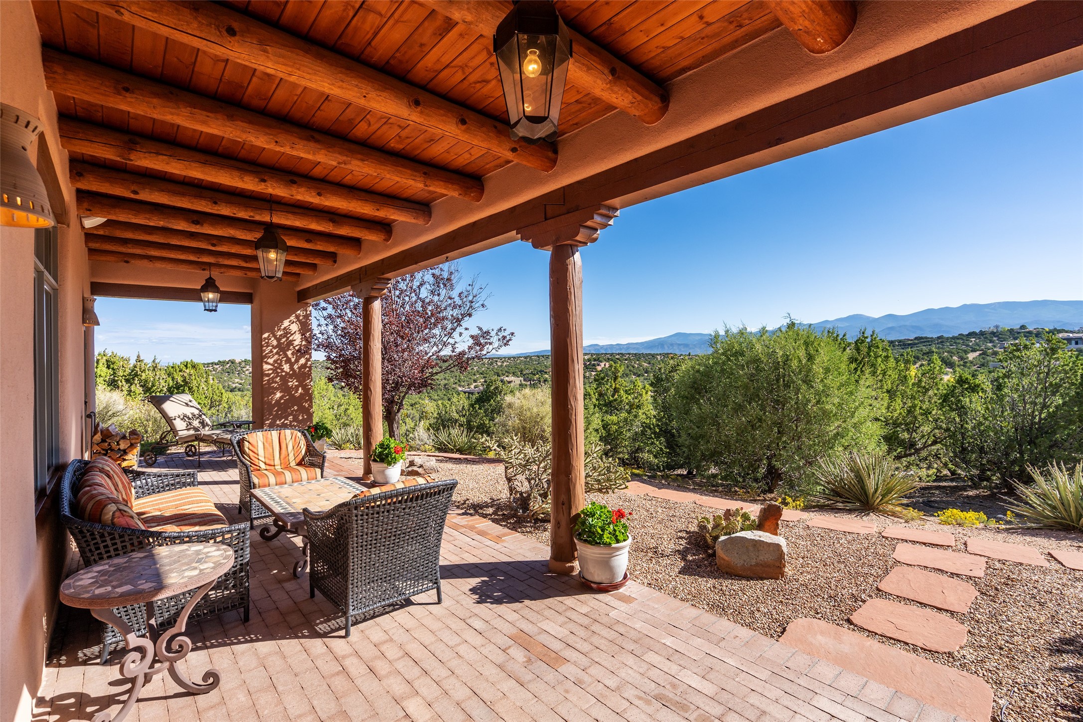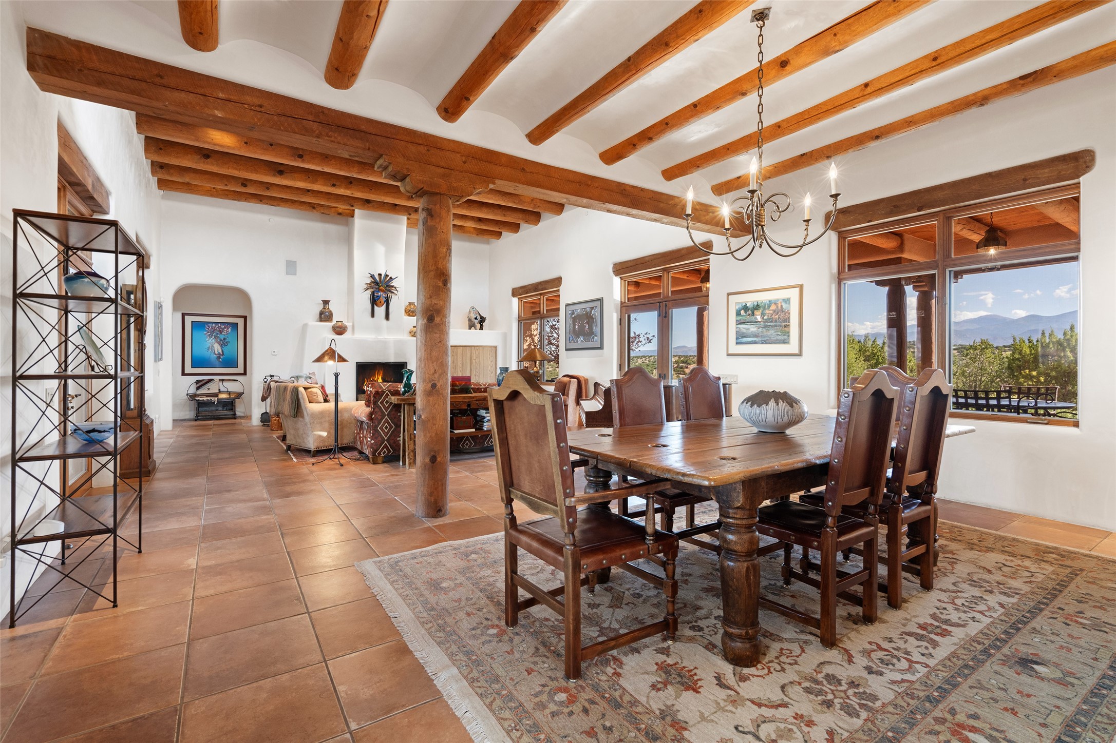 SWEEPING VIEWS OF BOTH EASTERN AND WESTERN MOUNTAIN RANGES ON AN ELEVATED LOT IN SUNDANCE ESTATES WHERE THE NIGHT SKY IS JUST AS BEAUTIFUL AS THE DAY. Designed by Richard Martinez to be a haven with warm architectural accents and superb Santa Fe touches. Set in the coveted Sundance Estates neighborhood, this stunning 3-bedroom, 3-bath home embodies timeless Santa Fe style. Absolutely full of natural light, this 3,351 sqft residence sits on 2.5 acres of mature landscaping, offering peace, privacy, and natural beauty. Inside, traditional vigas, beams, and coved ceilings are paired with creamy plaster walls, wood and tile floors, and radiant heating throughout. Four wood-burning fireplaces anchor the warm and inviting living spaces, while the gourmet kitchen is a delightful and colorful place to cook together or just cozy up with a cup of coffee and the newspaper. It features high-end appliances, and scads of counterspace and storage. Formal and informal dining areas, and seamless flow to outdoor dining patios give this residence high appeal for entertaining. The primary suite offers serenity with breathtaking views, while guest accommodations have their own wing and are equally welcoming with views and privacy. Outdoor living is elevated with multiple patios, a hot tub, and manicured grounds designed for relaxation and entertaining. A 3-car garage and additional driveway parking for 5 vehicles provide convenience. The third bay of the garage was built as a fabulous studio space and could be an art studio, gym, yoga spot, crafts room - you name it! This property is a masterful balance of traditional craftsmanship and modern comfort - an exceptional haven for refined easy Southwestern living.