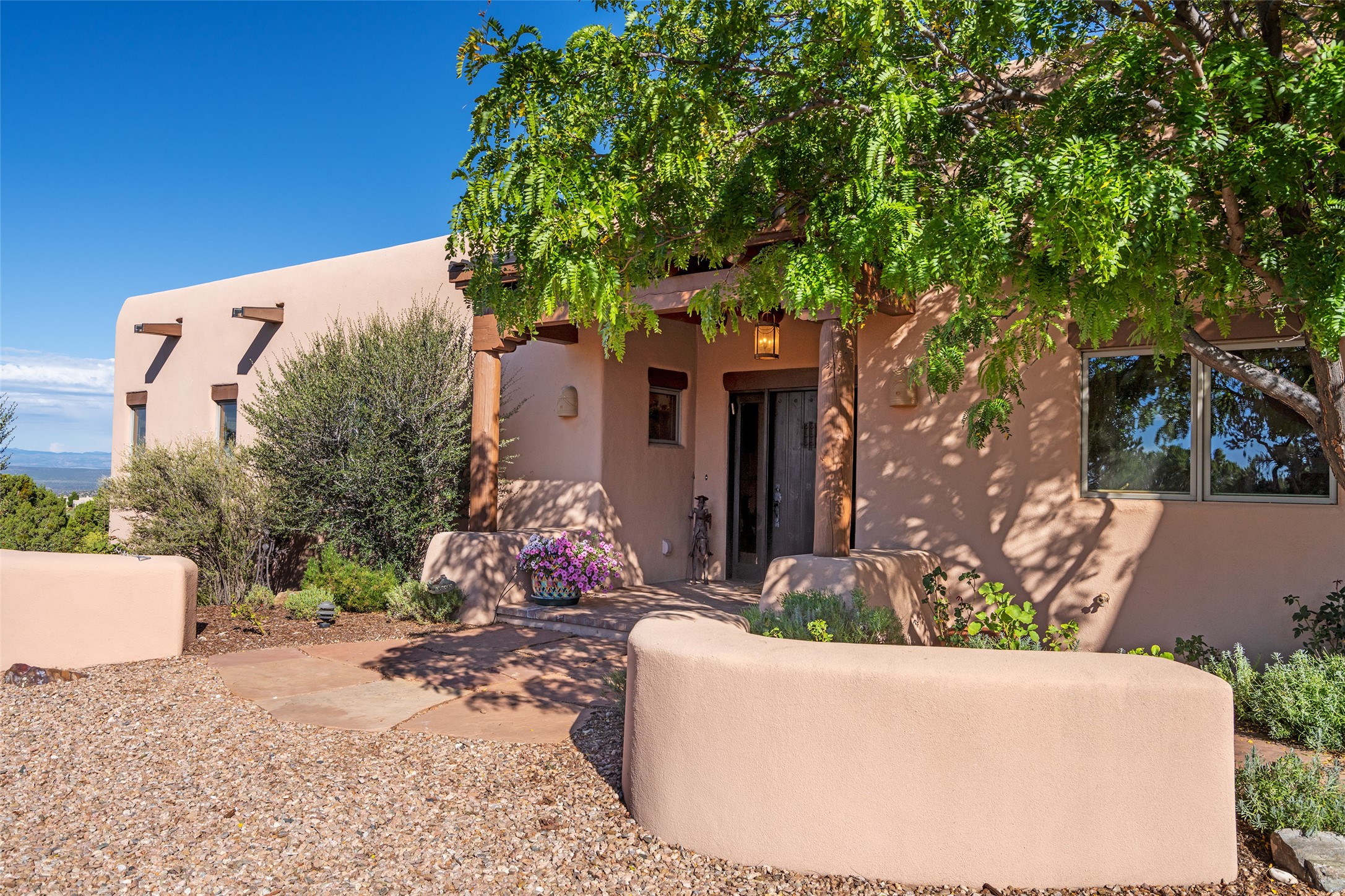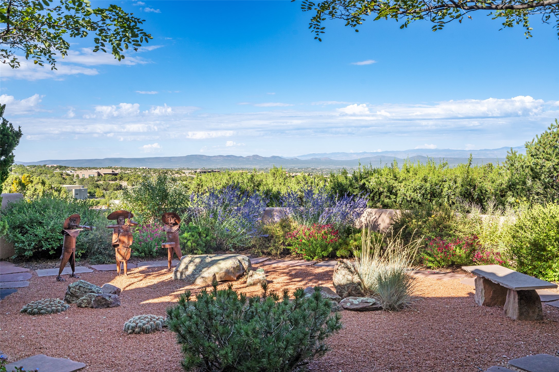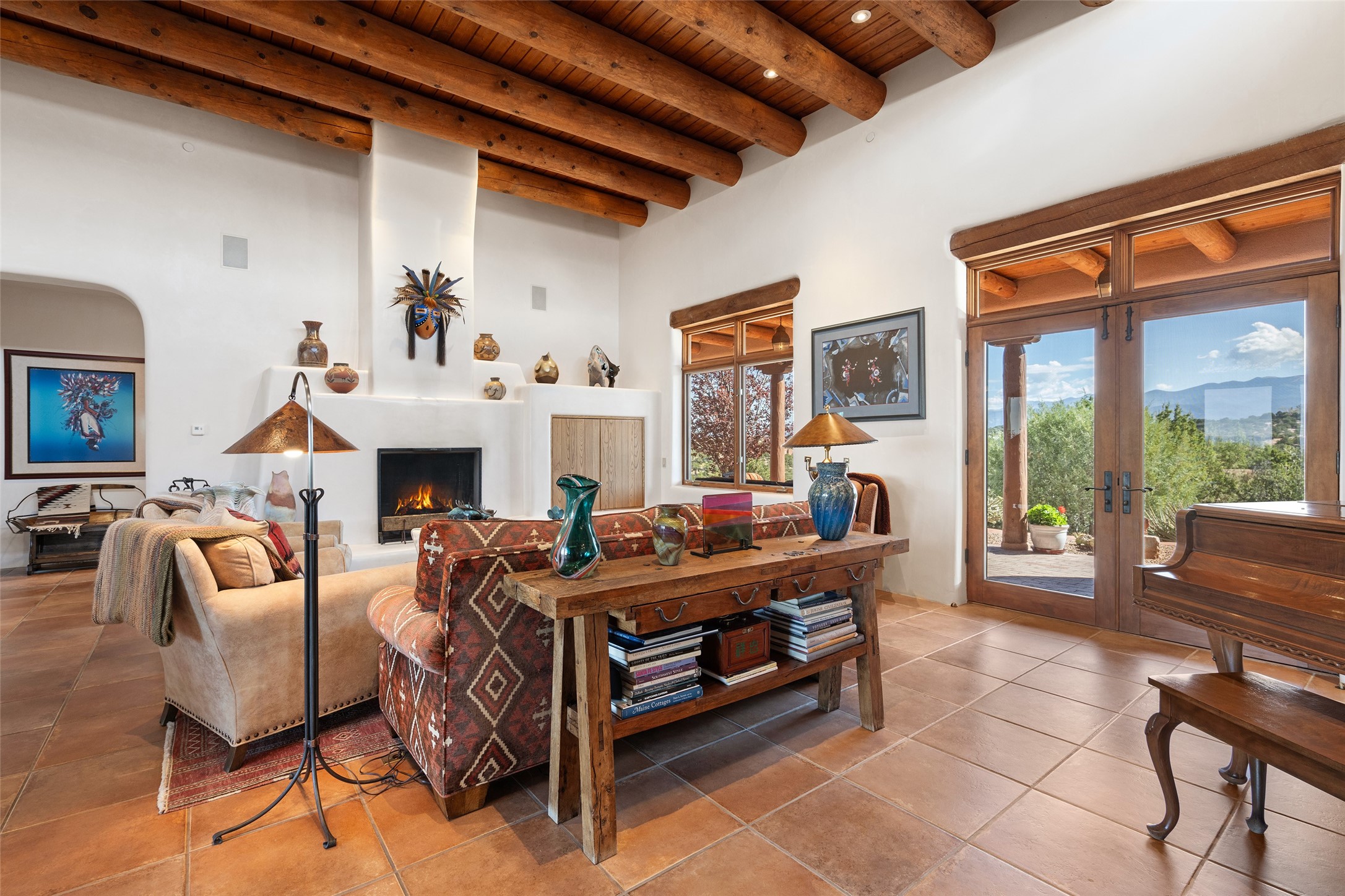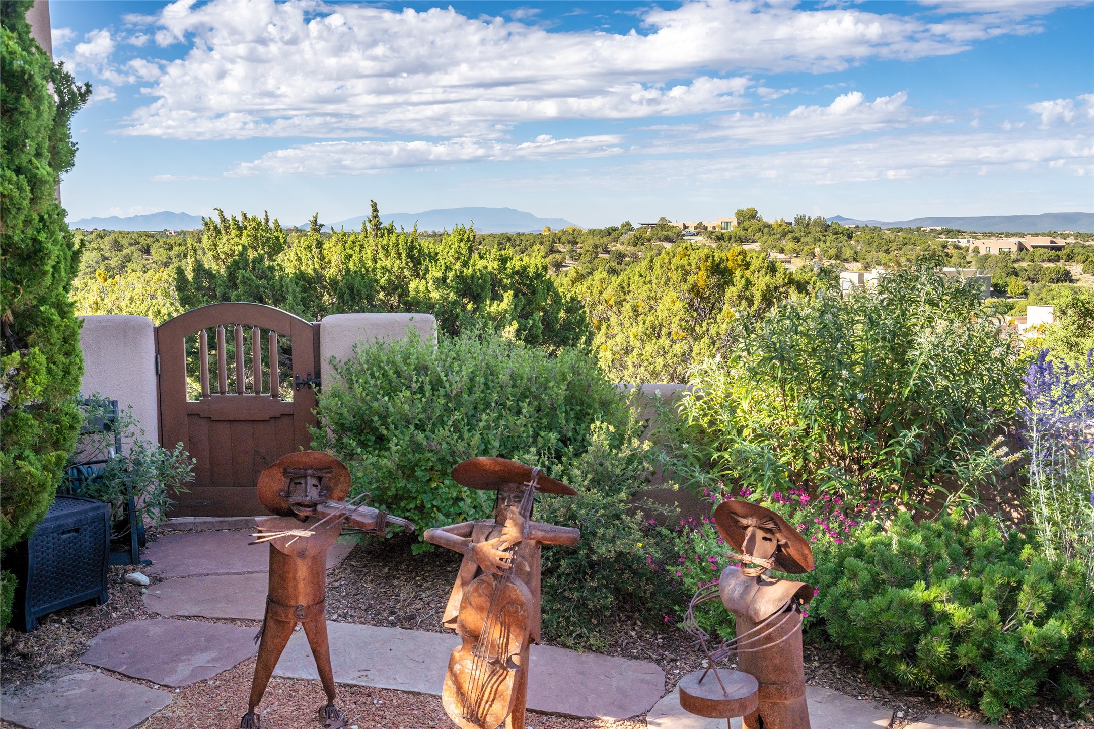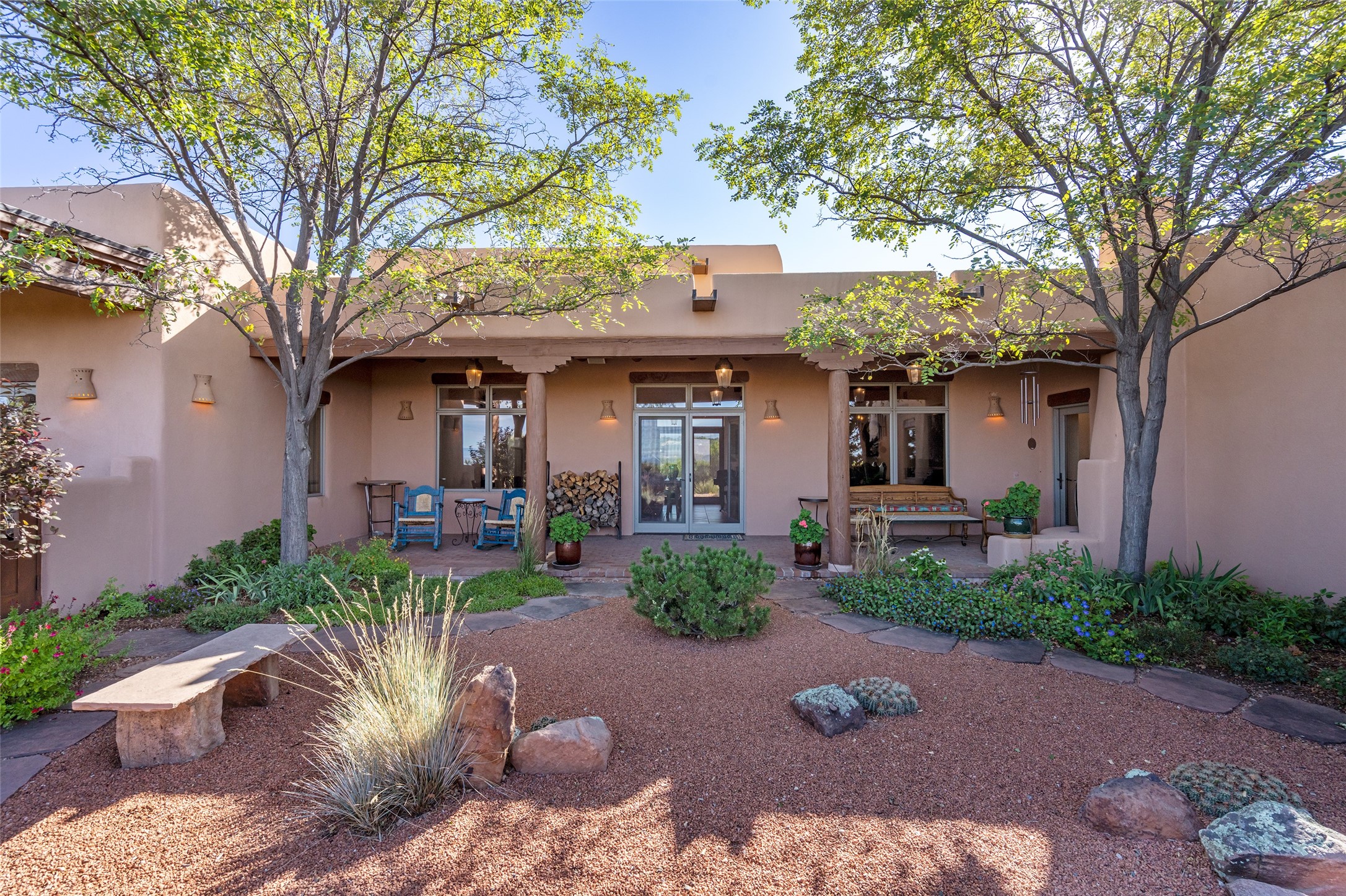 SWEEPING VIEWS OF BOTH EASTERN AND WESTERN MOUNTAIN RANGES ON AN ELEVATED LOT IN SUNDANCE ESTATES WHERE THE NIGHT SKY IS JUST AS BEAUTIFUL AS THE DAY. Designed by Richard Martinez to be a haven with warm architectural accents and superb Santa Fe touches. Set in the coveted Sundance Estates neighborhood, this stunning 3-bedroom, 3-bath home embodies timeless Santa Fe style. Absolutely full of natural light, this 3,351 sqft residence sits on 2.5 acres of mature landscaping, offering peace, privacy, and natural beauty. Inside, traditional vigas, beams, and coved ceilings are paired with creamy plaster walls, wood and tile floors, and radiant heating throughout. Four wood-burning fireplaces anchor the warm and inviting living spaces, while the gourmet kitchen is a delightful and colorful place to cook together or just cozy up with a cup of coffee and the newspaper. It features high-end appliances, and scads of counterspace and storage. Formal and informal dining areas, and seamless flow to outdoor dining patios give this residence high appeal for entertaining. The primary suite offers serenity with breathtaking views, while guest accommodations have their own wing and are equally welcoming with views and privacy. Outdoor living is elevated with multiple patios, a hot tub, and manicured grounds designed for relaxation and entertaining. A 3-car garage and additional driveway parking for 5 vehicles provide convenience. The third bay of the garage was built as a fabulous studio space and could be an art studio, gym, yoga spot, crafts room - you name it! This property is a masterful balance of traditional craftsmanship and modern comfort - an exceptional haven for refined easy Southwestern living.