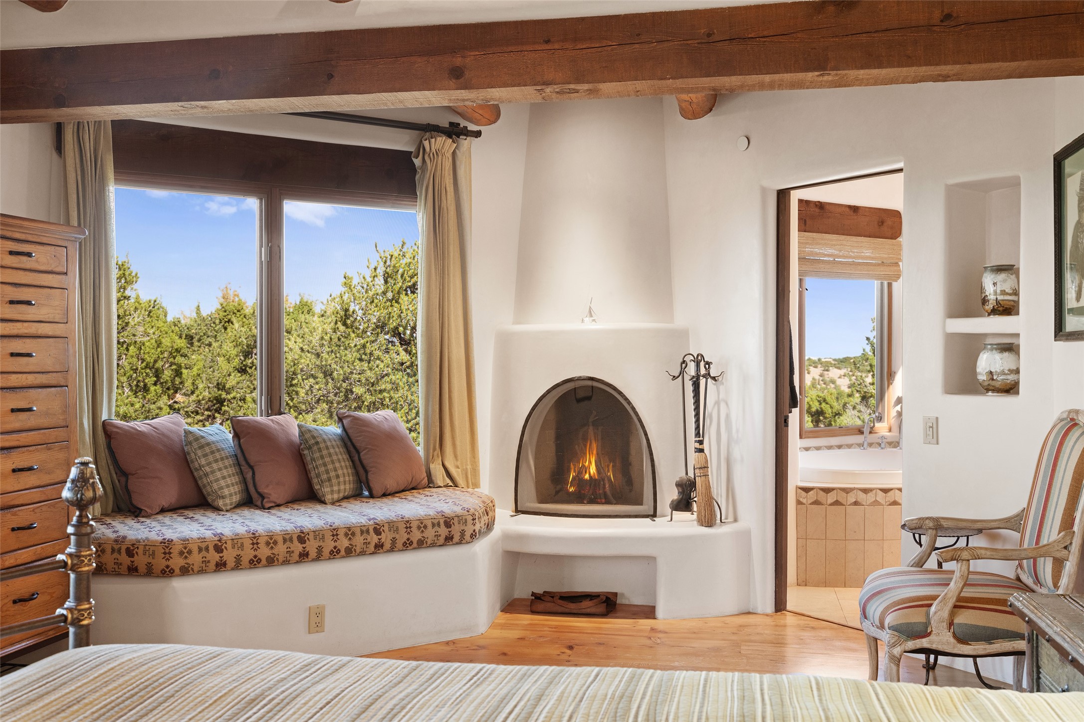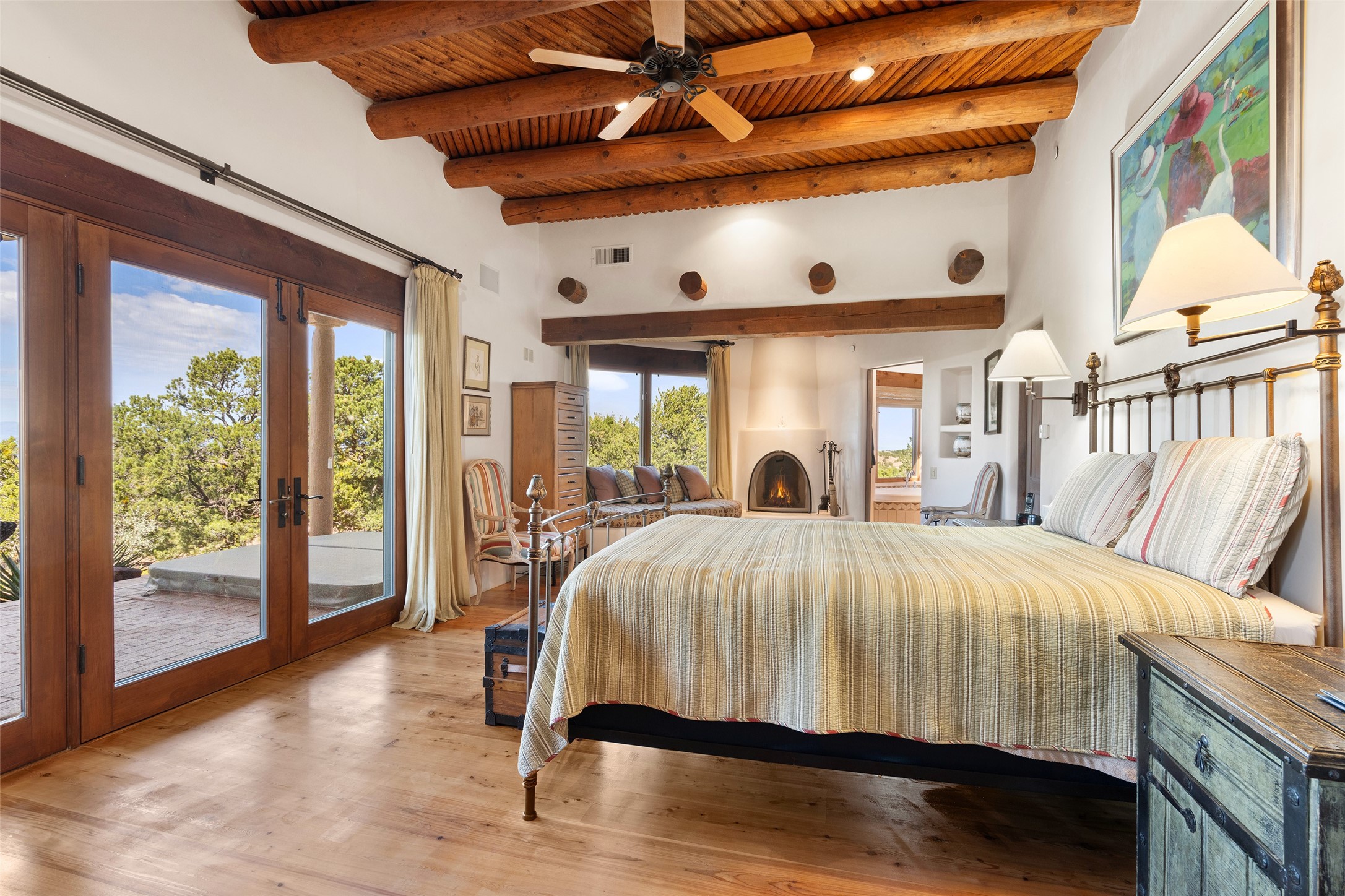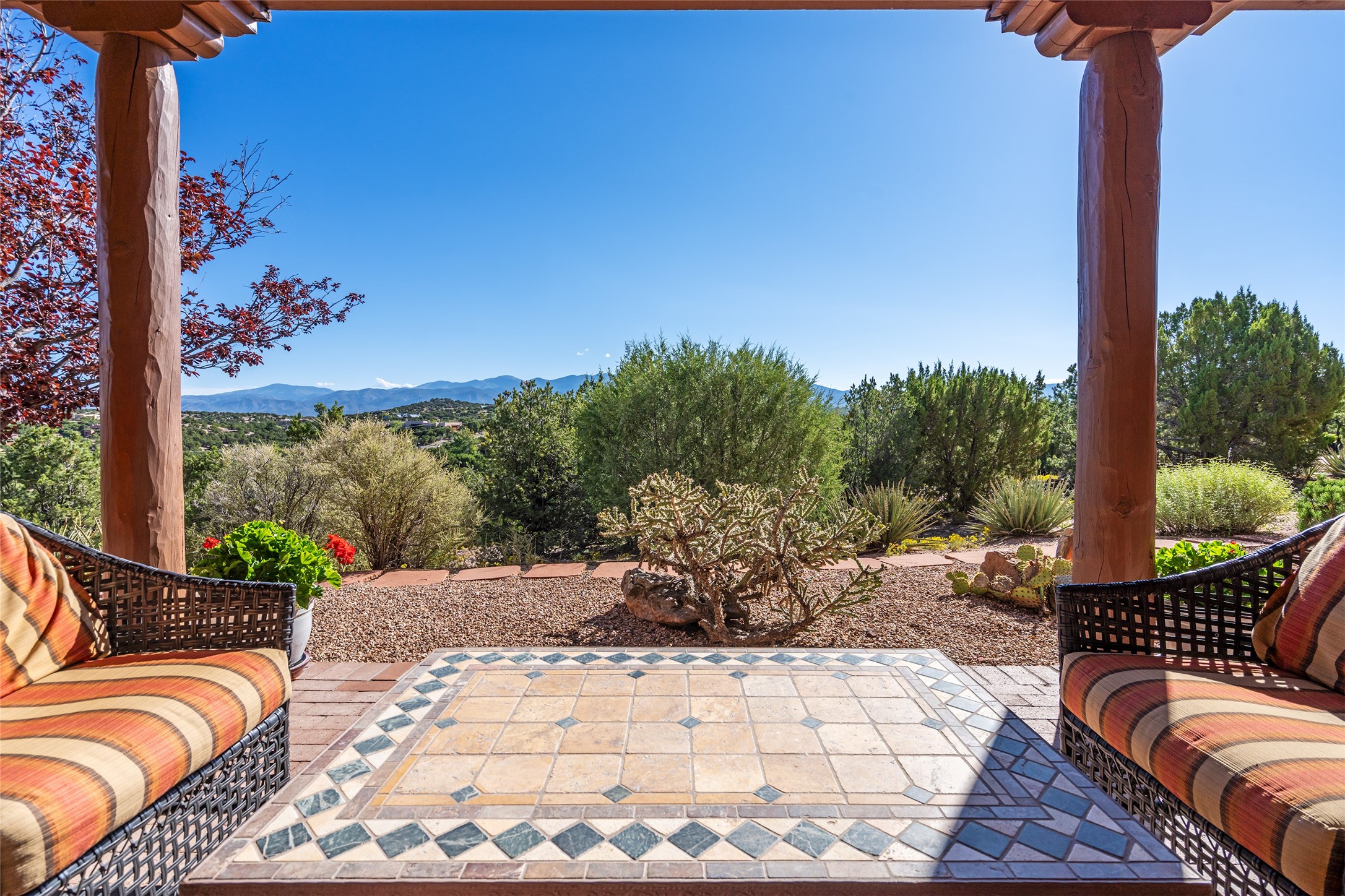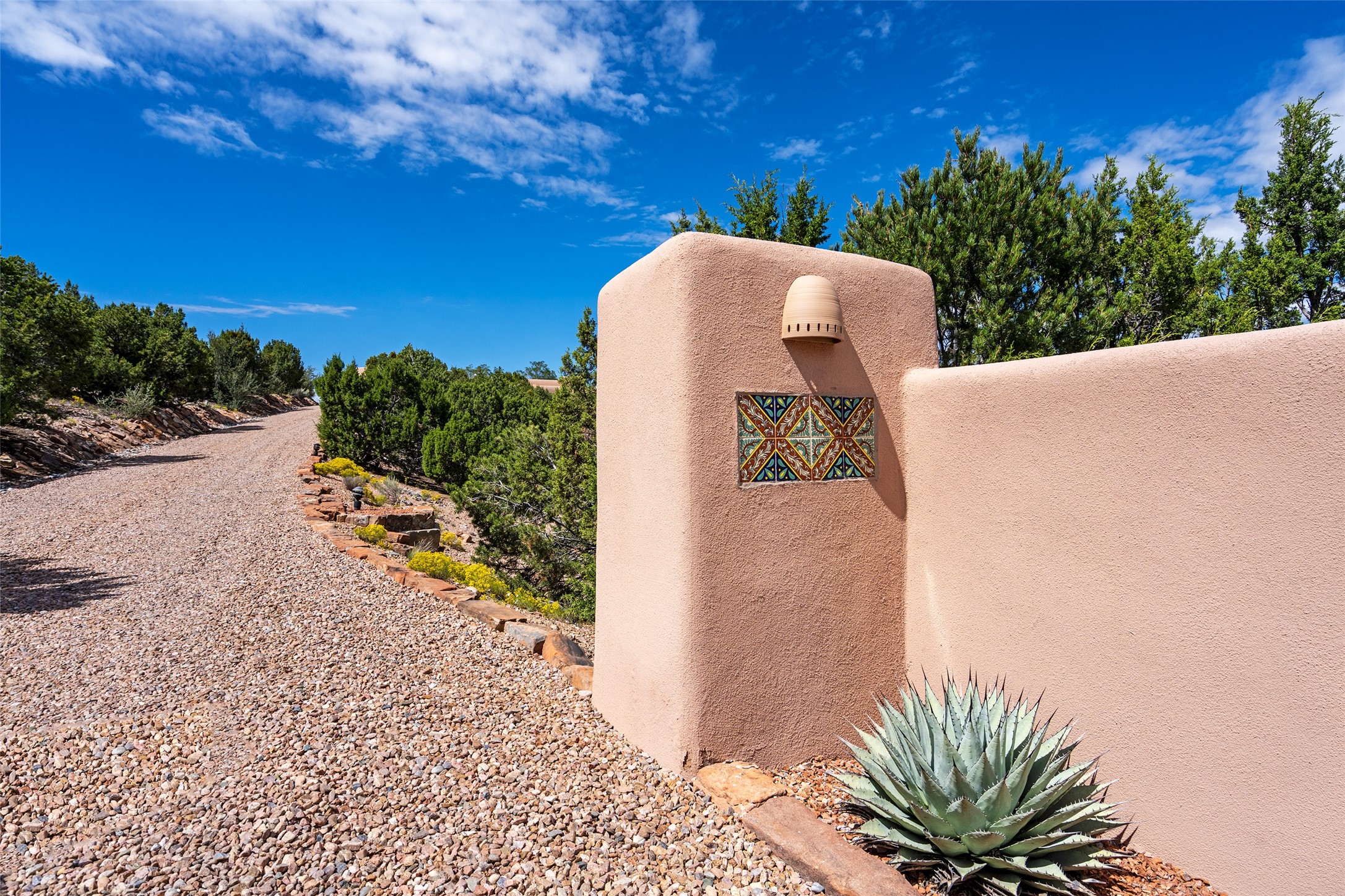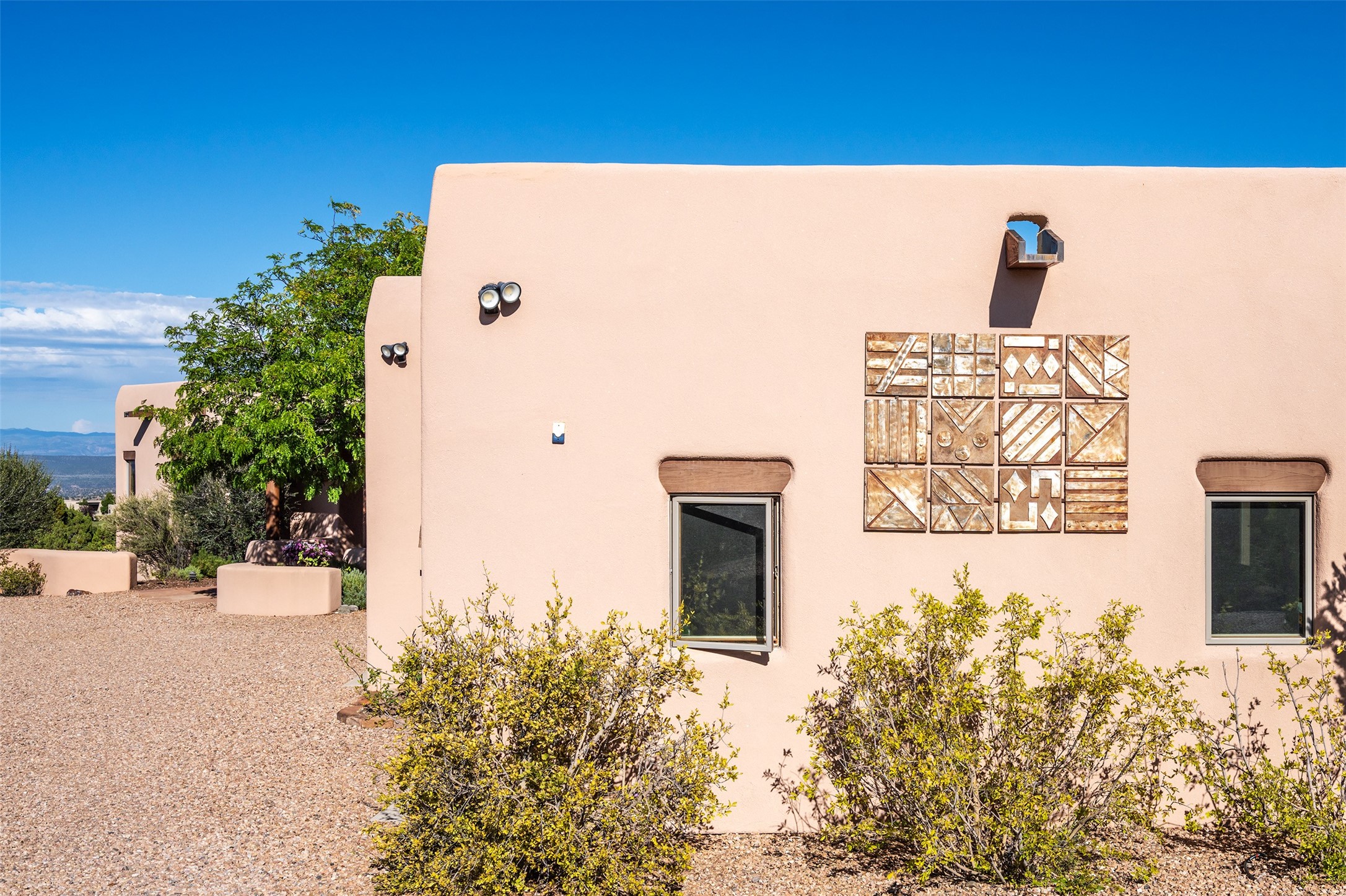SWEEPING VIEWS OF BOTH EASTERN AND WESTERN MOUNTAIN RANGES ON AN ELEVATED LOT IN SUNDANCE ESTATES WHERE THE NIGHT SKY IS JUST AS BEAUTIFUL AS THE DAY. Designed by Richard Martinez to be a haven with warm architectural accents and superb Santa Fe touches. Set in the coveted Sundance Estates neighborhood, this stunning 3-bedroom, 3-bath home embodies timeless Santa Fe style. Absolutely full of natural light, this 3,351 sqft residence sits on 2.5 acres of mature landscaping, offering peace, privacy, and natural beauty. Inside, traditional vigas, beams, and coved ceilings are paired with creamy plaster walls, wood and tile floors, and radiant heating throughout. Four wood-burning fireplaces anchor the warm and inviting living spaces, while the gourmet kitchen is a delightful and colorful place to cook together or just cozy up with a cup of coffee and the newspaper. It features high-end appliances, and scads of counterspace and storage. Formal and informal dining areas, and seamless flow to outdoor dining patios give this residence high appeal for entertaining. The primary suite offers serenity with breathtaking views, while guest accommodations have their own wing and are equally welcoming with views and privacy. Outdoor living is elevated with multiple patios, a hot tub, and manicured grounds designed for relaxation and entertaining. A 3-car garage and additional driveway parking for 5 vehicles provide convenience. The third bay of the garage was built as a fabulous studio space and could be an art studio, gym, yoga spot, crafts room - you name it! This property is a masterful balance of traditional craftsmanship and modern comfort - an exceptional haven for refined easy Southwestern living.