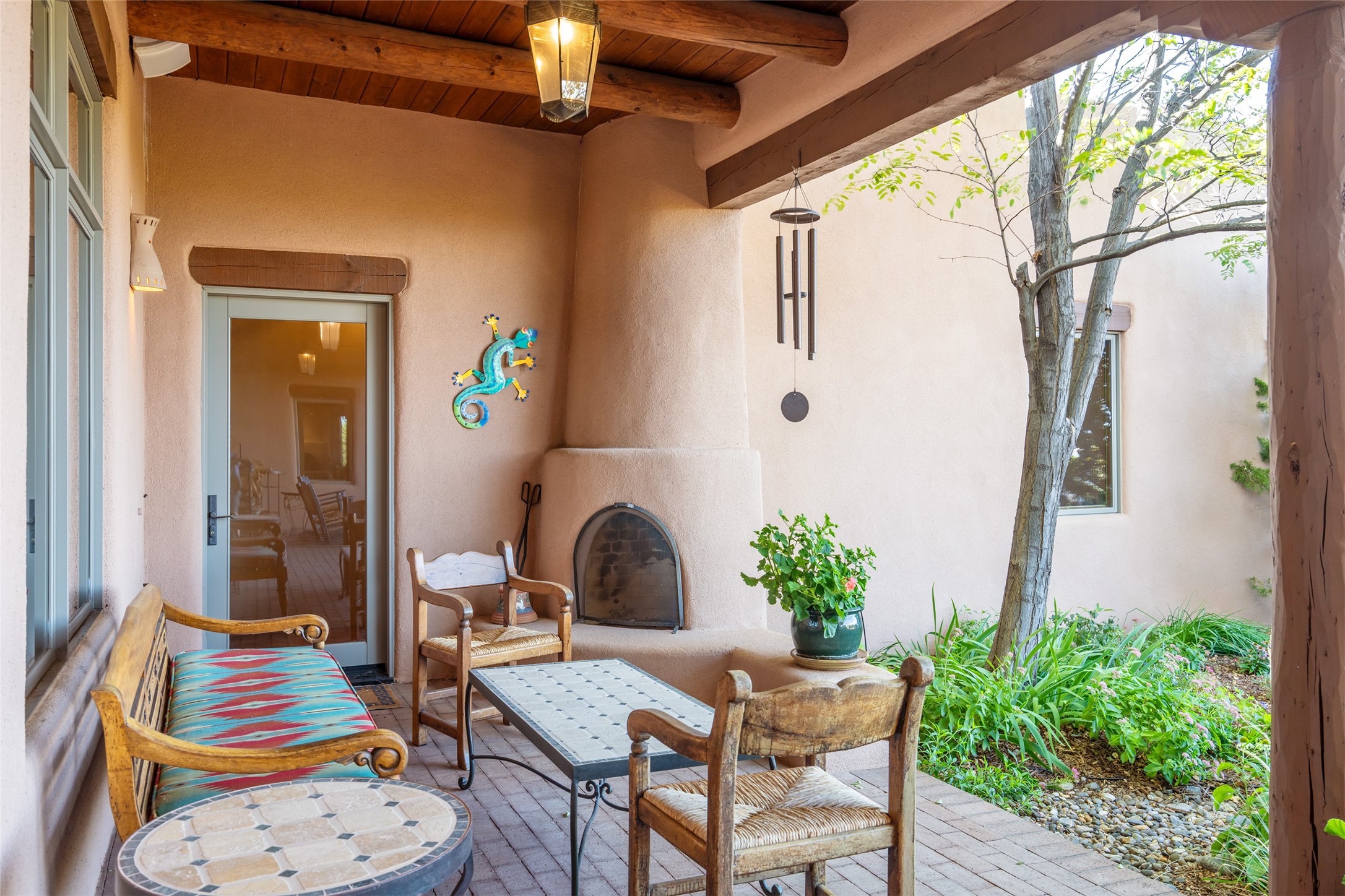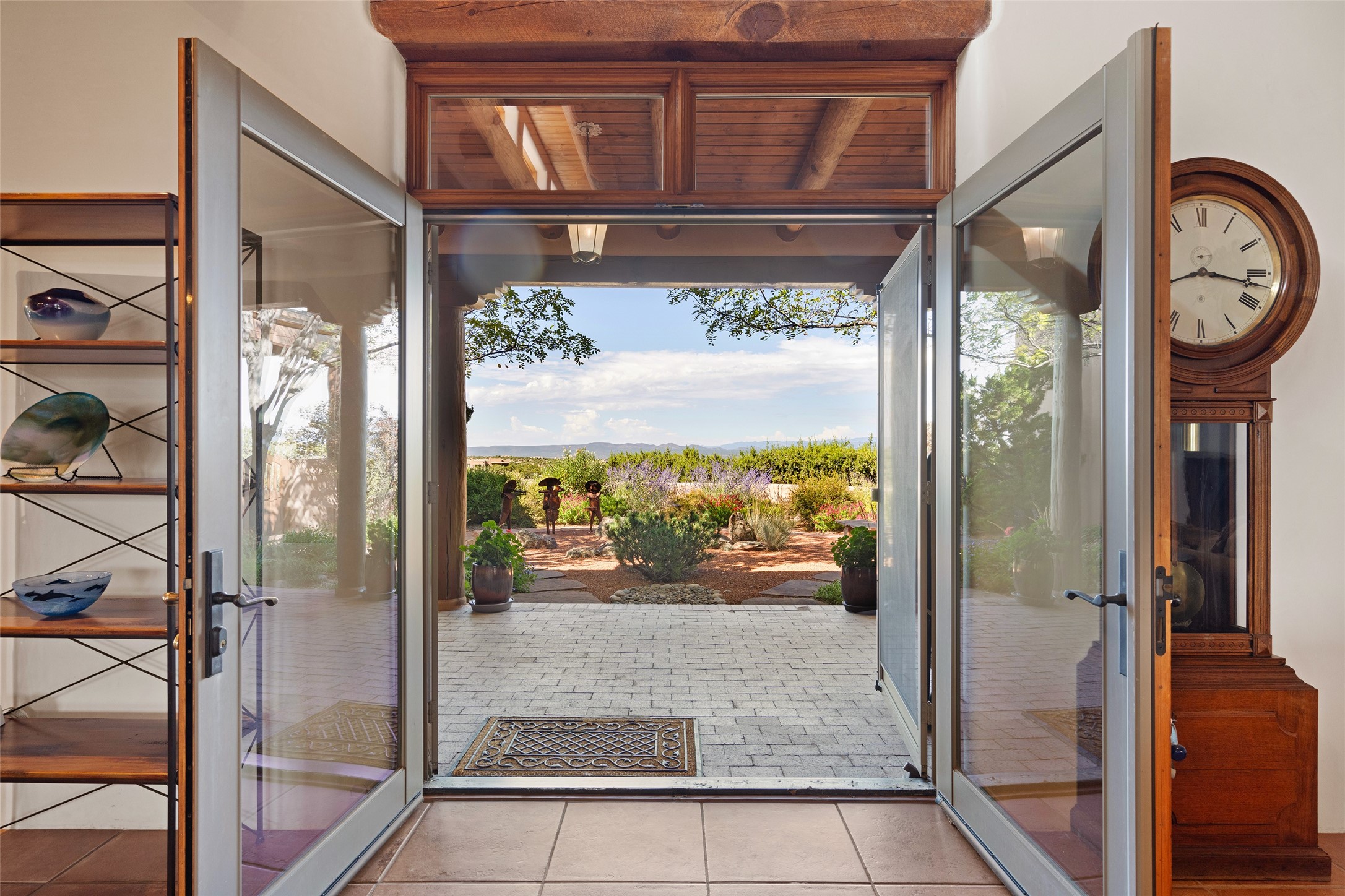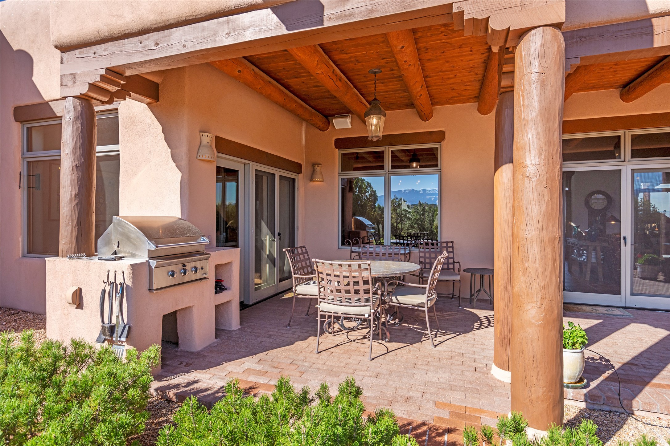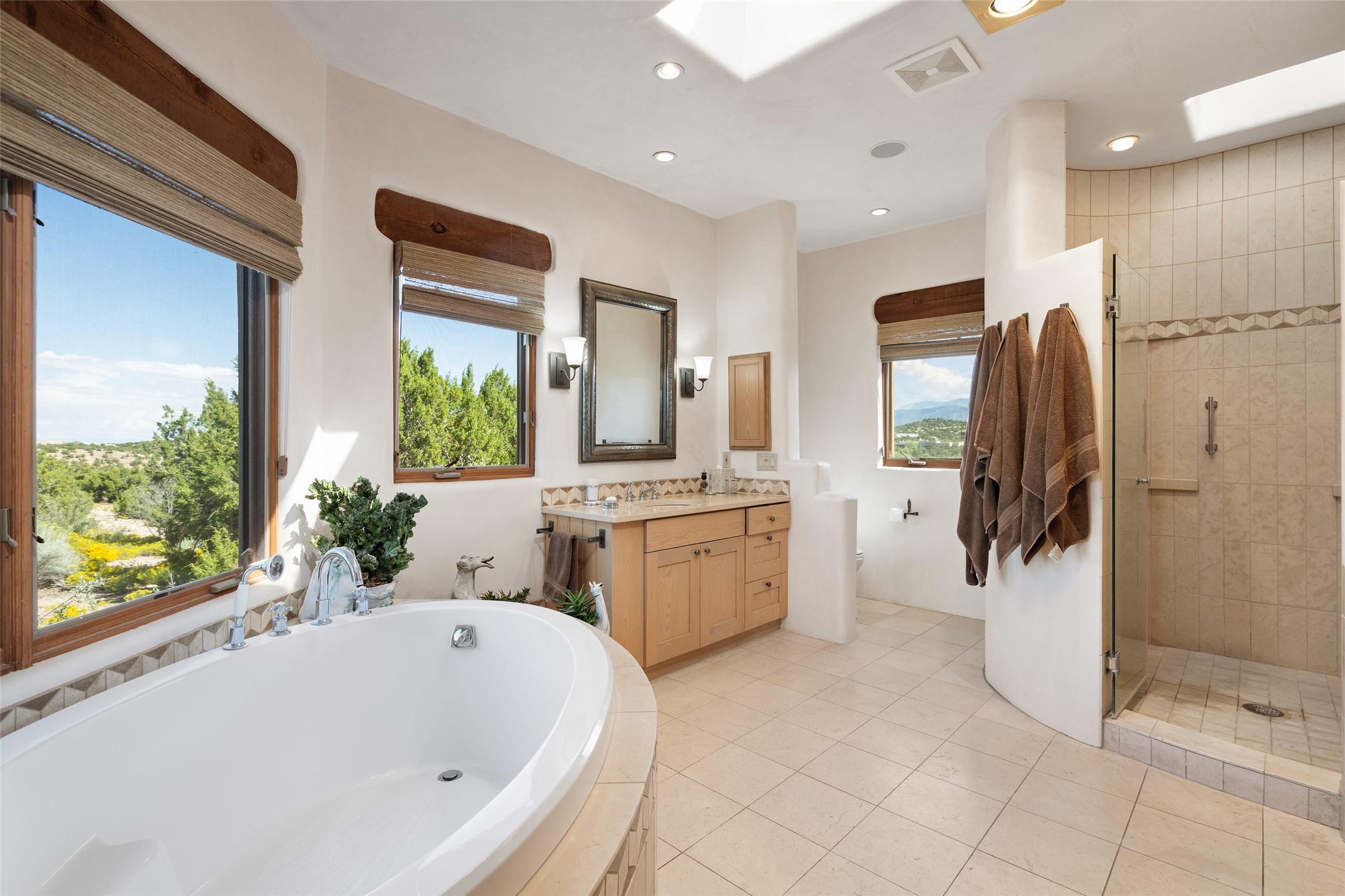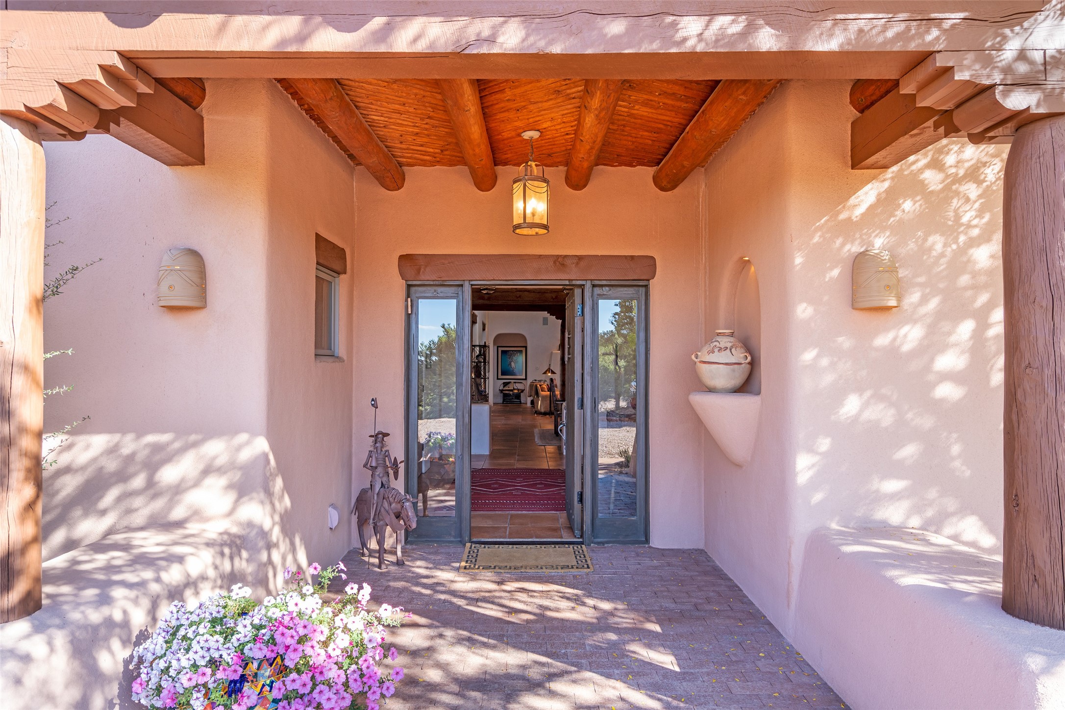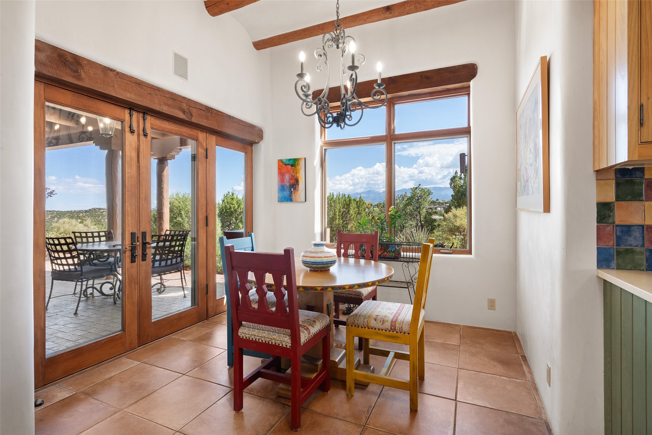SWEEPING VIEWS OF BOTH EASTERN AND WESTERN MOUNTAIN RANGES ON AN ELEVATED LOT IN SUNDANCE ESTATES WHERE THE NIGHT SKY IS JUST AS BEAUTIFUL AS THE DAY. Designed by Richard Martinez to be a haven with warm architectural accents and superb Santa Fe touches. Set in the coveted Sundance Estates neighborhood, this stunning 3-bedroom, 3-bath home embodies timeless Santa Fe style. Absolutely full of natural light, this 3,351 sqft residence sits on 2.5 acres of mature landscaping, offering peace, privacy, and natural beauty. Inside, traditional vigas, beams, and coved ceilings are paired with creamy plaster walls, wood and tile floors, and radiant heating throughout. Four wood-burning fireplaces anchor the warm and inviting living spaces, while the gourmet kitchen is a delightful and colorful place to cook together or just cozy up with a cup of coffee and the newspaper. It features high-end appliances, and scads of counterspace and storage. Formal and informal dining areas, and seamless flow to outdoor dining patios give this residence high appeal for entertaining. The primary suite offers serenity with breathtaking views, while guest accommodations have their own wing and are equally welcoming with views and privacy. Outdoor living is elevated with multiple patios, a hot tub, and manicured grounds designed for relaxation and entertaining. A 3-car garage and additional driveway parking for 5 vehicles provide convenience. The third bay of the garage was built as a fabulous studio space and could be an art studio, gym, yoga spot, crafts room - you name it! This property is a masterful balance of traditional craftsmanship and modern comfort - an exceptional haven for refined easy Southwestern living.
