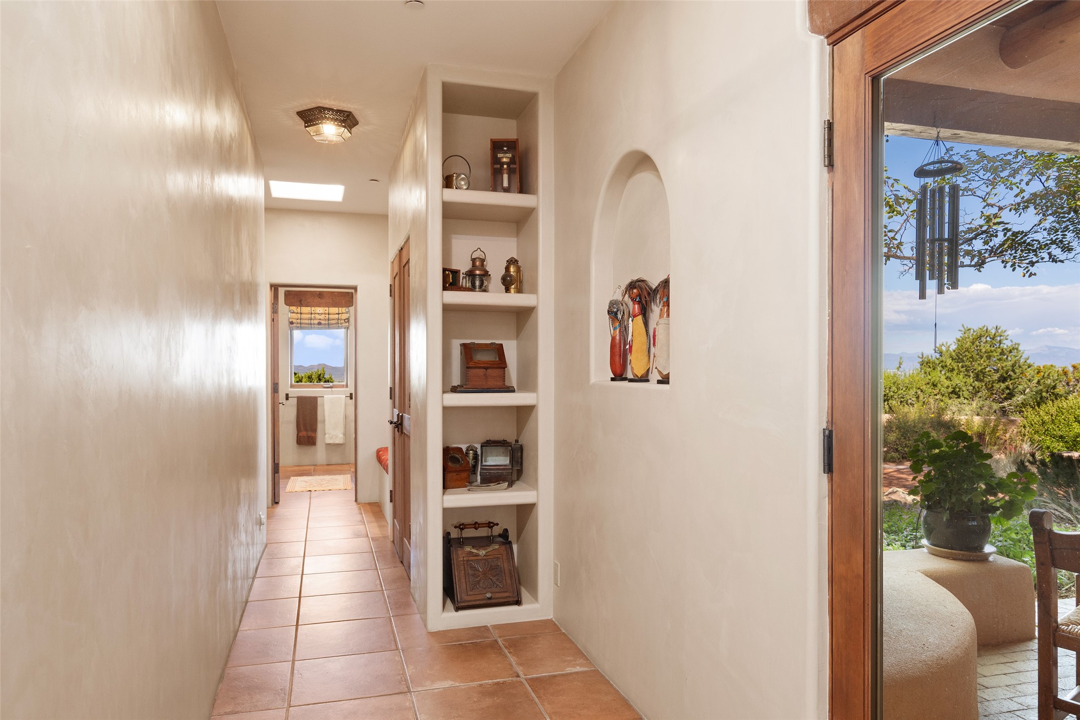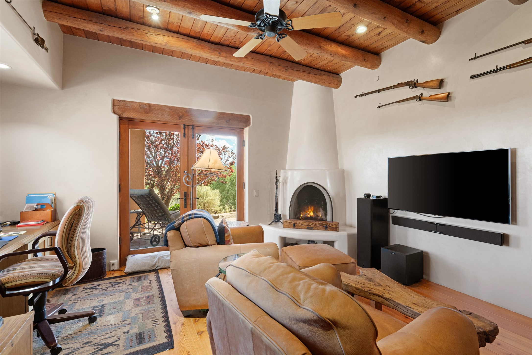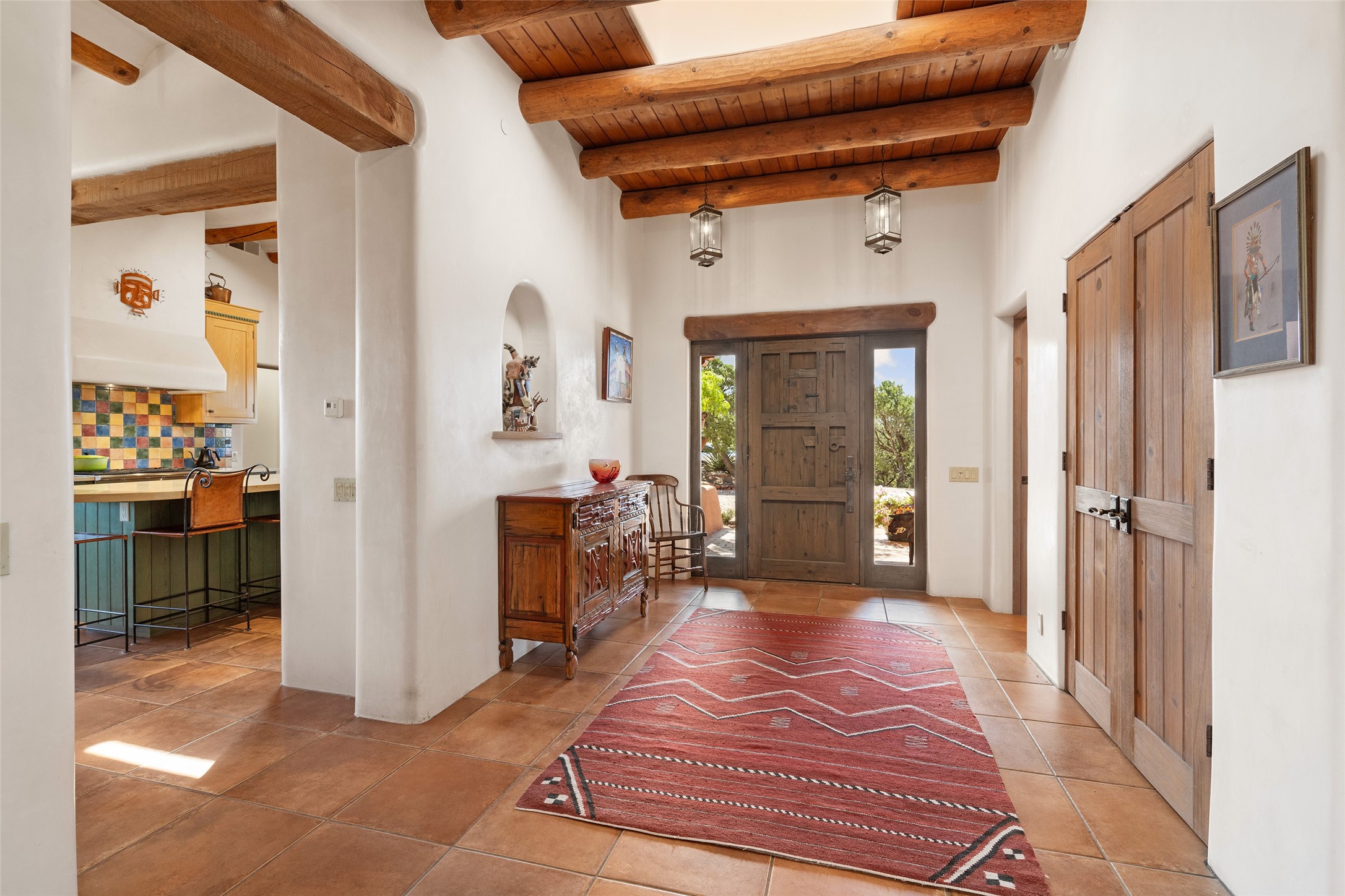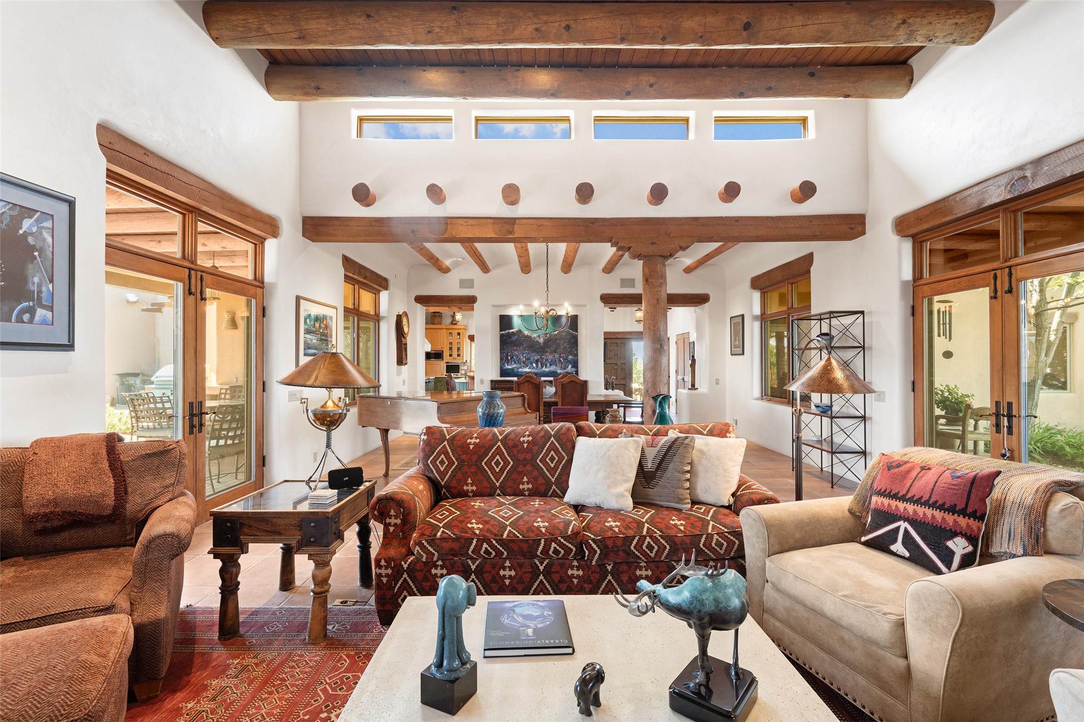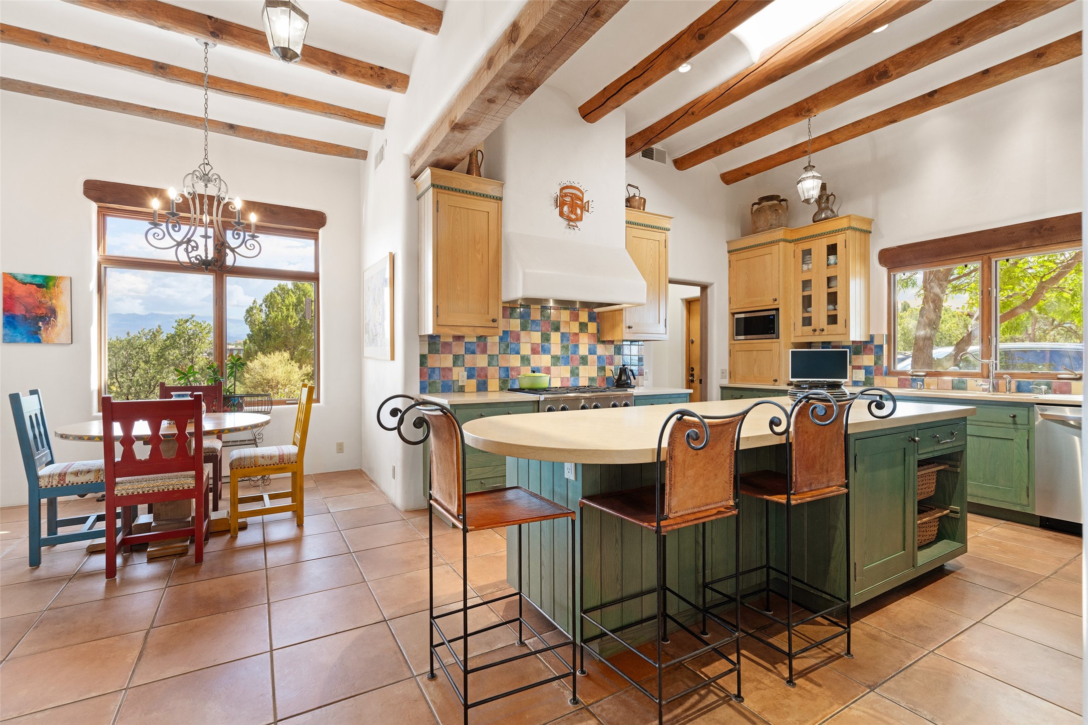 SWEEPING VIEWS OF BOTH EASTERN AND WESTERN MOUNTAIN RANGES ON AN ELEVATED LOT IN SUNDANCE ESTATES WHERE THE NIGHT SKY IS JUST AS BEAUTIFUL AS THE DAY. Designed by Richard Martinez to be a haven with warm architectural accents and superb Santa Fe touches. Set in the coveted Sundance Estates neighborhood, this stunning 3-bedroom, 3-bath home embodies timeless Santa Fe style. Absolutely full of natural light, this 3,351 sqft residence sits on 2.5 acres of mature landscaping, offering peace, privacy, and natural beauty. Inside, traditional vigas, beams, and coved ceilings are paired with creamy plaster walls, wood and tile floors, and radiant heating throughout. Four wood-burning fireplaces anchor the warm and inviting living spaces, while the gourmet kitchen is a delightful and colorful place to cook together or just cozy up with a cup of coffee and the newspaper. It features high-end appliances, and scads of counterspace and storage. Formal and informal dining areas, and seamless flow to outdoor dining patios give this residence high appeal for entertaining. The primary suite offers serenity with breathtaking views, while guest accommodations have their own wing and are equally welcoming with views and privacy. Outdoor living is elevated with multiple patios, a hot tub, and manicured grounds designed for relaxation and entertaining. A 3-car garage and additional driveway parking for 5 vehicles provide convenience. The third bay of the garage was built as a fabulous studio space and could be an art studio, gym, yoga spot, crafts room - you name it! This property is a masterful balance of traditional craftsmanship and modern comfort - an exceptional haven for refined easy Southwestern living.