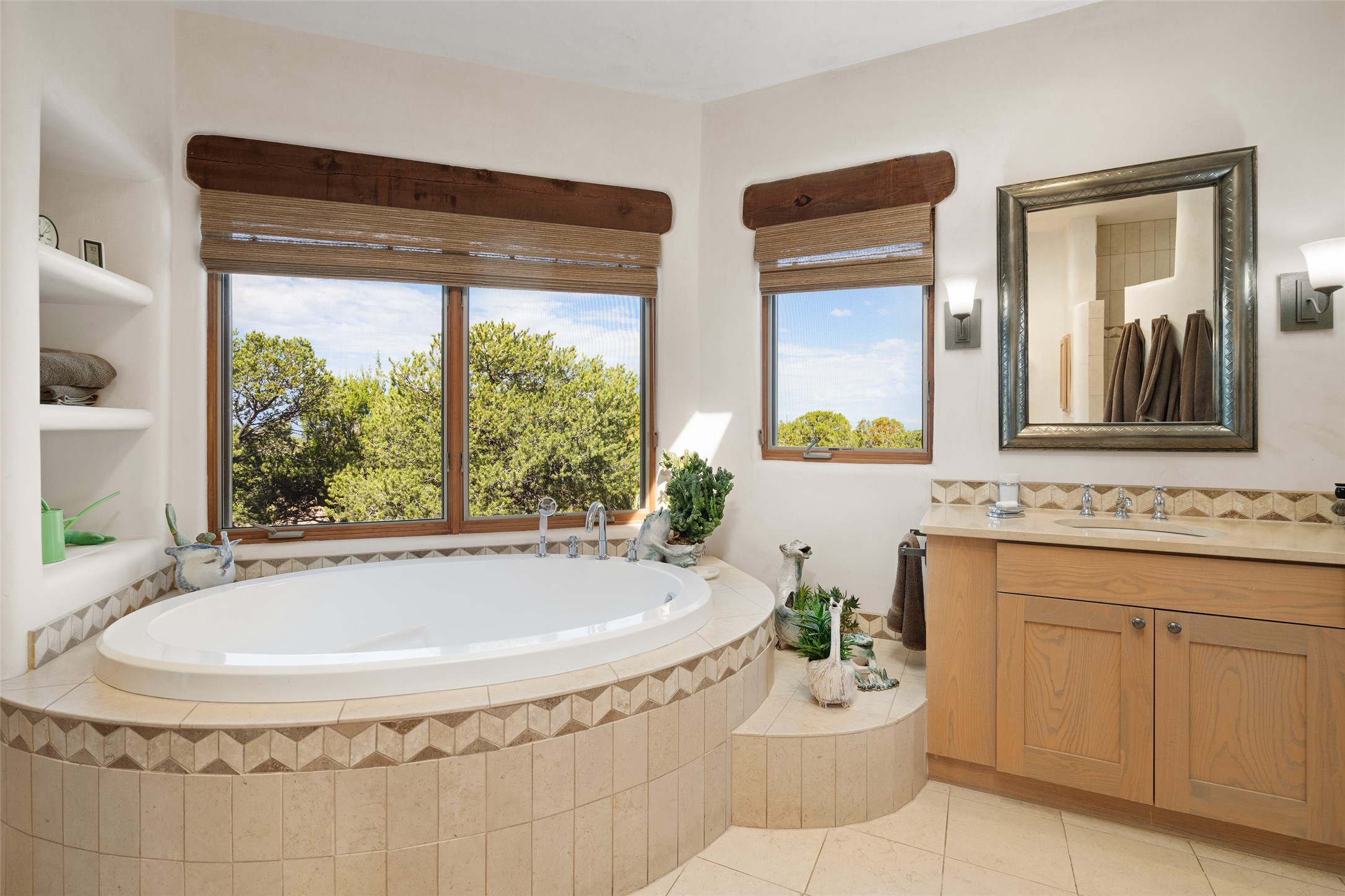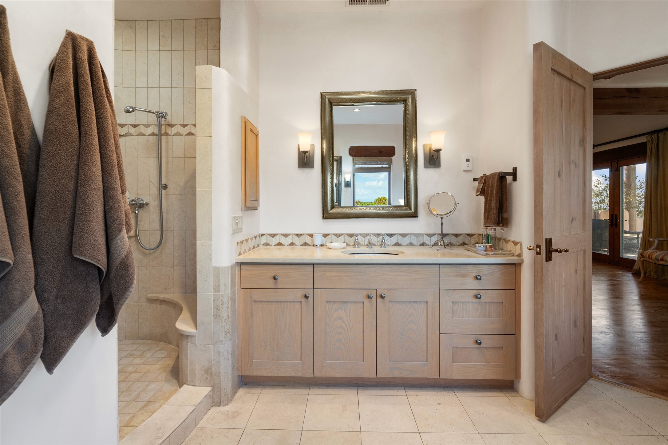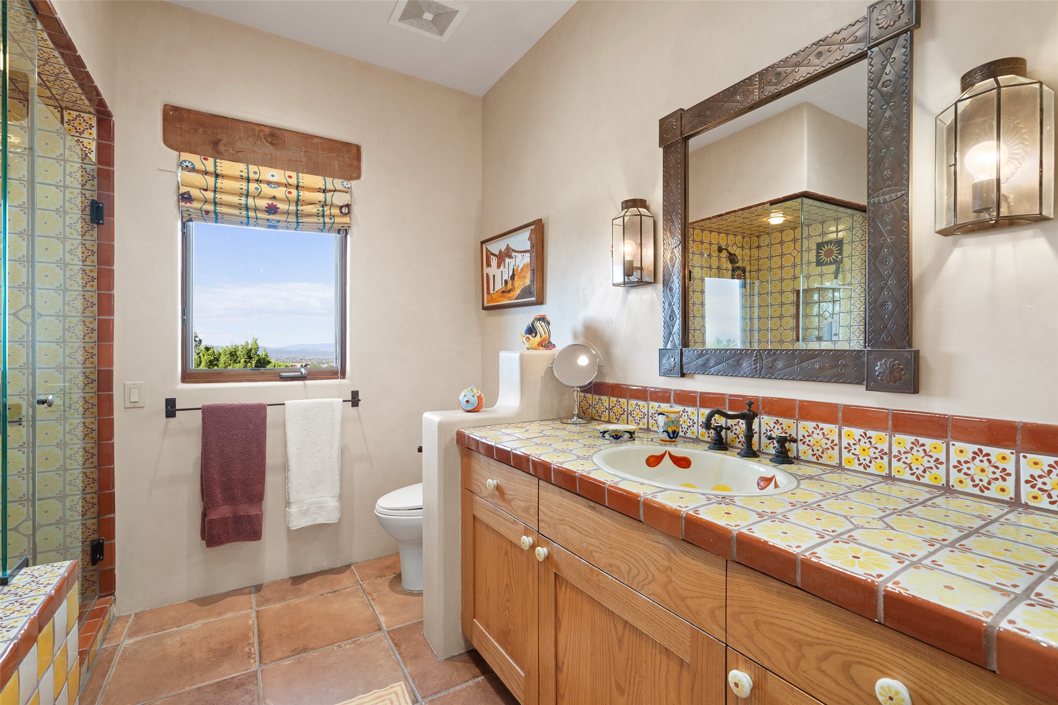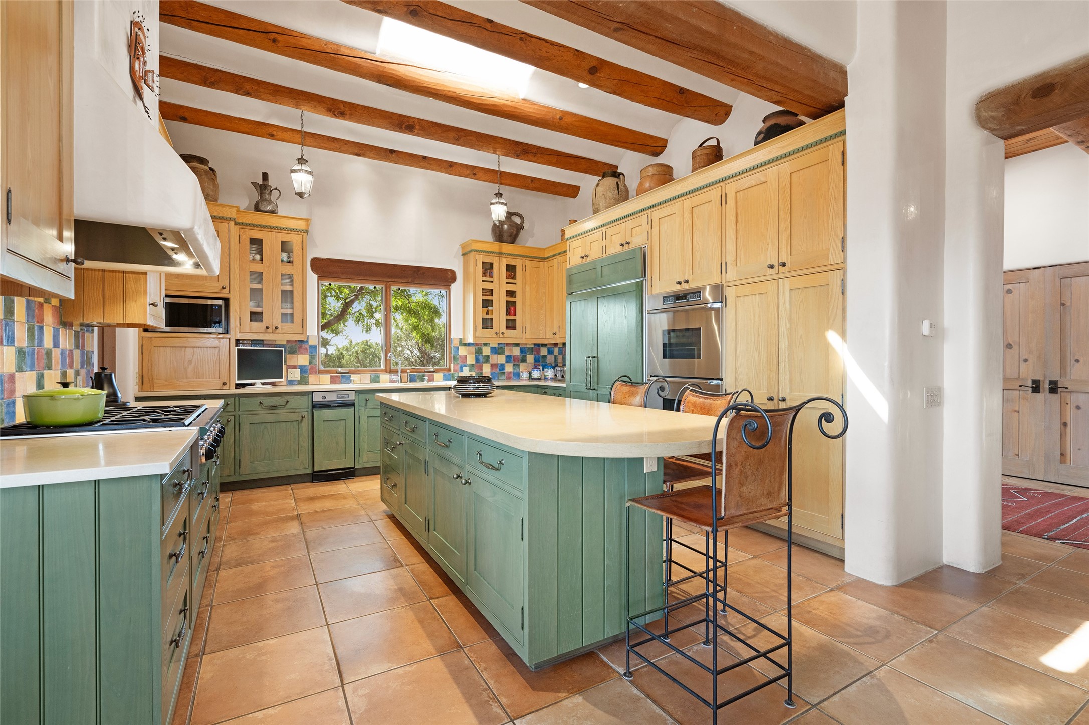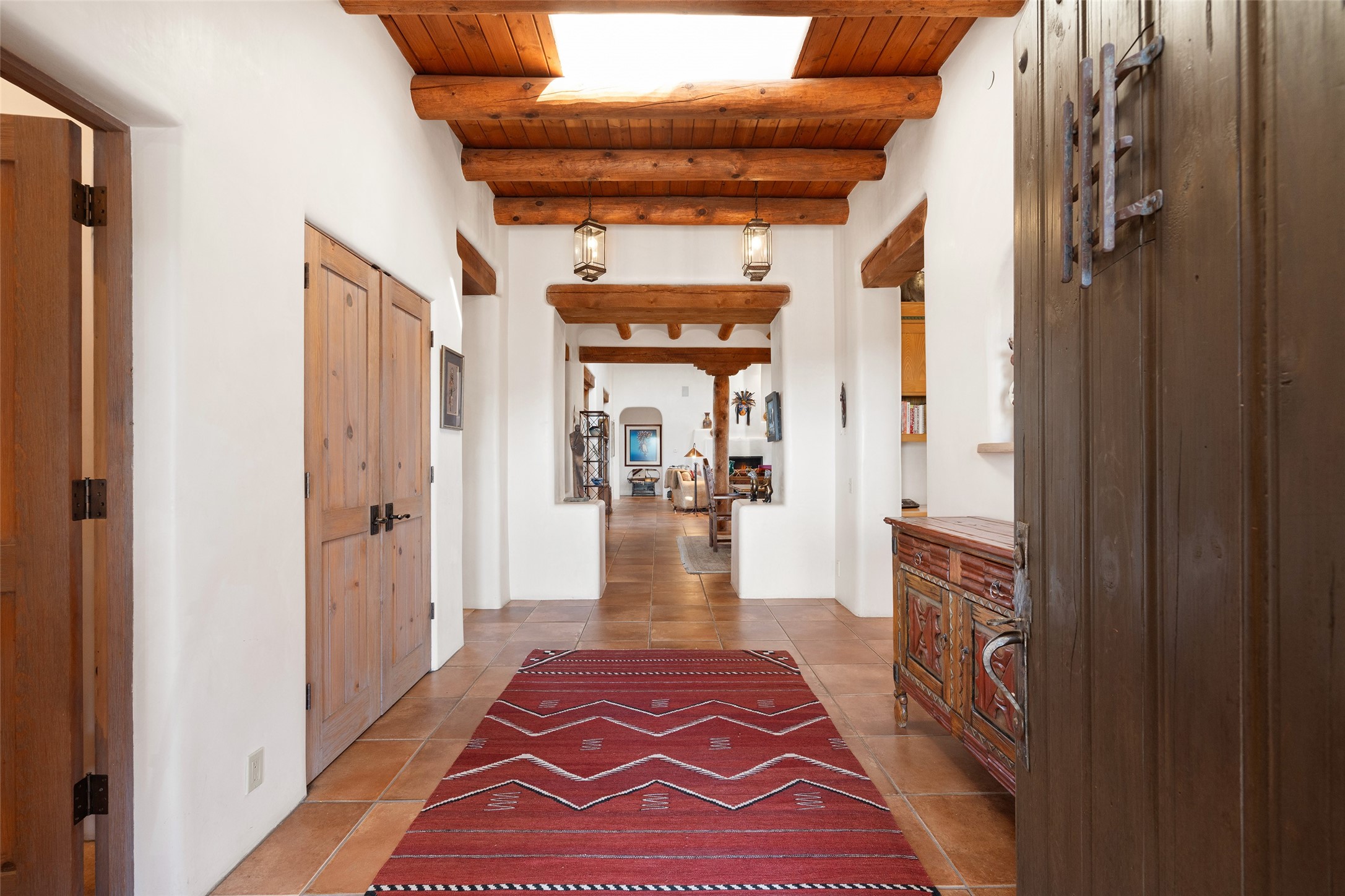 SWEEPING VIEWS OF BOTH EASTERN AND WESTERN MOUNTAIN RANGES ON AN ELEVATED LOT IN SUNDANCE ESTATES WHERE THE NIGHT SKY IS JUST AS BEAUTIFUL AS THE DAY. Designed by Richard Martinez to be a haven with warm architectural accents and superb Santa Fe touches. Set in the coveted Sundance Estates neighborhood, this stunning 3-bedroom, 3-bath home embodies timeless Santa Fe style. Absolutely full of natural light, this 3,351 sqft residence sits on 2.5 acres of mature landscaping, offering peace, privacy, and natural beauty. Inside, traditional vigas, beams, and coved ceilings are paired with creamy plaster walls, wood and tile floors, and radiant heating throughout. Four wood-burning fireplaces anchor the warm and inviting living spaces, while the gourmet kitchen is a delightful and colorful place to cook together or just cozy up with a cup of coffee and the newspaper. It features high-end appliances, and scads of counterspace and storage. Formal and informal dining areas, and seamless flow to outdoor dining patios give this residence high appeal for entertaining. The primary suite offers serenity with breathtaking views, while guest accommodations have their own wing and are equally welcoming with views and privacy. Outdoor living is elevated with multiple patios, a hot tub, and manicured grounds designed for relaxation and entertaining. A 3-car garage and additional driveway parking for 5 vehicles provide convenience. The third bay of the garage was built as a fabulous studio space and could be an art studio, gym, yoga spot, crafts room - you name it! This property is a masterful balance of traditional craftsmanship and modern comfort - an exceptional haven for refined easy Southwestern living.