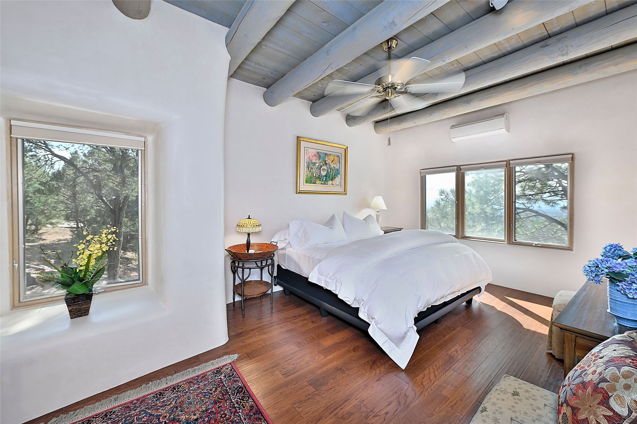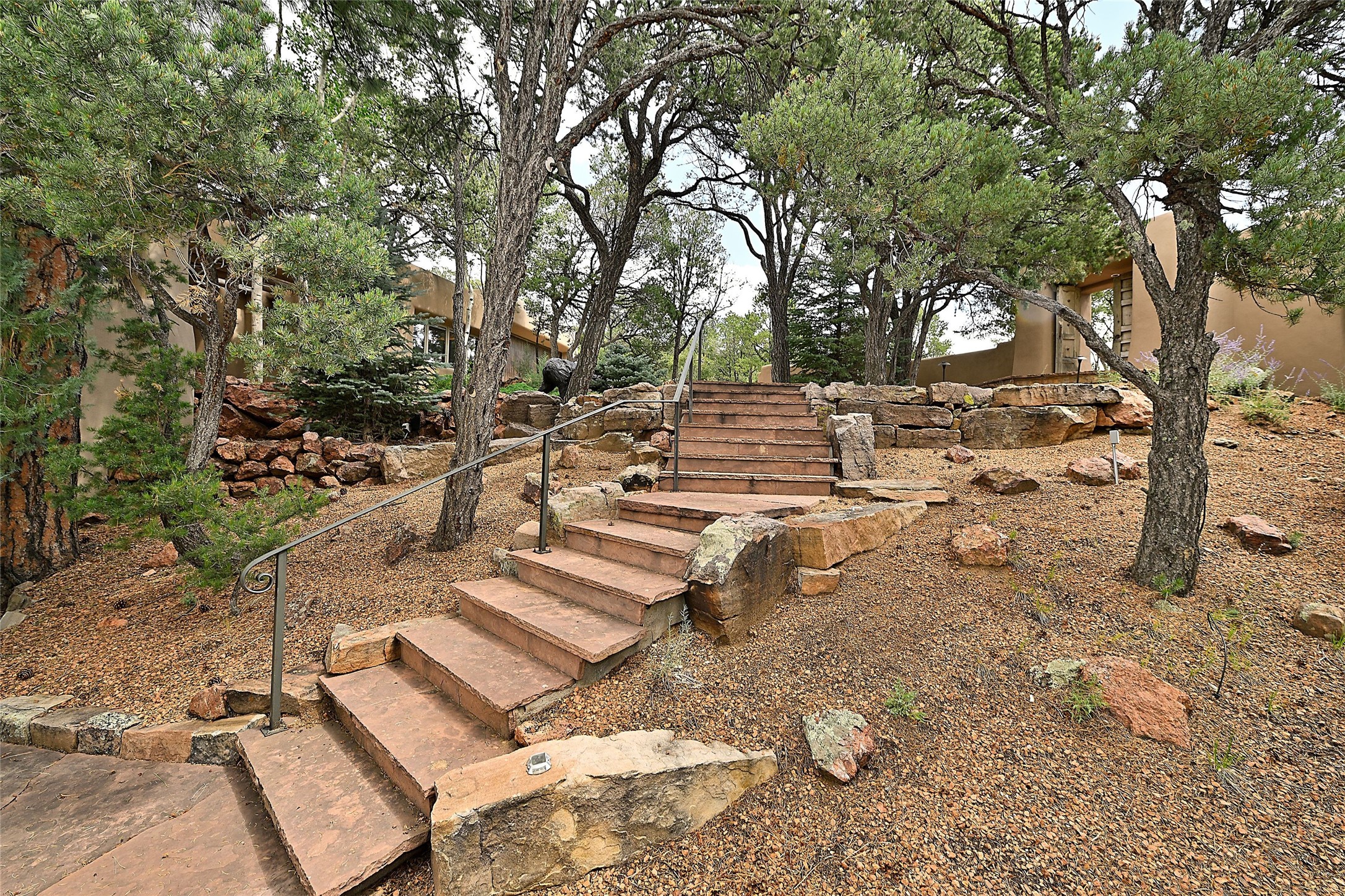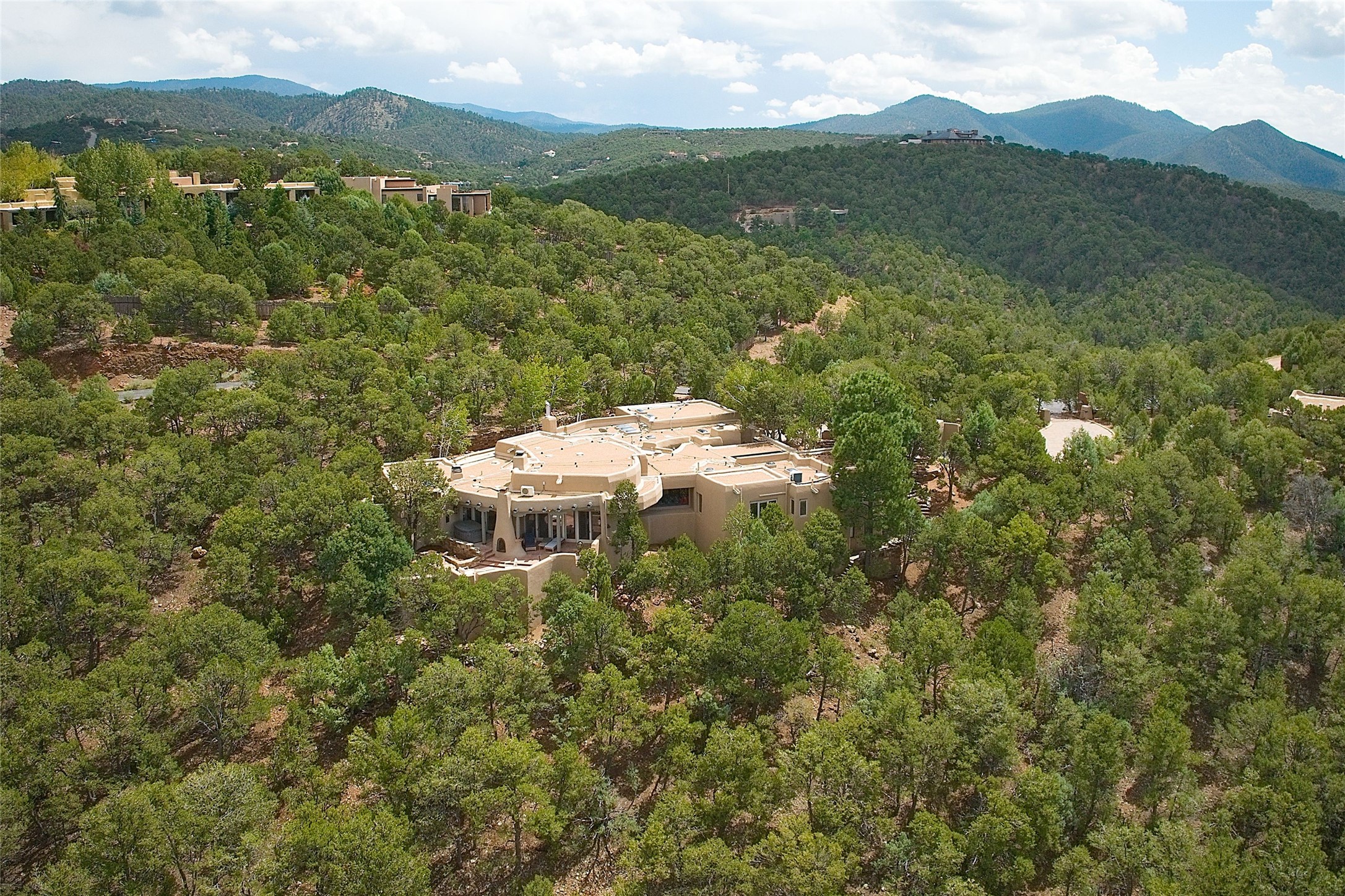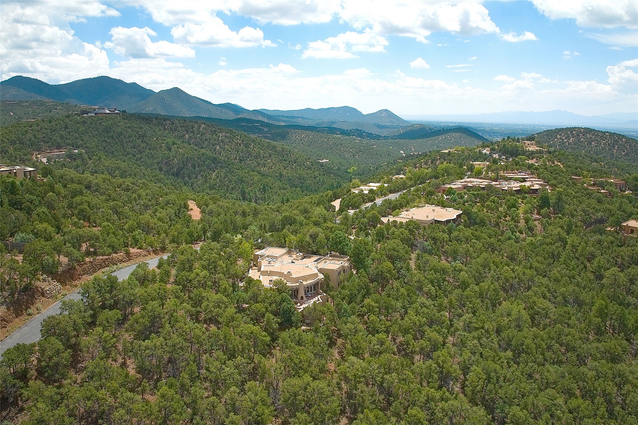 This striking 5-bedroom, 5.5-bath residence, set on 1.19 forested acres in High Summit, offers commanding views of the Jemez Mountains and Santa Fe city lights, creating a mesmerizing backdrop that transforms with the setting sun. Designed with the essence of Santa Fe style, this home includes soaring ceilings framed by rustic beams, a harmonious blend of hardwood and flagstone floors, and unique banco seating areas. Step into the grand living room, where an oversized fireplace makes a bold statement, effortlessly flowing into an elegant dining area that invites gatherings and celebrations. The outside portal calls to those who enjoy alfresco living, featuring an outdoor kiva and a hot tub that promise evenings of relaxation and stargazing. The kitchen, complete with a Wolf range and a Subzero refrigerator, seamlessly connect to a den/media room with its own kiva fireplace. The primary suite features a fireplace, sitting area that opens to the outdoor portal and a gorgeous spa-like bathroom, showcasing a soaking tub, a fireplace for those chilly evenings, and an expansive walk-in shower with double shower heads. In addition, there is a detached 2-bedroom, 2-bath guesthouse. Recent enhancements, including new pine trees and a new driveway, alongside a newer roof with a 10-year warranty. Located just minutes away from the renowned Ten Thousand Waves Spa, the Santa Fe Ski Basin, Dale Ball Trails, and the downtown Plaza