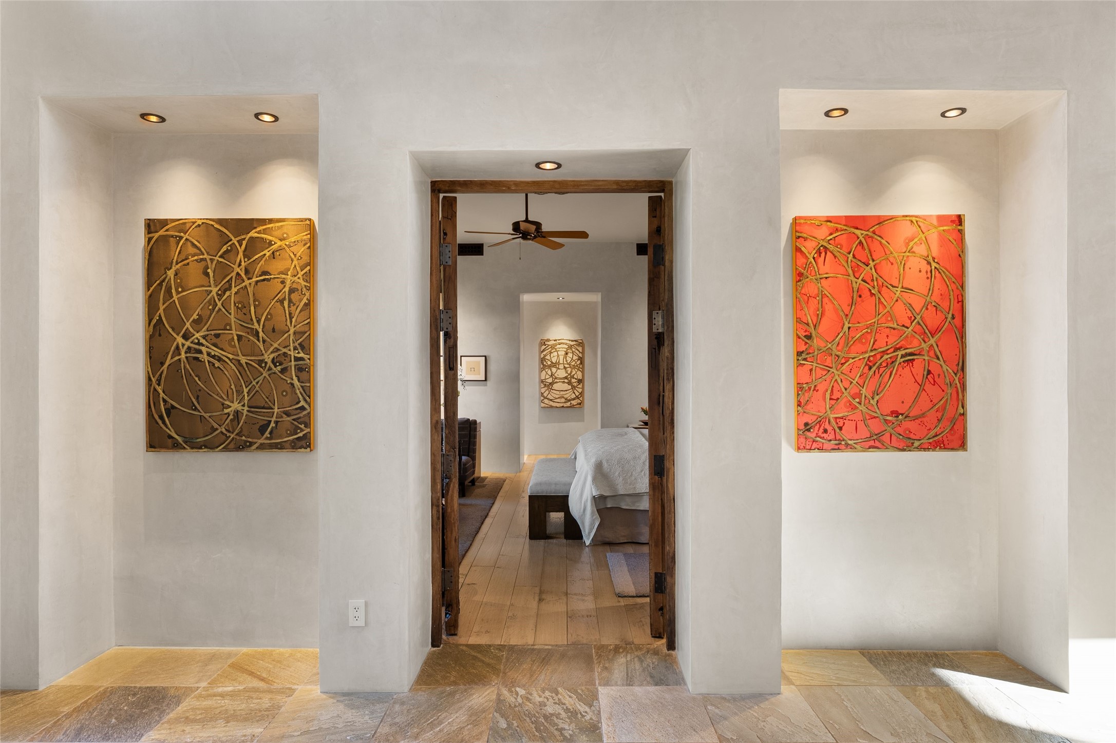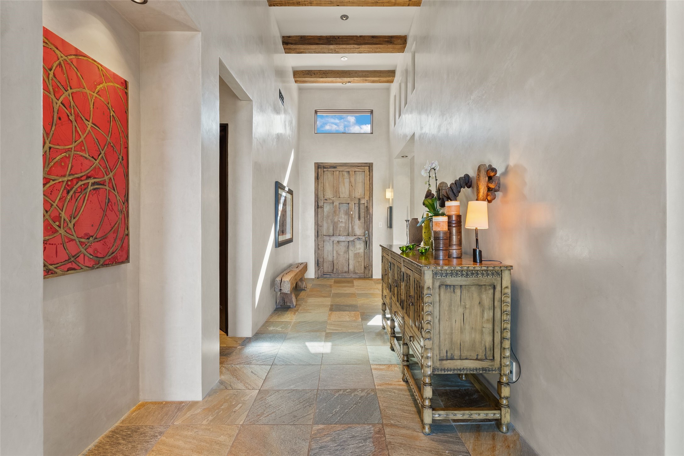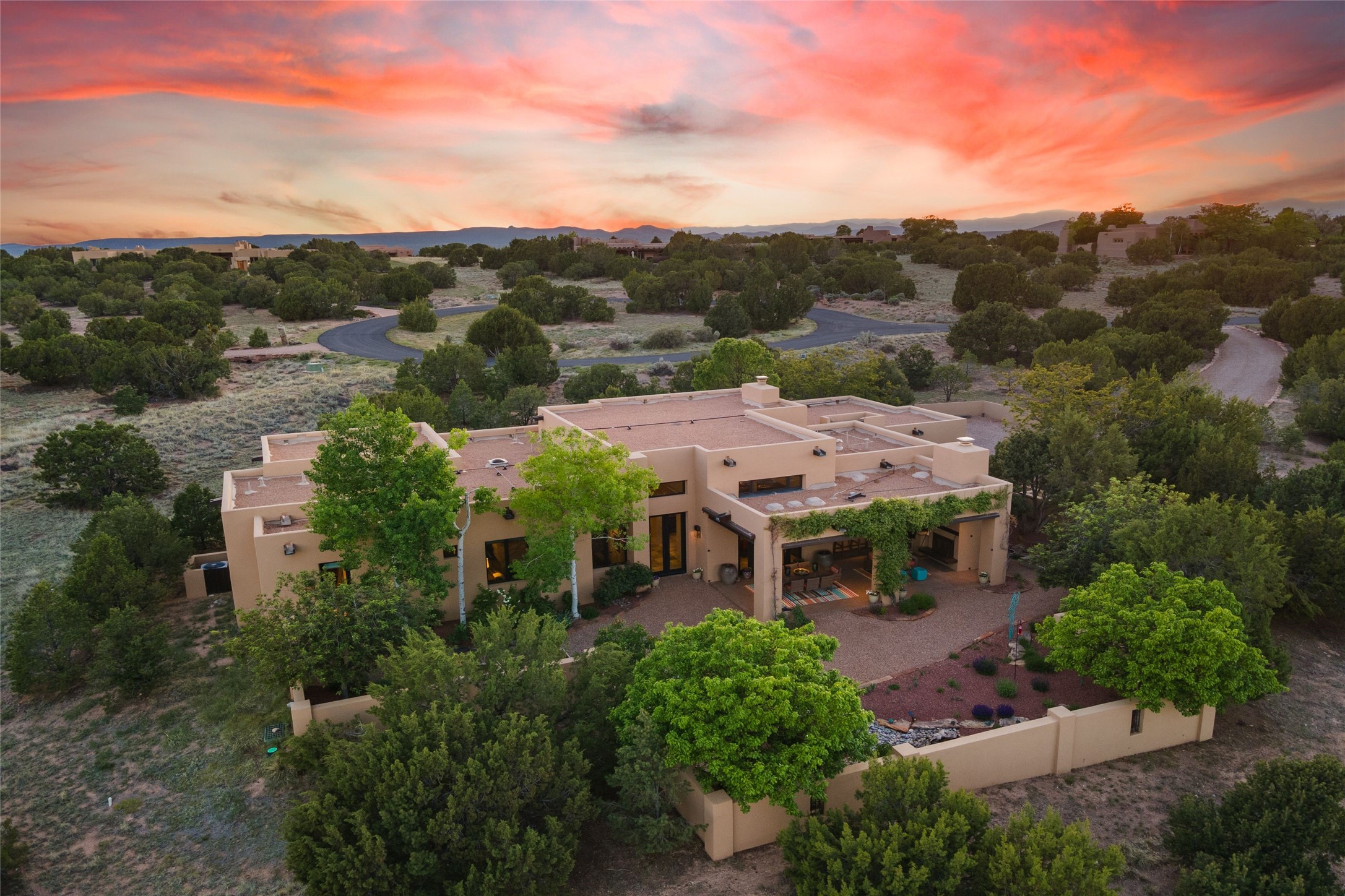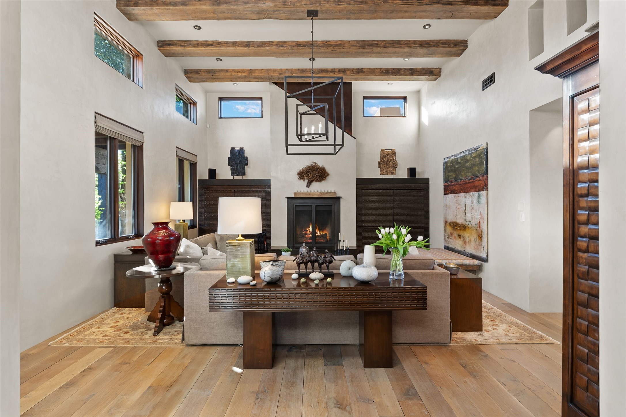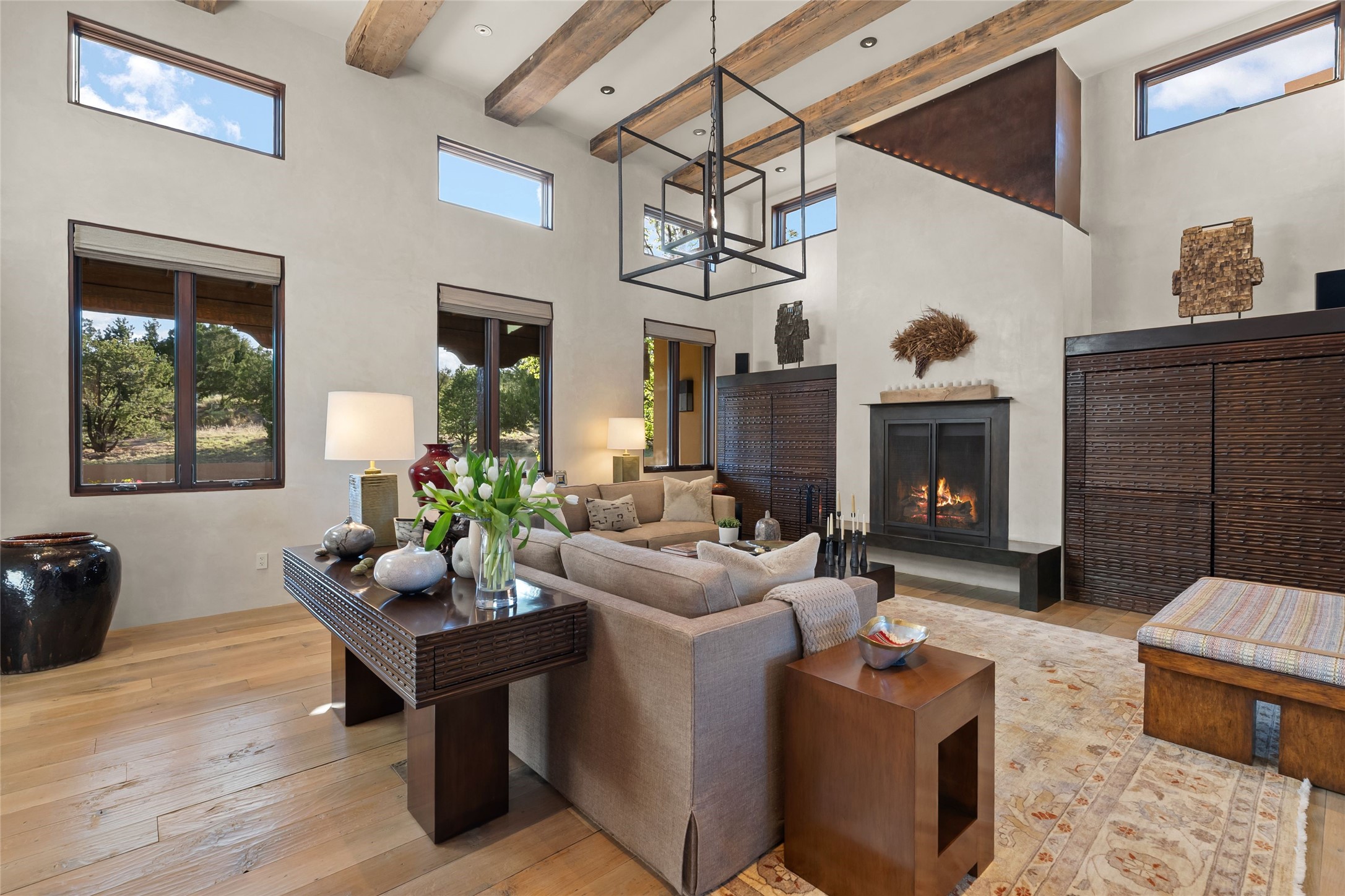 Nestled on nearly two secluded acres in prestigious Las Campanas, this extraordinary, custom interior designer's residence offers an unparalleled connection to Santa Fe's natural splendor. Wake to the majestic Sangre de Cristo mountains, painting an ever-changing canvas outside your window--snow-capped peaks in winter, golden sunset light at dusk, and songbirds as your daily companions. This isn't just a home; it's a masterpiece where every custom detail tells a story. The architecture is by acclaimed architect David Lorimer, and the interiors and furnishings are by award-winning ASID interior designer Jeannie Brown. From century-old reclaimed beams, antique Mexican doors to hand-hewn oak floors, each element was personally selected and designed. The result? A living work of art that only a designer's own sanctuary can achieve.