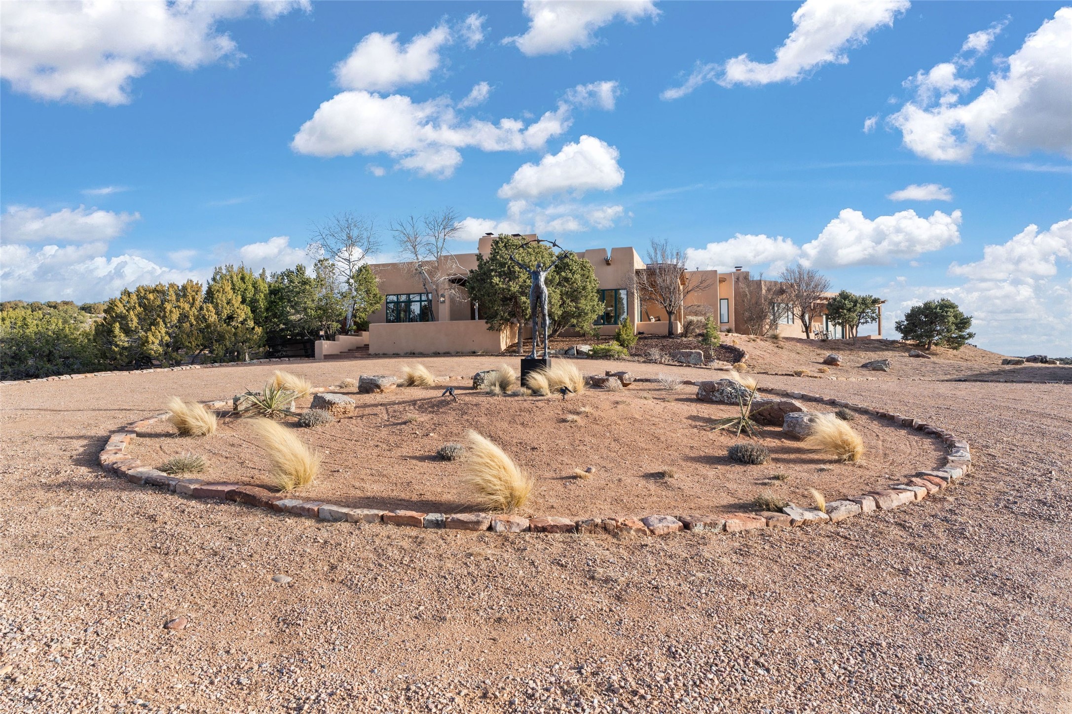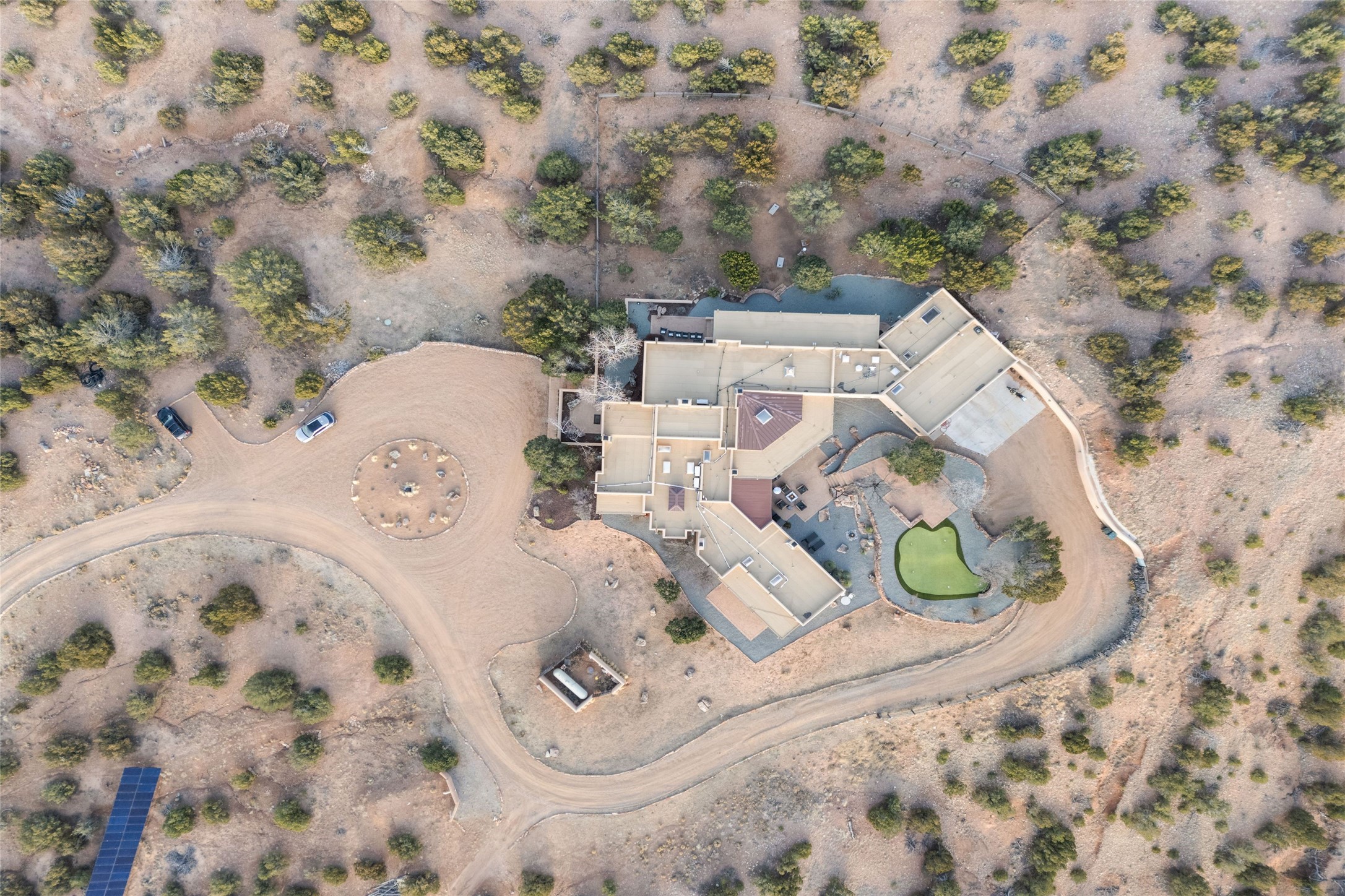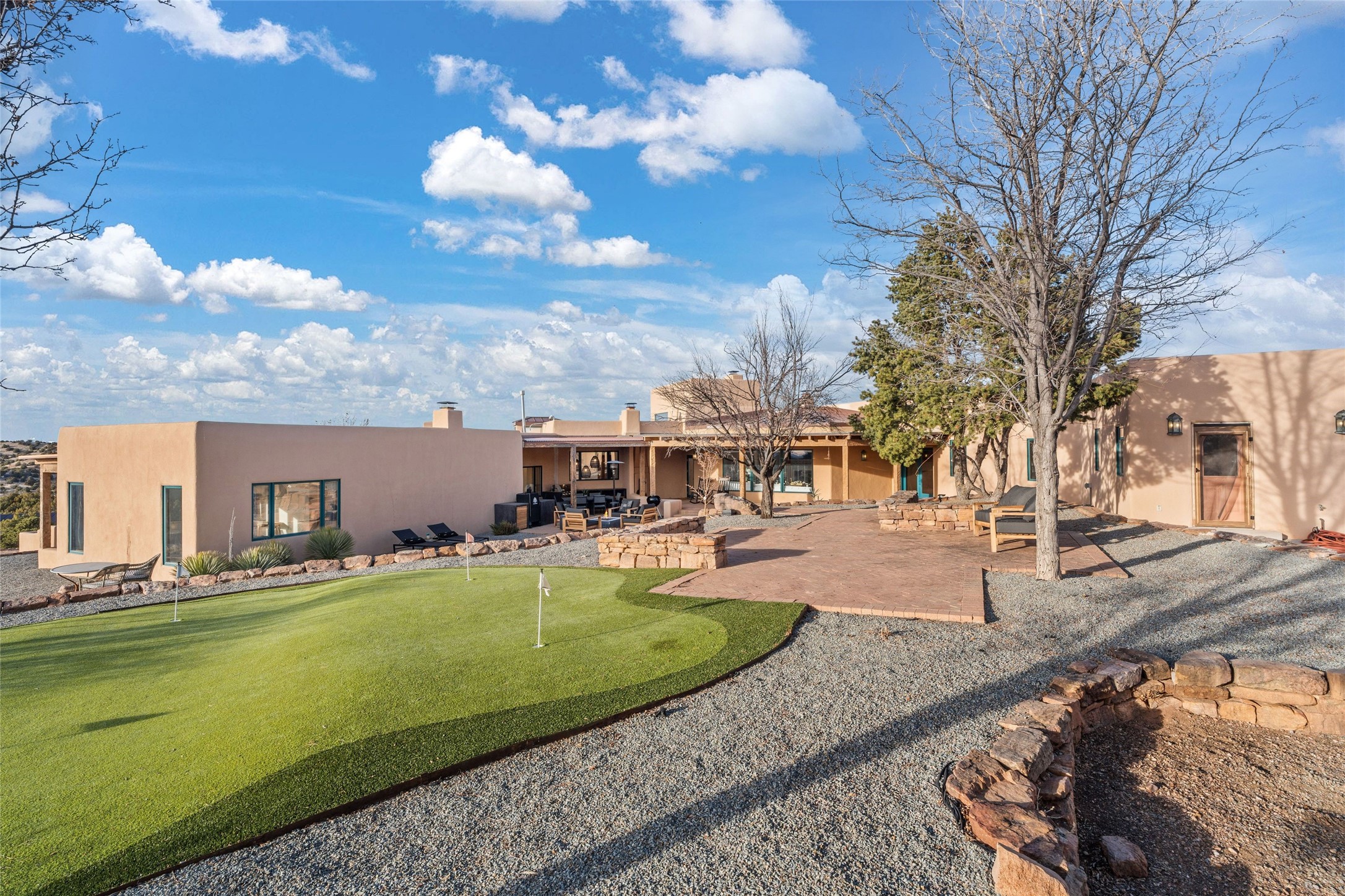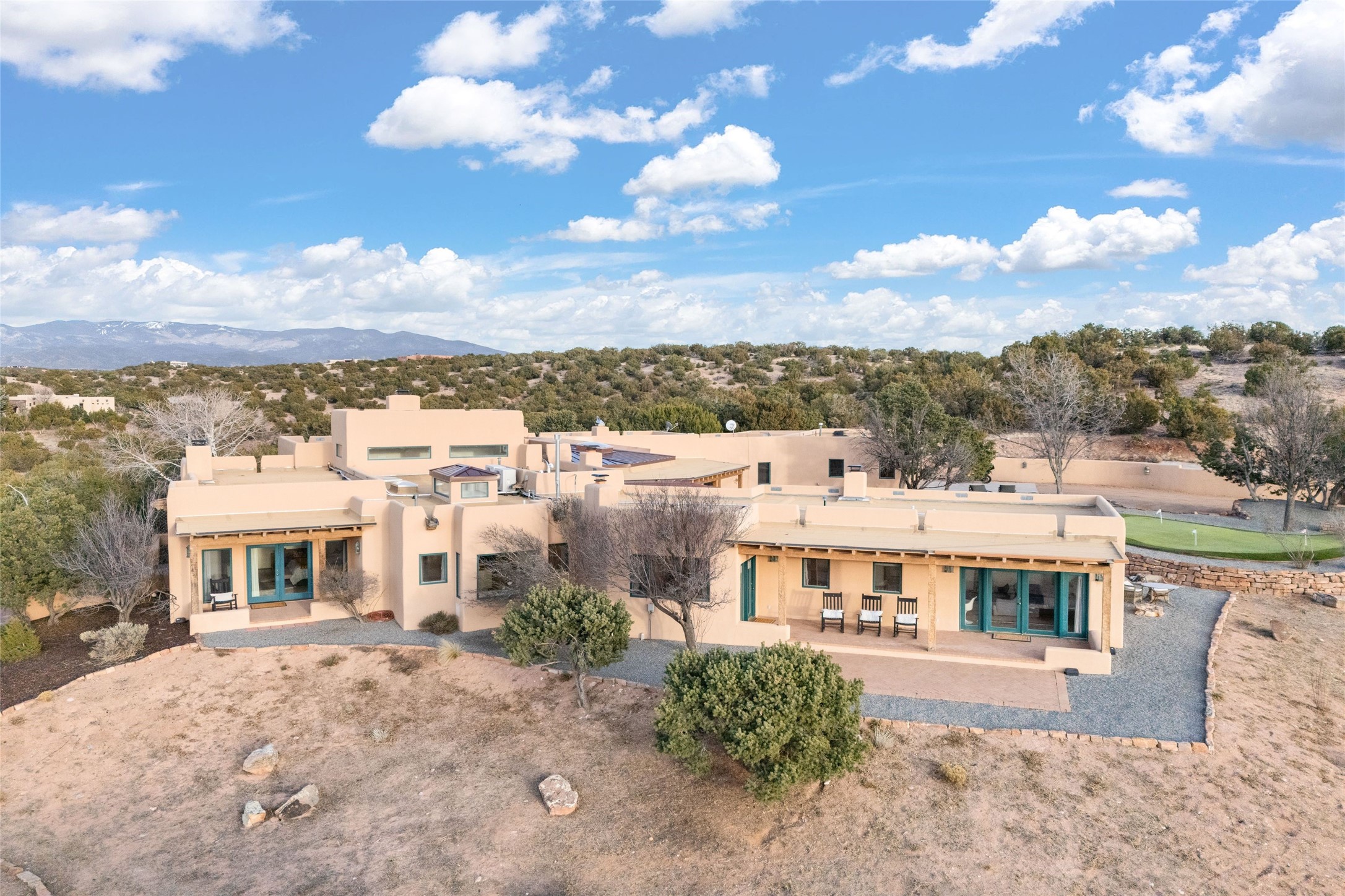 Remarkable 3-bedroom, 4.5-bath luxury retreat set on nearly 12 acres in the desirable La Tierra community. This stunning property offers breathtaking views and a unique 6-hole putting green, making it a golfer's paradise right in your backyard. Diamond plaster walls, vigas and beams, and expansive brick-lined portals add character. Enter through carved wood doors and be greeted by a grand foyer that seamlessly flows into an open-concept living space. Living and dining areas are adorned with soaring 12-ft. ceilings, large-scale windows, and French doors that invite natural light and the beauty of the outdoors into your home. Gourmet kitchen features high-end appliances, a center island with 6-burner cooktop, and a stylish bar area complete with a wine cooler. Retreat to the primary suite, which includes sitting area, fireplace, and a luxurious bath with divided 2 vanities and sinks, 2 water closets, and 2 walk-in closets for ample storage. A versatile studio/media room offers flex space as a 4th bedroom complete with a bathroom with shower. 3-car garage and an extra 10,000-gallon water storage tank. Recent upgrades such as solar photovoltaic electric, 2 new water heaters, window screens, motorized awnings in the living and dining rooms, and all new skylights enhance the home's efficiency. Enjoy awe-inspiring sunset views that will take your breath away, all while being conveniently located just 10-15 minutes from the Santa Fe Plaza, Ten Thousand Waves, and the Santa Fe Opera.
