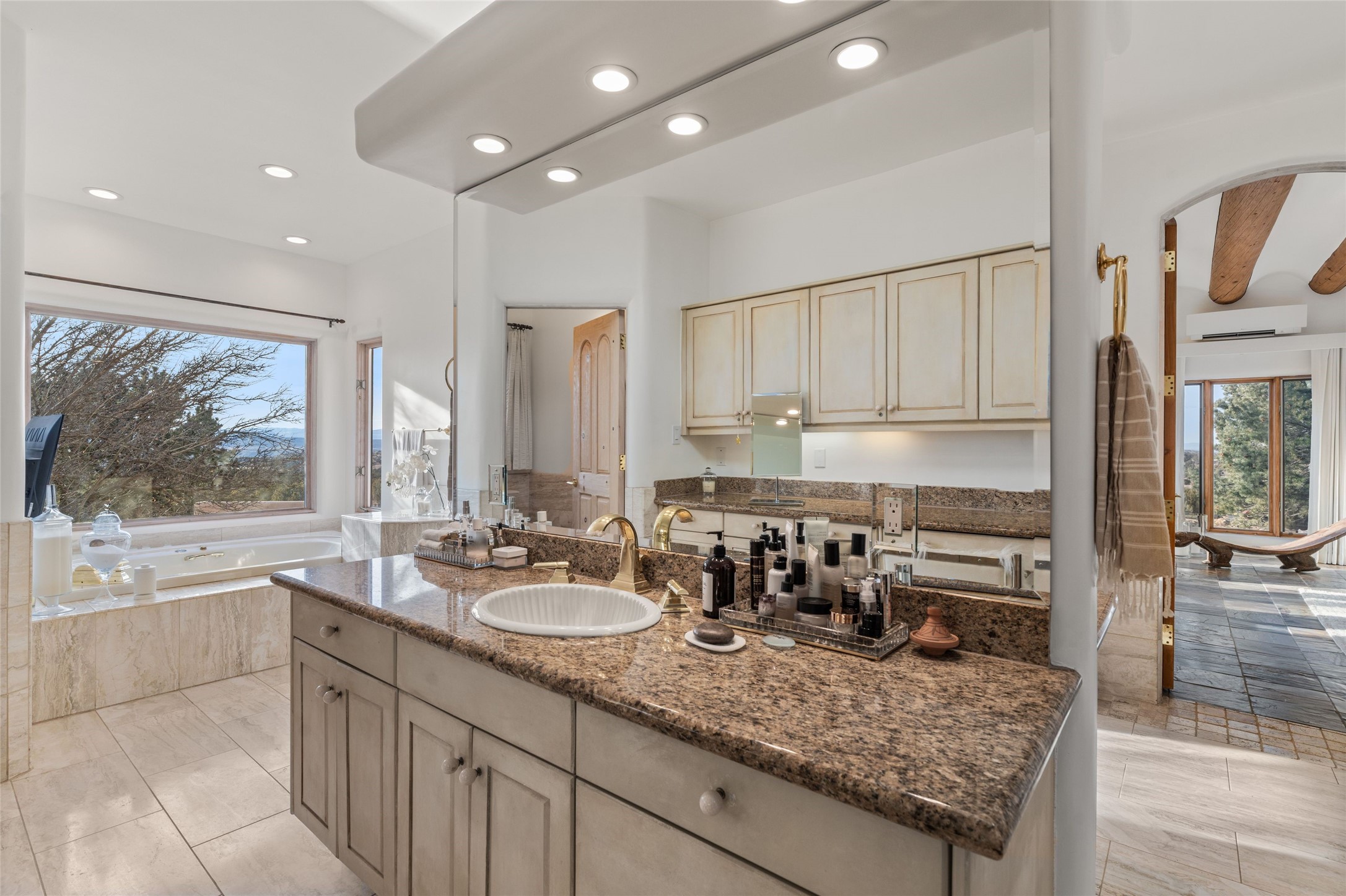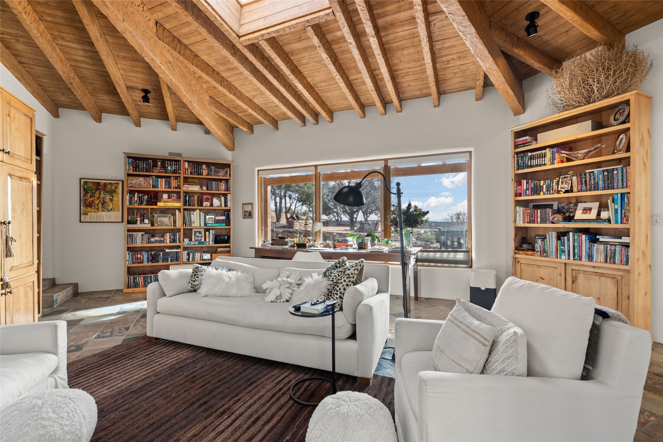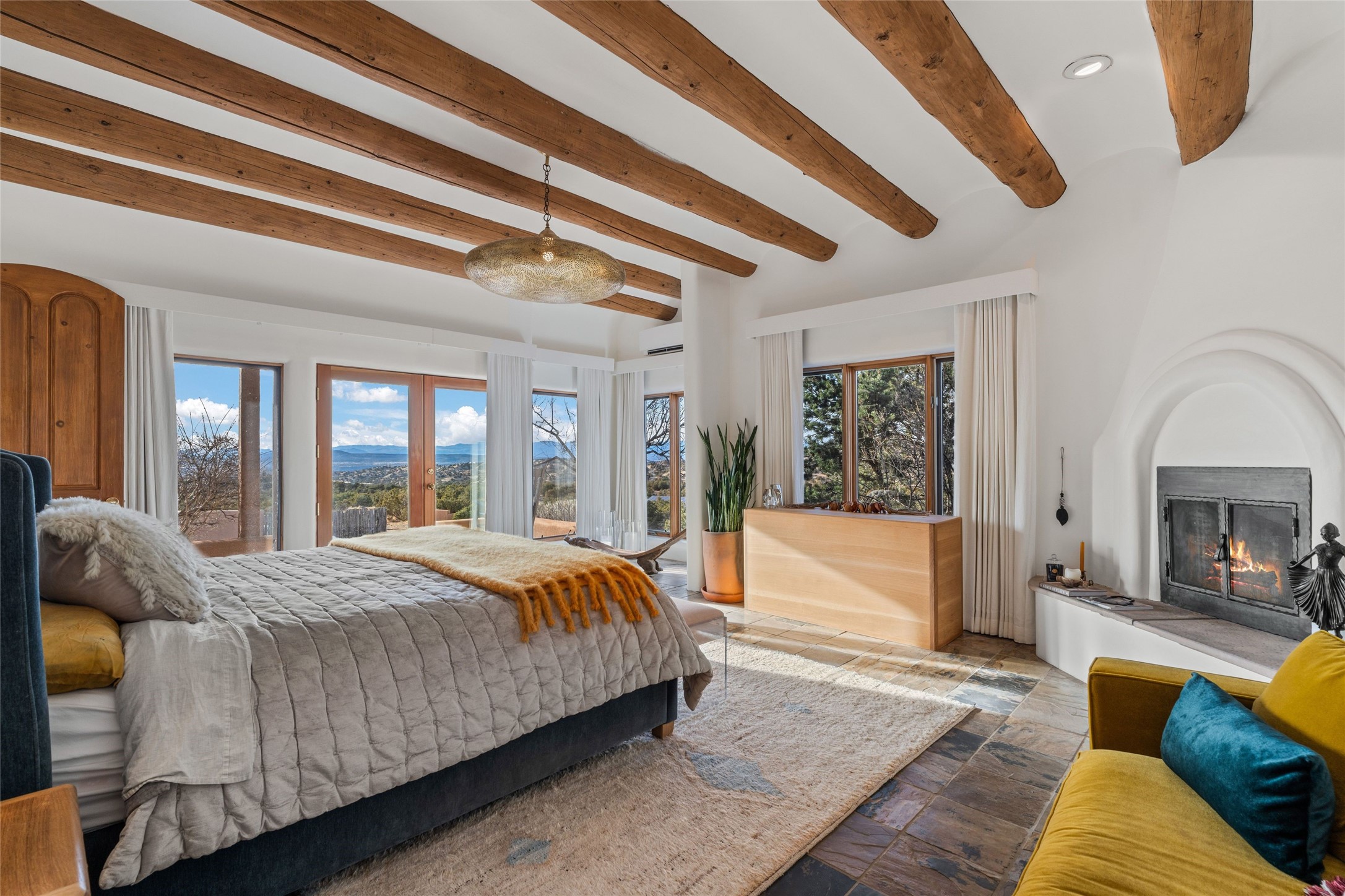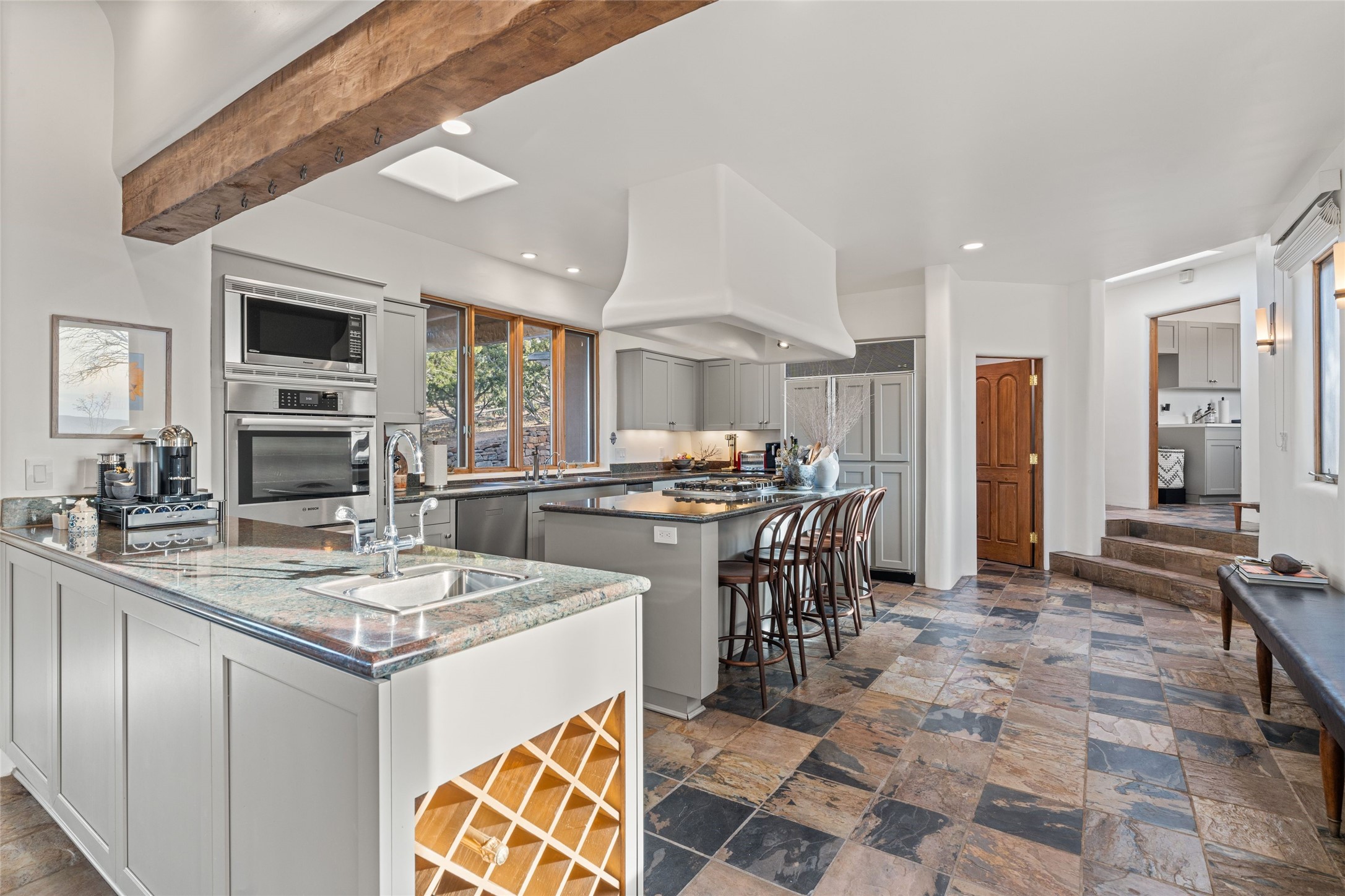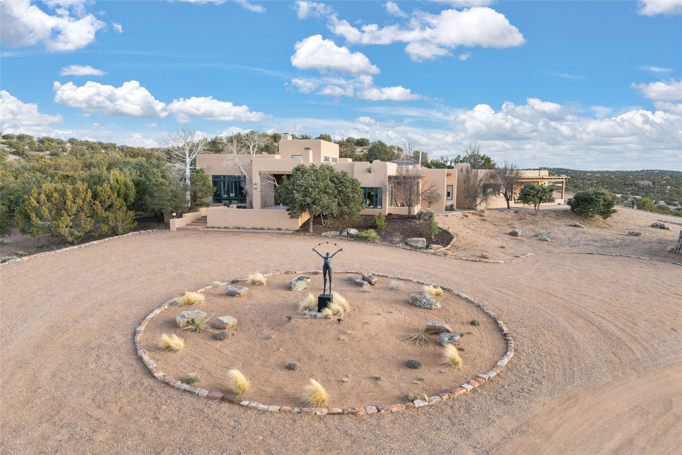 Remarkable 3-bedroom, 4.5-bath luxury retreat set on nearly 12 acres in the desirable La Tierra community. This stunning property offers breathtaking views and a unique 6-hole putting green, making it a golfer's paradise right in your backyard. Diamond plaster walls, vigas and beams, and expansive brick-lined portals add character. Enter through carved wood doors and be greeted by a grand foyer that seamlessly flows into an open-concept living space. Living and dining areas are adorned with soaring 12-ft. ceilings, large-scale windows, and French doors that invite natural light and the beauty of the outdoors into your home. Gourmet kitchen features high-end appliances, a center island with 6-burner cooktop, and a stylish bar area complete with a wine cooler. Retreat to the primary suite, which includes sitting area, fireplace, and a luxurious bath with divided 2 vanities and sinks, 2 water closets, and 2 walk-in closets for ample storage. A versatile studio/media room offers flex space as a 4th bedroom complete with a bathroom with shower. 3-car garage and an extra 10,000-gallon water storage tank. Recent upgrades such as solar photovoltaic electric, 2 new water heaters, window screens, motorized awnings in the living and dining rooms, and all new skylights enhance the home's efficiency. Enjoy awe-inspiring sunset views that will take your breath away, all while being conveniently located just 10-15 minutes from the Santa Fe Plaza, Ten Thousand Waves, and the Santa Fe Opera.