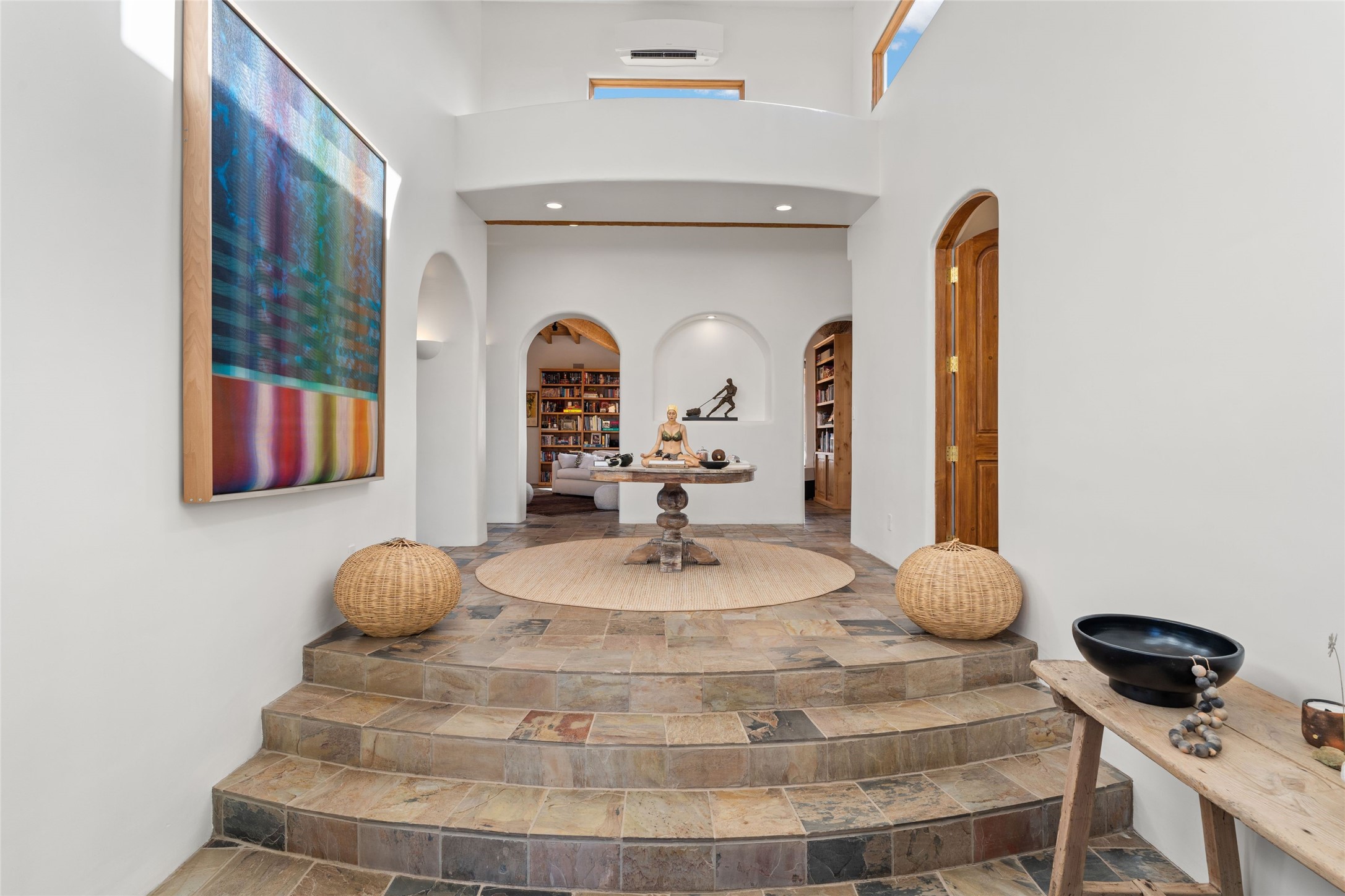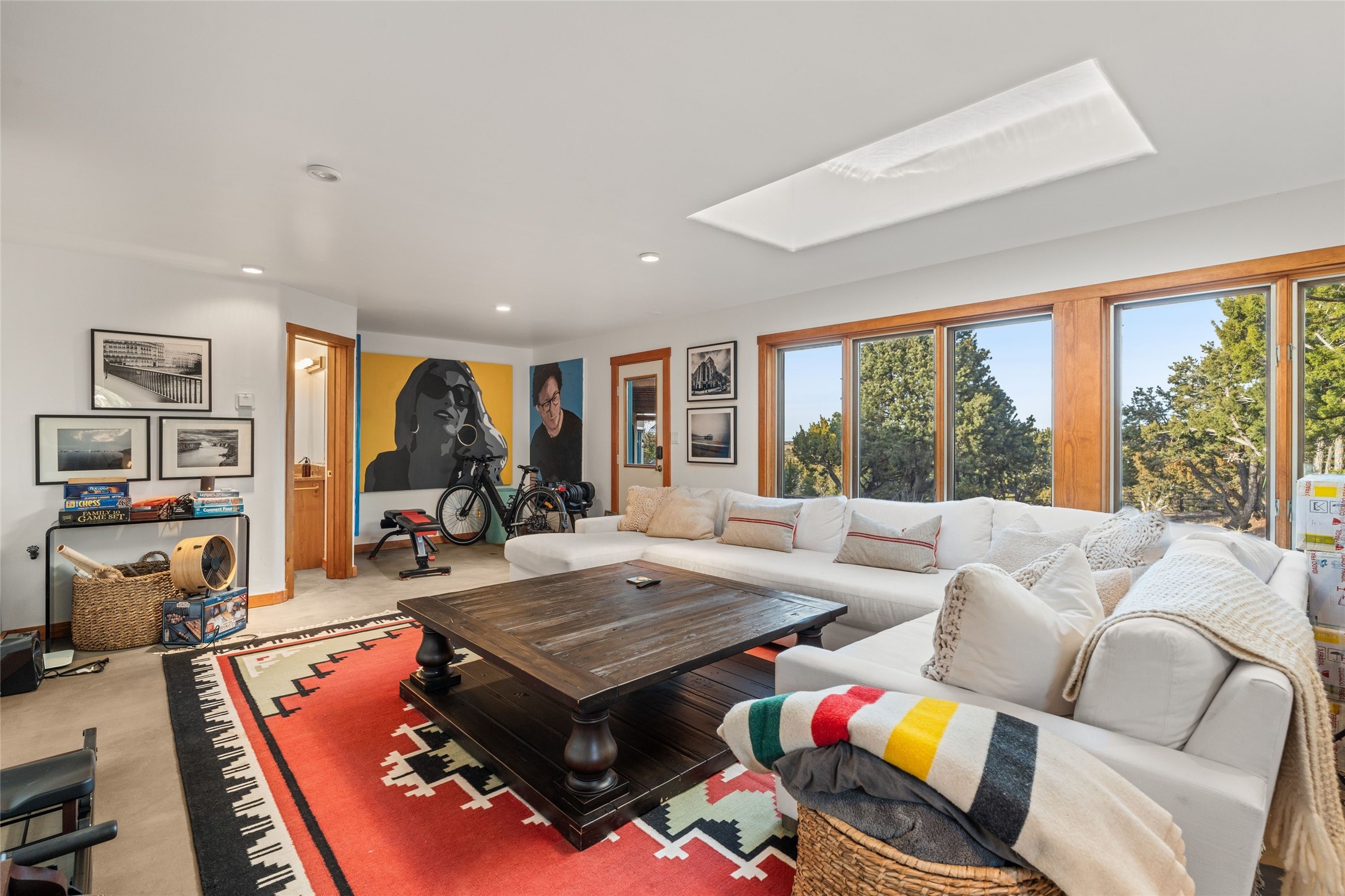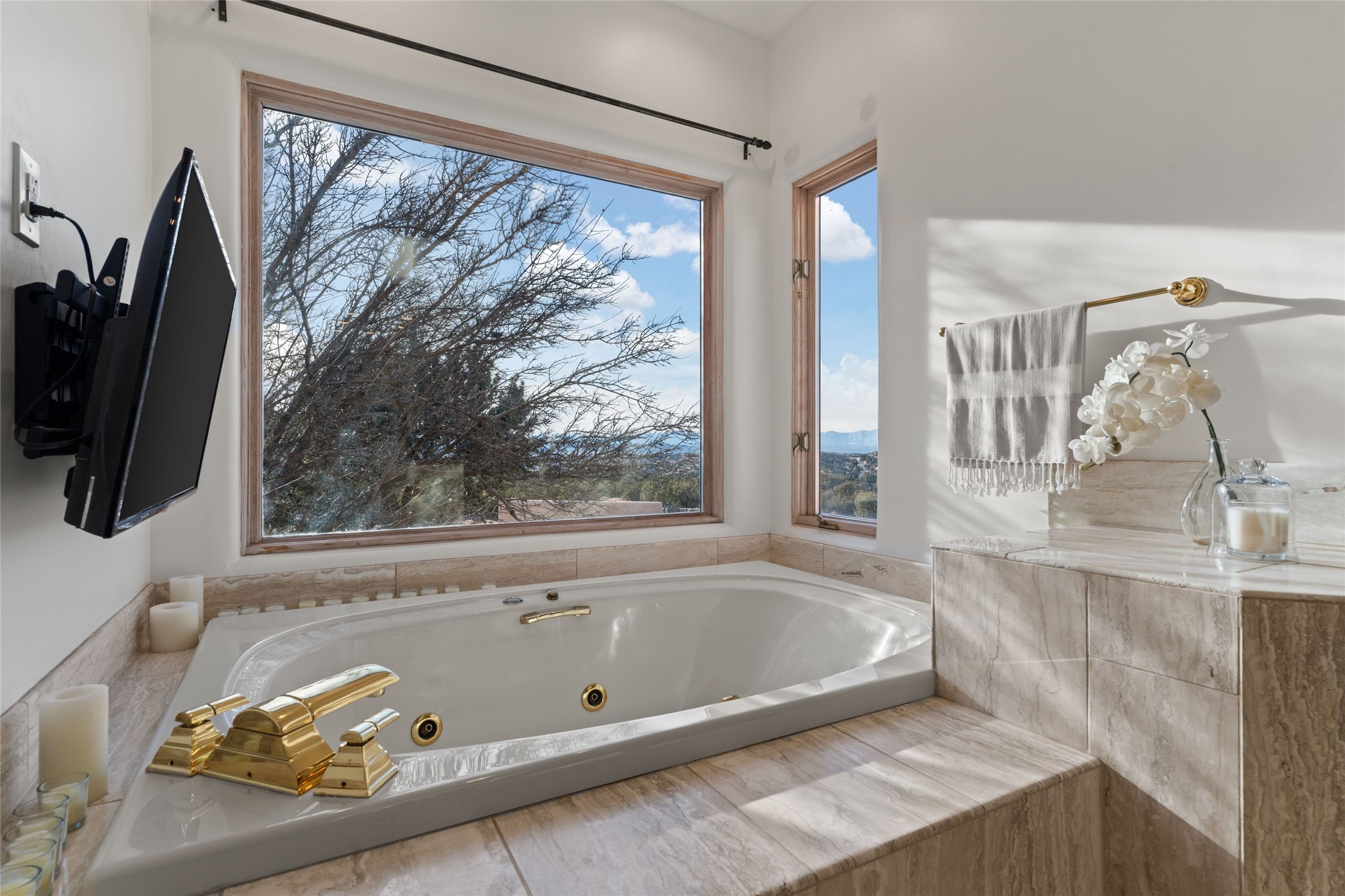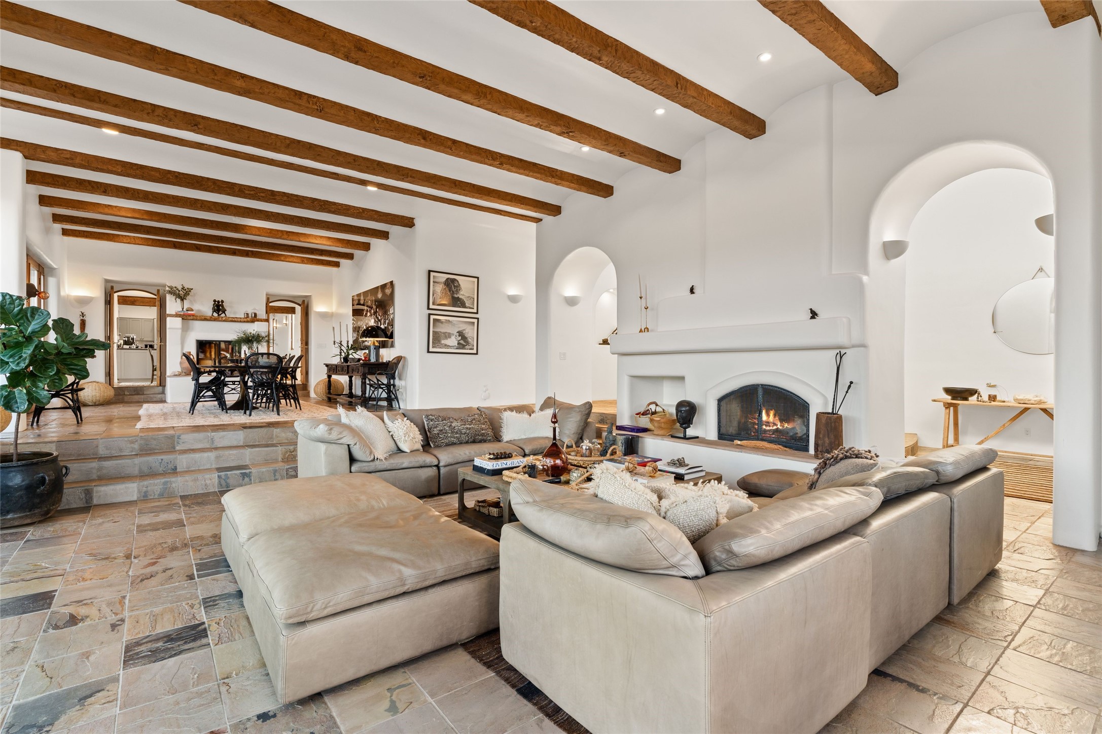 Remarkable 3-bedroom, 4.5-bath luxury retreat set on nearly 12 acres in the desirable La Tierra community. This stunning property offers breathtaking views and a unique 6-hole putting green, making it a golfer's paradise right in your backyard. Diamond plaster walls, vigas and beams, and expansive brick-lined portals add character. Enter through carved wood doors and be greeted by a grand foyer that seamlessly flows into an open-concept living space. Living and dining areas are adorned with soaring 12-ft. ceilings, large-scale windows, and French doors that invite natural light and the beauty of the outdoors into your home. Gourmet kitchen features high-end appliances, a center island with 6-burner cooktop, and a stylish bar area complete with a wine cooler. Retreat to the primary suite, which includes sitting area, fireplace, and a luxurious bath with divided 2 vanities and sinks, 2 water closets, and 2 walk-in closets for ample storage. A versatile studio/media room offers flex space as a 4th bedroom complete with a bathroom with shower. 3-car garage and an extra 10,000-gallon water storage tank. Recent upgrades such as solar photovoltaic electric, 2 new water heaters, window screens, motorized awnings in the living and dining rooms, and all new skylights enhance the home's efficiency. Enjoy awe-inspiring sunset views that will take your breath away, all while being conveniently located just 10-15 minutes from the Santa Fe Plaza, Ten Thousand Waves, and the Santa Fe Opera.