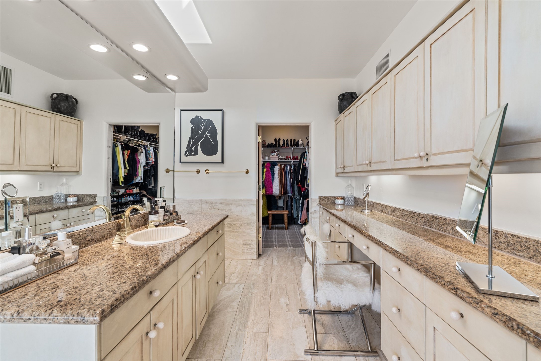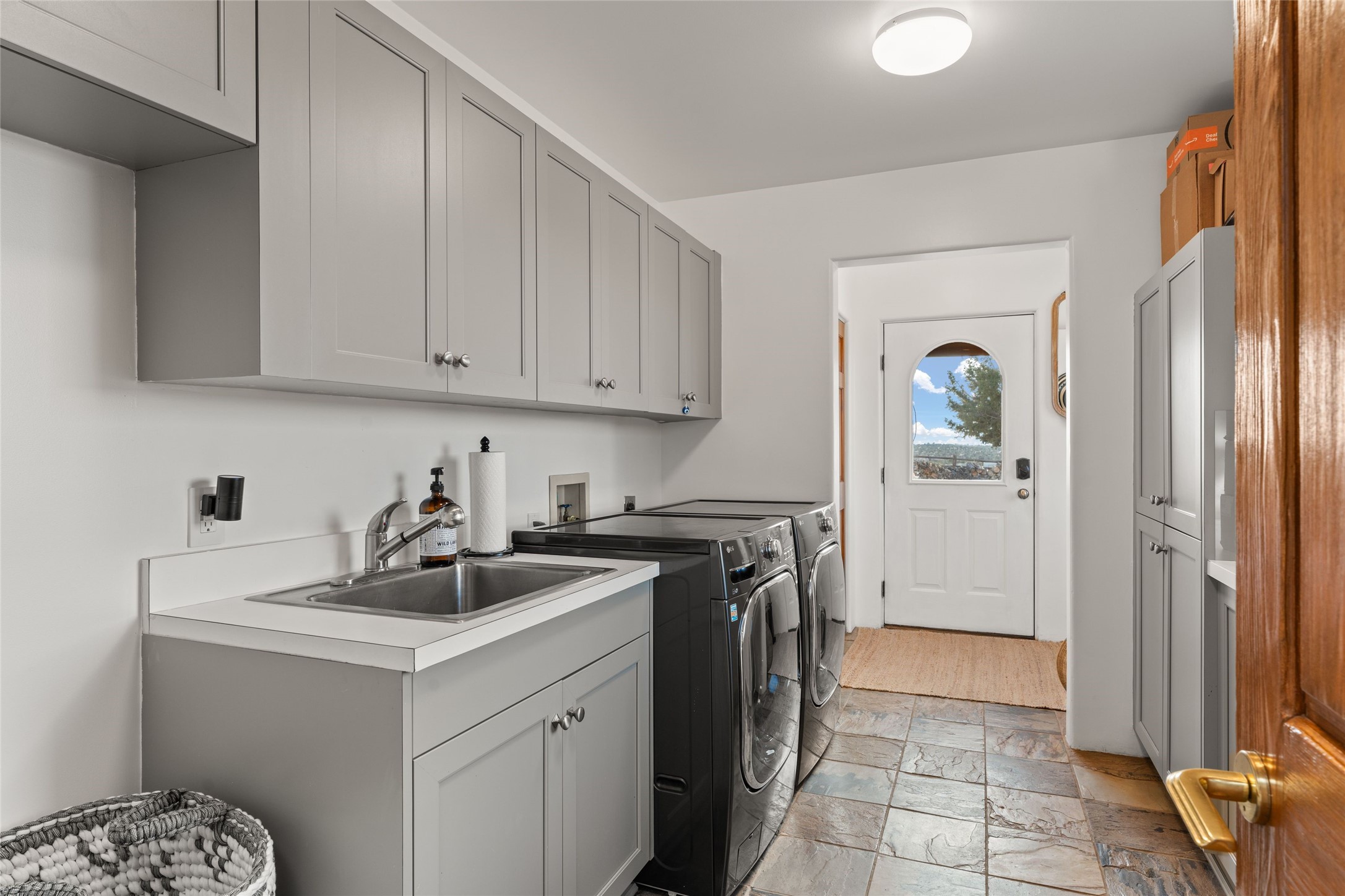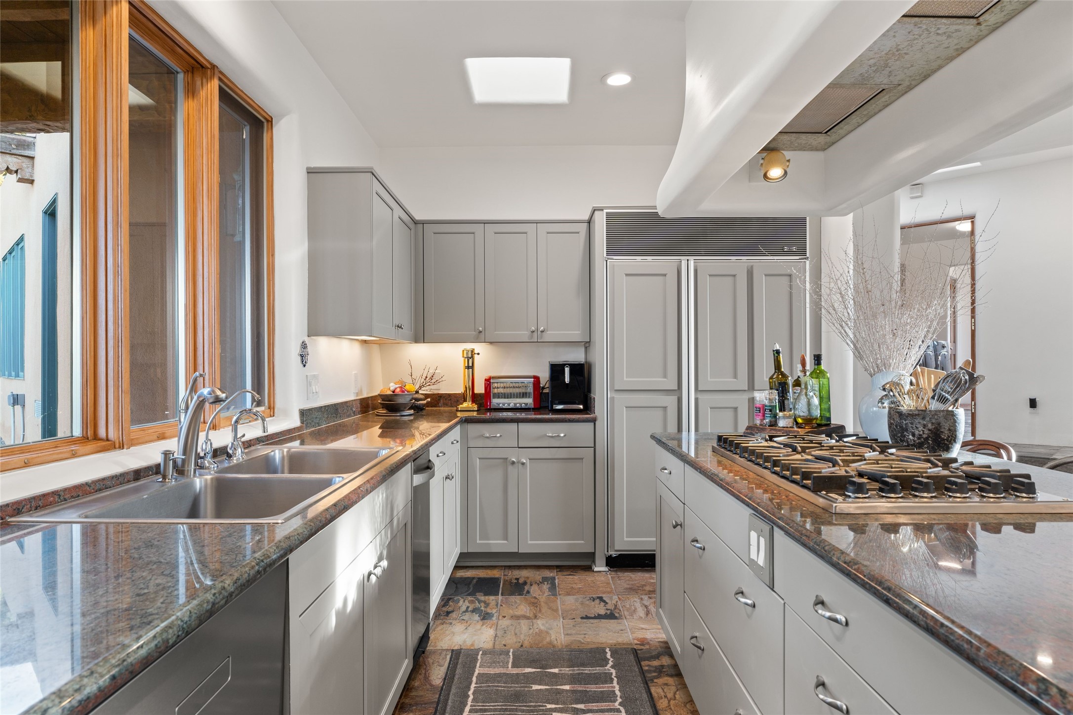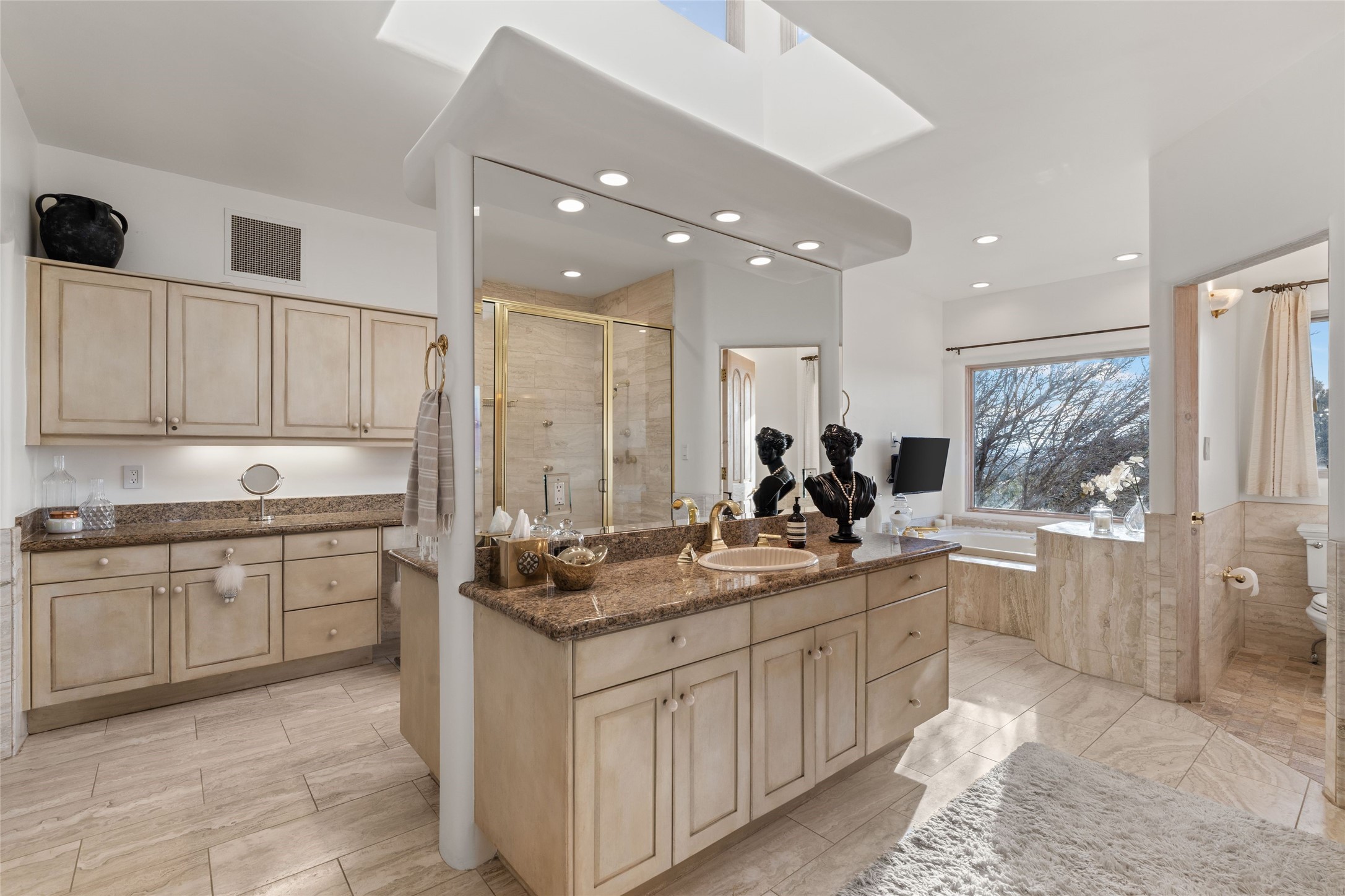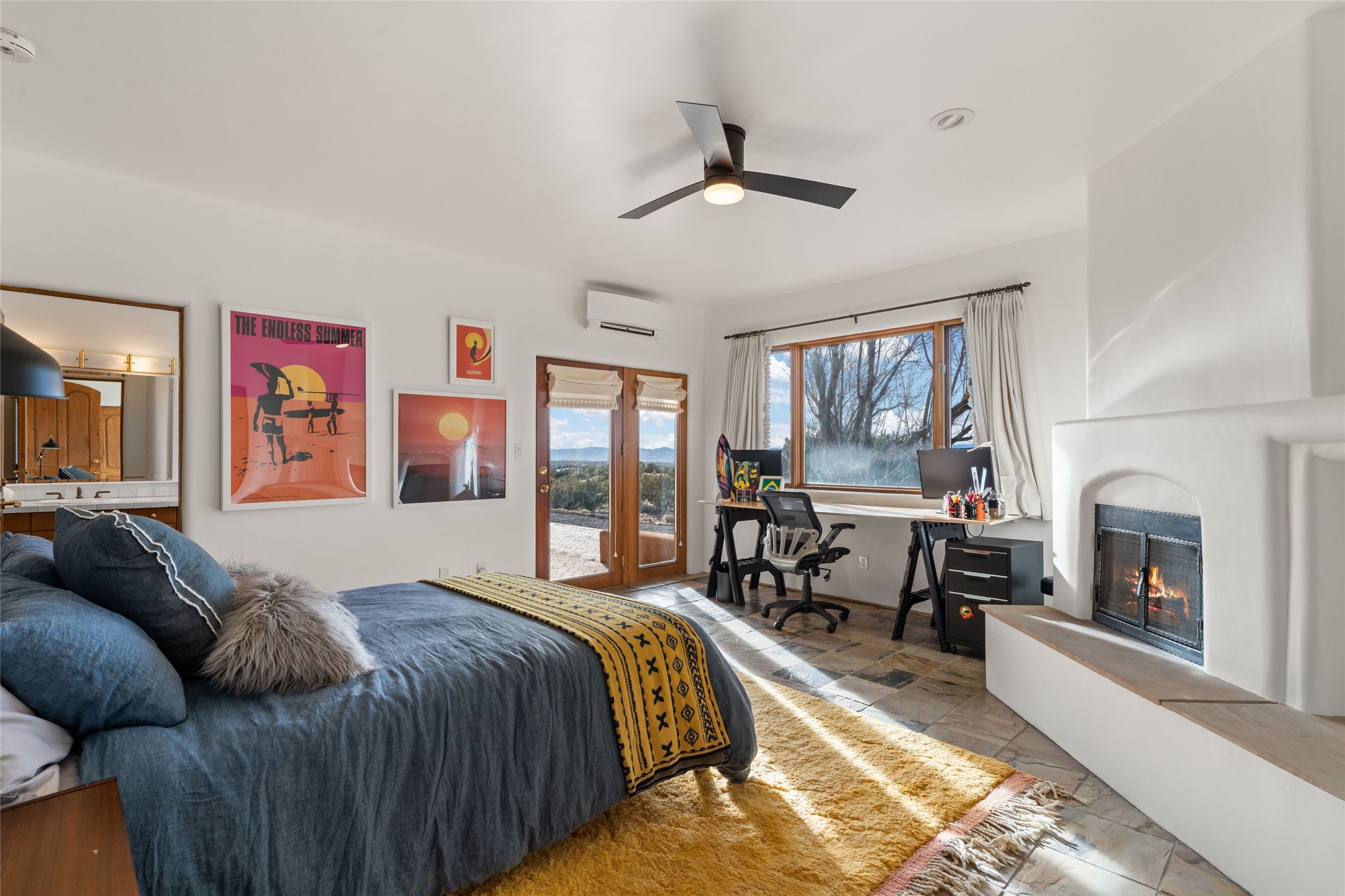Remarkable 3-bedroom, 4.5-bath luxury retreat set on nearly 12 acres in the desirable La Tierra community. This stunning property offers breathtaking views and a unique 6-hole putting green, making it a golfer's paradise right in your backyard. Diamond plaster walls, vigas and beams, and expansive brick-lined portals add character. Enter through carved wood doors and be greeted by a grand foyer that seamlessly flows into an open-concept living space. Living and dining areas are adorned with soaring 12-ft. ceilings, large-scale windows, and French doors that invite natural light and the beauty of the outdoors into your home. Gourmet kitchen features high-end appliances, a center island with 6-burner cooktop, and a stylish bar area complete with a wine cooler. Retreat to the primary suite, which includes sitting area, fireplace, and a luxurious bath with divided 2 vanities and sinks, 2 water closets, and 2 walk-in closets for ample storage. A versatile studio/media room offers flex space as a 4th bedroom complete with a bathroom with shower. 3-car garage and an extra 10,000-gallon water storage tank. Recent upgrades such as solar photovoltaic electric, 2 new water heaters, window screens, motorized awnings in the living and dining rooms, and all new skylights enhance the home's efficiency. Enjoy awe-inspiring sunset views that will take your breath away, all while being conveniently located just 10-15 minutes from the Santa Fe Plaza, Ten Thousand Waves, and the Santa Fe Opera.