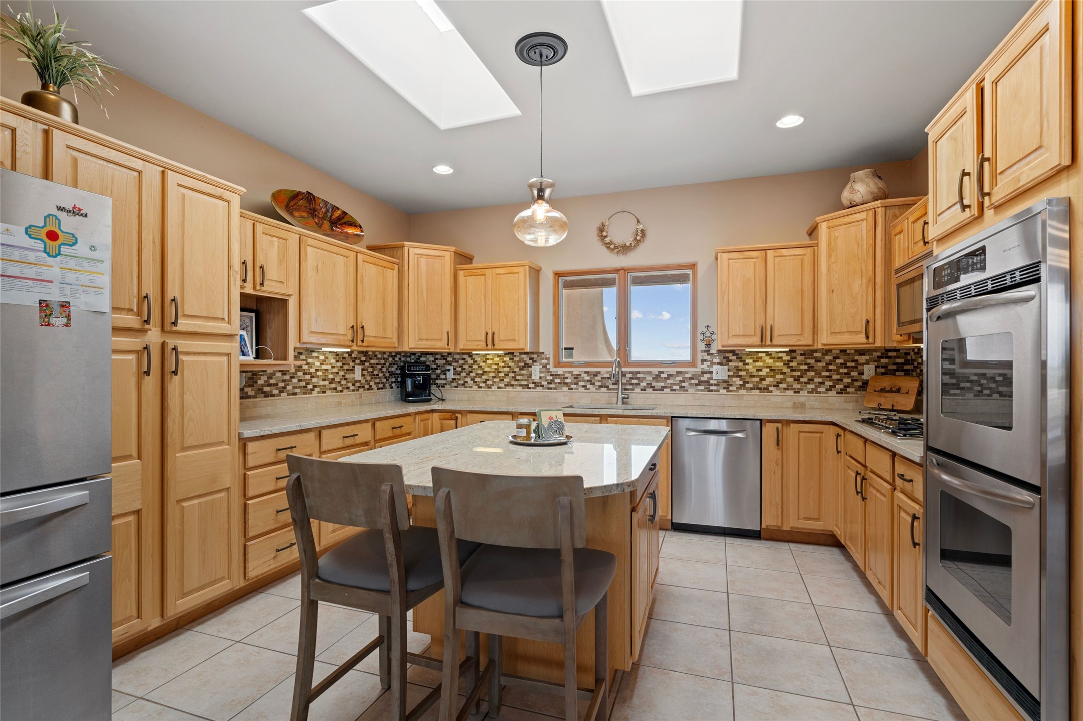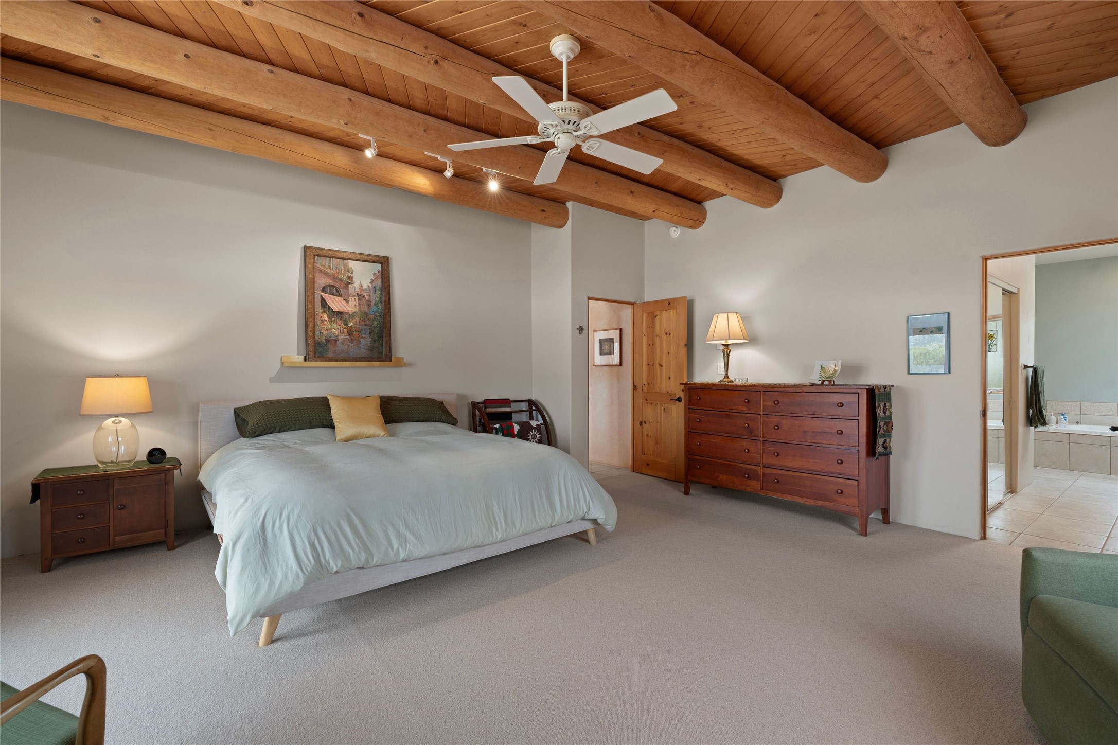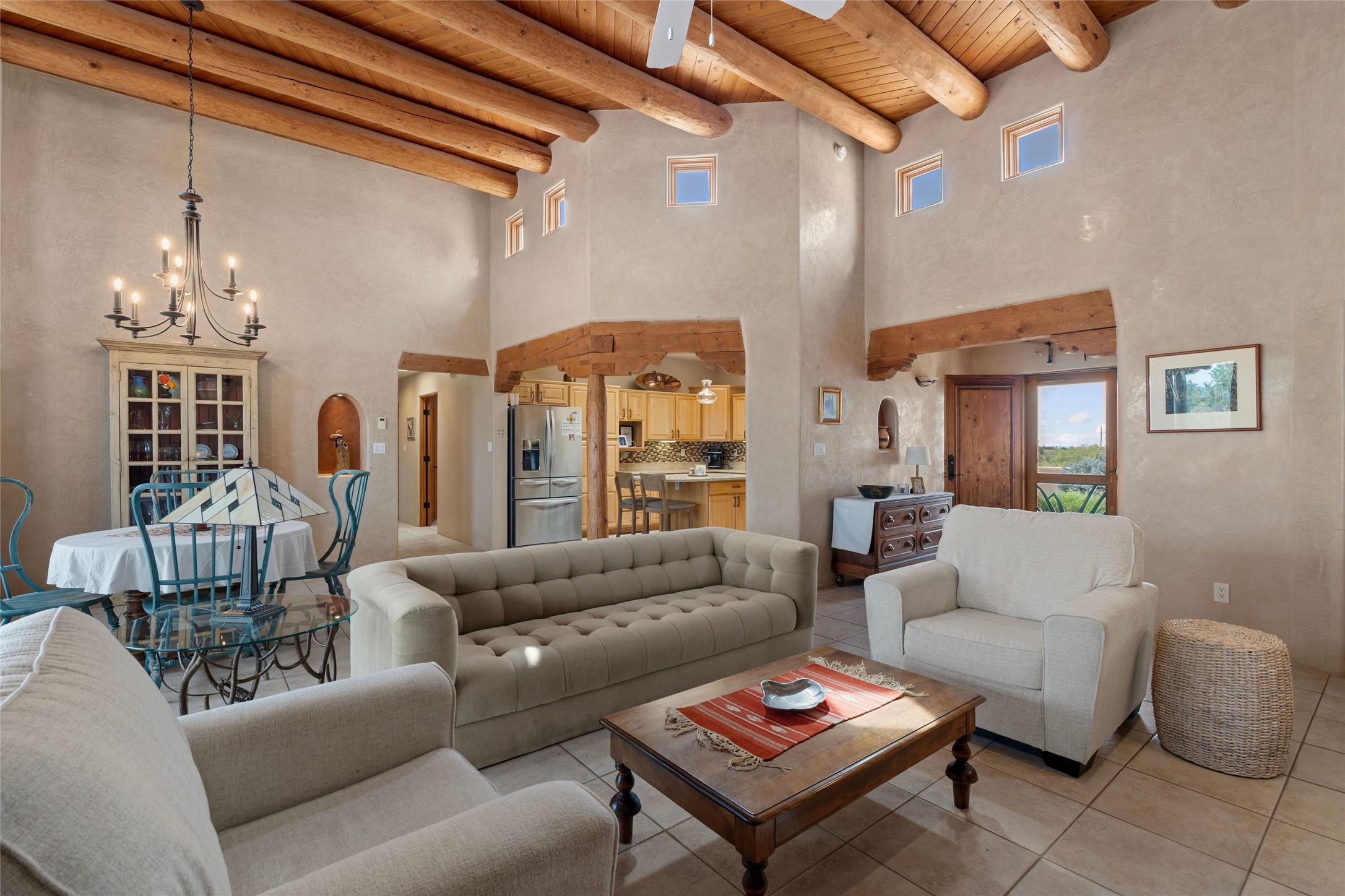 Private 3-bedroom, 2-bath home with panoramic mountain views on elevated 2.5-acres. Located on a cul-de-sac lot in the community of Cielo Colorado. Step inside to find an expansive split floor plan, featuring soaring 18-20 ft. ceilings that create an open and airy atmosphere. Design features include Venetian plaster walls, hickory cabinets, kiva fireplace, and vigas and beams, giving the home an authentic Southwestern charm. Pine plank ceilings add warmth and character, while clerestory windows and several skylights flood the space with natural light. The kitchen is appointed with solid granite countertops, center island with breakfast bar and stainless-steel appliances. The primary suite includes an ensuite bath featuring a jetted tub and a spacious walk-in closet. Two additional bedrooms are strategically situated in a guest wing. In addition, there is a separate den/office, equipped with bookshelves that convey with the sale. Spacious large laundry area. The walled entry courtyard with kiva provides a serene outdoor oasis, complemented by an outdoor irrigation system to maintain the lush landscaping. Back portal and patio expand dining and entertaining opportunities. Close to The Agora Shopping Center in Eldorado with easy access to 285 and downtown Santa Fe.