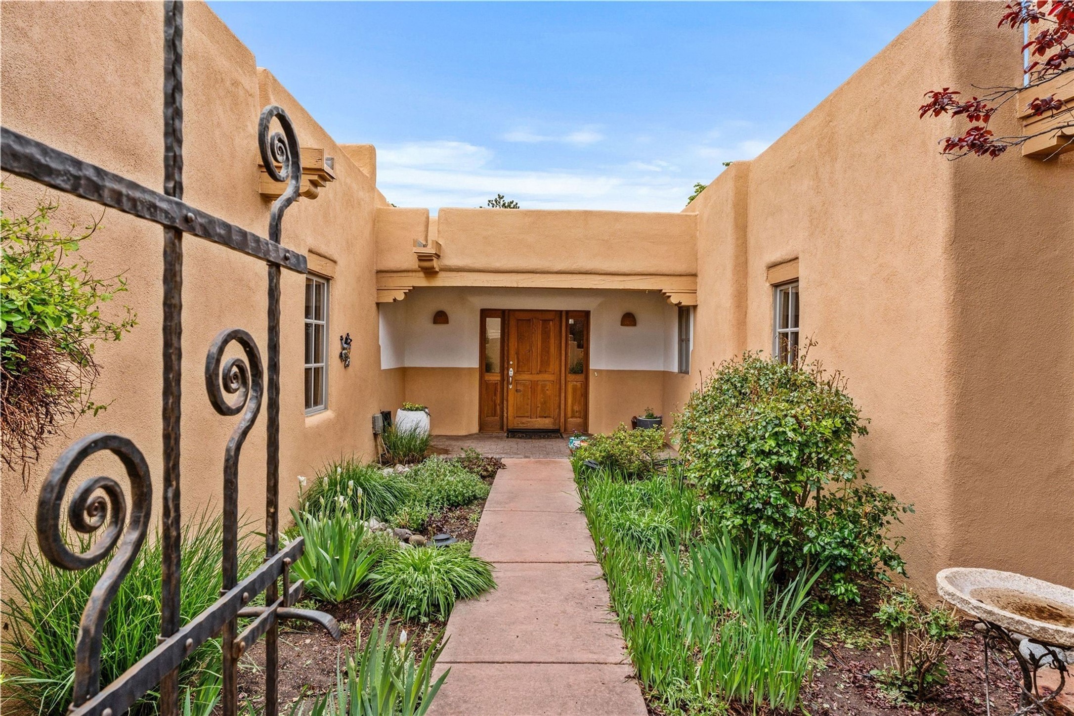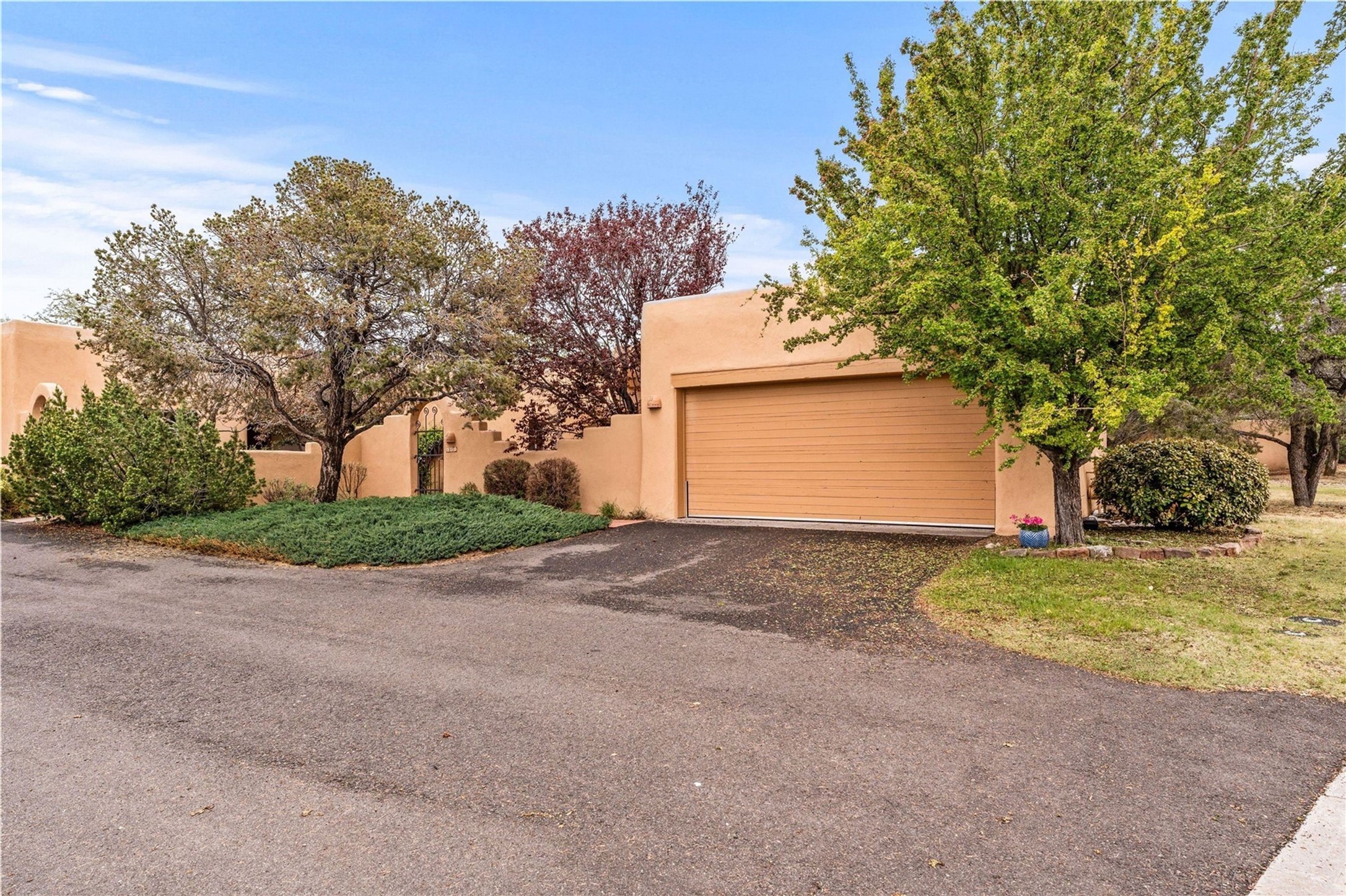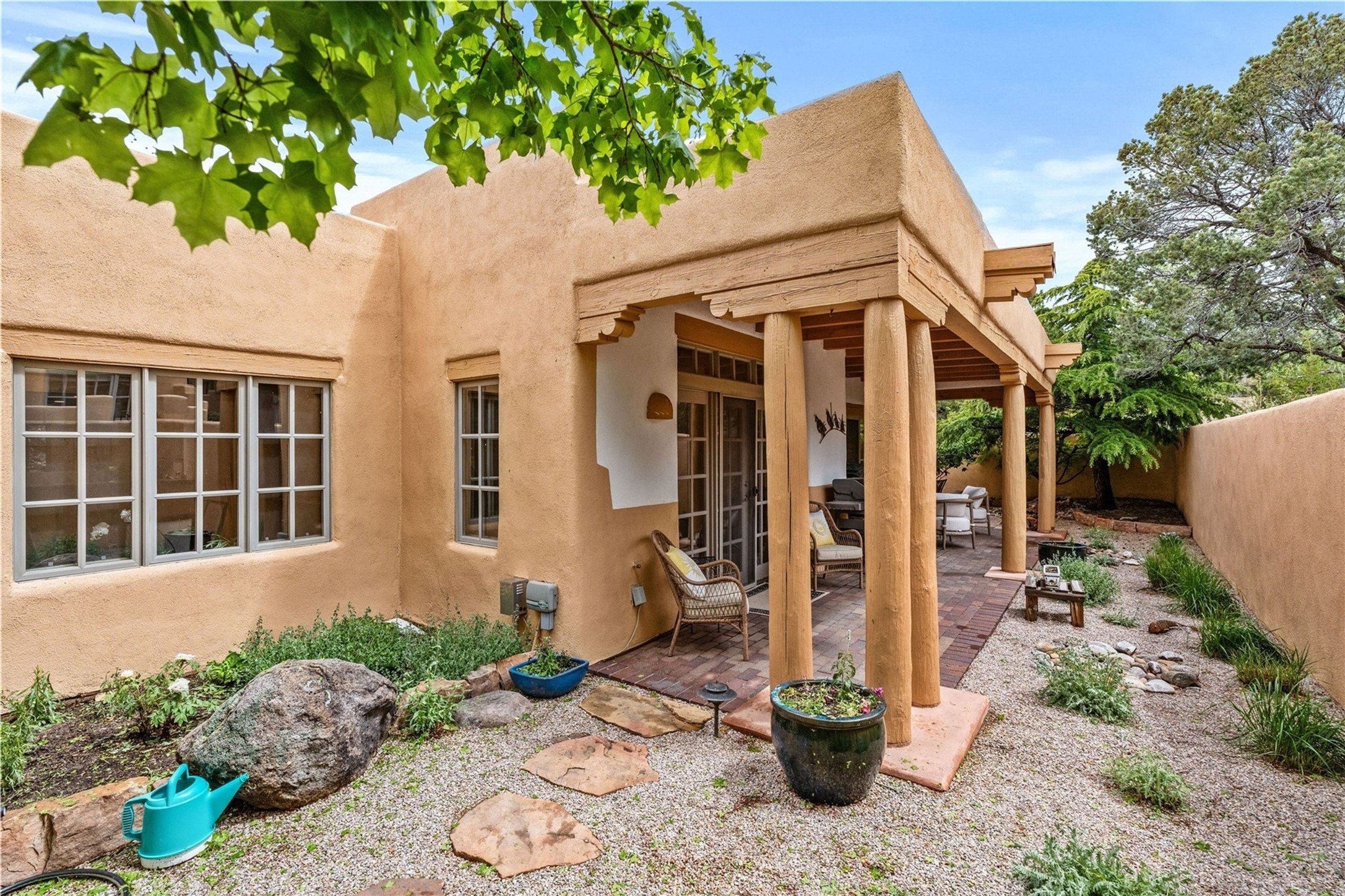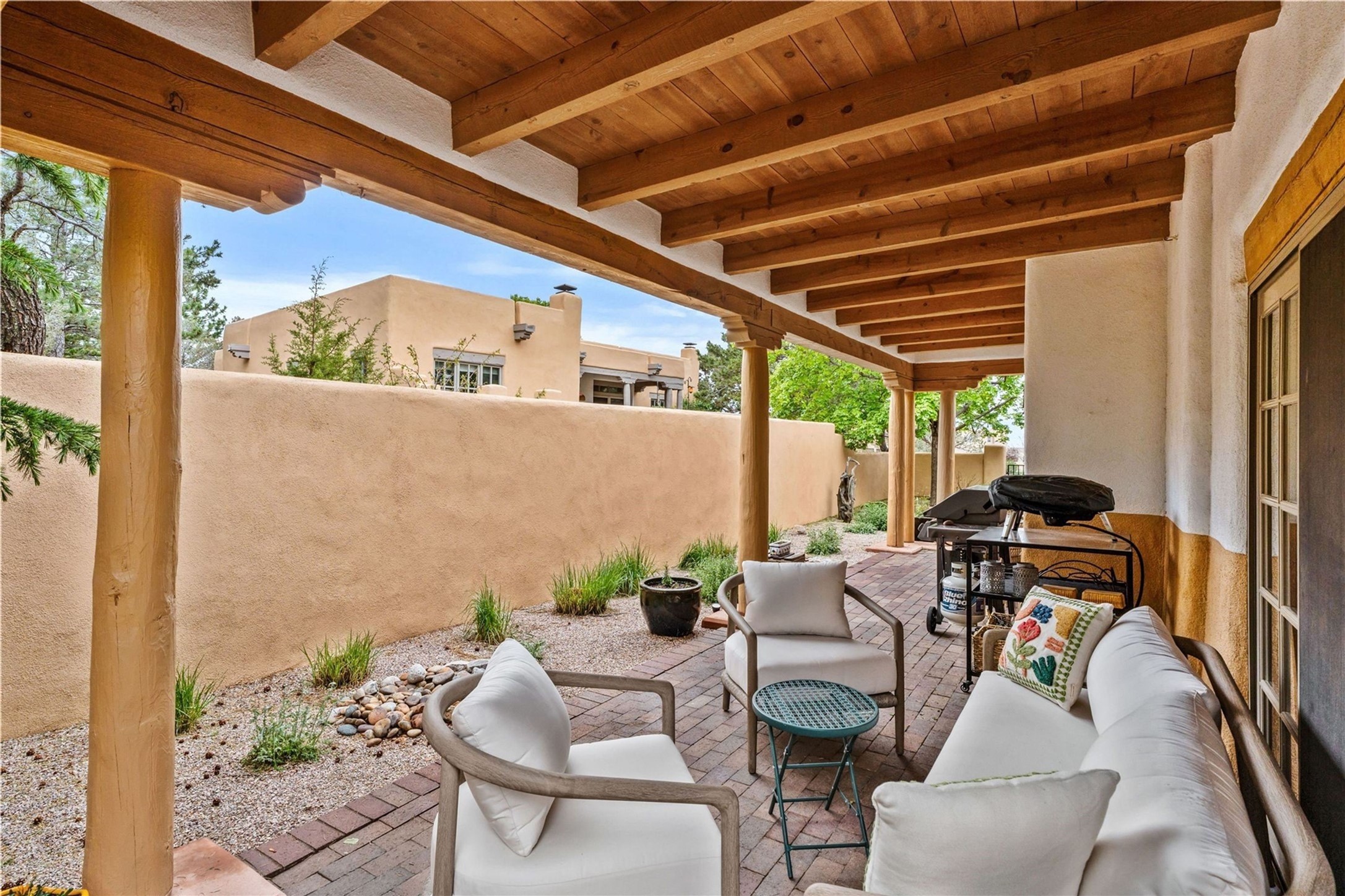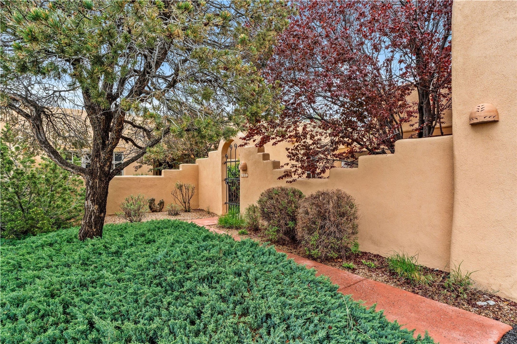 2-bedroom, 2-bath residential condo in the exclusive gated community of Quail Run. This single-level home features a thoughtfully designed layout with no interior steps, ensuring ease of access throughout. A perfect blend of traditional Santa Fe style and contemporary flair, the condo is bathed in abundant natural light, creating a warm and inviting atmosphere. Enjoy the charm of kiva fireplaces in both the living room and primary bedroom, enhancing the home's character. The stylish kitchen includes a 5-burner stove and a convenient breakfast bar. A dedicated laundry room with ample cabinets and storage adds to the home's practicality. The primary suite is designed for relaxation, featuring a luxurious steam shower that elevates your daily routine. Outside, an enclosed front courtyard offers a private space, while the back brick portal provides ample yard space for a kitchen garden or vibrant plantings. The property backs up to the serene golf course, allowing for picturesque views and outdoor enjoyment.