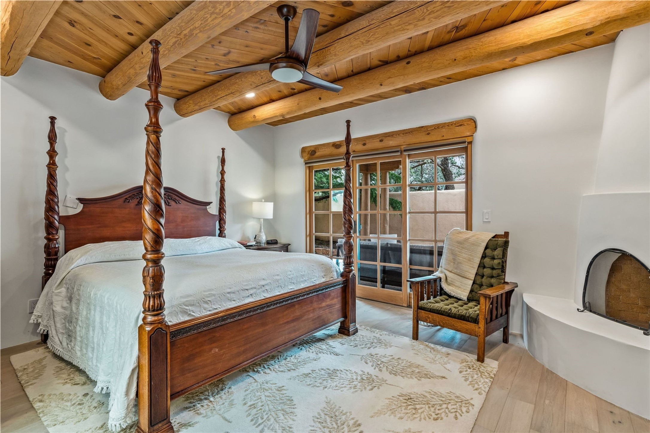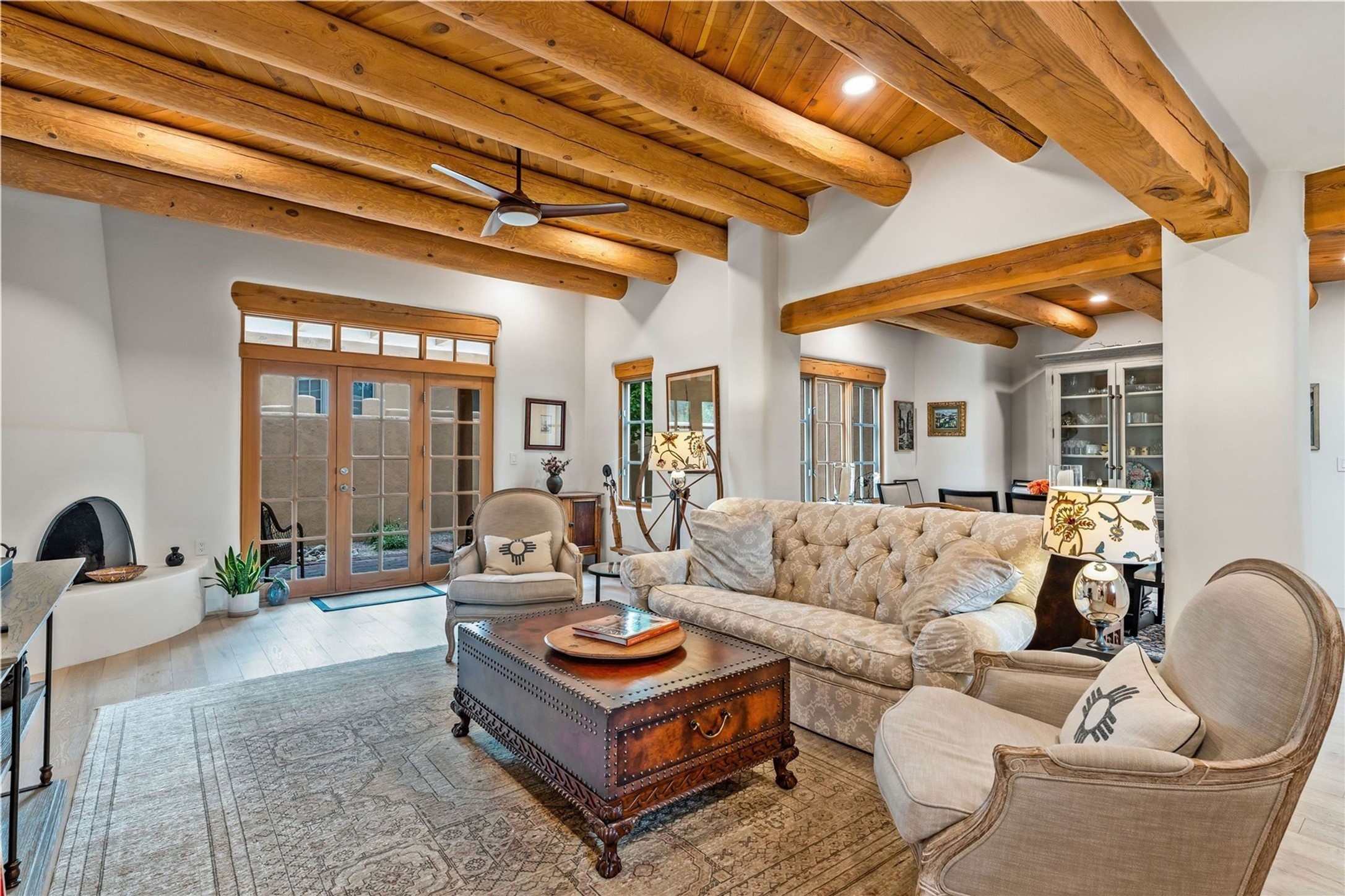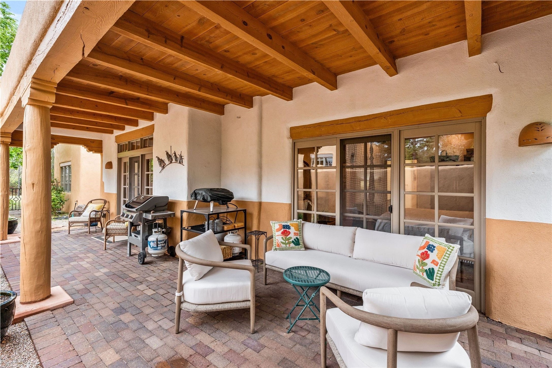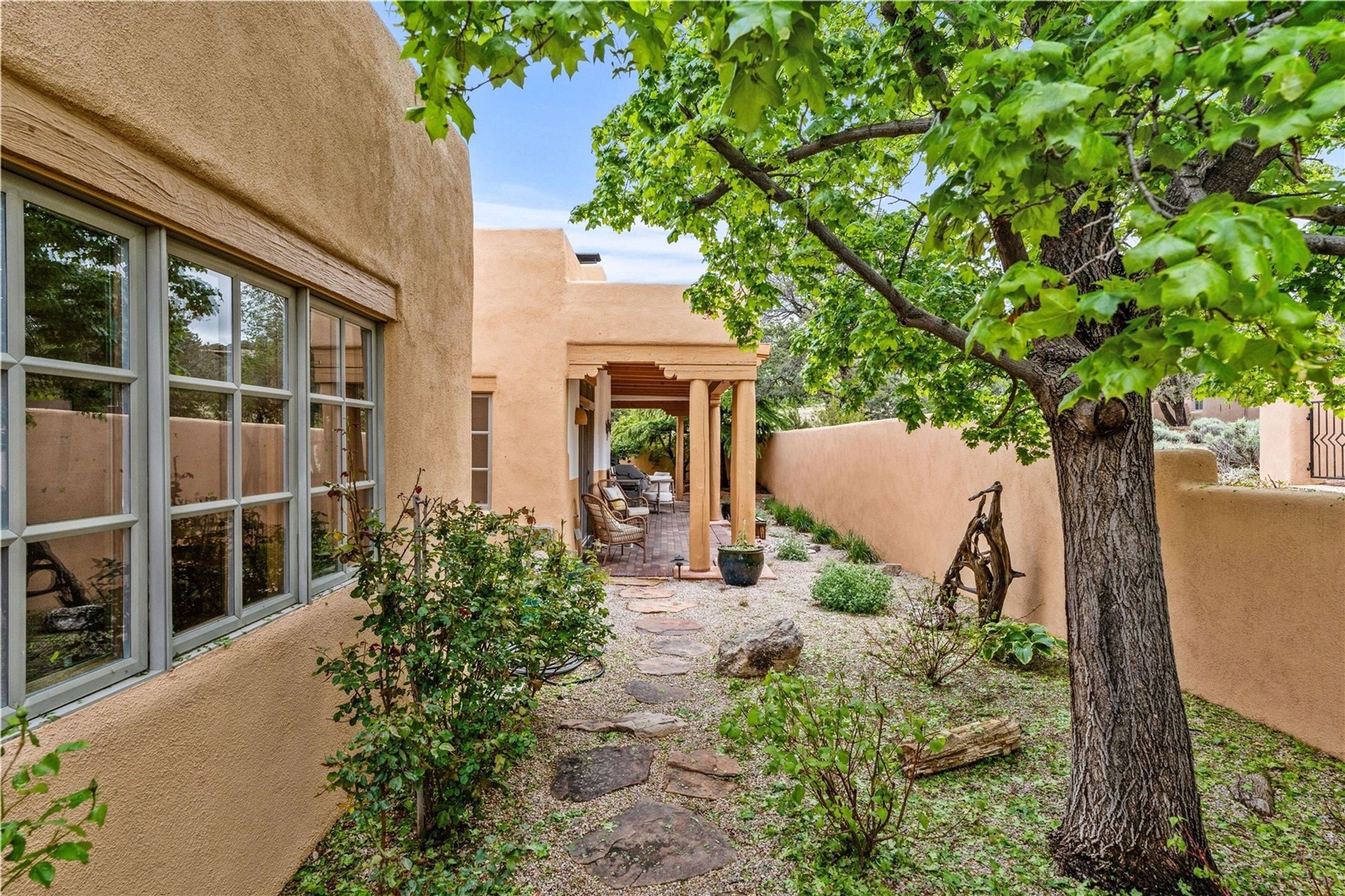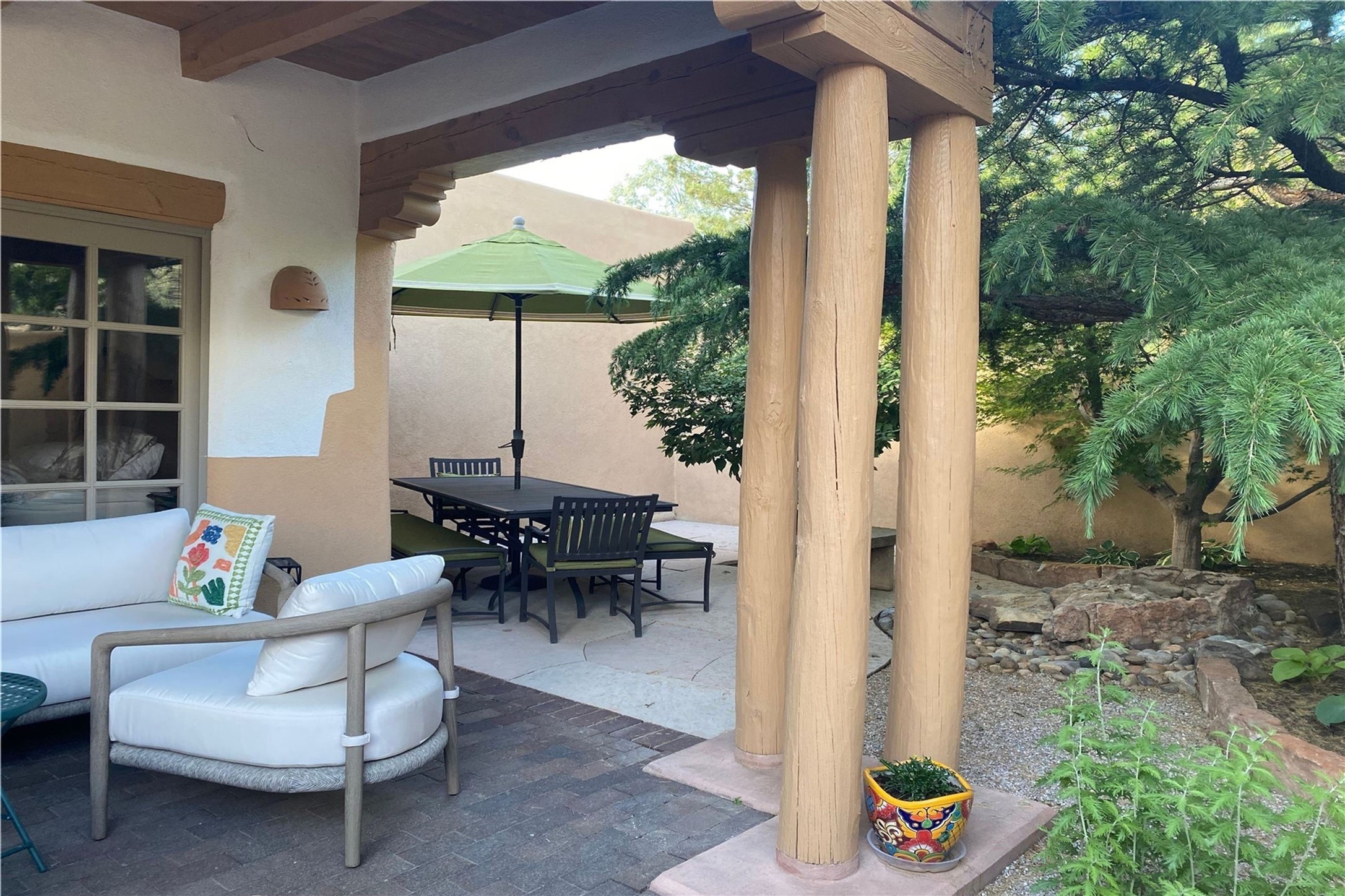 2-bedroom, 2-bath residential condo in the exclusive gated community of Quail Run. This single-level home features a thoughtfully designed layout with no interior steps, ensuring ease of access throughout. A perfect blend of traditional Santa Fe style and contemporary flair, the condo is bathed in abundant natural light, creating a warm and inviting atmosphere. Enjoy the charm of kiva fireplaces in both the living room and primary bedroom, enhancing the home's character. The stylish kitchen includes a 5-burner stove and a convenient breakfast bar. A dedicated laundry room with ample cabinets and storage adds to the home's practicality. The primary suite is designed for relaxation, featuring a luxurious steam shower that elevates your daily routine. Outside, an enclosed front courtyard offers a private space, while the back brick portal provides ample yard space for a kitchen garden or vibrant plantings. The property backs up to the serene golf course, allowing for picturesque views and outdoor enjoyment.