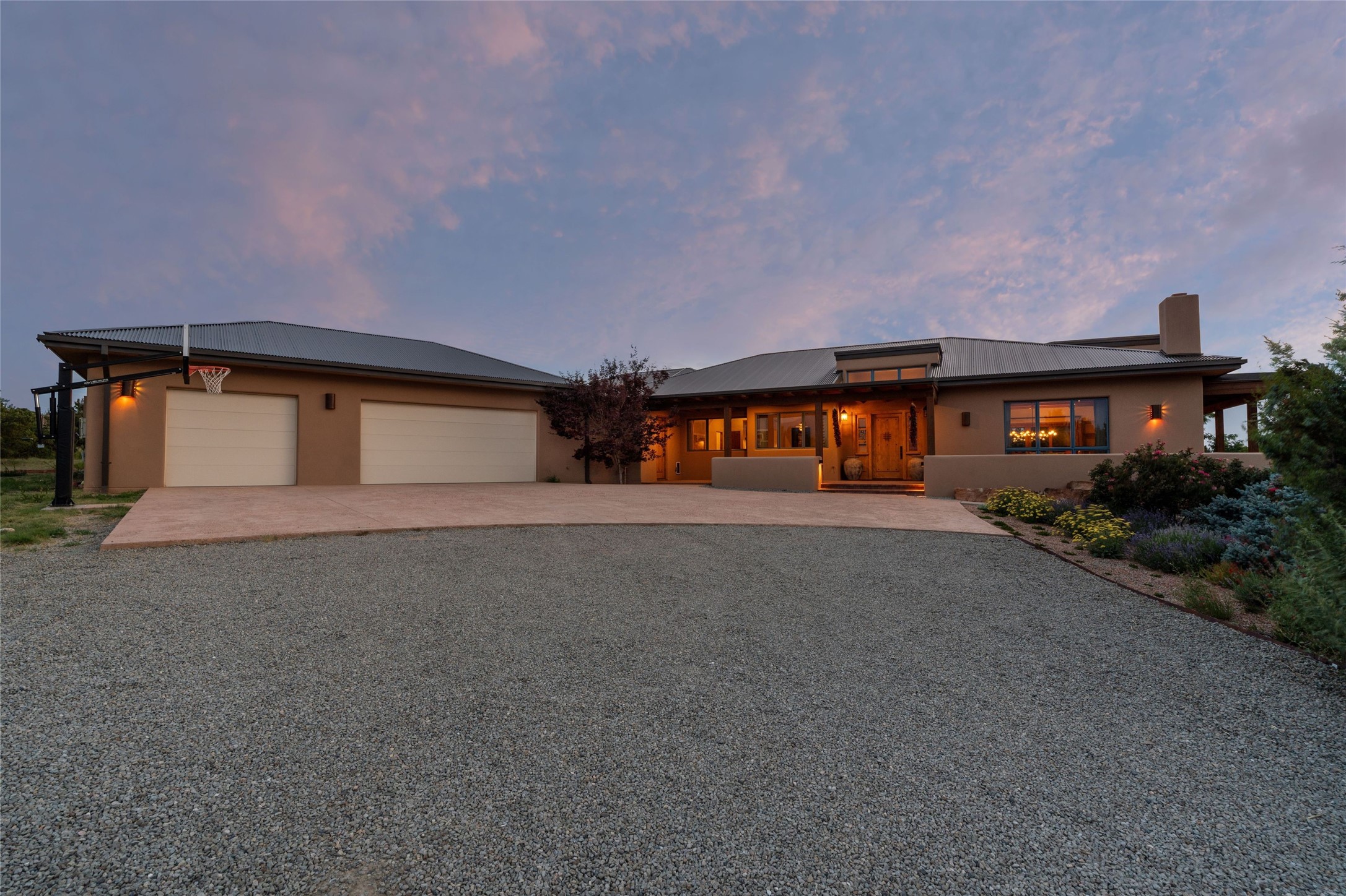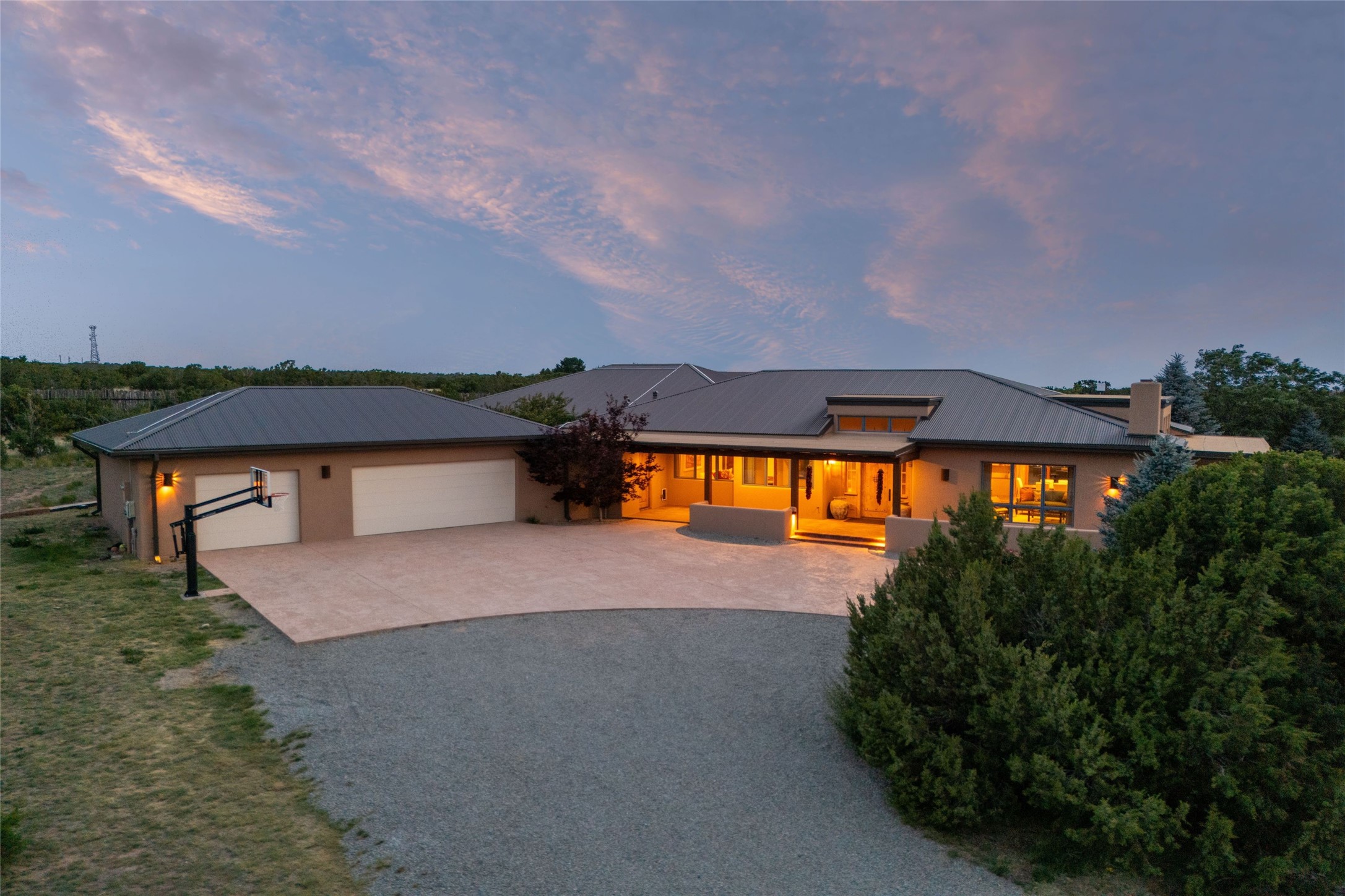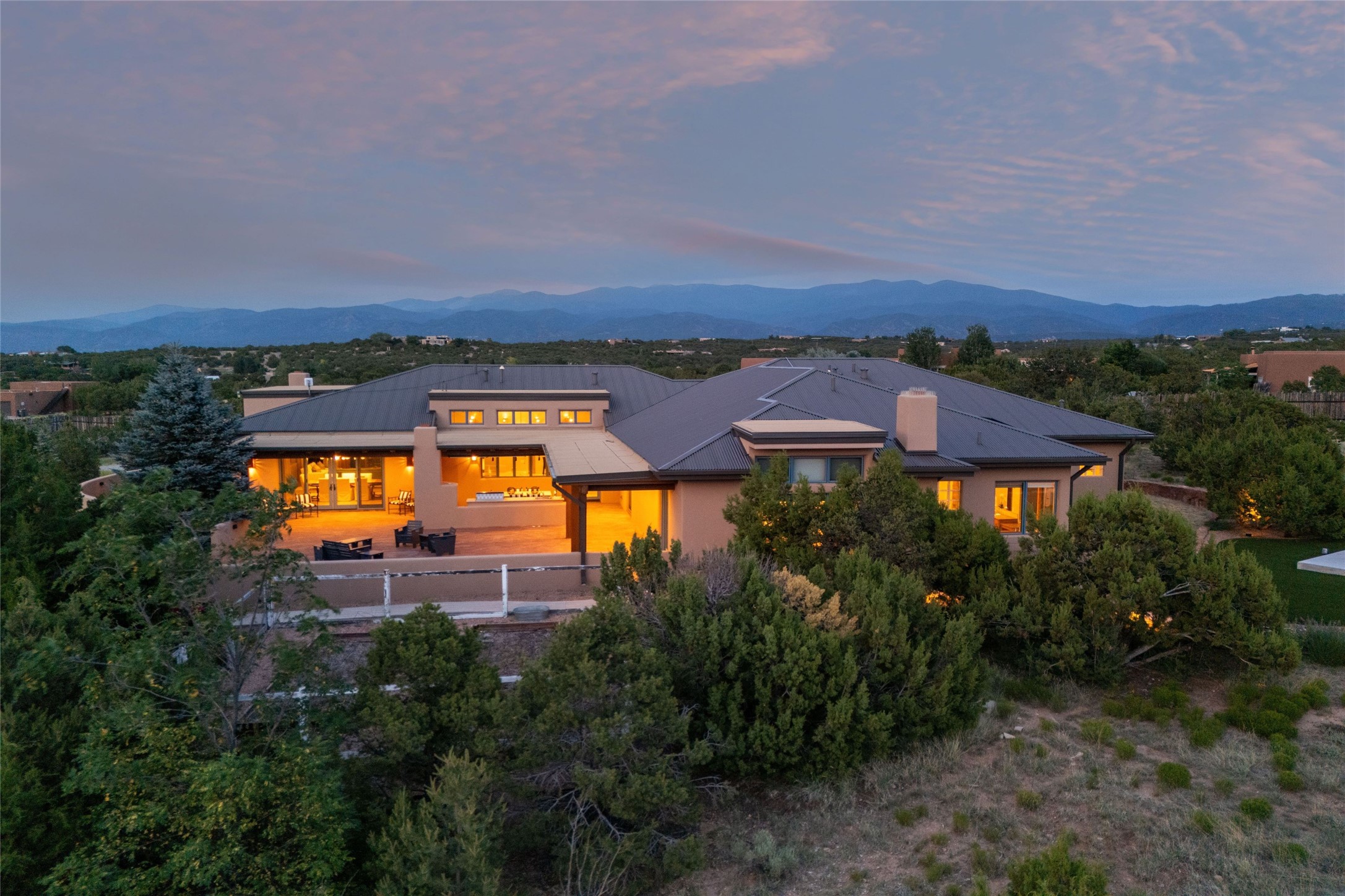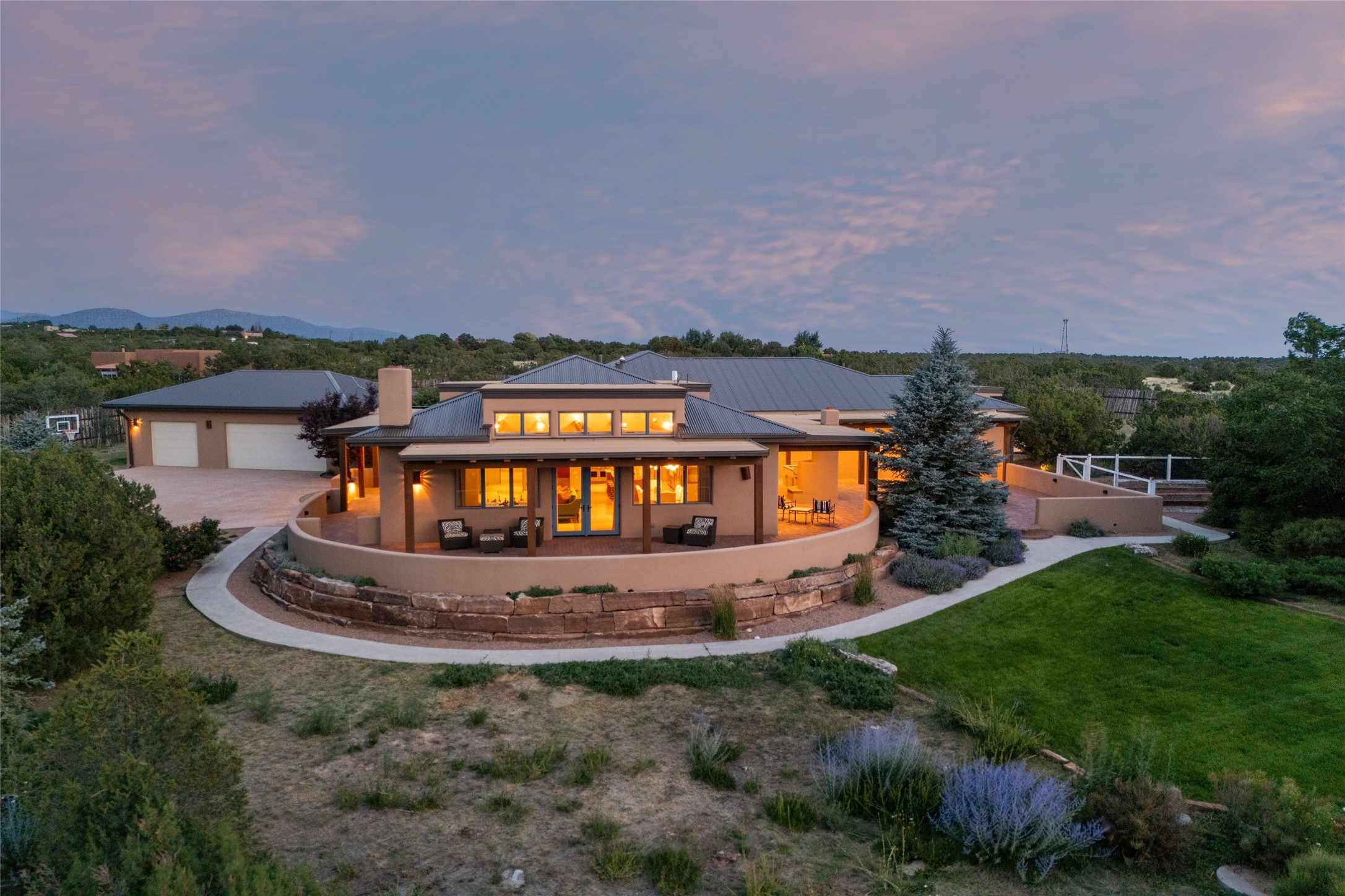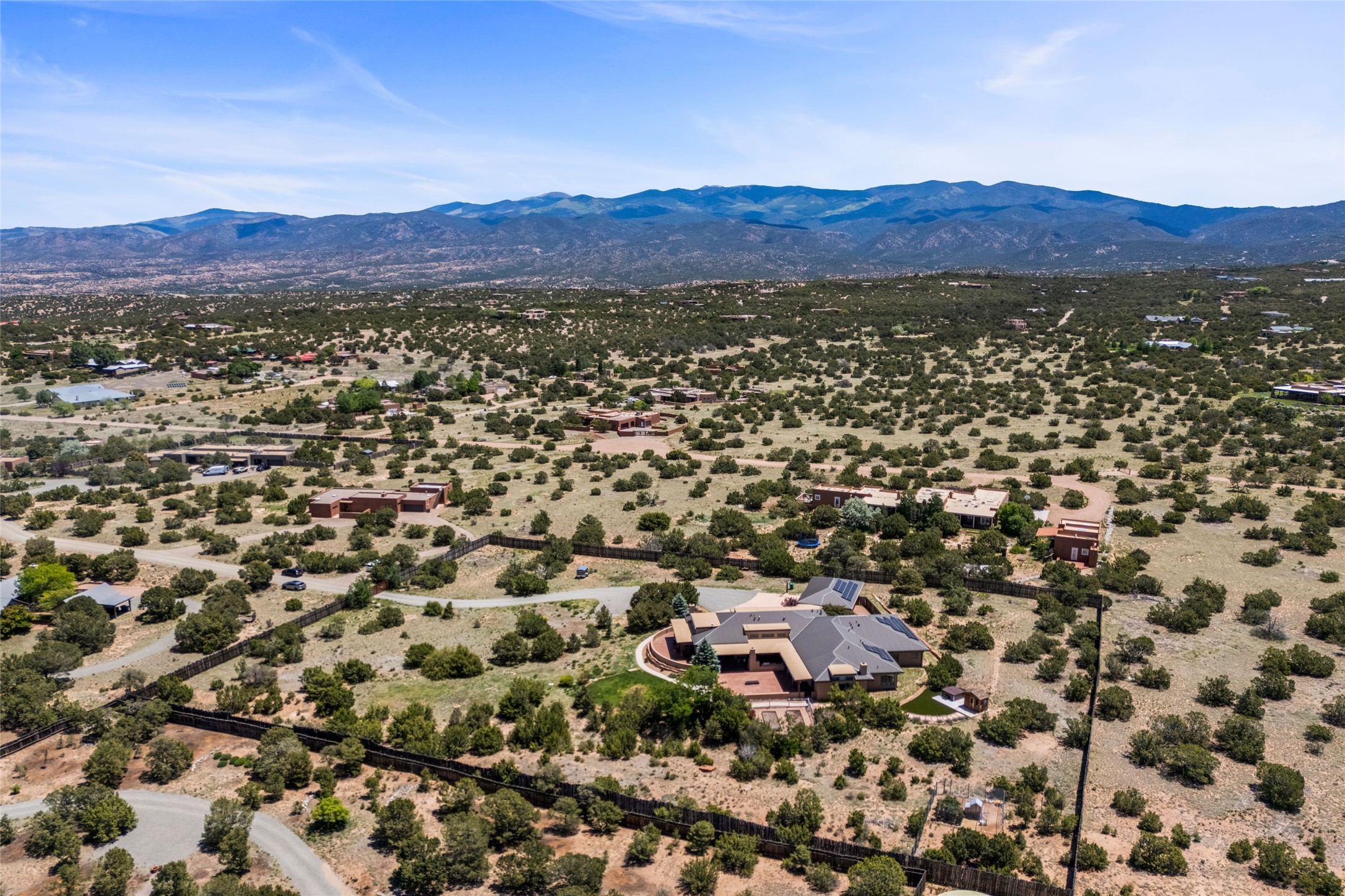 Northern New Mexican style 5-bedroom, 4.5-bath custom-built 5,200 sq. ft. home spanning over 2.5 acres offers panoramic 180-degree views that stretch from the majestic Sangre de Cristo Mountains to the captivating Badlands and Los Alamos. Positioned at the end of a private, gated drive and surrounded by an 8-foot-high coyote fence, this residence is a true entertainer's delight. The open floor plan flows effortlessly into spacious covered and uncovered patios, ideal for hosting both intimate gatherings and grand celebrations. Crafted by Driscoll Construction in 2015, the home showcases bespoke design elements, including custom solid wood doors, white oak flooring, and elegant plaster walls throughout the common areas and primary suite. Enjoy the warmth of three fireplaces, including one on the expansive 1,500 sq. ft. portal, where you can relish both sunrise and sunset vistas. The gourmet kitchen invites culinary creativity with its generous center island, clerestory windows, premium appliances, and double dishwashers. Prioritize wellness with a primary bath steam shower, a 300 sq. ft. gym, an outdoor 6-person sauna, a vegetable garden on drip irrigation, and a fully enclosed chicken coop. Additional highlights include a pitched metal roof, an oversized 3-car garage, photovoltaic solar energy, and rainwater harvesting. Recent upgrades in 2023 encompass new stucco, water filtration, a dog run, and an outdoor grill. Enjoy convenient access to downtown Santa Fe, all while embracing the serene beauty of this exceptional property.