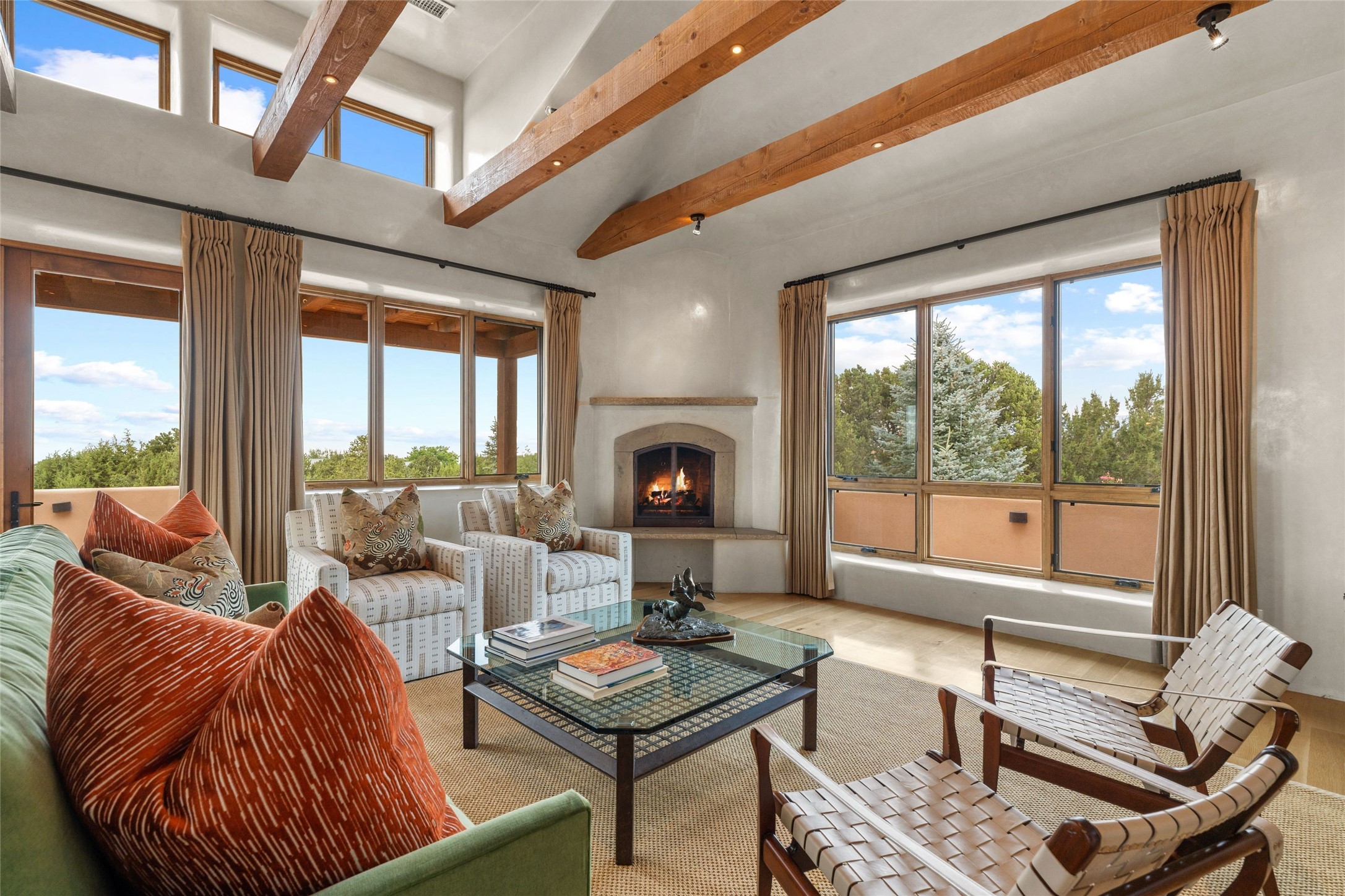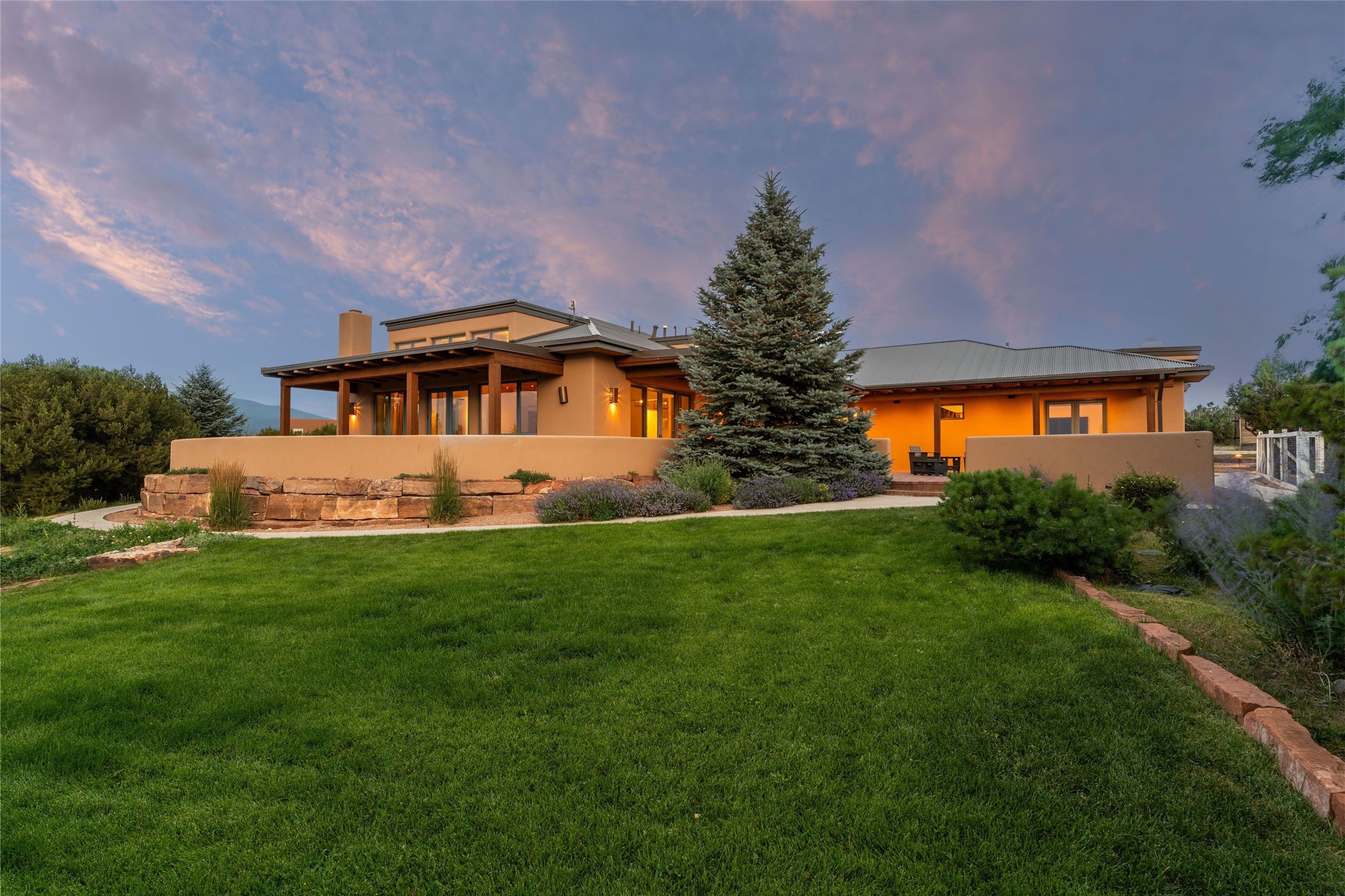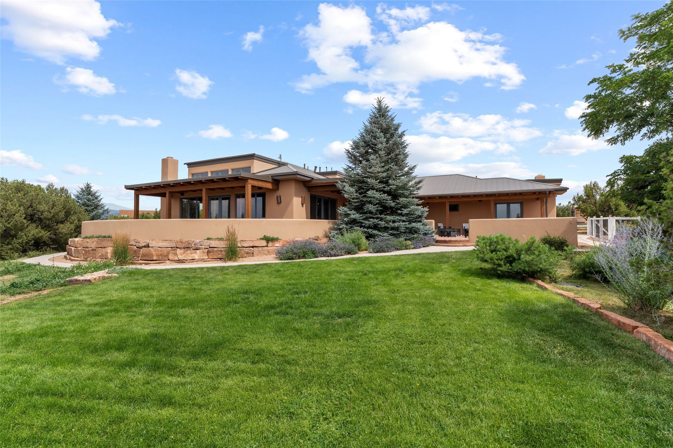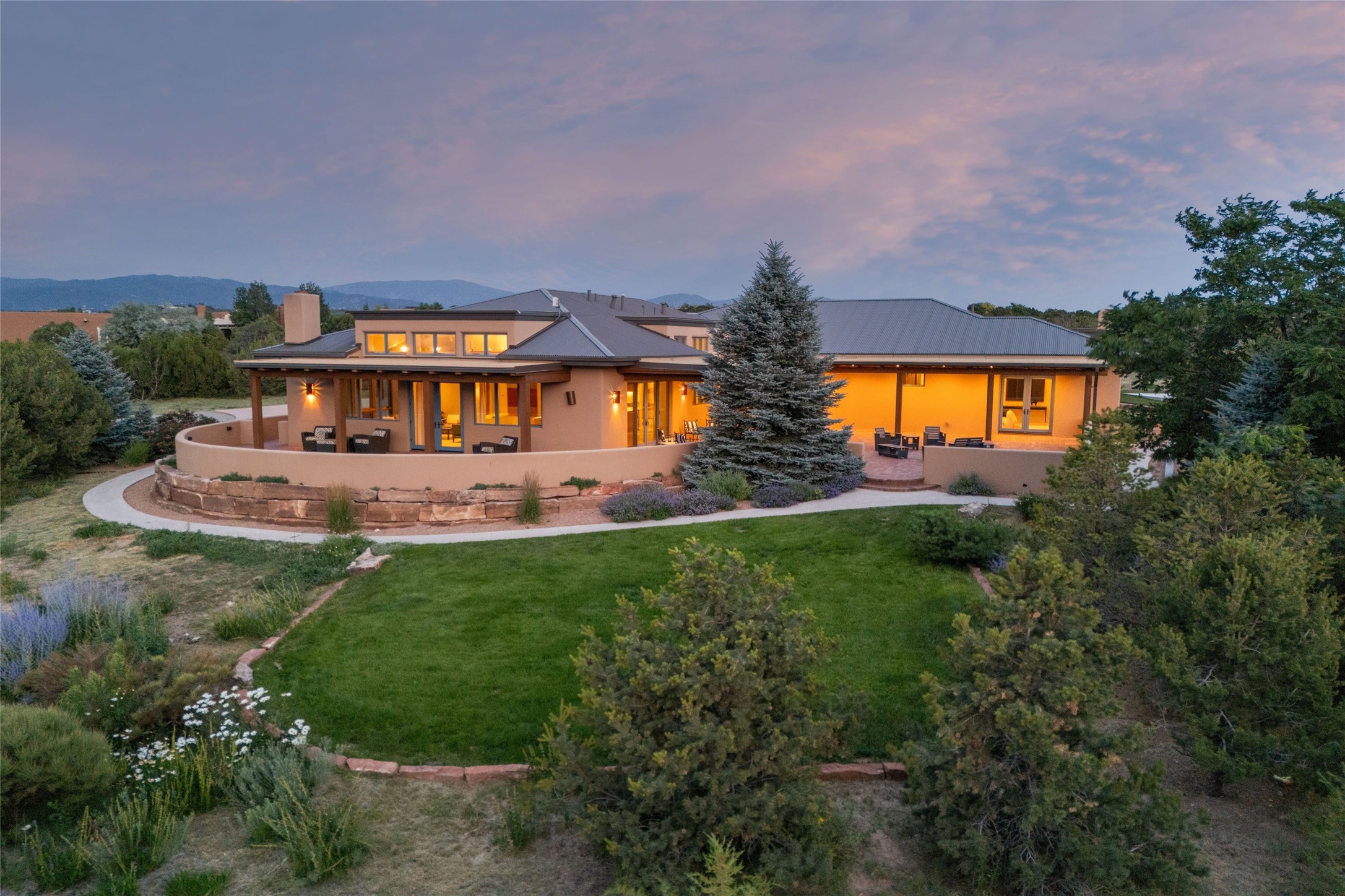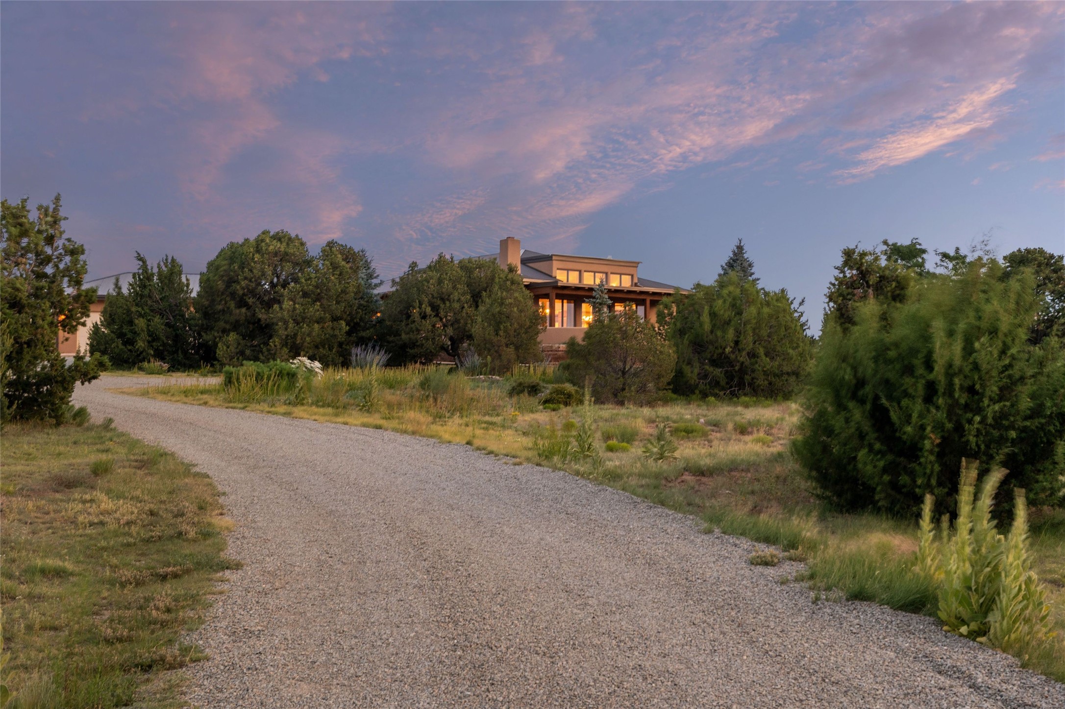 Northern New Mexican style 5-bedroom, 4.5-bath custom-built 5,200 sq. ft. home spanning over 2.5 acres offers panoramic 180-degree views that stretch from the majestic Sangre de Cristo Mountains to the captivating Badlands and Los Alamos. Positioned at the end of a private, gated drive and surrounded by an 8-foot-high coyote fence, this residence is a true entertainer's delight. The open floor plan flows effortlessly into spacious covered and uncovered patios, ideal for hosting both intimate gatherings and grand celebrations. Crafted by Driscoll Construction in 2015, the home showcases bespoke design elements, including custom solid wood doors, white oak flooring, and elegant plaster walls throughout the common areas and primary suite. Enjoy the warmth of three fireplaces, including one on the expansive 1,500 sq. ft. portal, where you can relish both sunrise and sunset vistas. The gourmet kitchen invites culinary creativity with its generous center island, clerestory windows, premium appliances, and double dishwashers. Prioritize wellness with a primary bath steam shower, a 300 sq. ft. gym, an outdoor 6-person sauna, a vegetable garden on drip irrigation, and a fully enclosed chicken coop. Additional highlights include a pitched metal roof, an oversized 3-car garage, photovoltaic solar energy, and rainwater harvesting. Recent upgrades in 2023 encompass new stucco, water filtration, a dog run, and an outdoor grill. Enjoy convenient access to downtown Santa Fe, all while embracing the serene beauty of this exceptional property.
