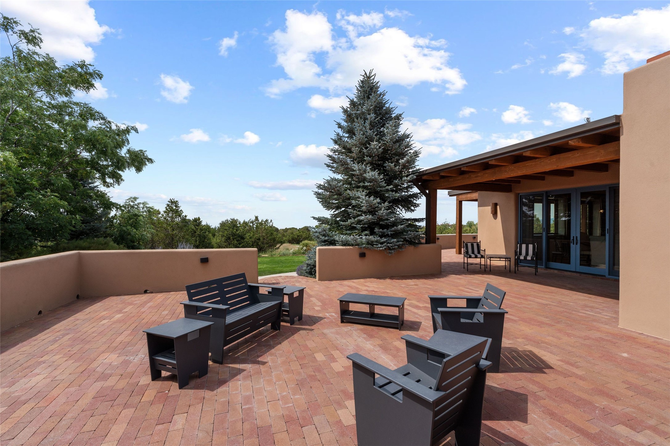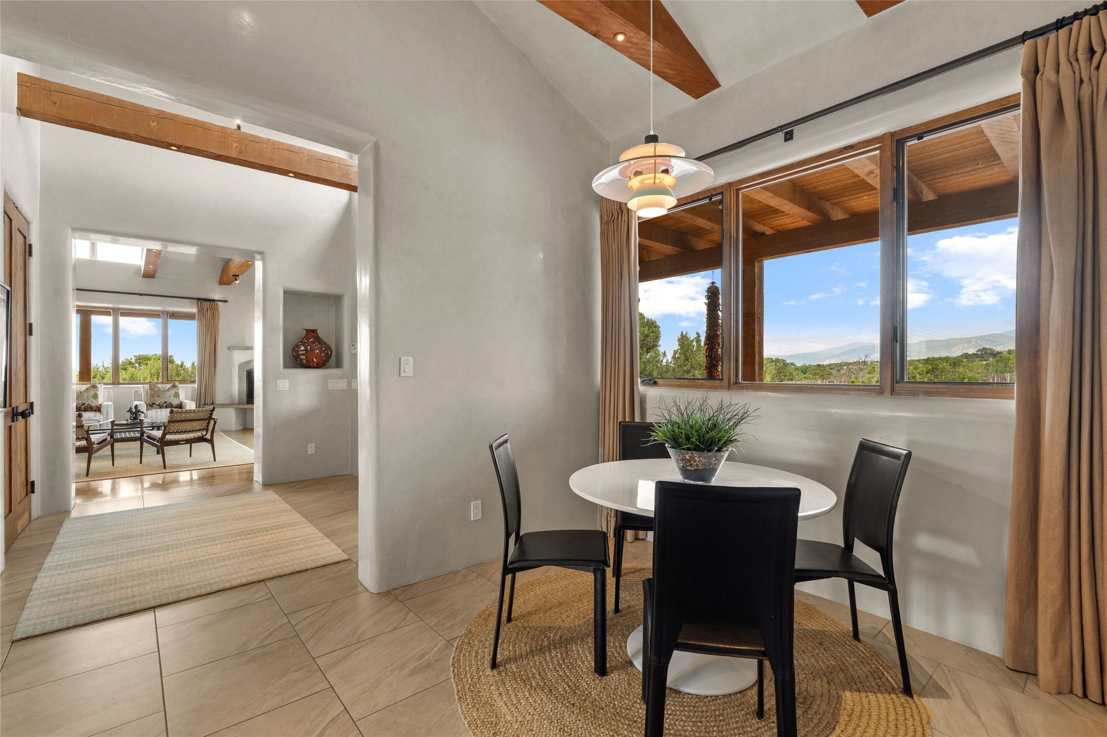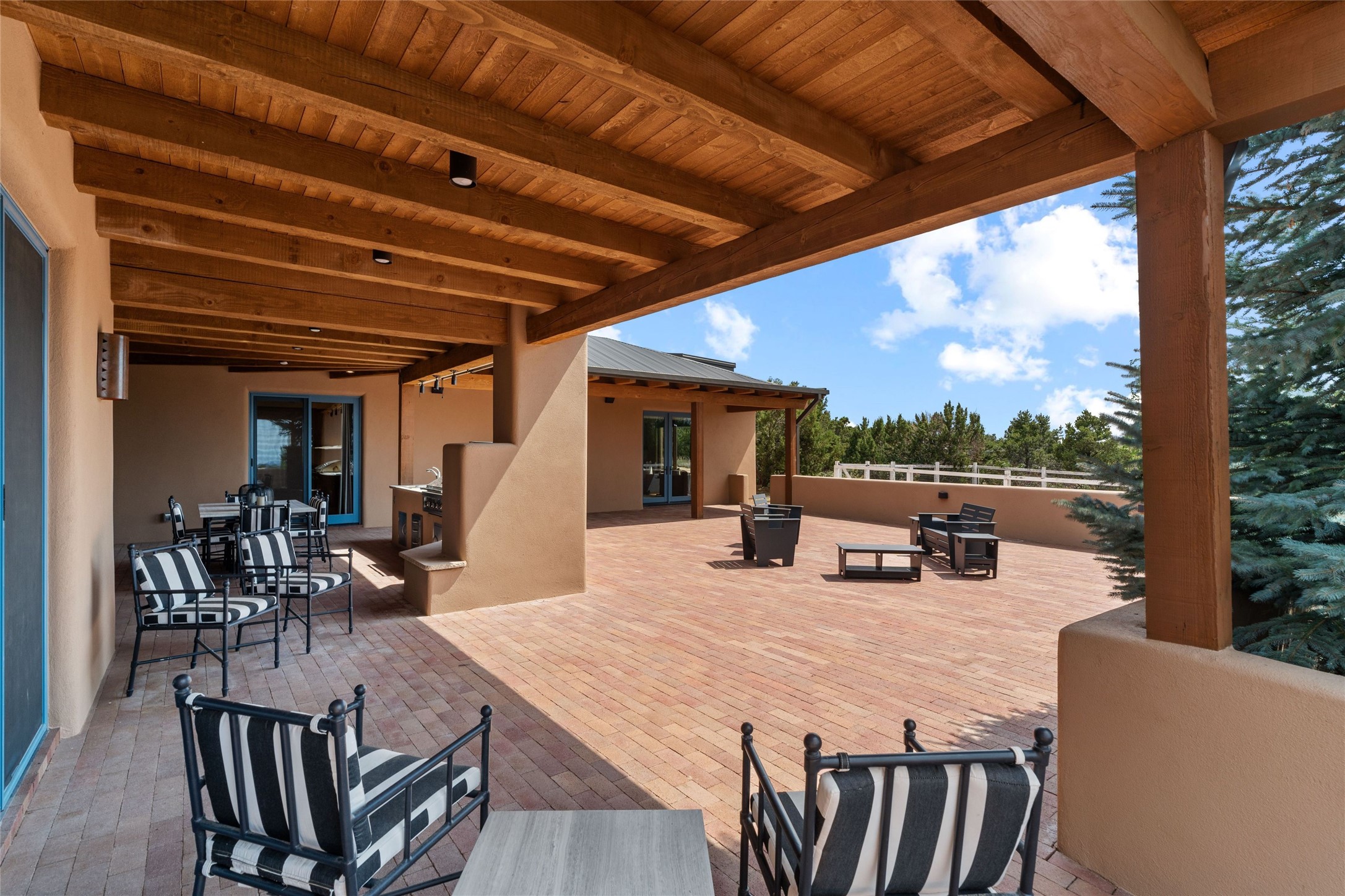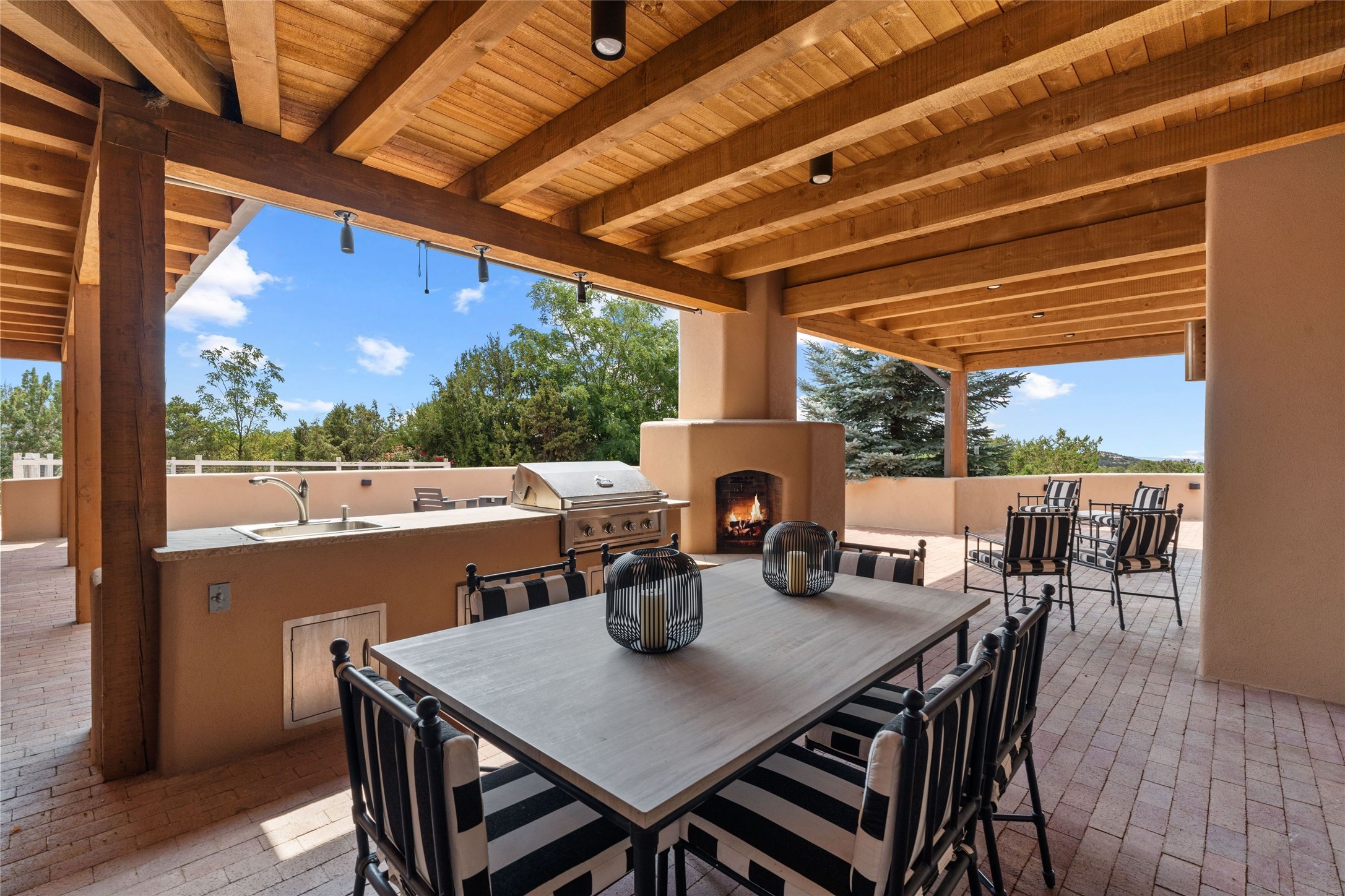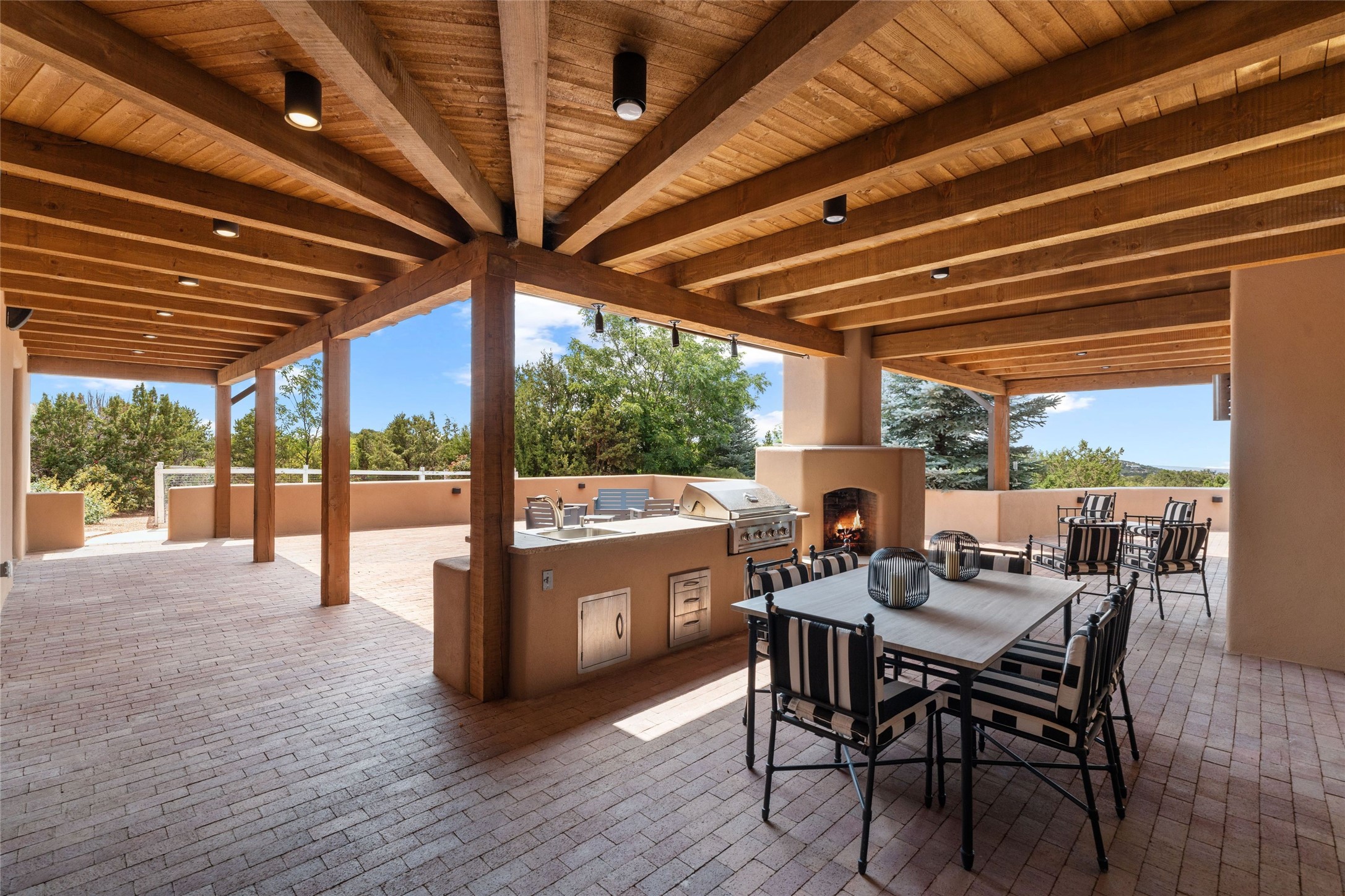 Northern New Mexican style 5-bedroom, 4.5-bath custom-built 5,200 sq. ft. home spanning over 2.5 acres offers panoramic 180-degree views that stretch from the majestic Sangre de Cristo Mountains to the captivating Badlands and Los Alamos. Positioned at the end of a private, gated drive and surrounded by an 8-foot-high coyote fence, this residence is a true entertainer's delight. The open floor plan flows effortlessly into spacious covered and uncovered patios, ideal for hosting both intimate gatherings and grand celebrations. Crafted by Driscoll Construction in 2015, the home showcases bespoke design elements, including custom solid wood doors, white oak flooring, and elegant plaster walls throughout the common areas and primary suite. Enjoy the warmth of three fireplaces, including one on the expansive 1,500 sq. ft. portal, where you can relish both sunrise and sunset vistas. The gourmet kitchen invites culinary creativity with its generous center island, clerestory windows, premium appliances, and double dishwashers. Prioritize wellness with a primary bath steam shower, a 300 sq. ft. gym, an outdoor 6-person sauna, a vegetable garden on drip irrigation, and a fully enclosed chicken coop. Additional highlights include a pitched metal roof, an oversized 3-car garage, photovoltaic solar energy, and rainwater harvesting. Recent upgrades in 2023 encompass new stucco, water filtration, a dog run, and an outdoor grill. Enjoy convenient access to downtown Santa Fe, all while embracing the serene beauty of this exceptional property.