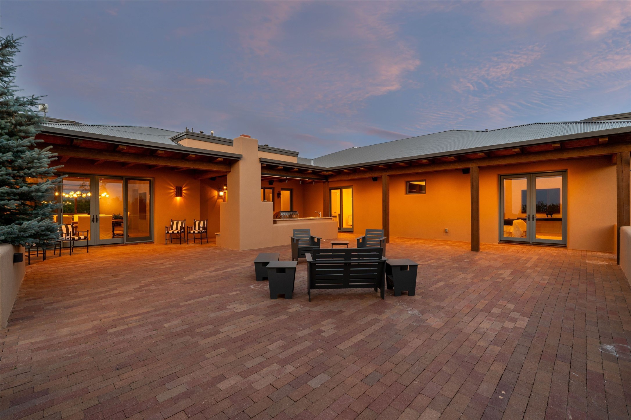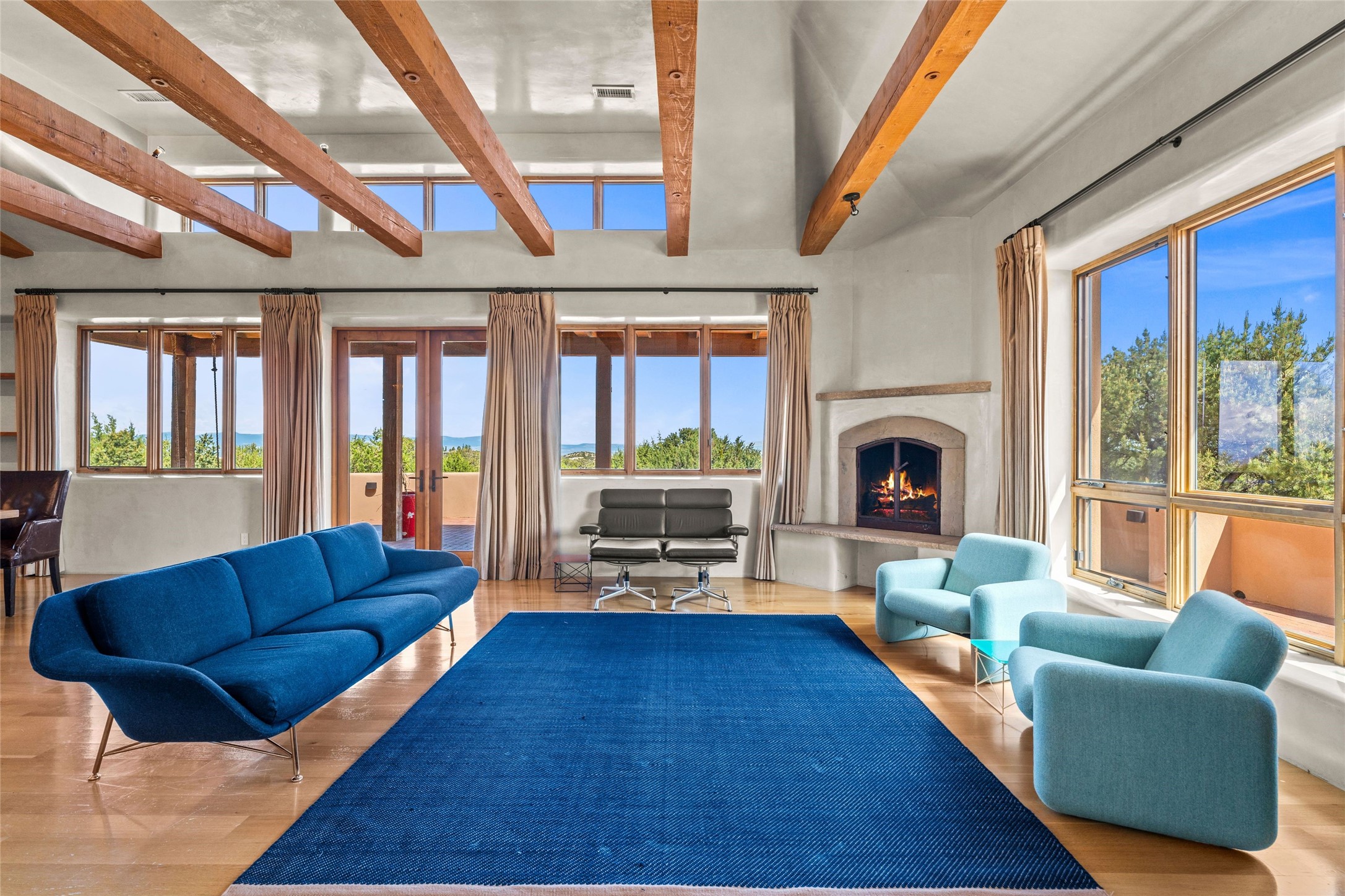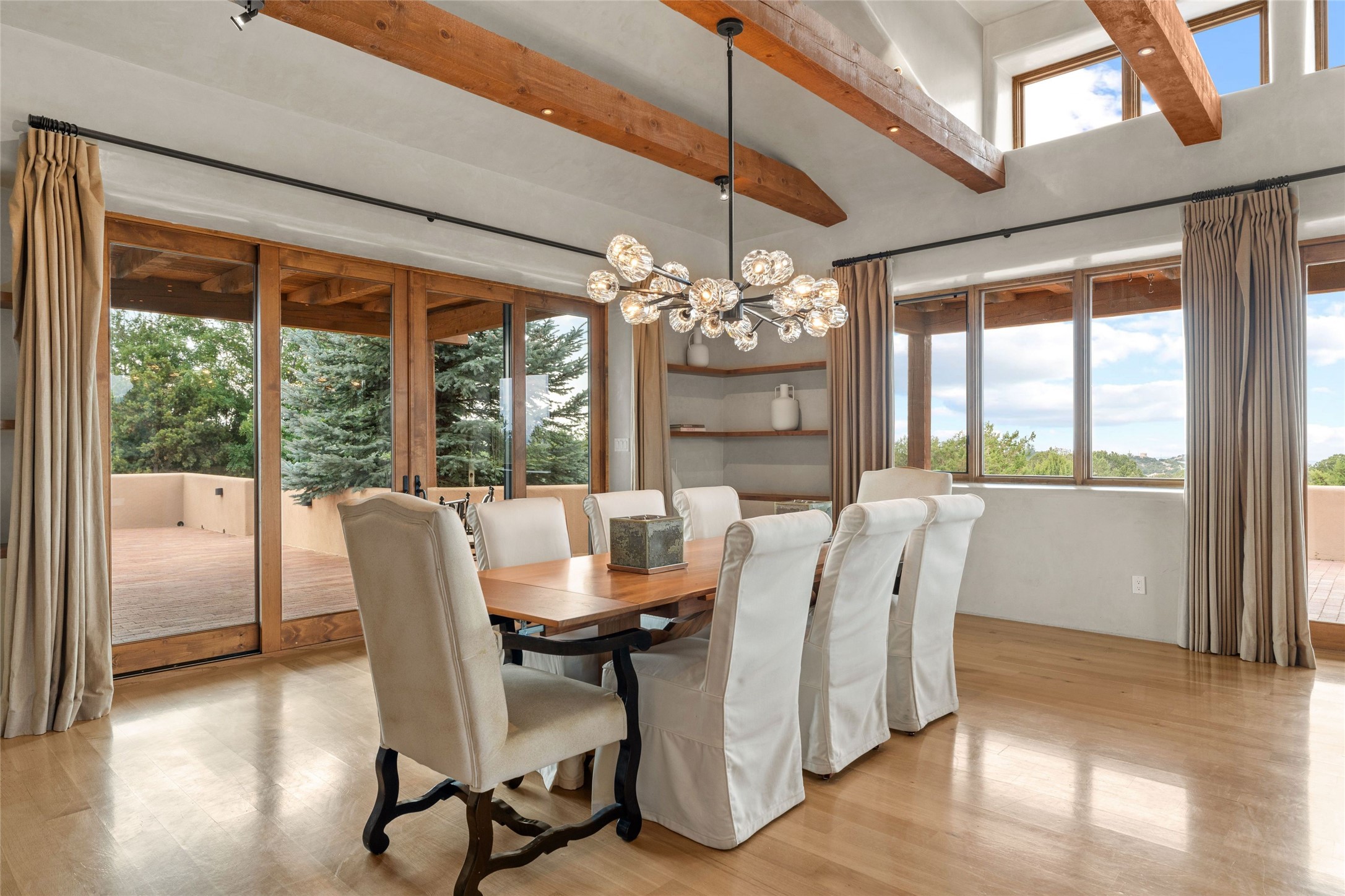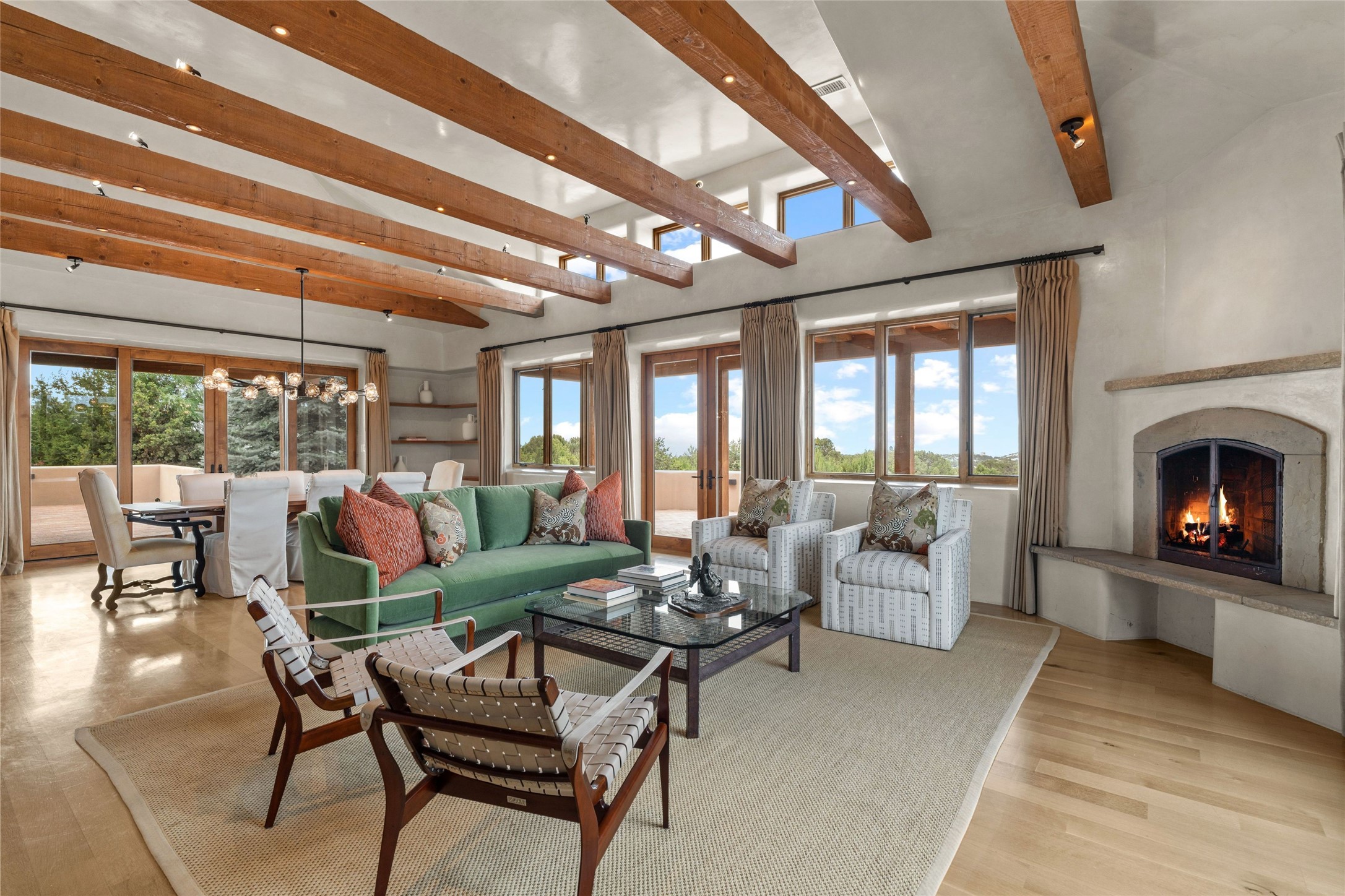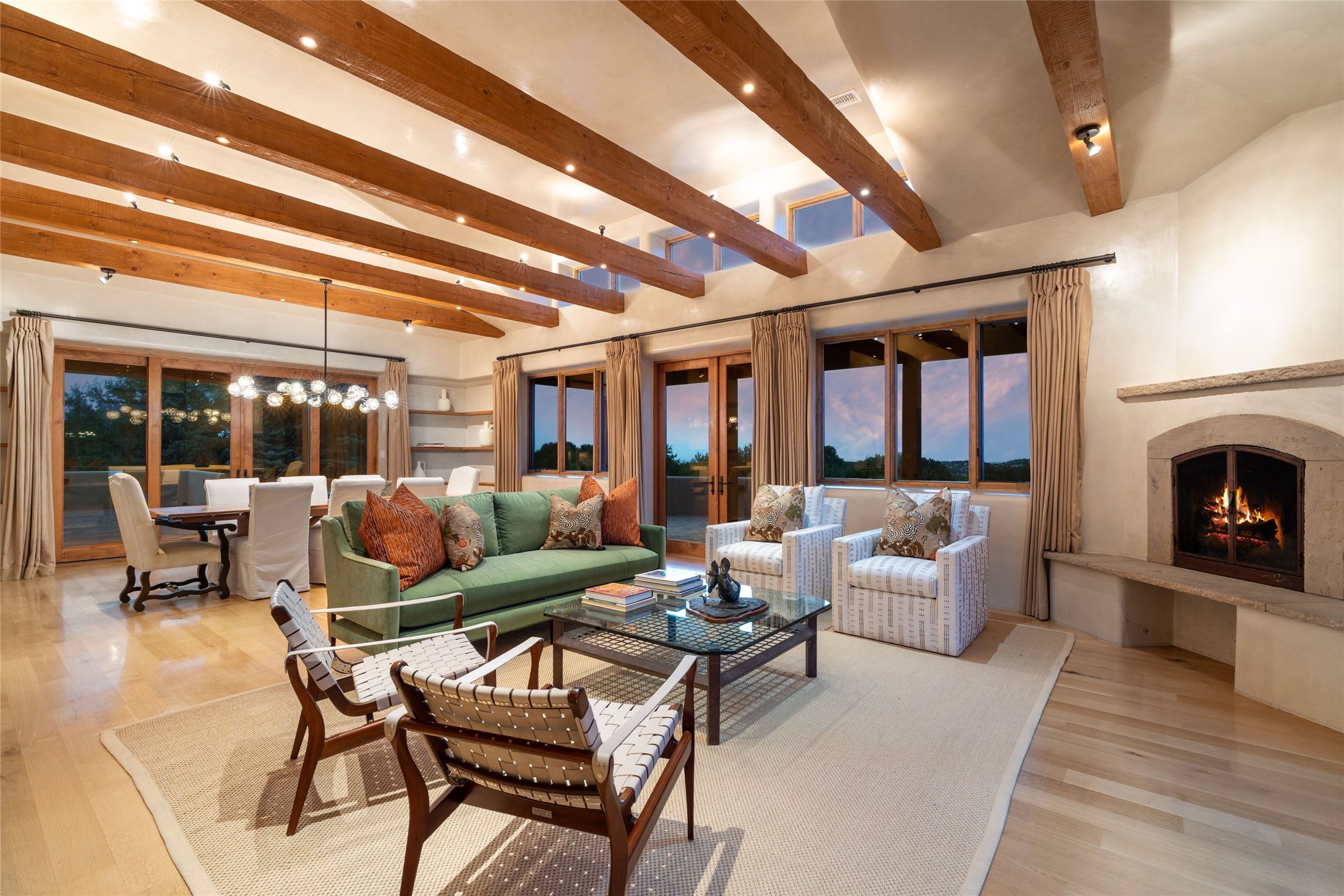 Northern New Mexican style 5-bedroom, 4.5-bath custom-built 5,200 sq. ft. home spanning over 2.5 acres offers panoramic 180-degree views that stretch from the majestic Sangre de Cristo Mountains to the captivating Badlands and Los Alamos. Positioned at the end of a private, gated drive and surrounded by an 8-foot-high coyote fence, this residence is a true entertainer's delight. The open floor plan flows effortlessly into spacious covered and uncovered patios, ideal for hosting both intimate gatherings and grand celebrations. Crafted by Driscoll Construction in 2015, the home showcases bespoke design elements, including custom solid wood doors, white oak flooring, and elegant plaster walls throughout the common areas and primary suite. Enjoy the warmth of three fireplaces, including one on the expansive 1,500 sq. ft. portal, where you can relish both sunrise and sunset vistas. The gourmet kitchen invites culinary creativity with its generous center island, clerestory windows, premium appliances, and double dishwashers. Prioritize wellness with a primary bath steam shower, a 300 sq. ft. gym, an outdoor 6-person sauna, a vegetable garden on drip irrigation, and a fully enclosed chicken coop. Additional highlights include a pitched metal roof, an oversized 3-car garage, photovoltaic solar energy, and rainwater harvesting. Recent upgrades in 2023 encompass new stucco, water filtration, a dog run, and an outdoor grill. Enjoy convenient access to downtown Santa Fe, all while embracing the serene beauty of this exceptional property.