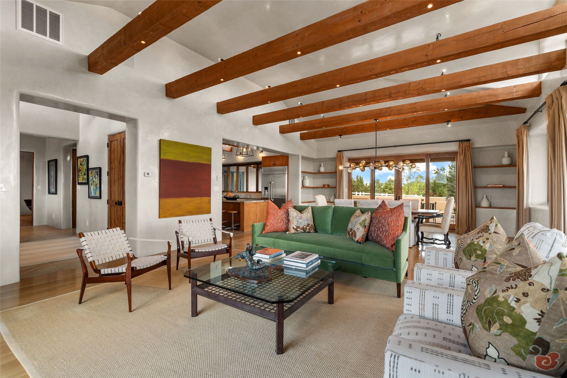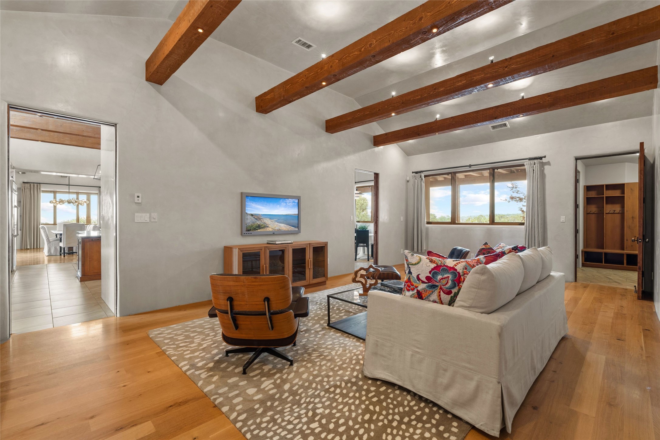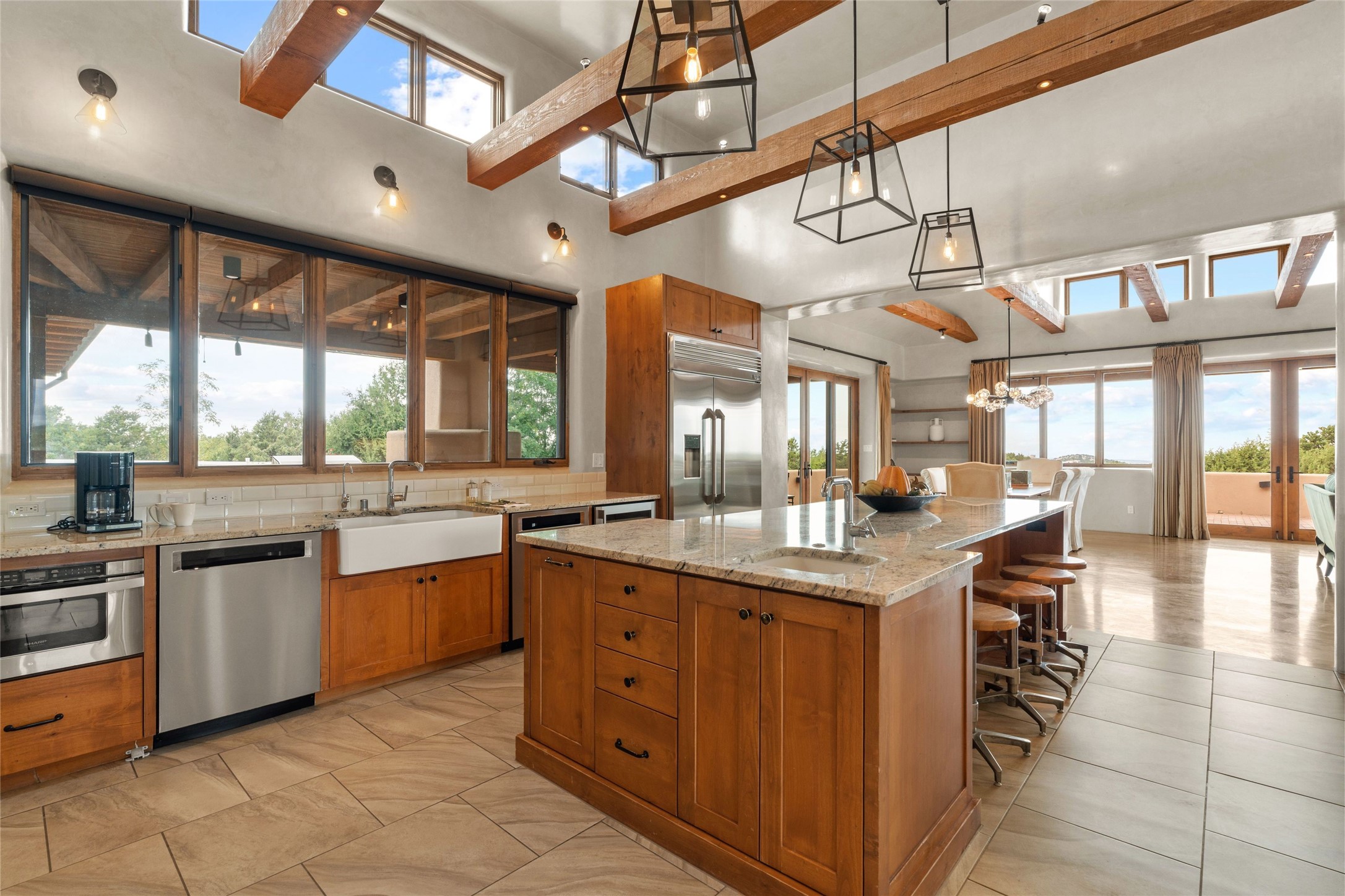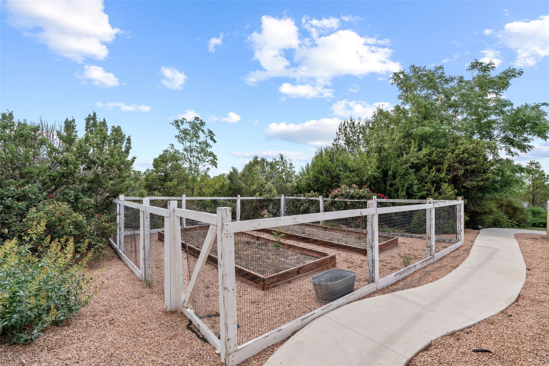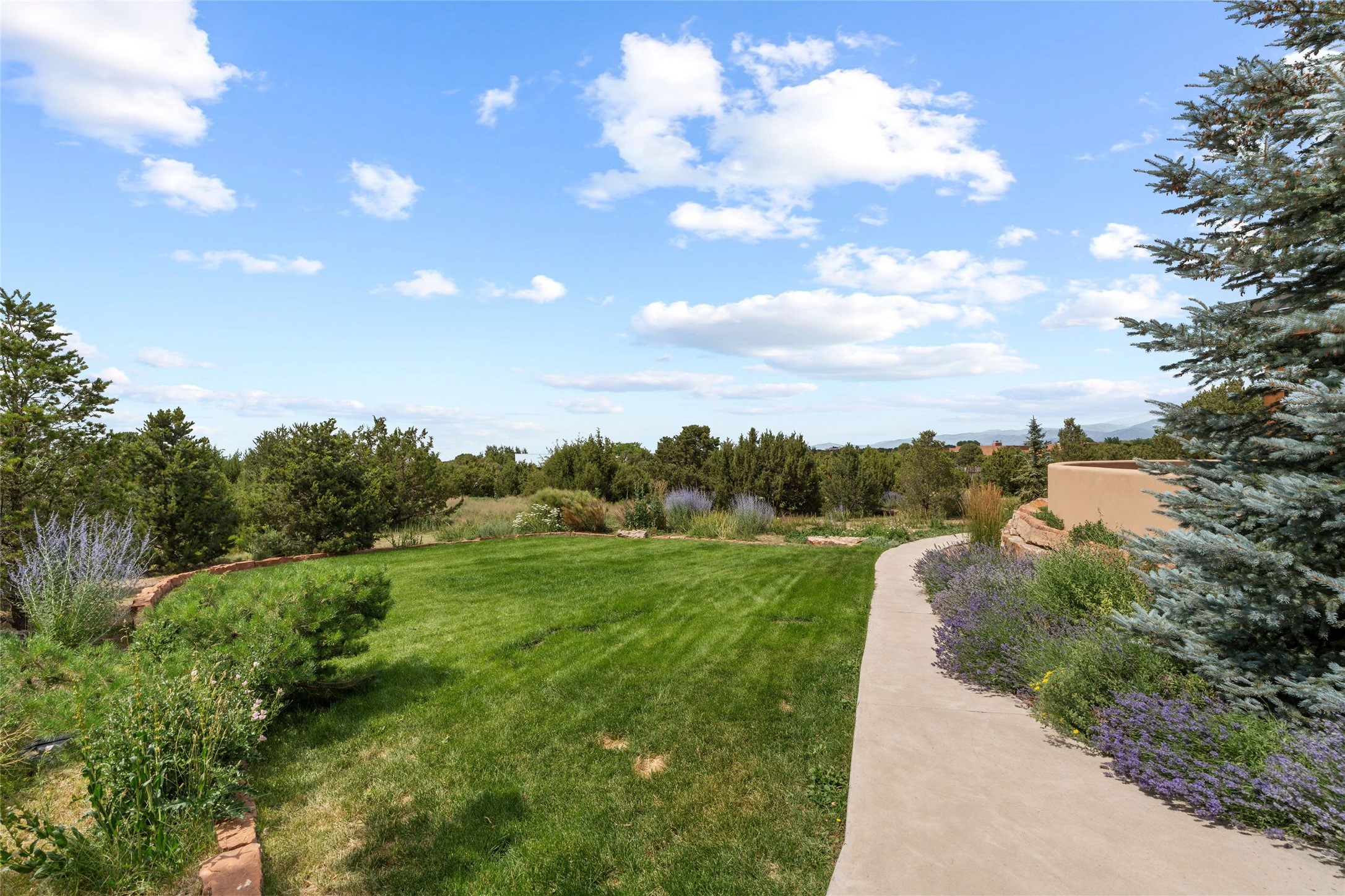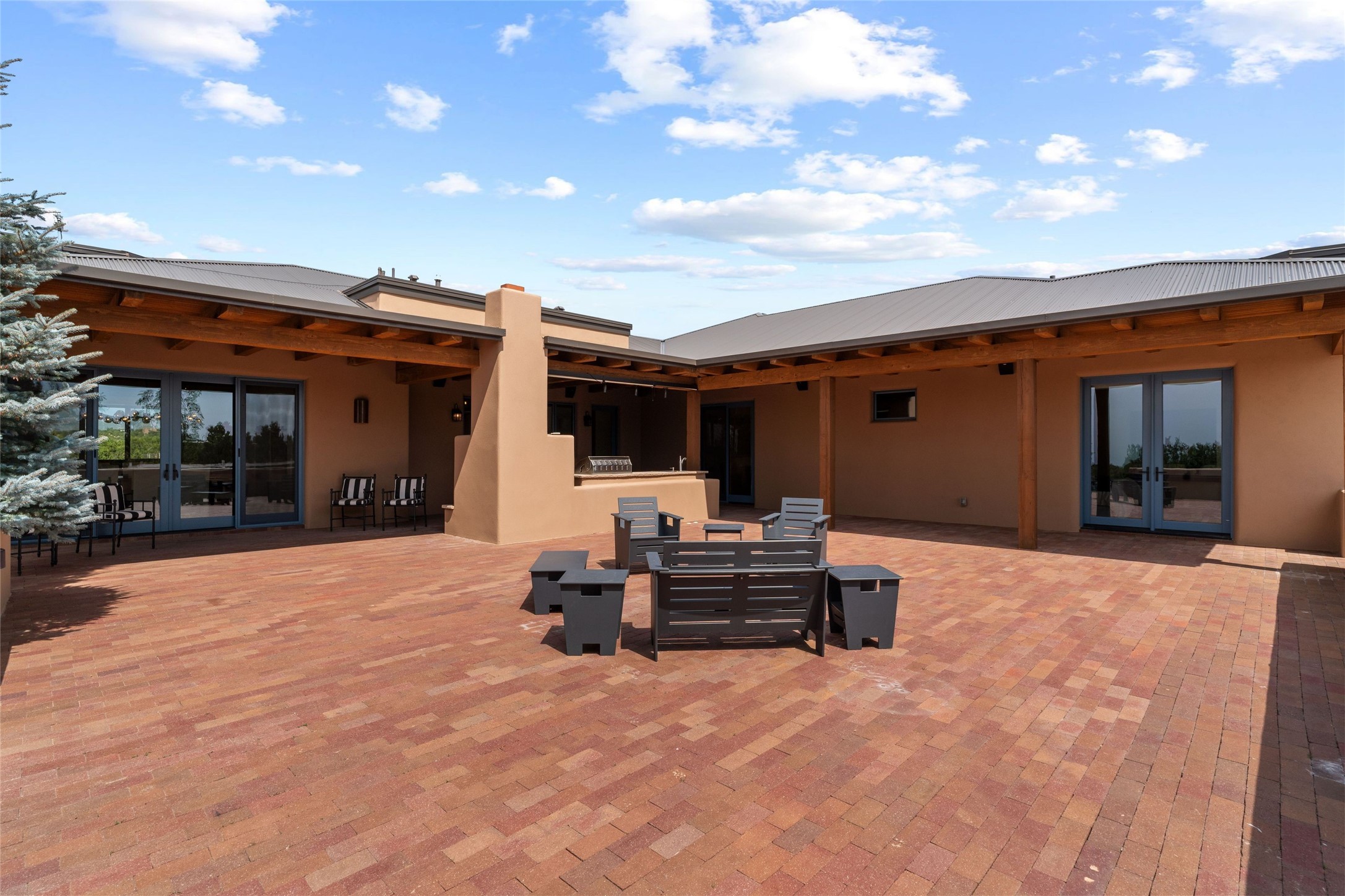 Northern New Mexican style 5-bedroom, 4.5-bath custom-built 5,200 sq. ft. home spanning over 2.5 acres offers panoramic 180-degree views that stretch from the majestic Sangre de Cristo Mountains to the captivating Badlands and Los Alamos. Positioned at the end of a private, gated drive and surrounded by an 8-foot-high coyote fence, this residence is a true entertainer's delight. The open floor plan flows effortlessly into spacious covered and uncovered patios, ideal for hosting both intimate gatherings and grand celebrations. Crafted by Driscoll Construction in 2015, the home showcases bespoke design elements, including custom solid wood doors, white oak flooring, and elegant plaster walls throughout the common areas and primary suite. Enjoy the warmth of three fireplaces, including one on the expansive 1,500 sq. ft. portal, where you can relish both sunrise and sunset vistas. The gourmet kitchen invites culinary creativity with its generous center island, clerestory windows, premium appliances, and double dishwashers. Prioritize wellness with a primary bath steam shower, a 300 sq. ft. gym, an outdoor 6-person sauna, a vegetable garden on drip irrigation, and a fully enclosed chicken coop. Additional highlights include a pitched metal roof, an oversized 3-car garage, photovoltaic solar energy, and rainwater harvesting. Recent upgrades in 2023 encompass new stucco, water filtration, a dog run, and an outdoor grill. Enjoy convenient access to downtown Santa Fe, all while embracing the serene beauty of this exceptional property.