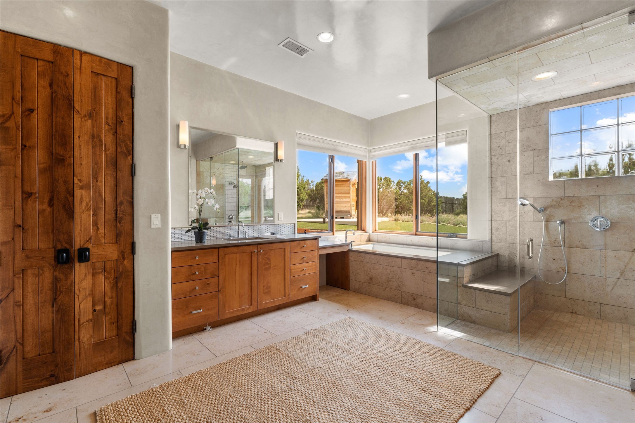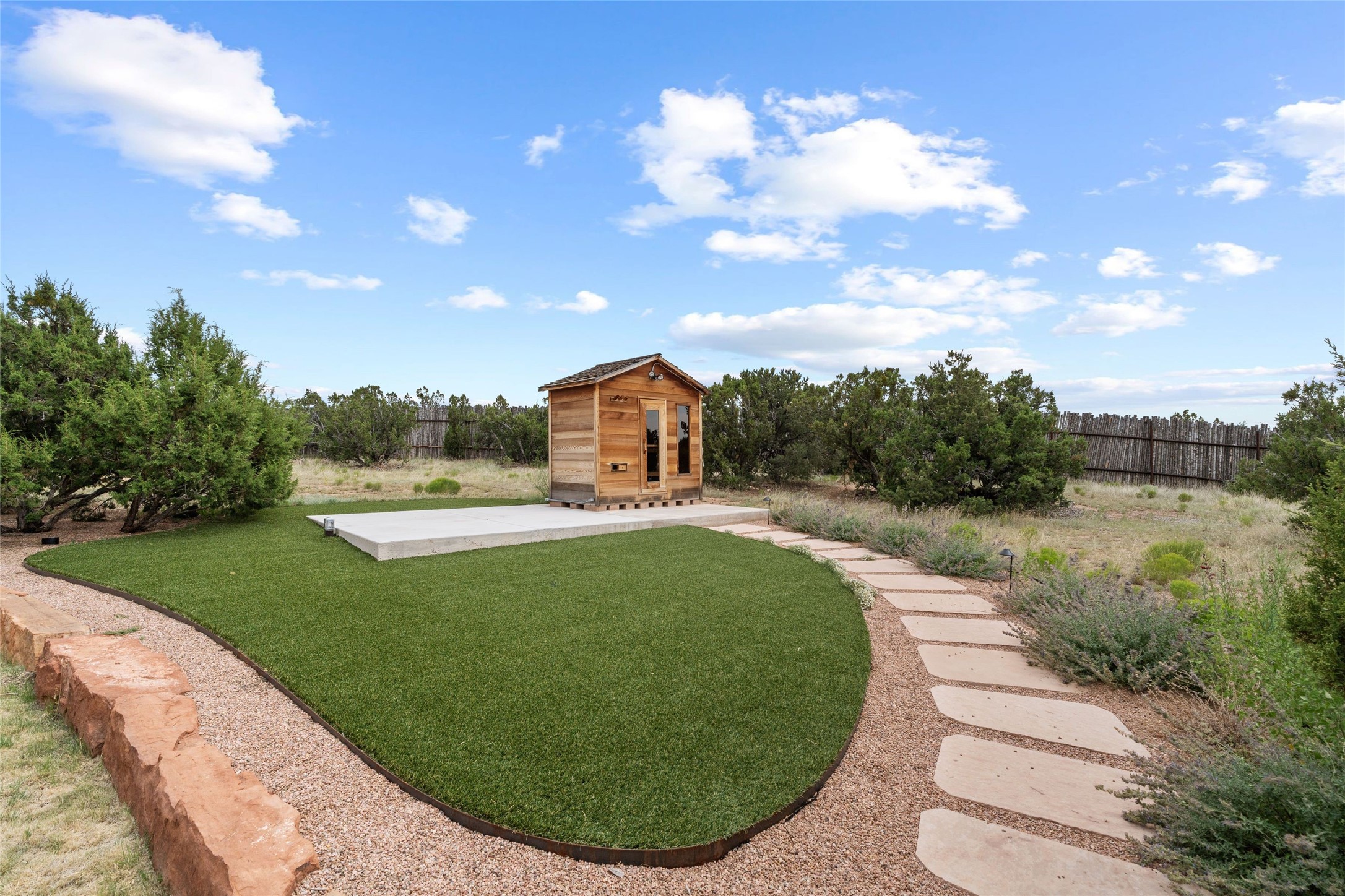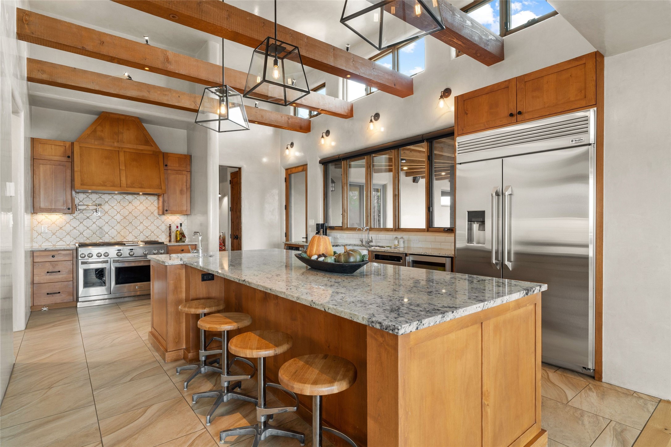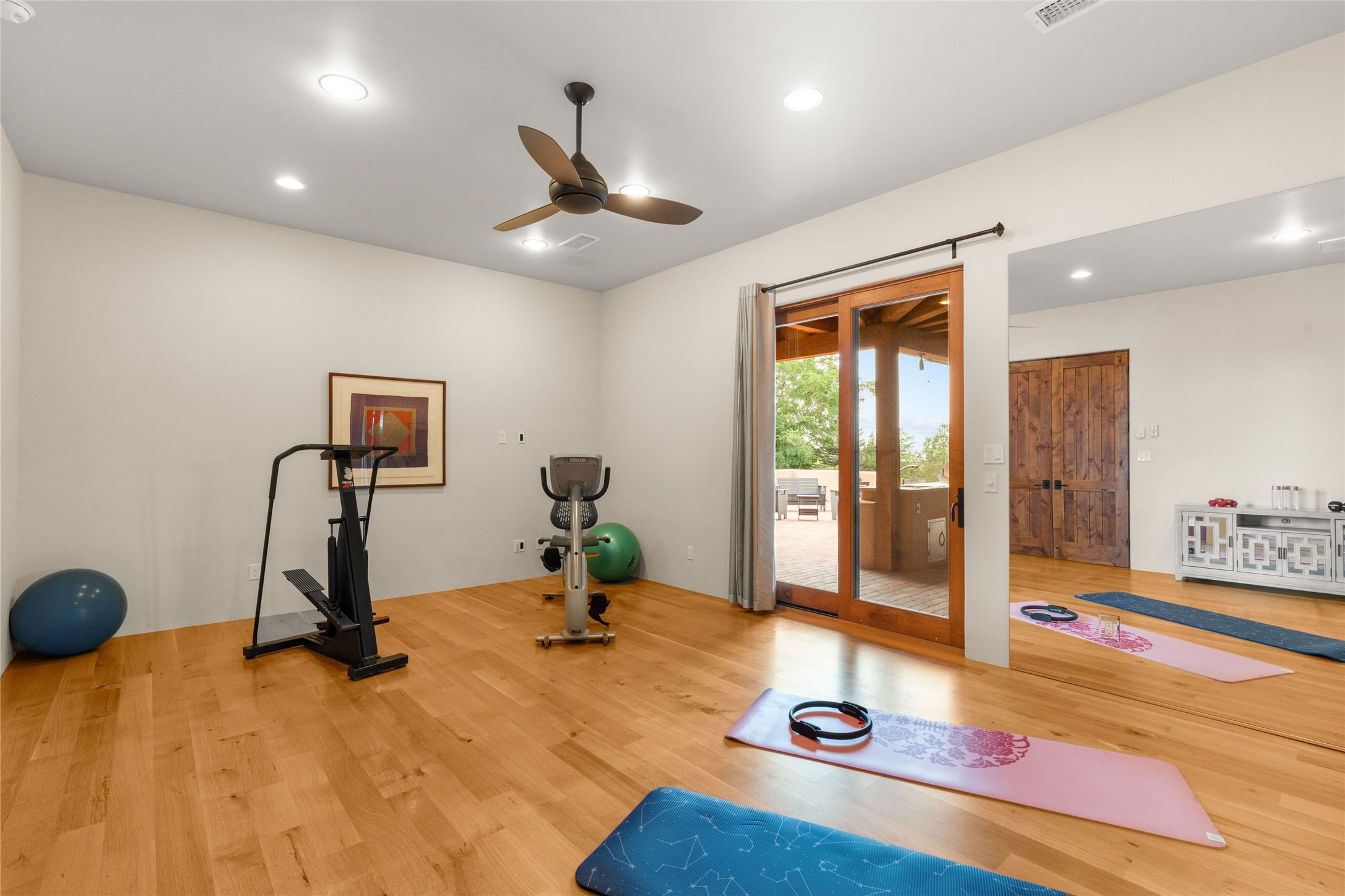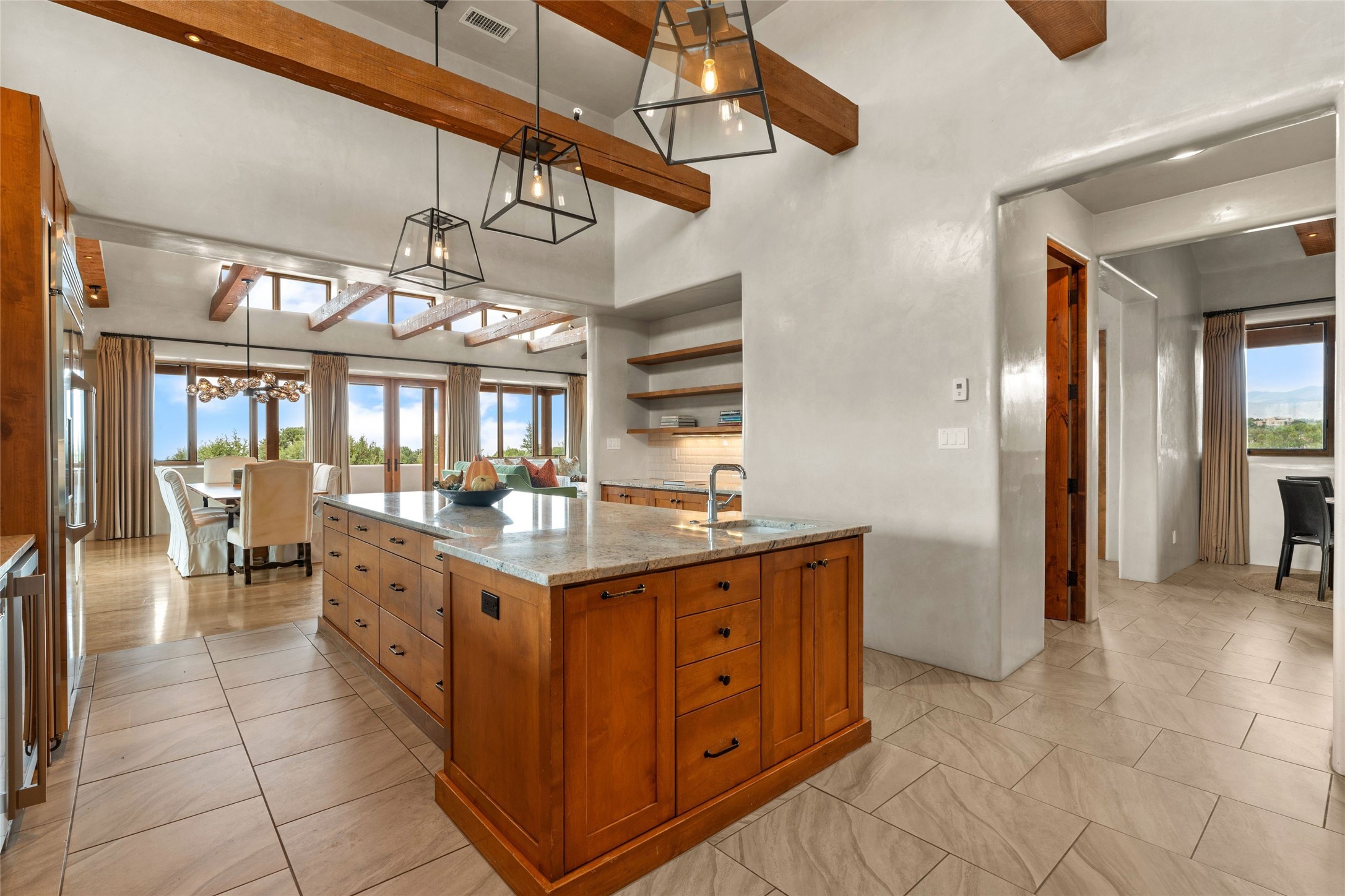 Northern New Mexican style 5-bedroom, 4.5-bath custom-built 5,200 sq. ft. home spanning over 2.5 acres offers panoramic 180-degree views that stretch from the majestic Sangre de Cristo Mountains to the captivating Badlands and Los Alamos. Positioned at the end of a private, gated drive and surrounded by an 8-foot-high coyote fence, this residence is a true entertainer's delight. The open floor plan flows effortlessly into spacious covered and uncovered patios, ideal for hosting both intimate gatherings and grand celebrations. Crafted by Driscoll Construction in 2015, the home showcases bespoke design elements, including custom solid wood doors, white oak flooring, and elegant plaster walls throughout the common areas and primary suite. Enjoy the warmth of three fireplaces, including one on the expansive 1,500 sq. ft. portal, where you can relish both sunrise and sunset vistas. The gourmet kitchen invites culinary creativity with its generous center island, clerestory windows, premium appliances, and double dishwashers. Prioritize wellness with a primary bath steam shower, a 300 sq. ft. gym, an outdoor 6-person sauna, a vegetable garden on drip irrigation, and a fully enclosed chicken coop. Additional highlights include a pitched metal roof, an oversized 3-car garage, photovoltaic solar energy, and rainwater harvesting. Recent upgrades in 2023 encompass new stucco, water filtration, a dog run, and an outdoor grill. Enjoy convenient access to downtown Santa Fe, all while embracing the serene beauty of this exceptional property.