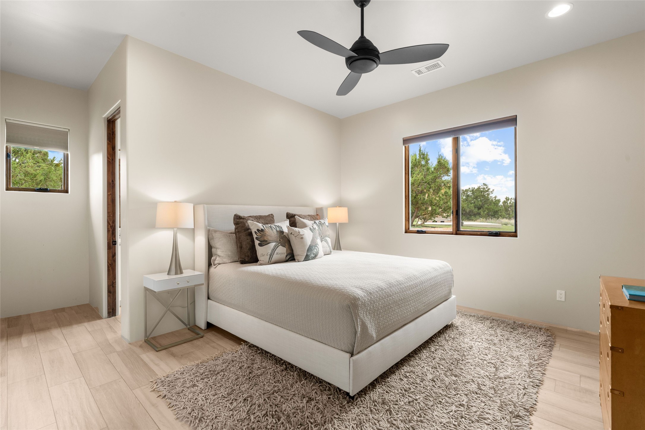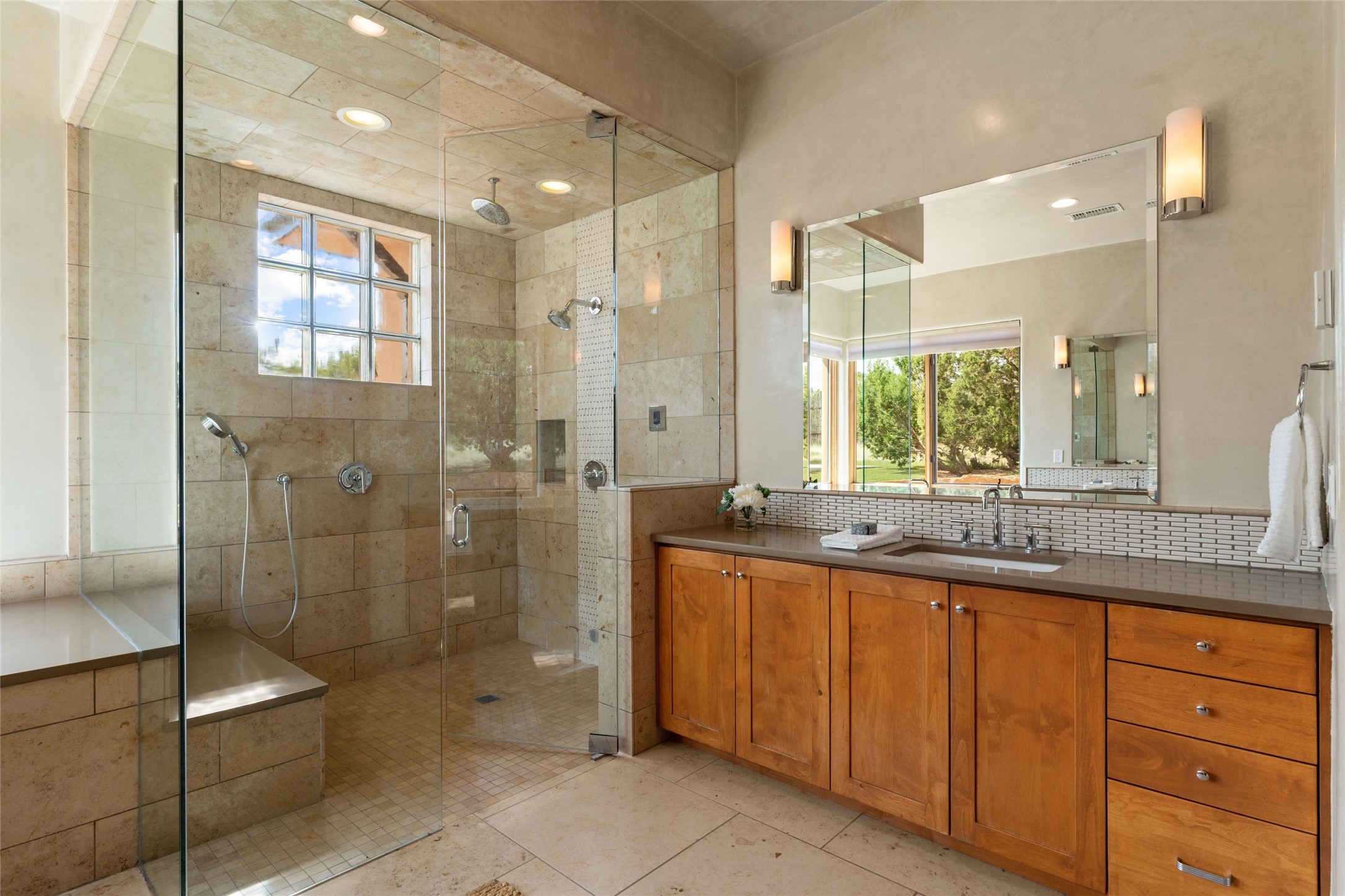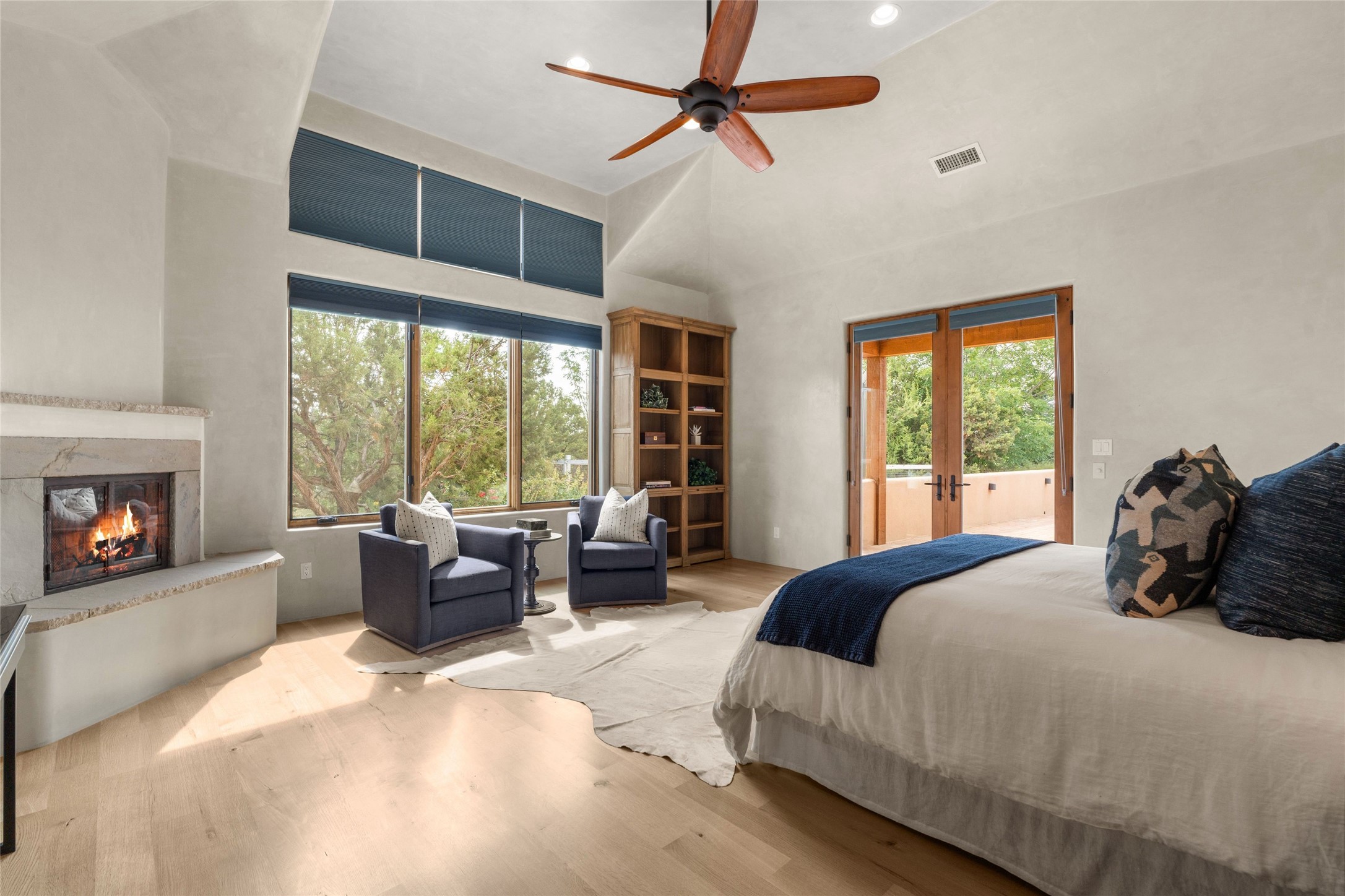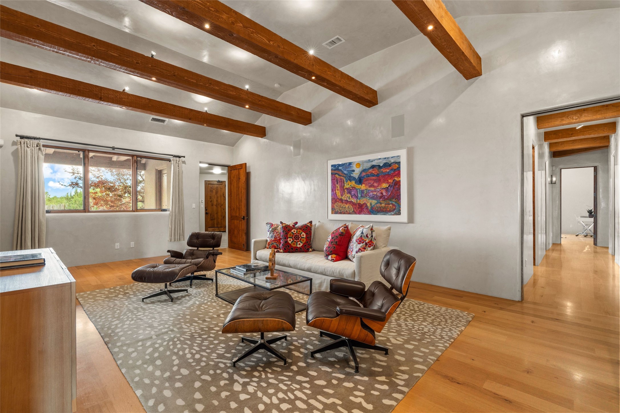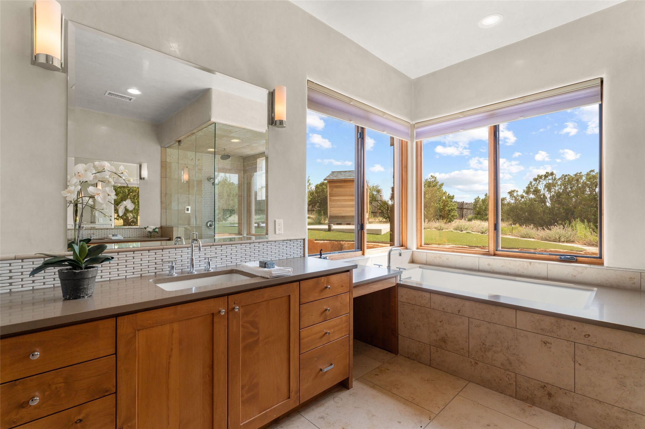 Northern New Mexican style 5-bedroom, 4.5-bath custom-built 5,200 sq. ft. home spanning over 2.5 acres offers panoramic 180-degree views that stretch from the majestic Sangre de Cristo Mountains to the captivating Badlands and Los Alamos. Positioned at the end of a private, gated drive and surrounded by an 8-foot-high coyote fence, this residence is a true entertainer's delight. The open floor plan flows effortlessly into spacious covered and uncovered patios, ideal for hosting both intimate gatherings and grand celebrations. Crafted by Driscoll Construction in 2015, the home showcases bespoke design elements, including custom solid wood doors, white oak flooring, and elegant plaster walls throughout the common areas and primary suite. Enjoy the warmth of three fireplaces, including one on the expansive 1,500 sq. ft. portal, where you can relish both sunrise and sunset vistas. The gourmet kitchen invites culinary creativity with its generous center island, clerestory windows, premium appliances, and double dishwashers. Prioritize wellness with a primary bath steam shower, a 300 sq. ft. gym, an outdoor 6-person sauna, a vegetable garden on drip irrigation, and a fully enclosed chicken coop. Additional highlights include a pitched metal roof, an oversized 3-car garage, photovoltaic solar energy, and rainwater harvesting. Recent upgrades in 2023 encompass new stucco, water filtration, a dog run, and an outdoor grill. Enjoy convenient access to downtown Santa Fe, all while embracing the serene beauty of this exceptional property.