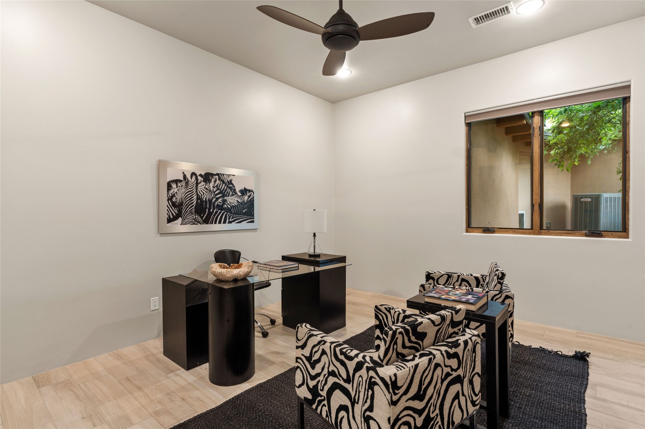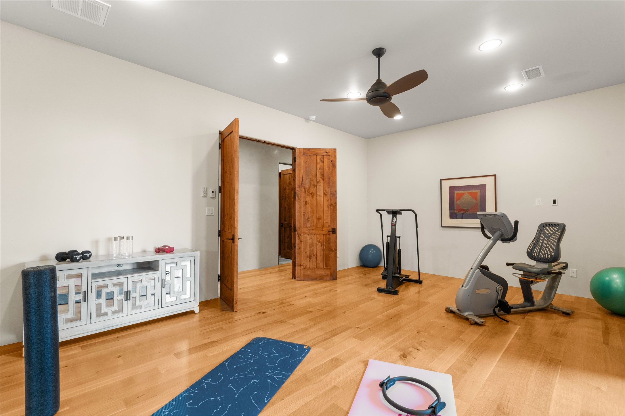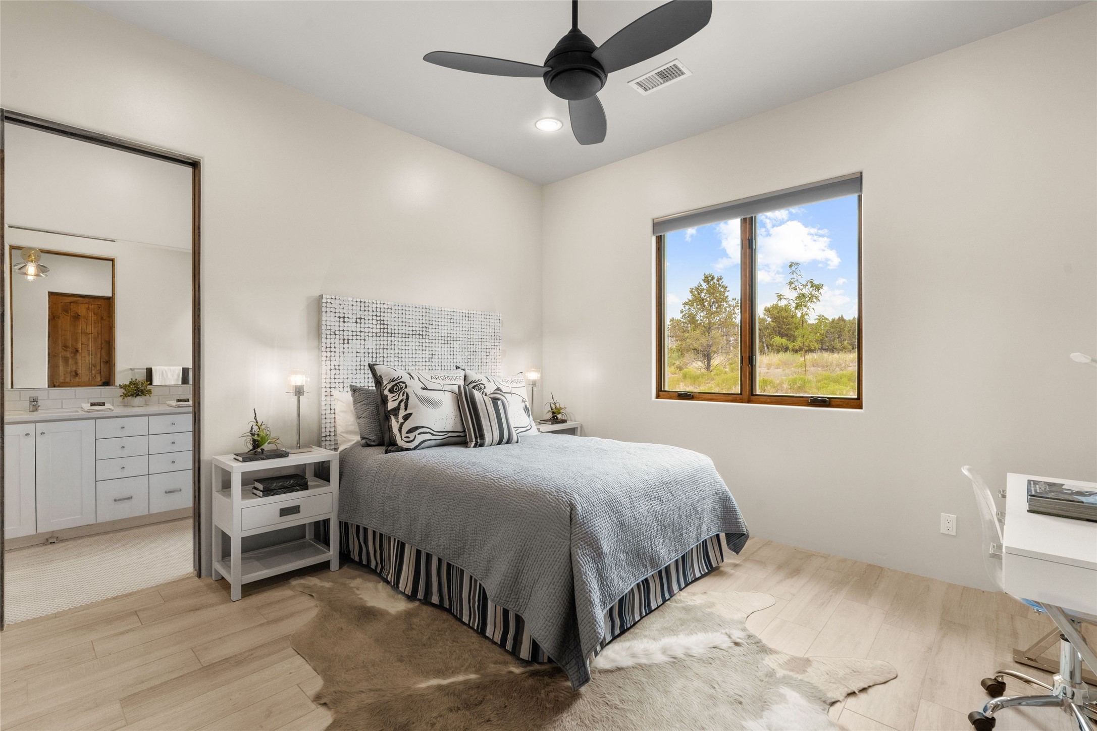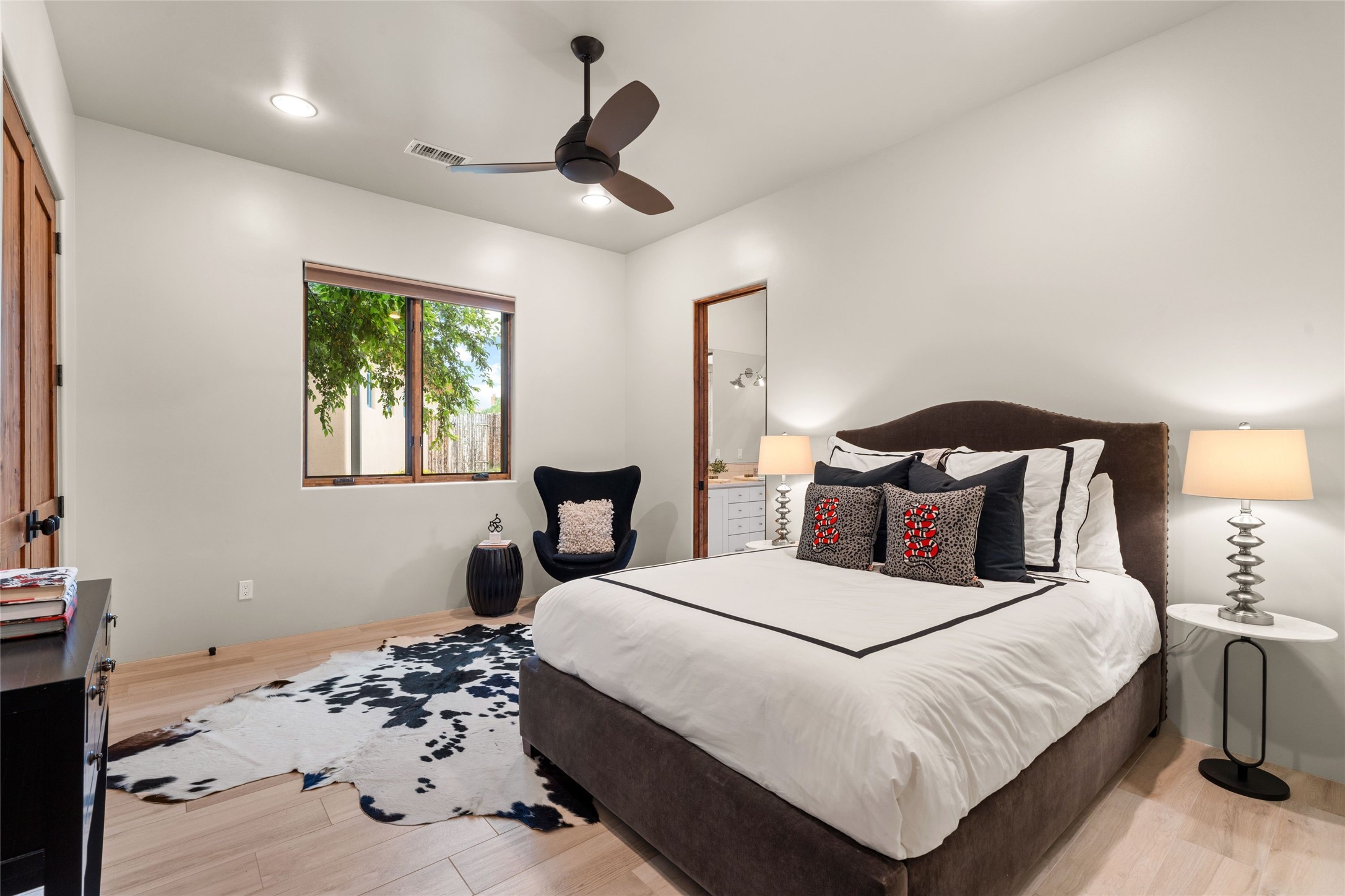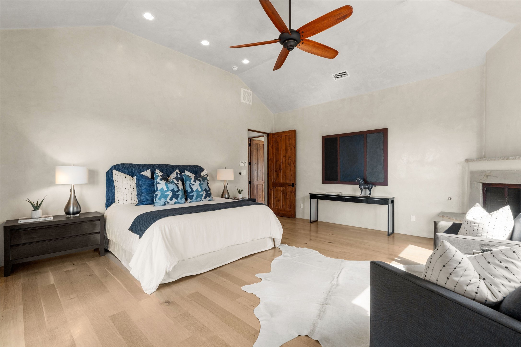 Northern New Mexican style 5-bedroom, 4.5-bath custom-built 5,200 sq. ft. home spanning over 2.5 acres offers panoramic 180-degree views that stretch from the majestic Sangre de Cristo Mountains to the captivating Badlands and Los Alamos. Positioned at the end of a private, gated drive and surrounded by an 8-foot-high coyote fence, this residence is a true entertainer's delight. The open floor plan flows effortlessly into spacious covered and uncovered patios, ideal for hosting both intimate gatherings and grand celebrations. Crafted by Driscoll Construction in 2015, the home showcases bespoke design elements, including custom solid wood doors, white oak flooring, and elegant plaster walls throughout the common areas and primary suite. Enjoy the warmth of three fireplaces, including one on the expansive 1,500 sq. ft. portal, where you can relish both sunrise and sunset vistas. The gourmet kitchen invites culinary creativity with its generous center island, clerestory windows, premium appliances, and double dishwashers. Prioritize wellness with a primary bath steam shower, a 300 sq. ft. gym, an outdoor 6-person sauna, a vegetable garden on drip irrigation, and a fully enclosed chicken coop. Additional highlights include a pitched metal roof, an oversized 3-car garage, photovoltaic solar energy, and rainwater harvesting. Recent upgrades in 2023 encompass new stucco, water filtration, a dog run, and an outdoor grill. Enjoy convenient access to downtown Santa Fe, all while embracing the serene beauty of this exceptional property.