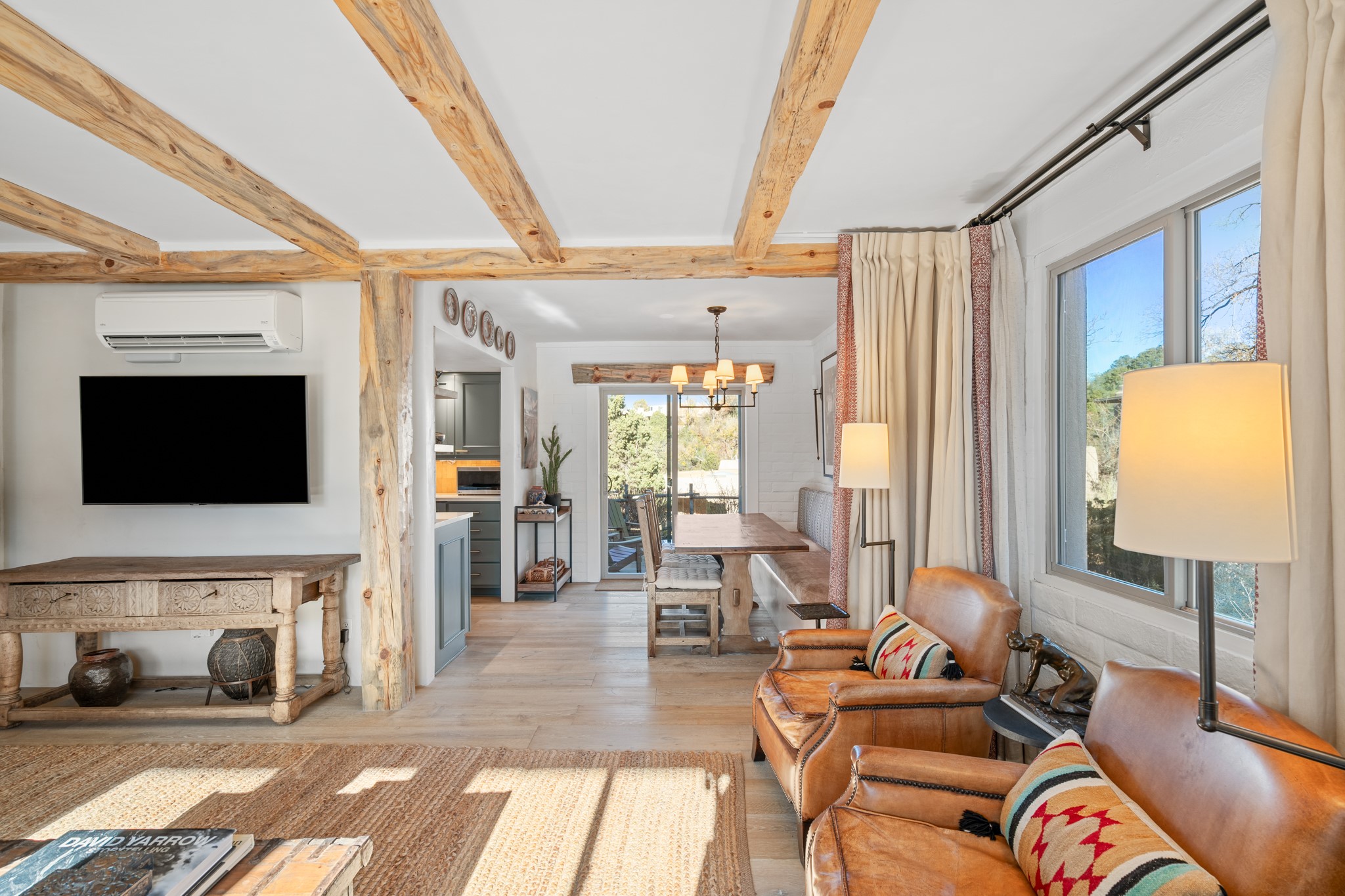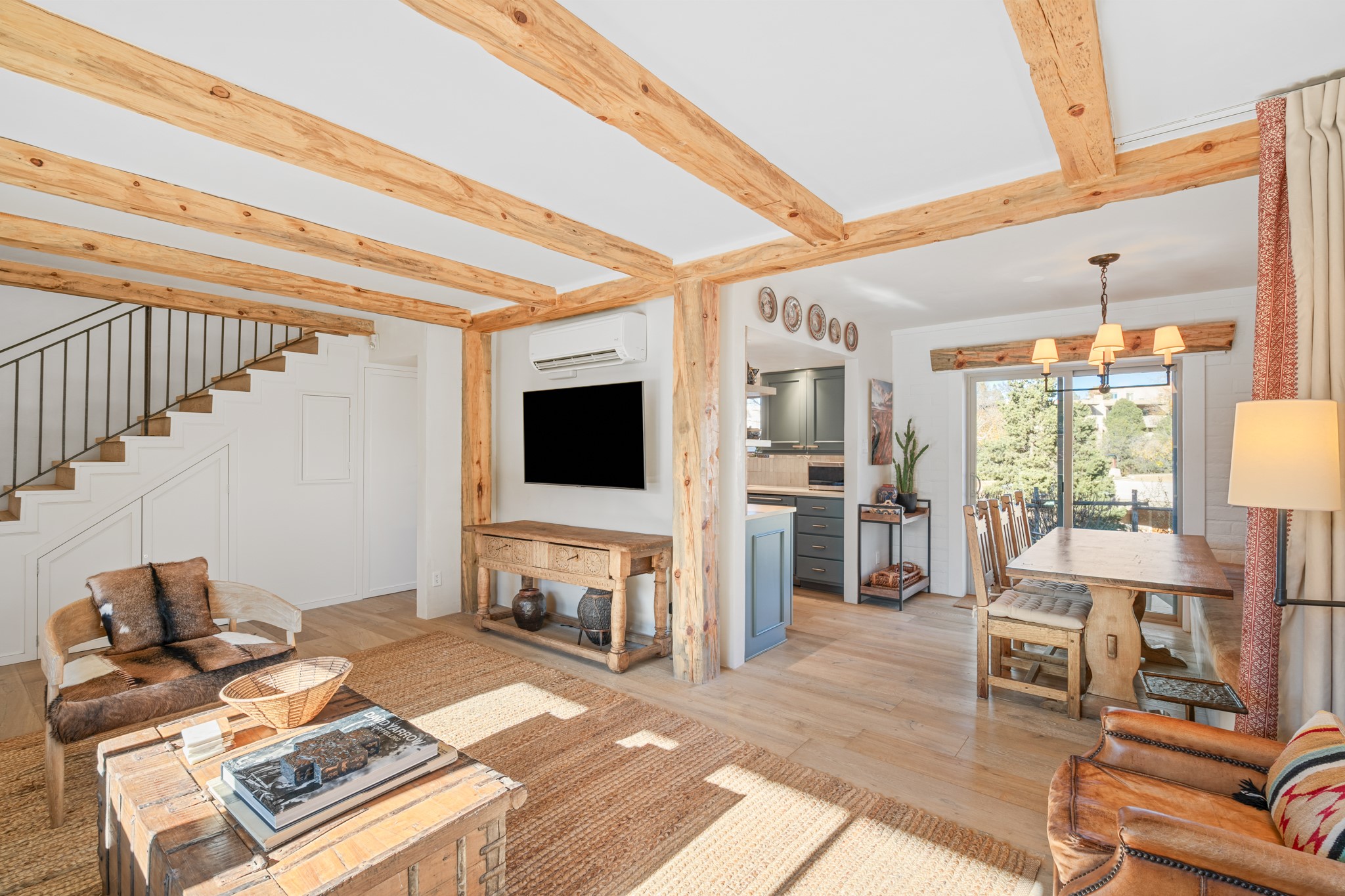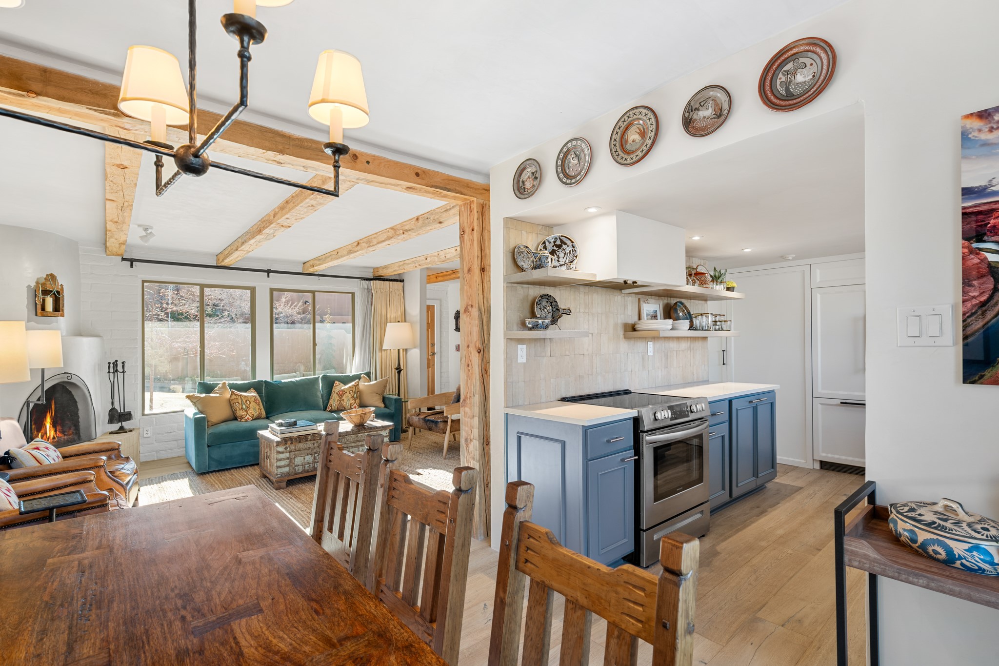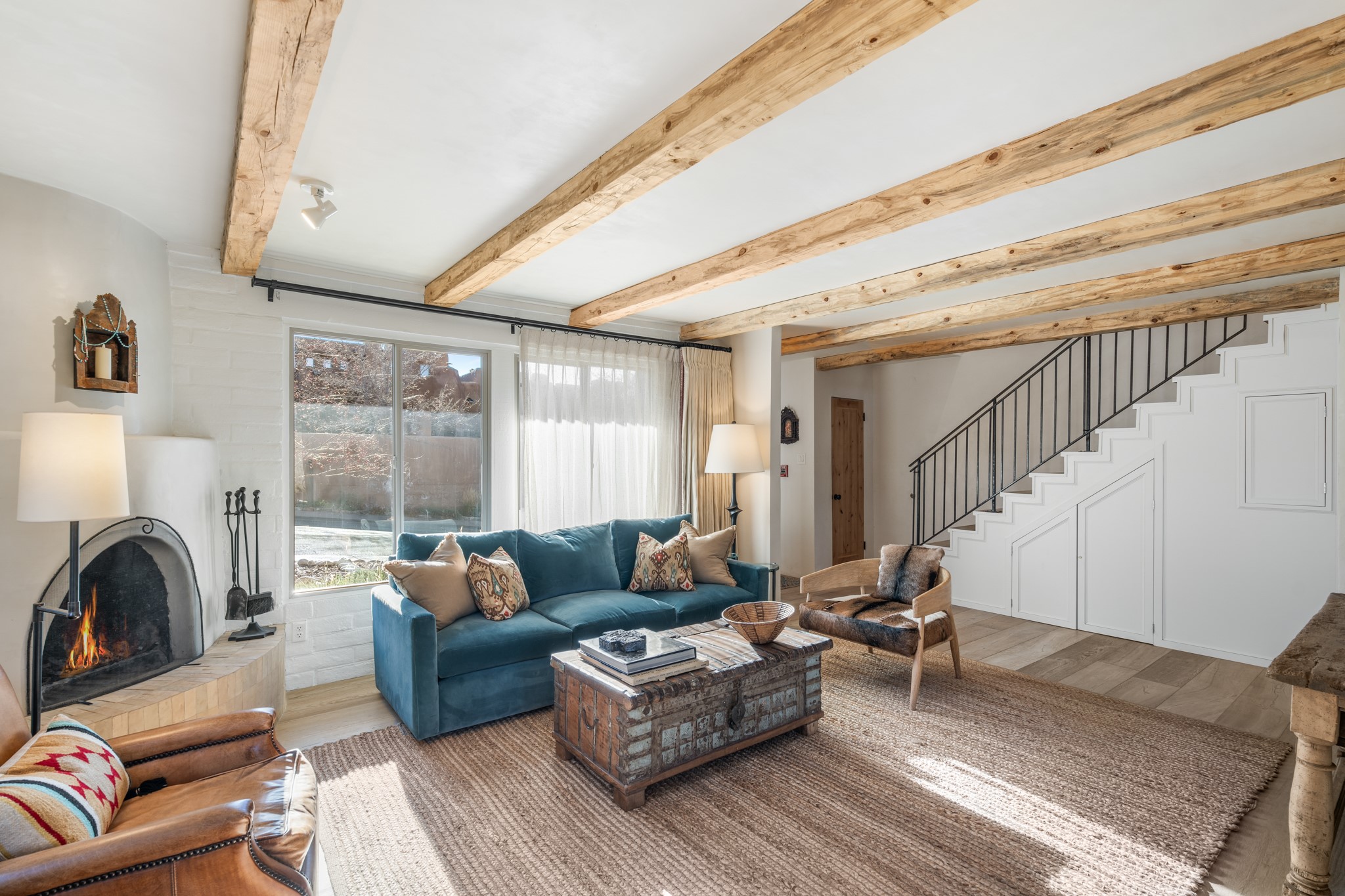 Every detail has been thoughtfully curated in this complete professional renovation. The home features engineered wood flooring, hand-troweled plaster walls throughout, custom solid wood doors, and new wood beams added to both levels for authentic Santa Fe warmth. The kitchen and half bath showcase new quartz countertops, custom cabinetry, paneled appliances, and modern fixtures. The kiva fireplace has been elegantly re-tiled, and new solar tubes illuminate the bathrooms and stairway.