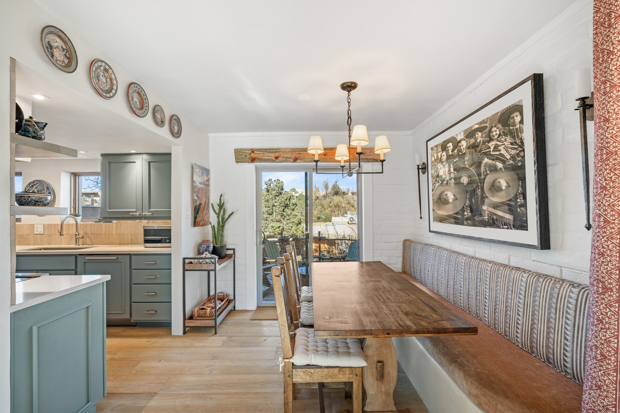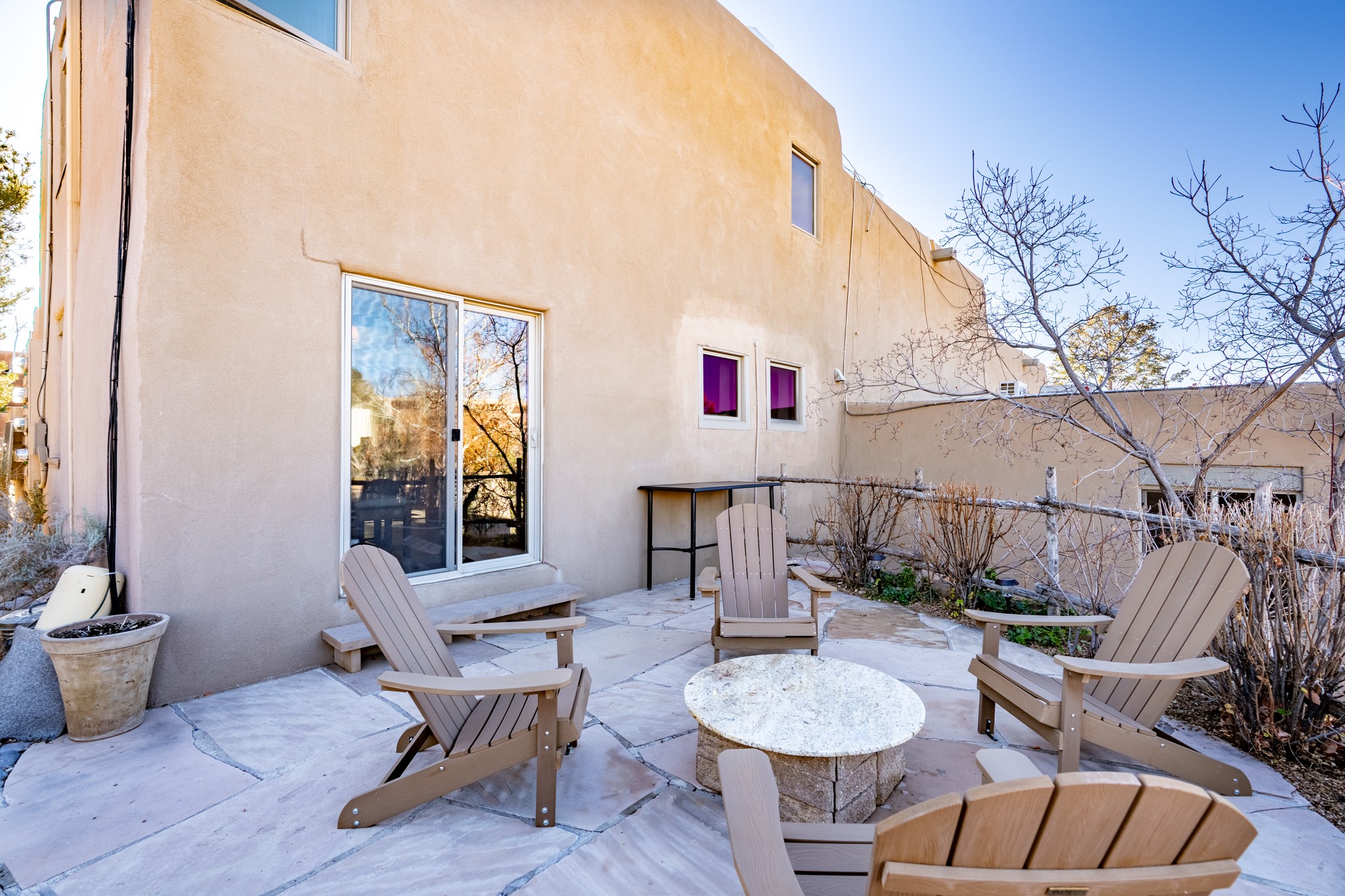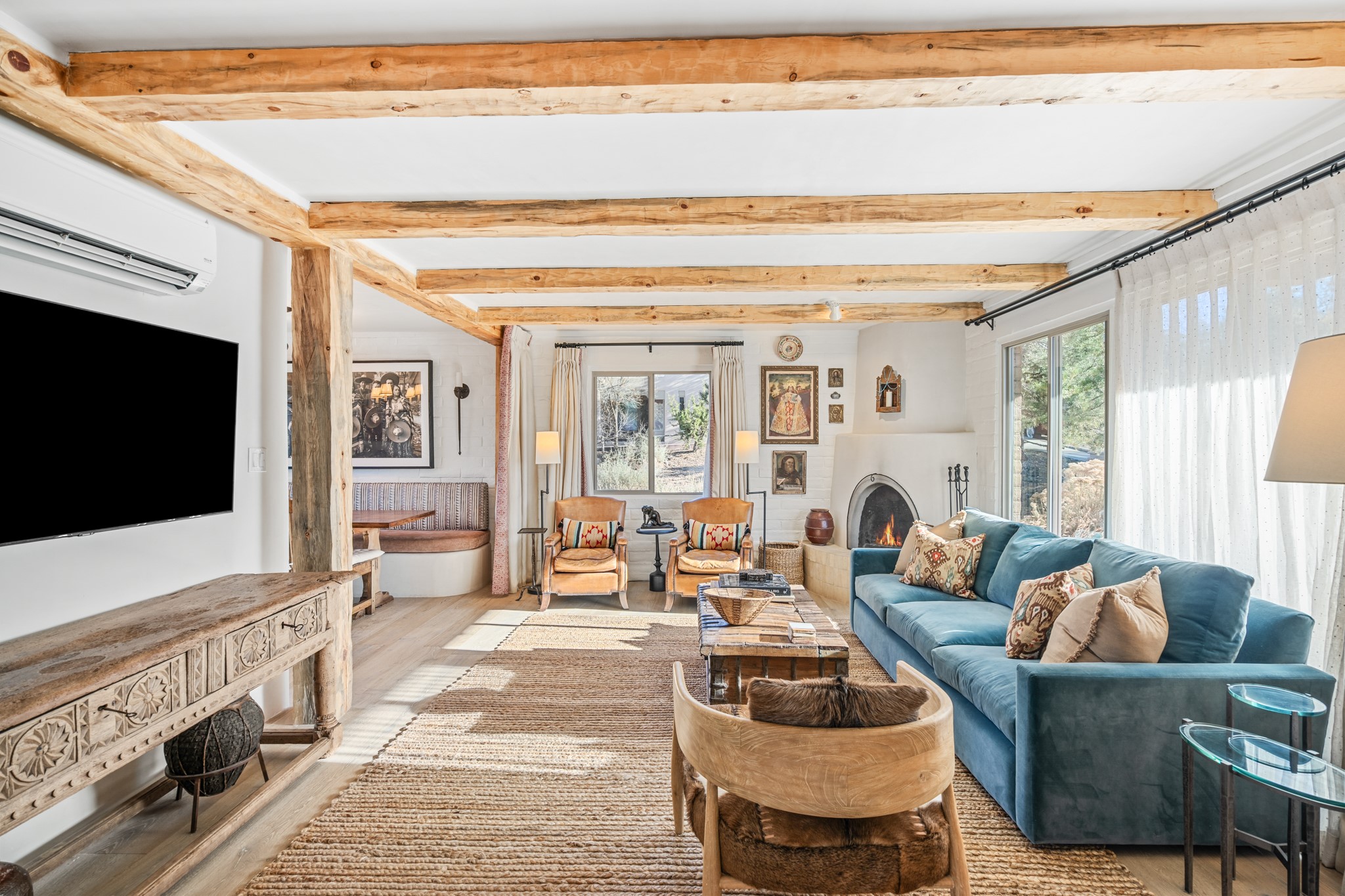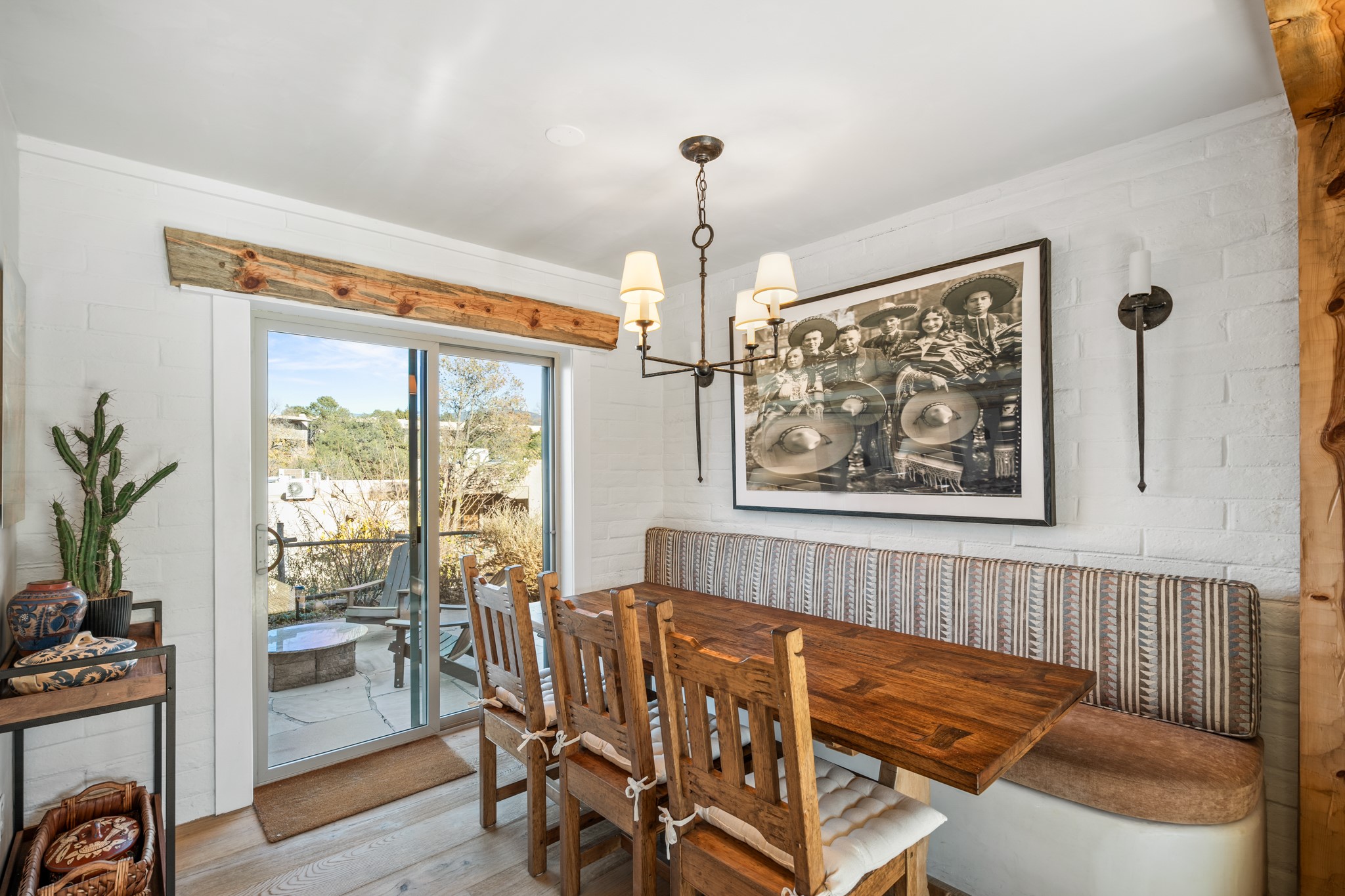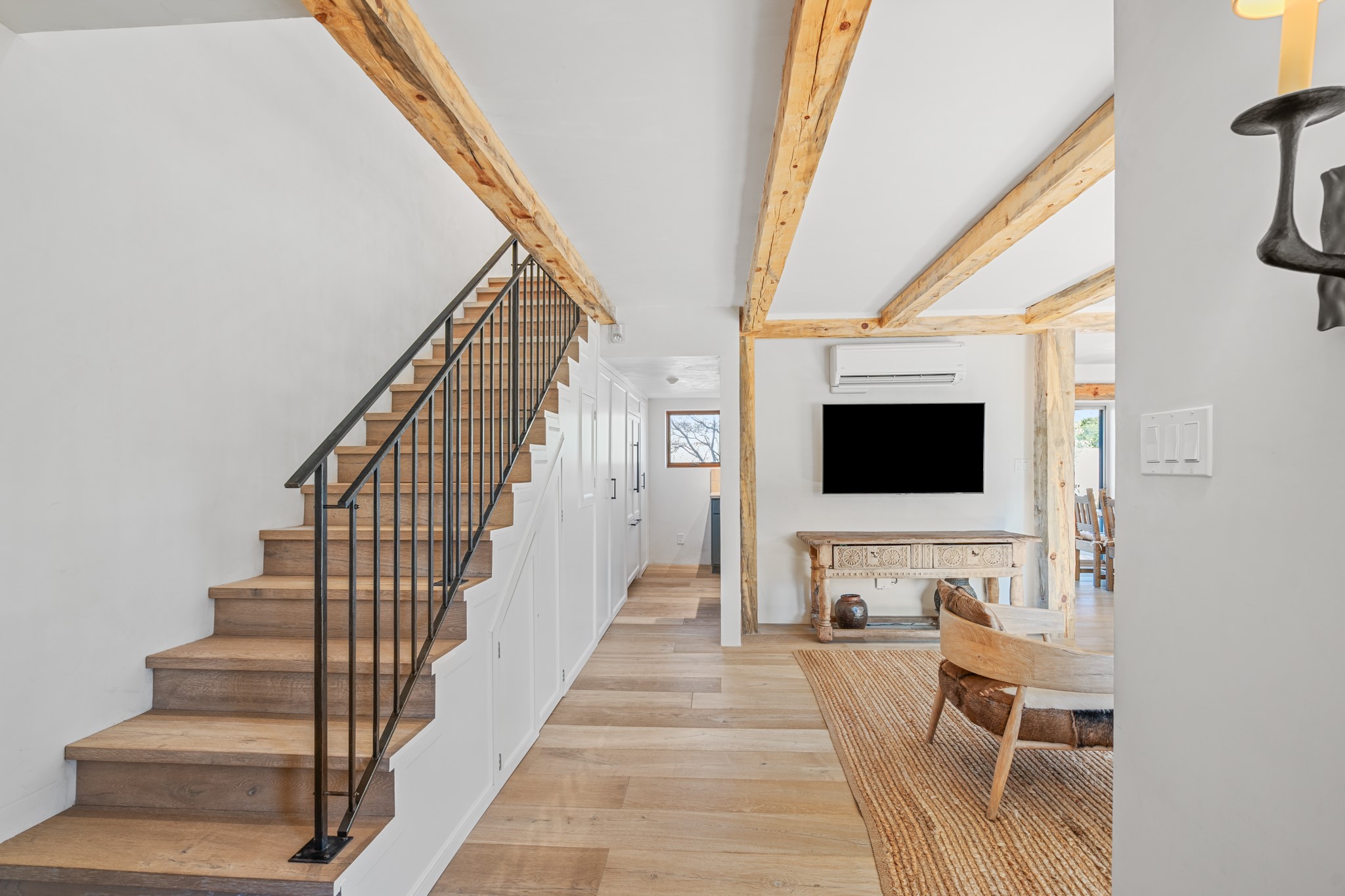Every detail has been thoughtfully curated in this complete professional renovation. The home features engineered wood flooring, hand-troweled plaster walls throughout, custom solid wood doors, and new wood beams added to both levels for authentic Santa Fe warmth. The kitchen and half bath showcase new quartz countertops, custom cabinetry, paneled appliances, and modern fixtures. The kiva fireplace has been elegantly re-tiled, and new solar tubes illuminate the bathrooms and stairway.