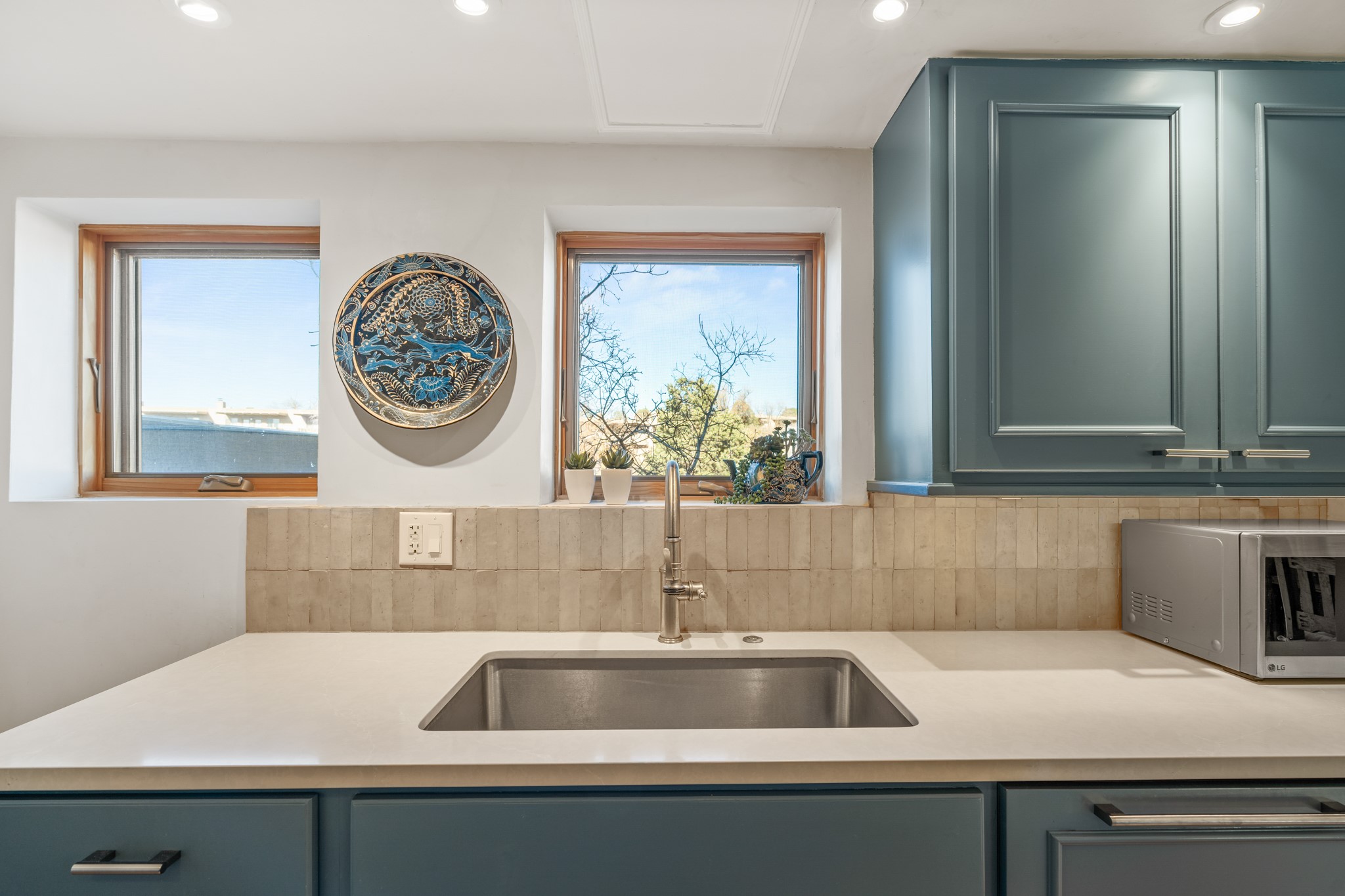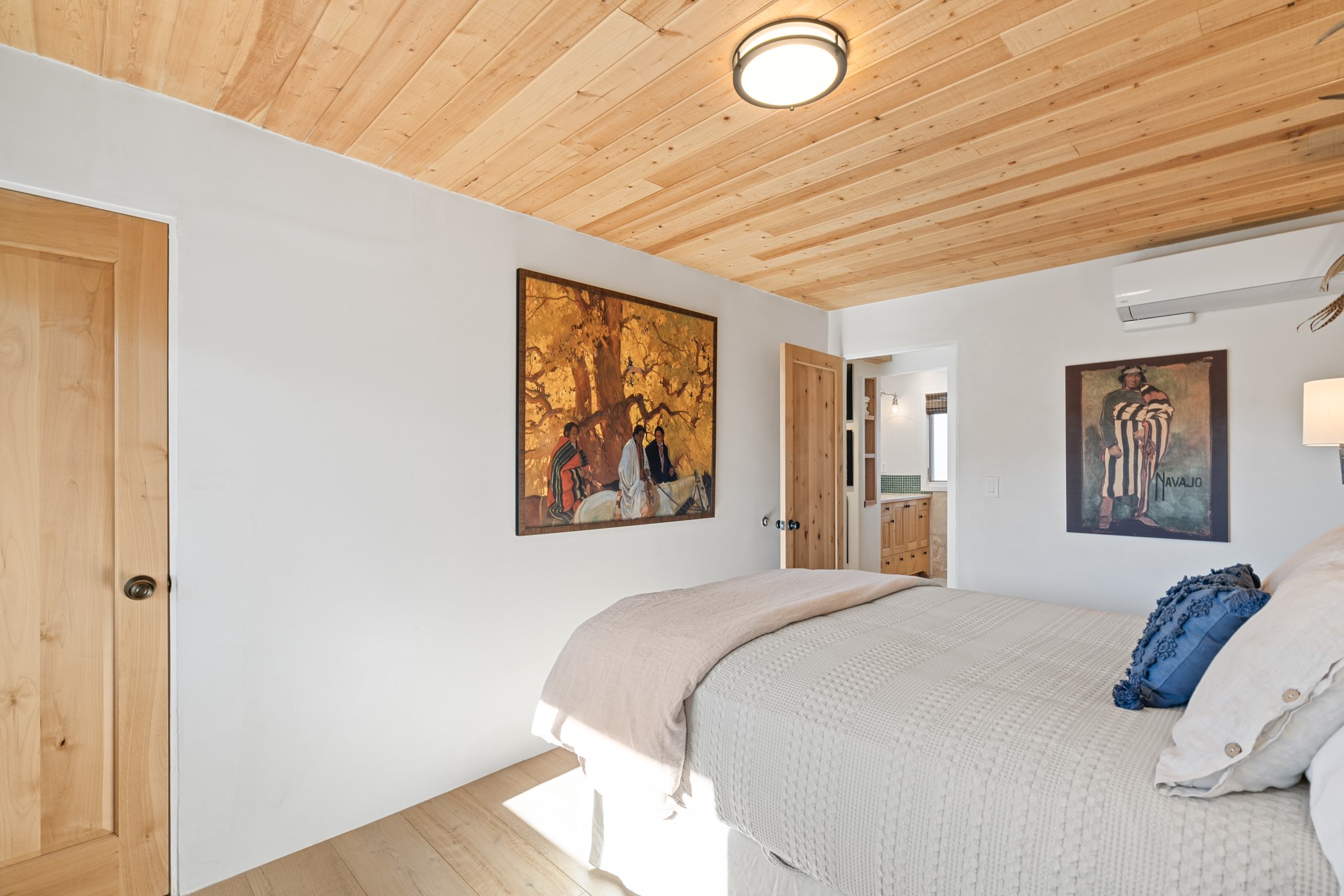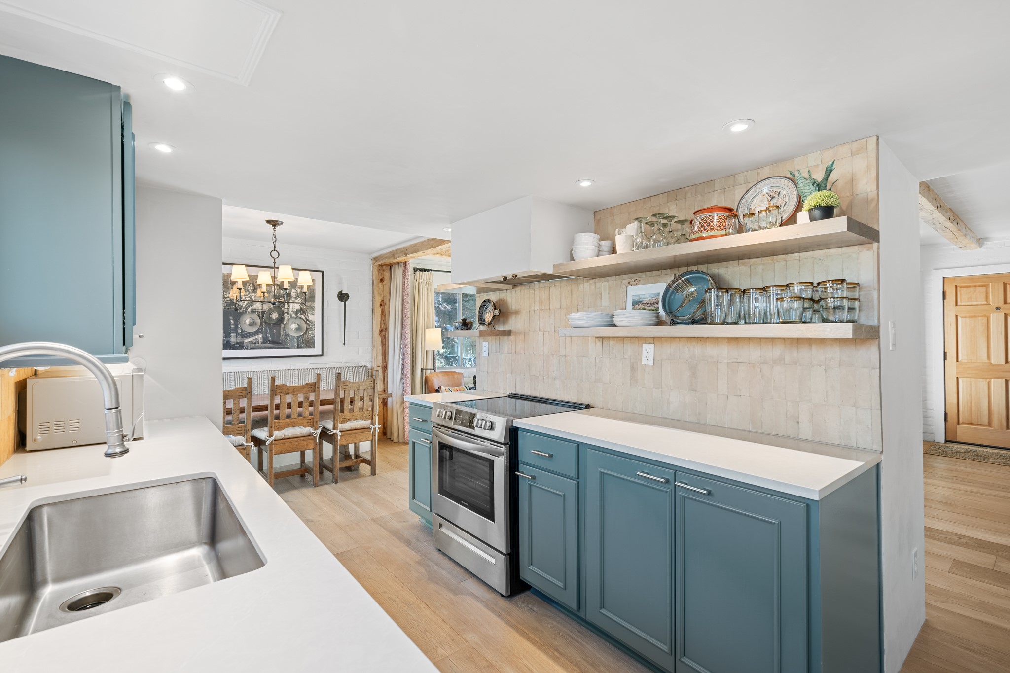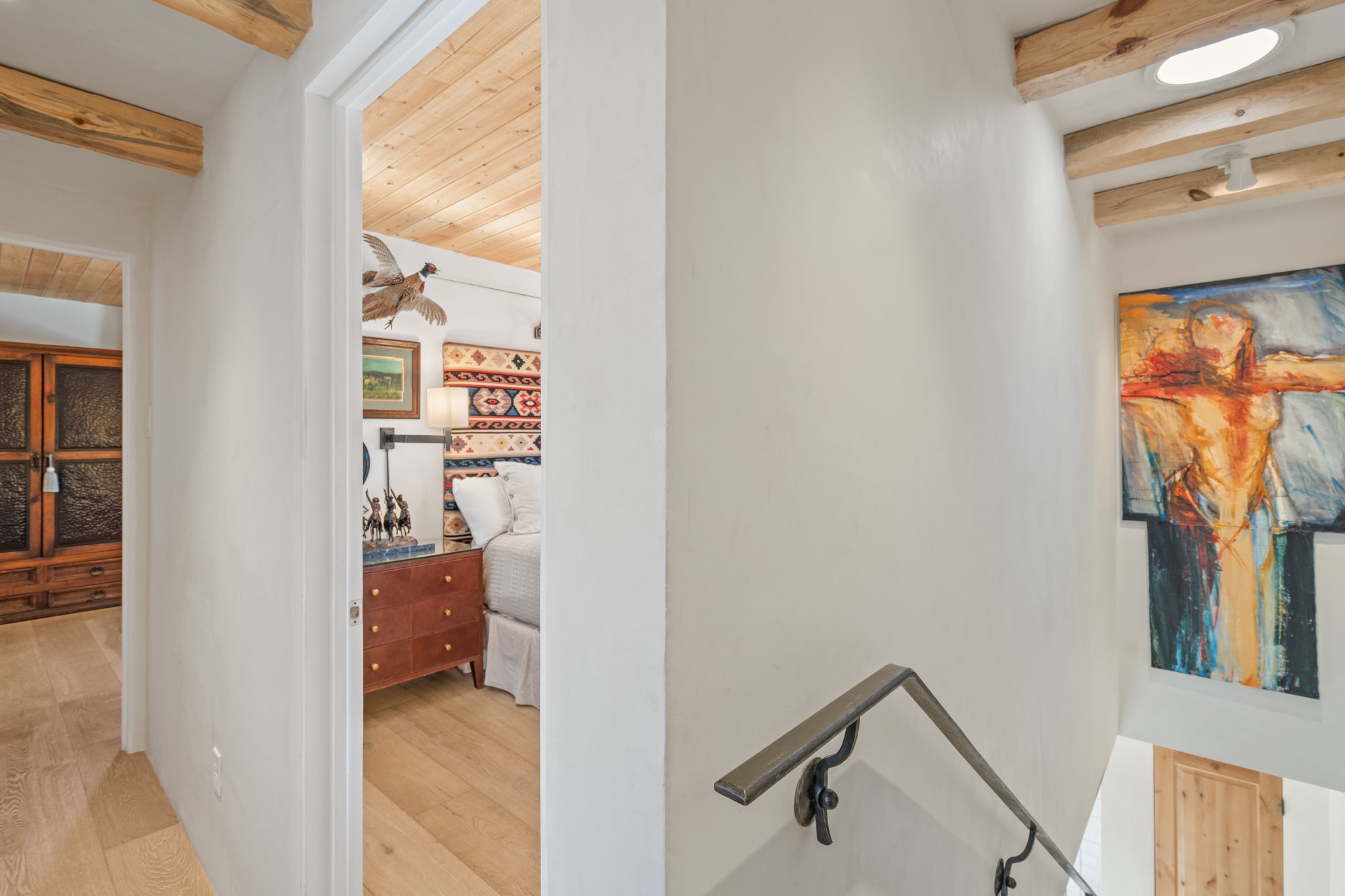 Every detail has been thoughtfully curated in this complete professional renovation. The home features engineered wood flooring, hand-troweled plaster walls throughout, custom solid wood doors, and new wood beams added to both levels for authentic Santa Fe warmth. The kitchen and half bath showcase new quartz countertops, custom cabinetry, paneled appliances, and modern fixtures. The kiva fireplace has been elegantly re-tiled, and new solar tubes illuminate the bathrooms and stairway.