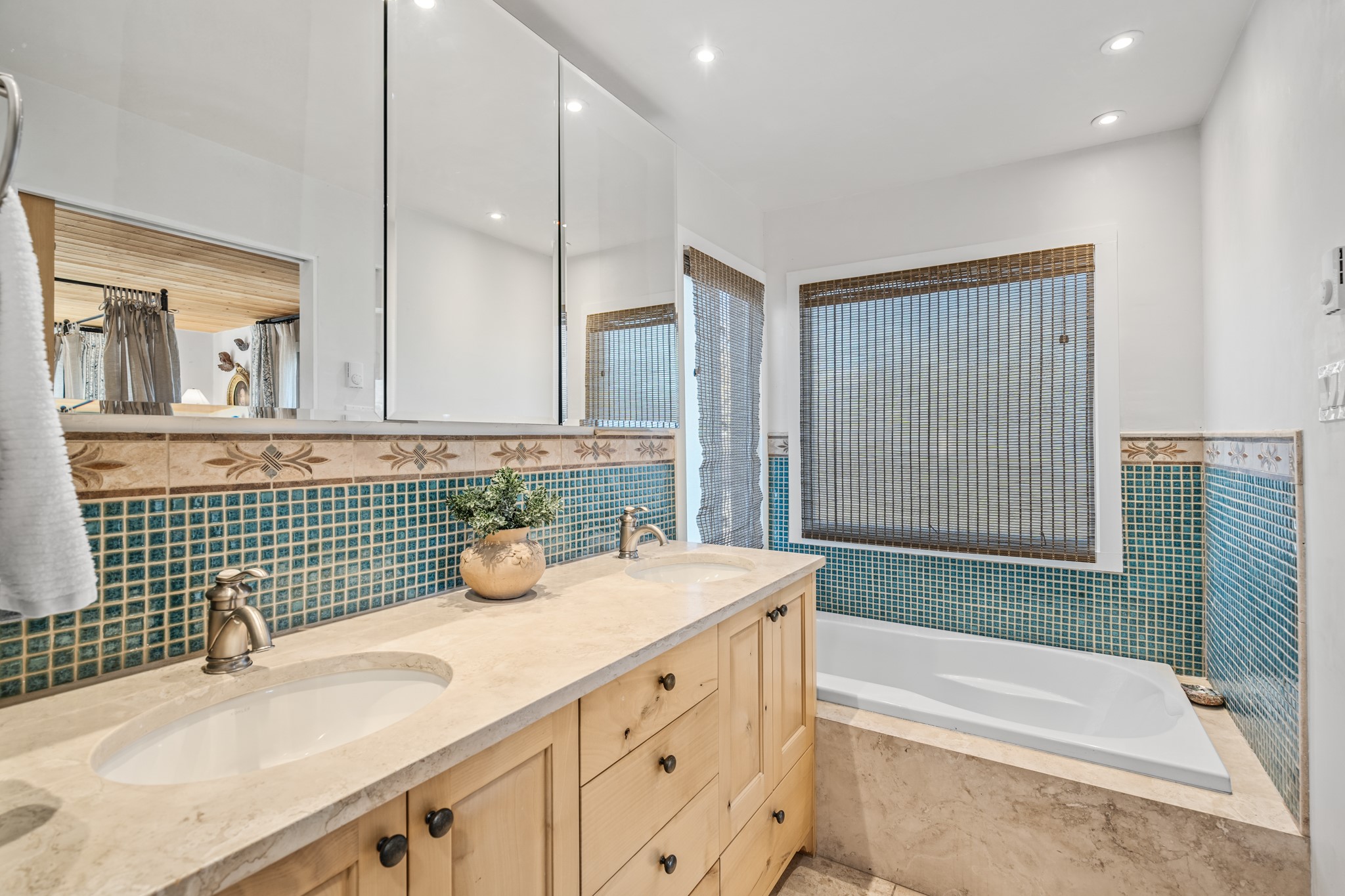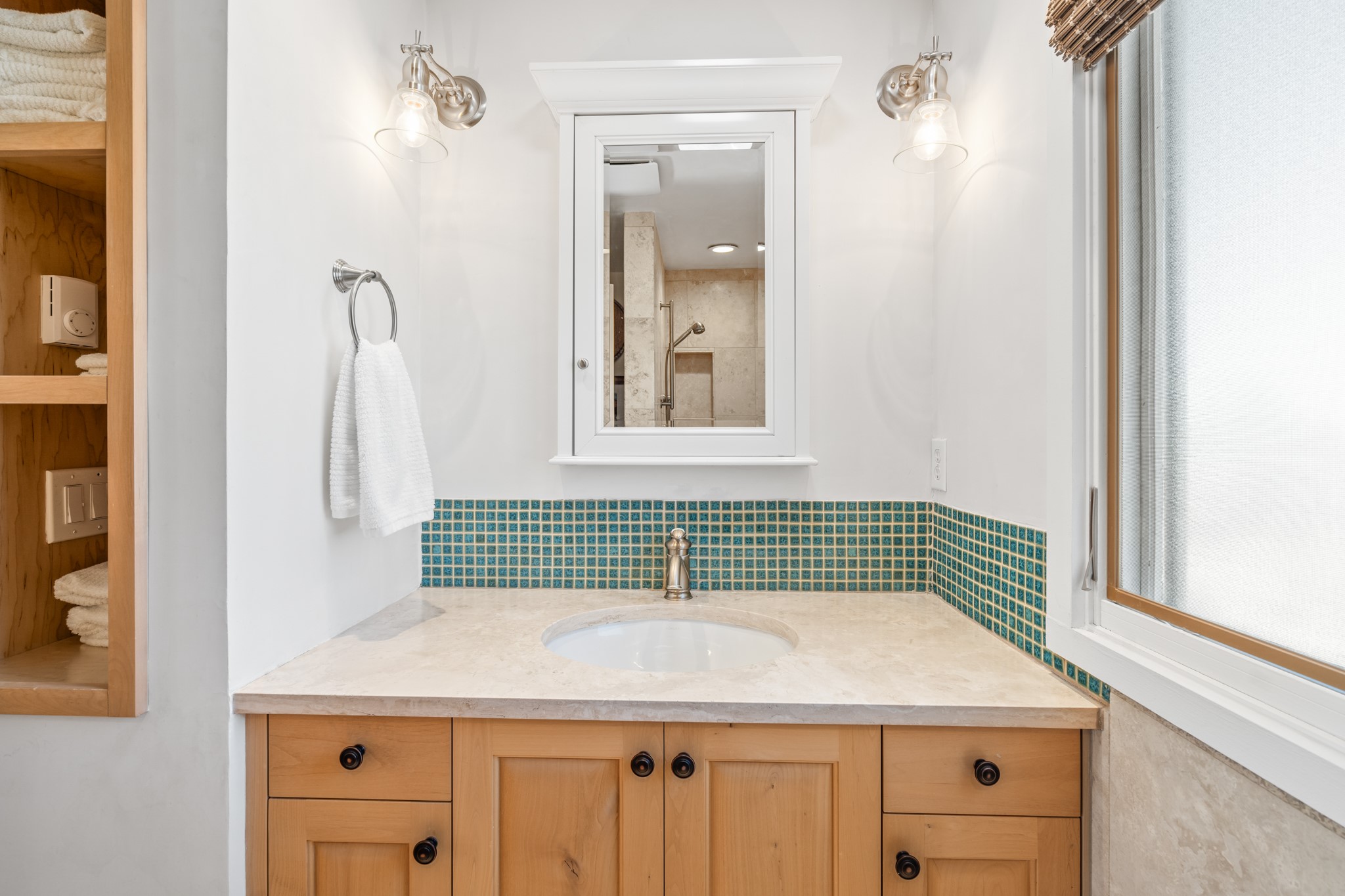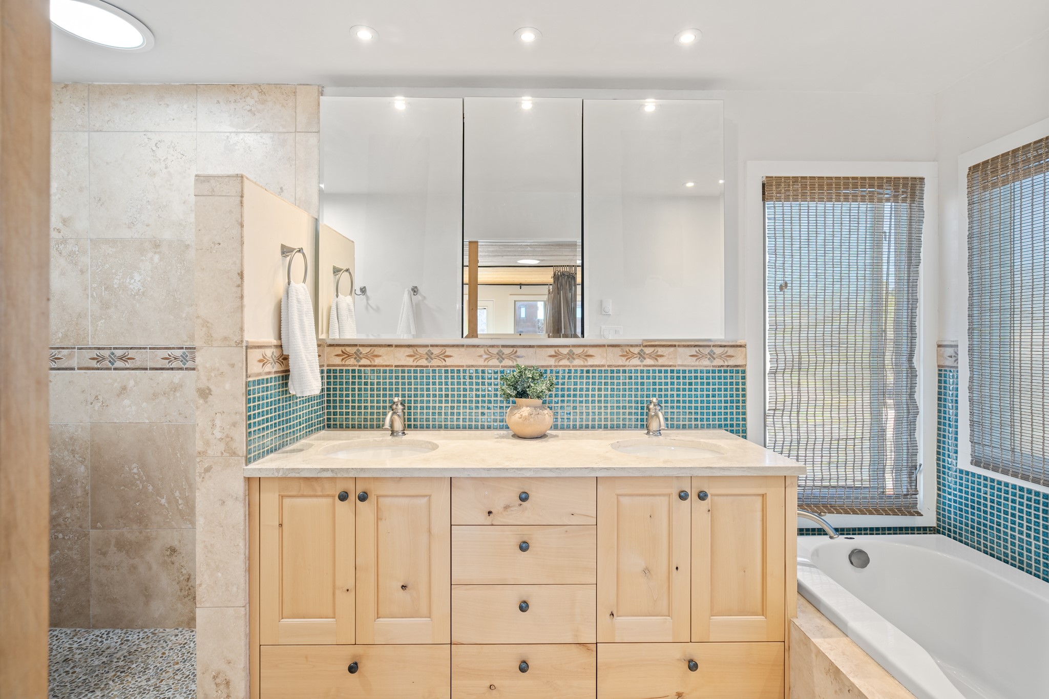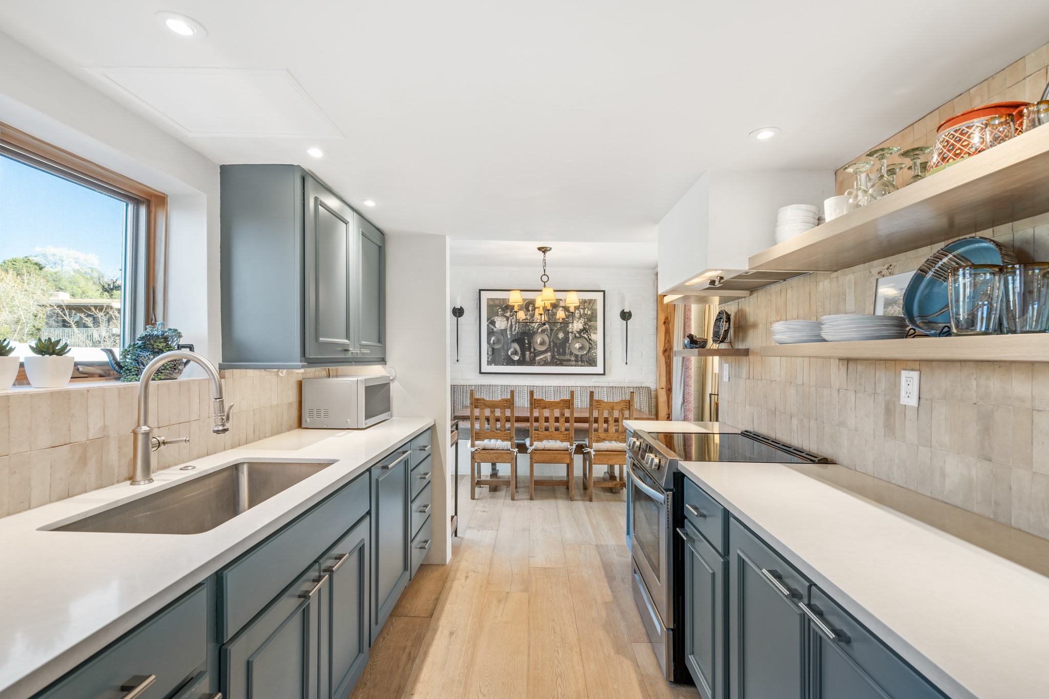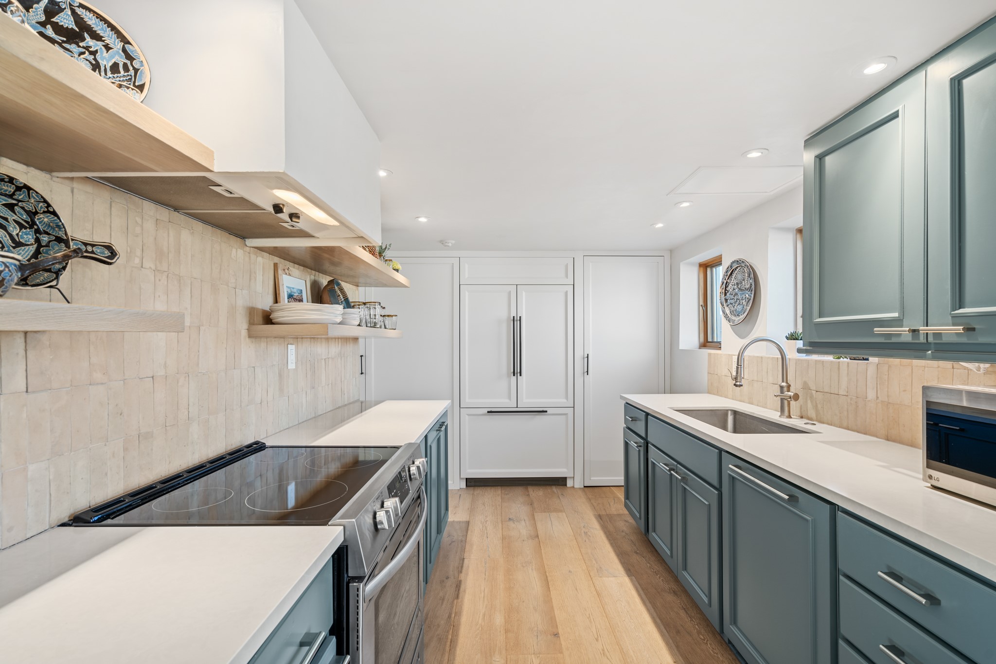 Every detail has been thoughtfully curated in this complete professional renovation. The home features engineered wood flooring, hand-troweled plaster walls throughout, custom solid wood doors, and new wood beams added to both levels for authentic Santa Fe warmth. The kitchen and half bath showcase new quartz countertops, custom cabinetry, paneled appliances, and modern fixtures. The kiva fireplace has been elegantly re-tiled, and new solar tubes illuminate the bathrooms and stairway.