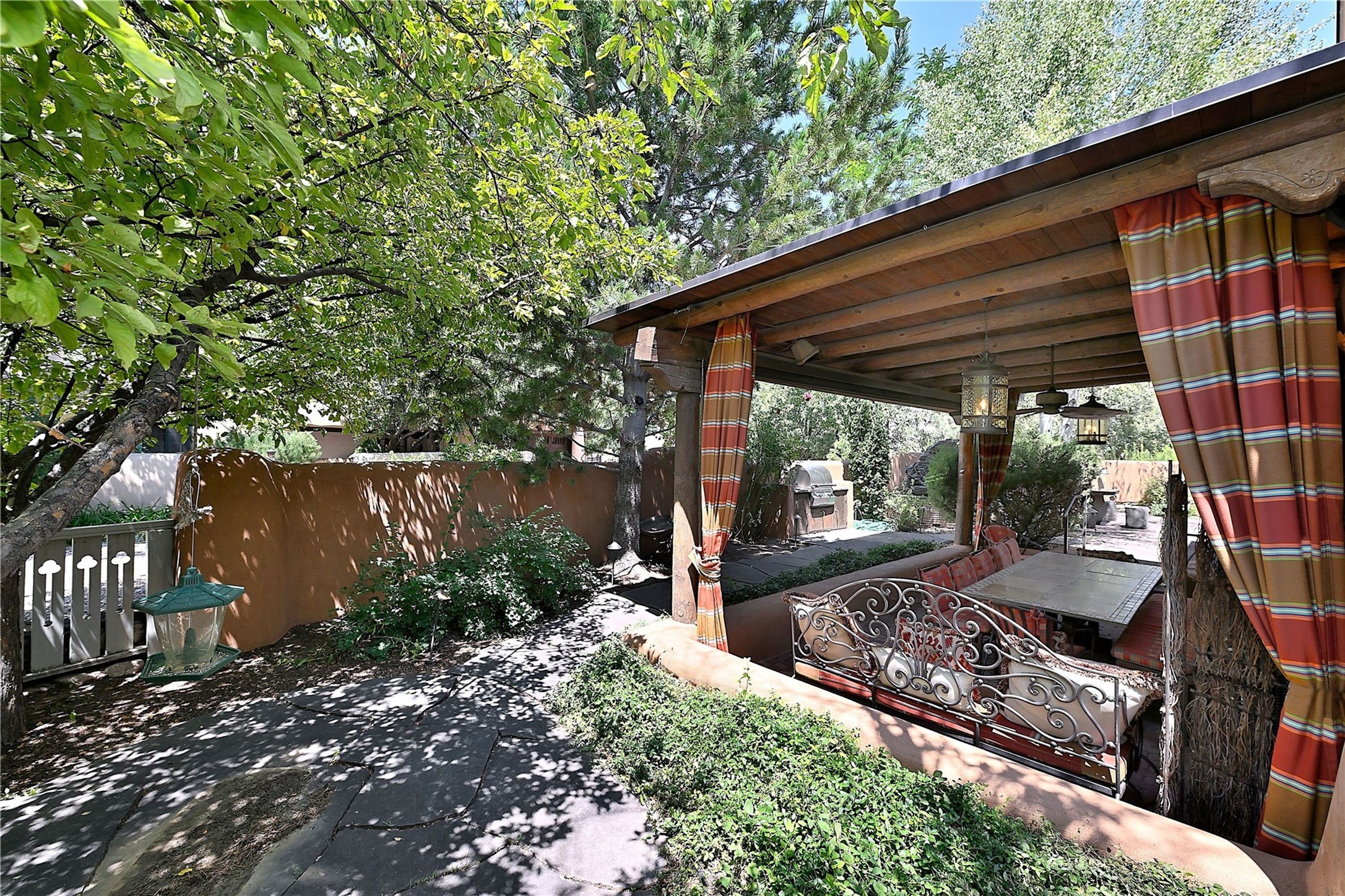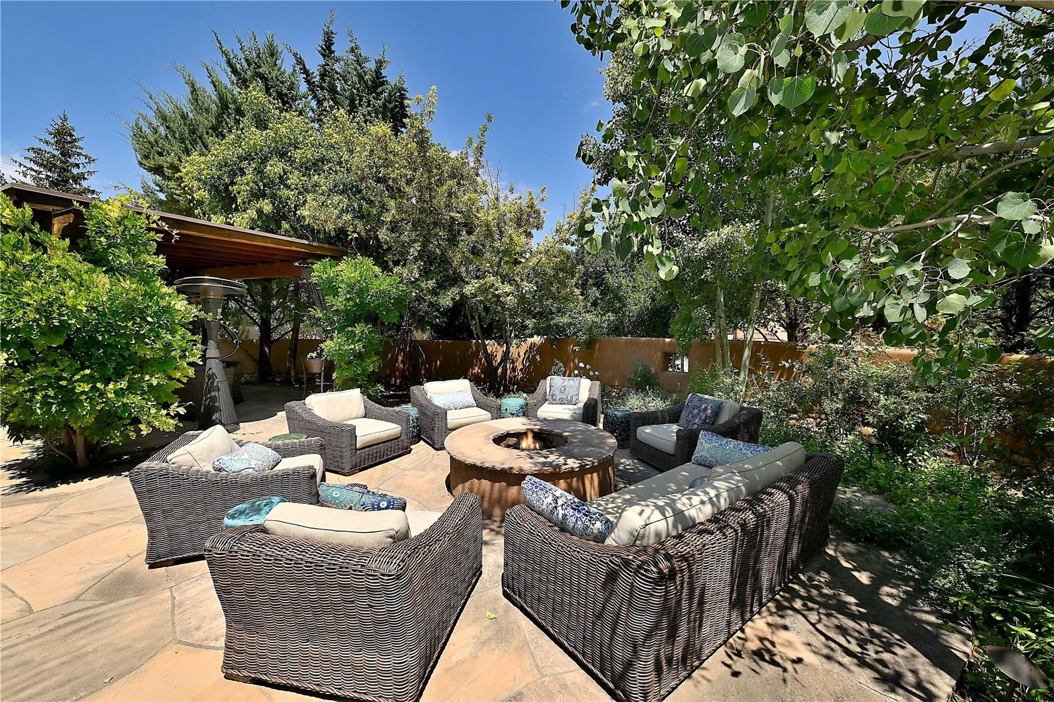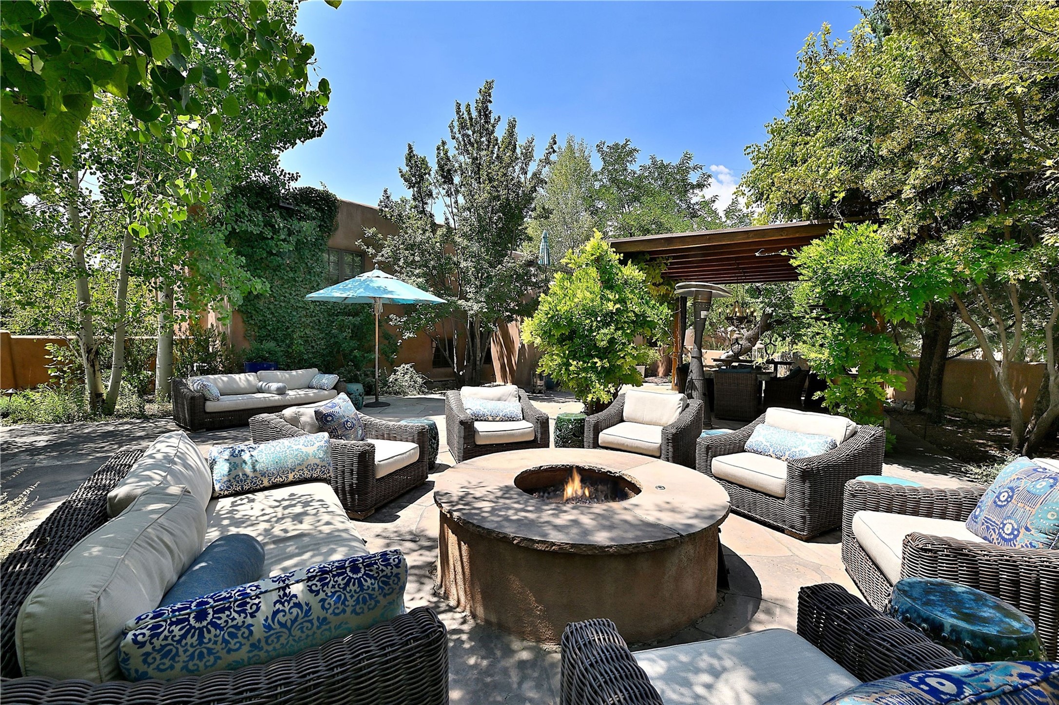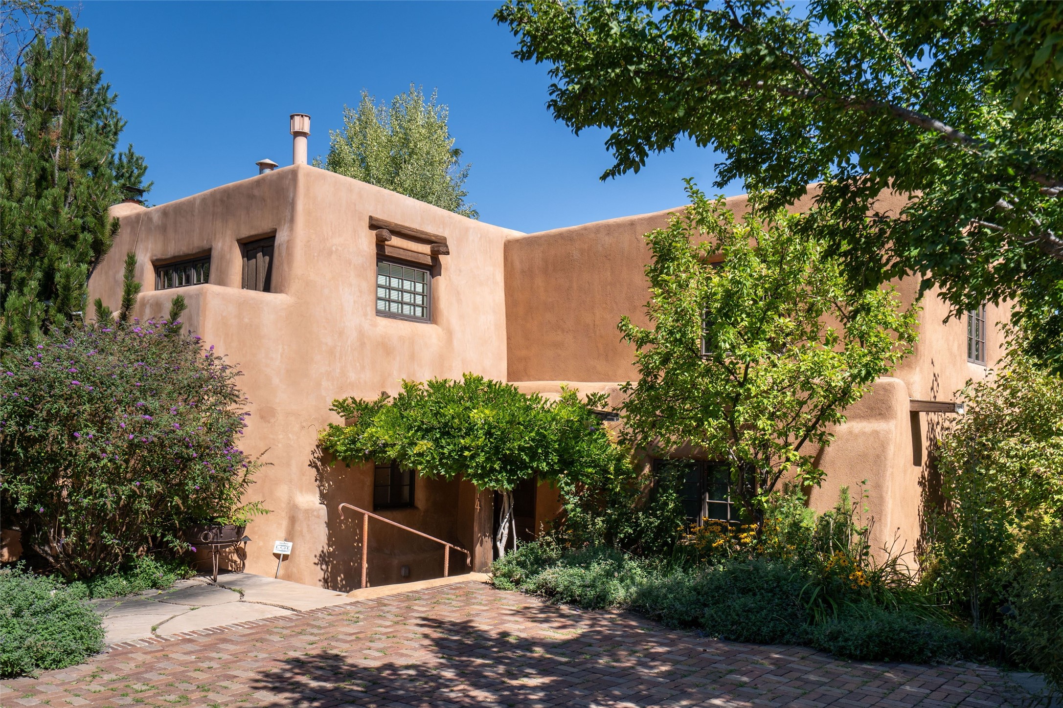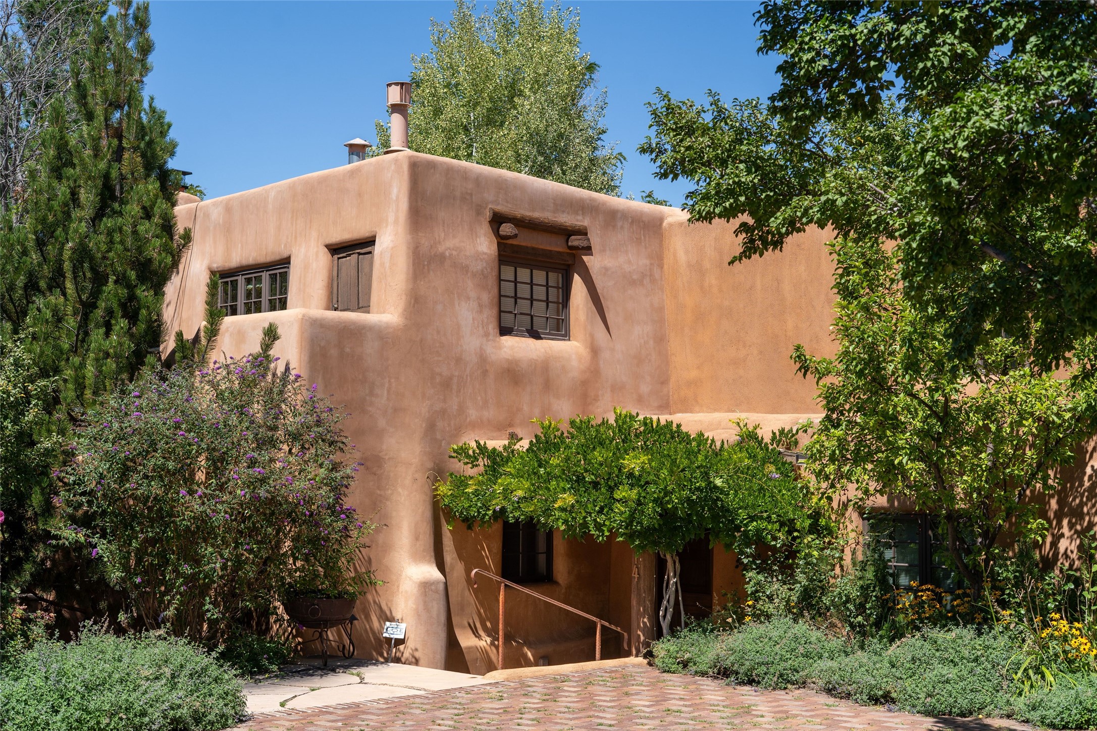 Historic Eastside Plaza Chamisal home on two development rights double lot creating an extra-large property that offers not one, but two breathtaking, lush entertainment areas that are simply irresistible for vibrant gatherings and luxurious living. This 3 bedroom, 3 bath residence, originally constructed in the 1930s by the legendary aviatrix Katherine Stinson Otero, turned architect, has undergone a breathtaking transformation. With an award-winning remodel completed in 2004 by the talented Lloyd Martinez of Sage Builders and architect Wayne Lloyd, this once humble carriage house is now a rare jewel. The custom kitchen features a hooded Wolf range with mosaic tile backsplash and gas kiva fireplace. The spacious primary suite with walk out to a rooftop deck and a large ensuite with soaking tub and kiva fireplace, is a year-round retreat. The third bedroom provides flexibility for office or workout space. Exquisite details throughout reflect the craftsmanship of master artisans, including Venetian plaster finish walls, wood floors, stunning mosaic tile stair risers, vigas, and carved wood accents. Exterior spaces extend living to the outdoors with two large, verdant entertainment spaces, multiple seating areas, fire pit, and 2 fountains, perfect for hosting gatherings or simply enjoying the serenity of your surroundings. Newer roof (2022), rooftop deck rebuilt and refinished in 2025 and two dedicated parking spots. Rare opportunity to own a piece of history in Santa Fe