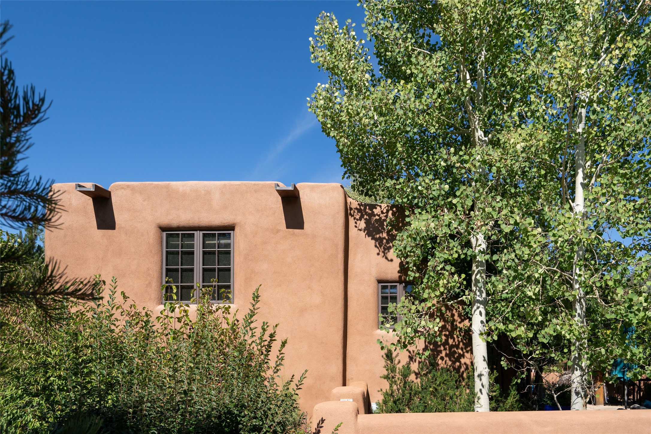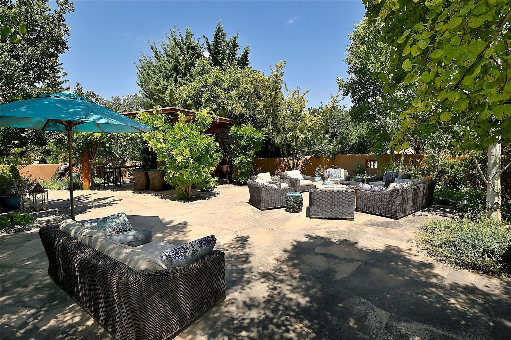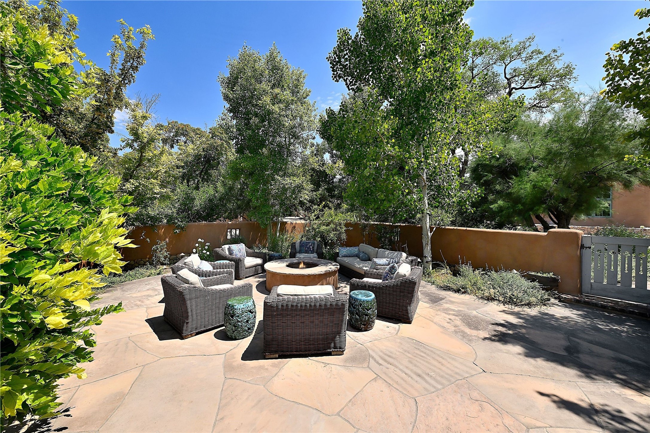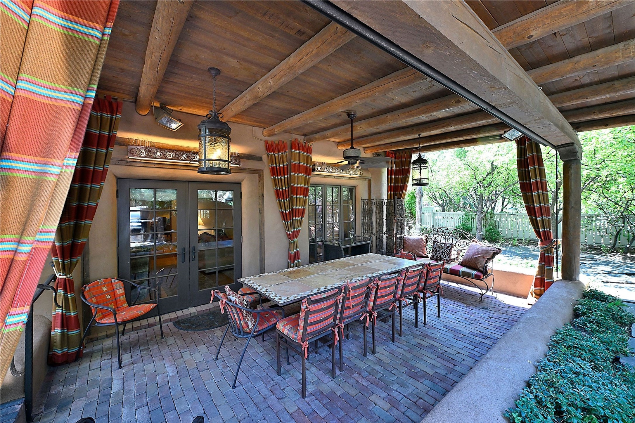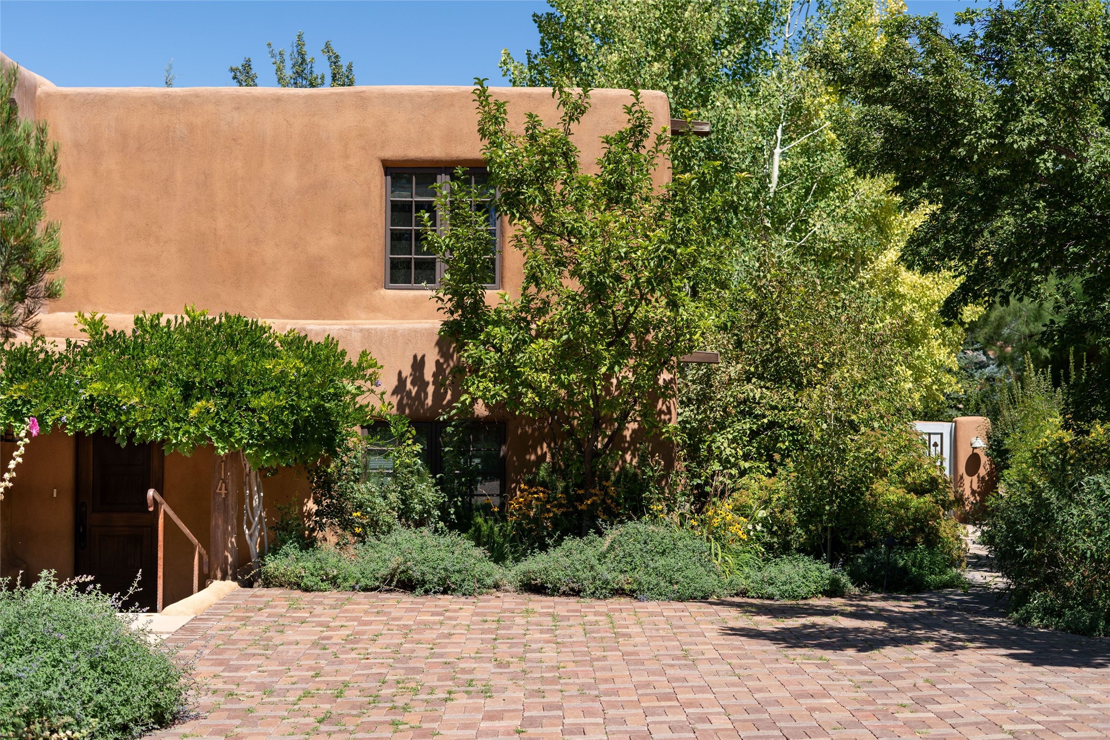 Historic Eastside Plaza Chamisal home on two development rights double lot creating an extra-large property that offers not one, but two breathtaking, lush entertainment areas that are simply irresistible for vibrant gatherings and luxurious living. This 3 bedroom, 3 bath residence, originally constructed in the 1930s by the legendary aviatrix Katherine Stinson Otero, turned architect, has undergone a breathtaking transformation. With an award-winning remodel completed in 2004 by the talented Lloyd Martinez of Sage Builders and architect Wayne Lloyd, this once humble carriage house is now a rare jewel. The custom kitchen features a hooded Wolf range with mosaic tile backsplash and gas kiva fireplace. The spacious primary suite with walk out to a rooftop deck and a large ensuite with soaking tub and kiva fireplace, is a year-round retreat. The third bedroom provides flexibility for office or workout space. Exquisite details throughout reflect the craftsmanship of master artisans, including Venetian plaster finish walls, wood floors, stunning mosaic tile stair risers, vigas, and carved wood accents. Exterior spaces extend living to the outdoors with two large, verdant entertainment spaces, multiple seating areas, fire pit, and 2 fountains, perfect for hosting gatherings or simply enjoying the serenity of your surroundings. Newer roof (2022), rooftop deck rebuilt and refinished in 2025 and two dedicated parking spots. Rare opportunity to own a piece of history in Santa Fe