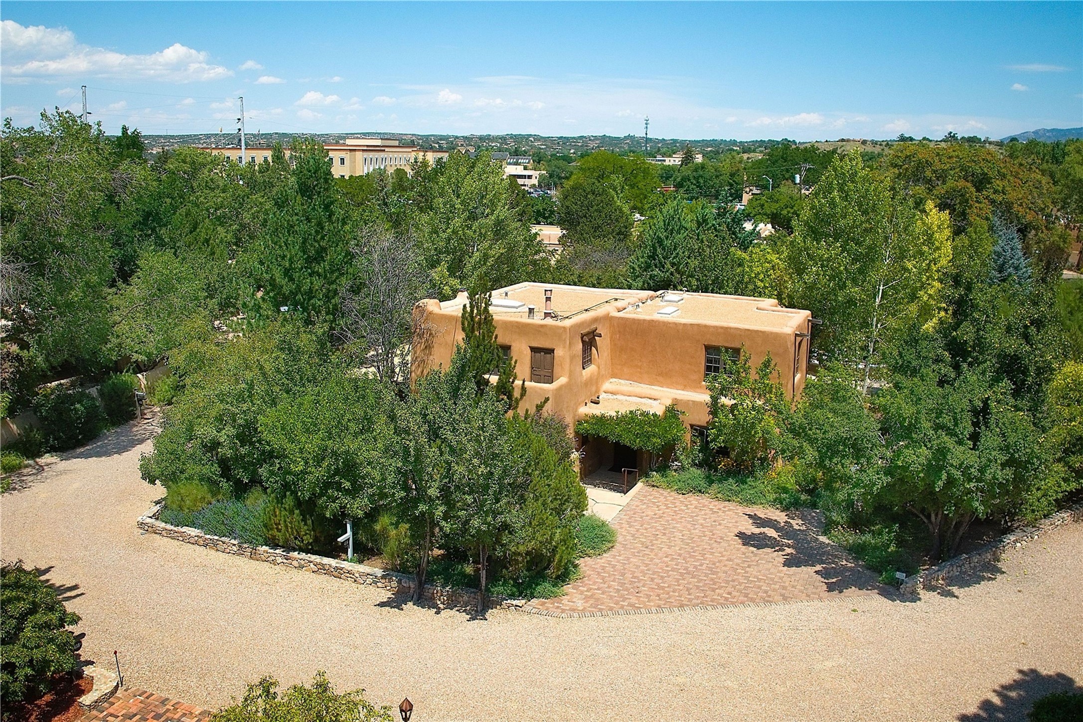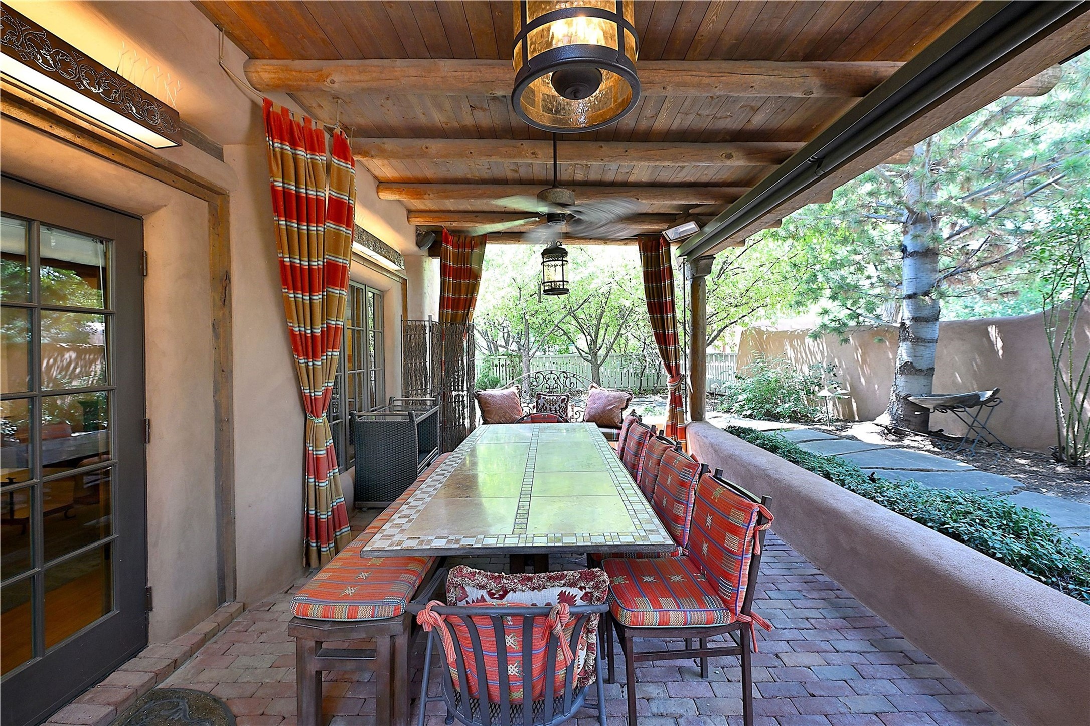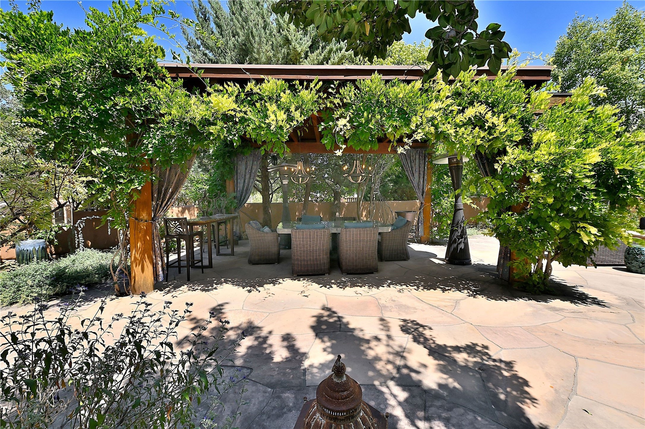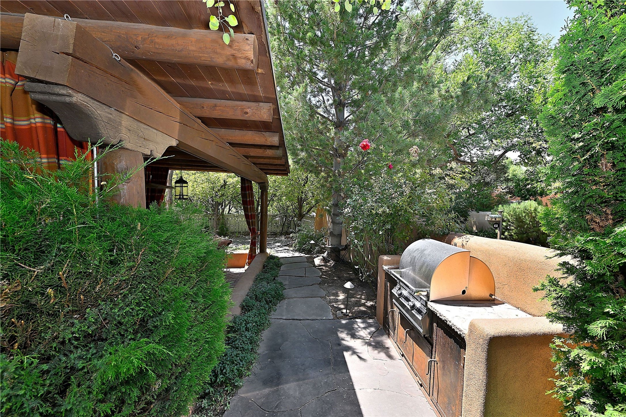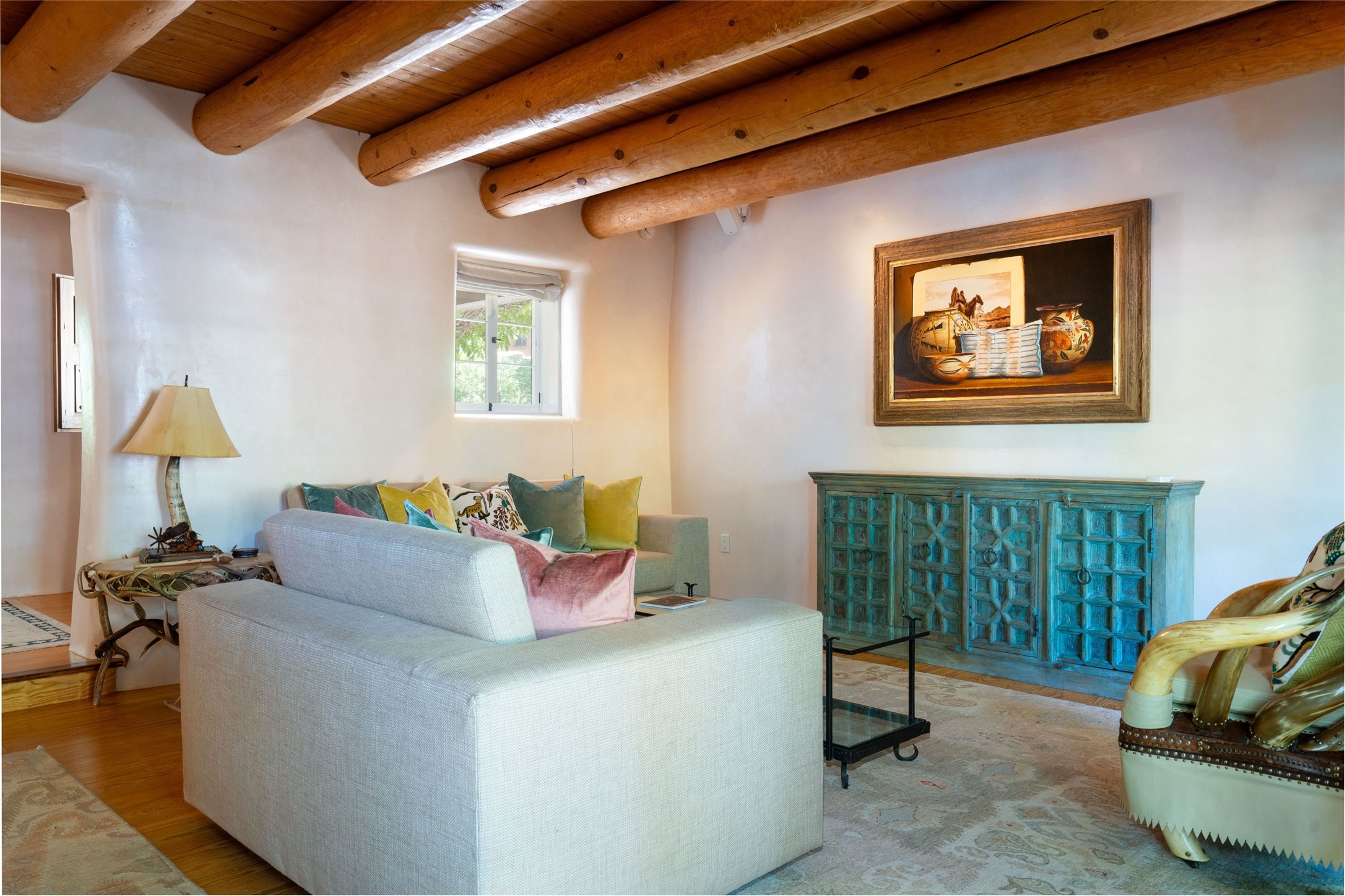 Historic Eastside Plaza Chamisal home on two development rights double lot creating an extra-large property that offers not one, but two breathtaking, lush entertainment areas that are simply irresistible for vibrant gatherings and luxurious living. This 3 bedroom, 3 bath residence, originally constructed in the 1930s by the legendary aviatrix Katherine Stinson Otero, turned architect, has undergone a breathtaking transformation. With an award-winning remodel completed in 2004 by the talented Lloyd Martinez of Sage Builders and architect Wayne Lloyd, this once humble carriage house is now a rare jewel. The custom kitchen features a hooded Wolf range with mosaic tile backsplash and gas kiva fireplace. The spacious primary suite with walk out to a rooftop deck and a large ensuite with soaking tub and kiva fireplace, is a year-round retreat. The third bedroom provides flexibility for office or workout space. Exquisite details throughout reflect the craftsmanship of master artisans, including Venetian plaster finish walls, wood floors, stunning mosaic tile stair risers, vigas, and carved wood accents. Exterior spaces extend living to the outdoors with two large, verdant entertainment spaces, multiple seating areas, fire pit, and 2 fountains, perfect for hosting gatherings or simply enjoying the serenity of your surroundings. Newer roof (2022), rooftop deck rebuilt and refinished in 2025 and two dedicated parking spots. Rare opportunity to own a piece of history in Santa Fe