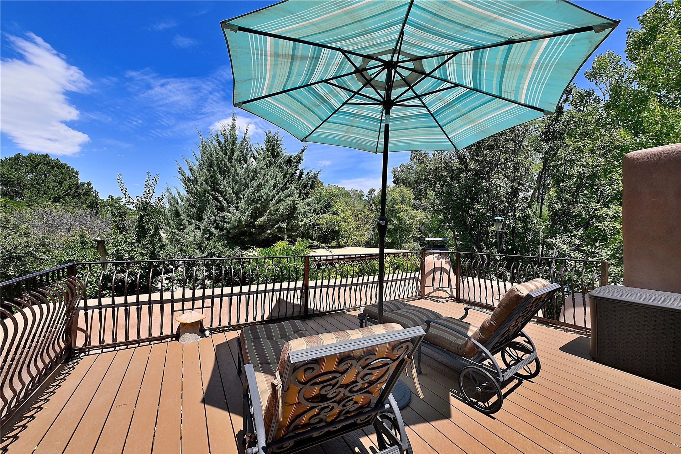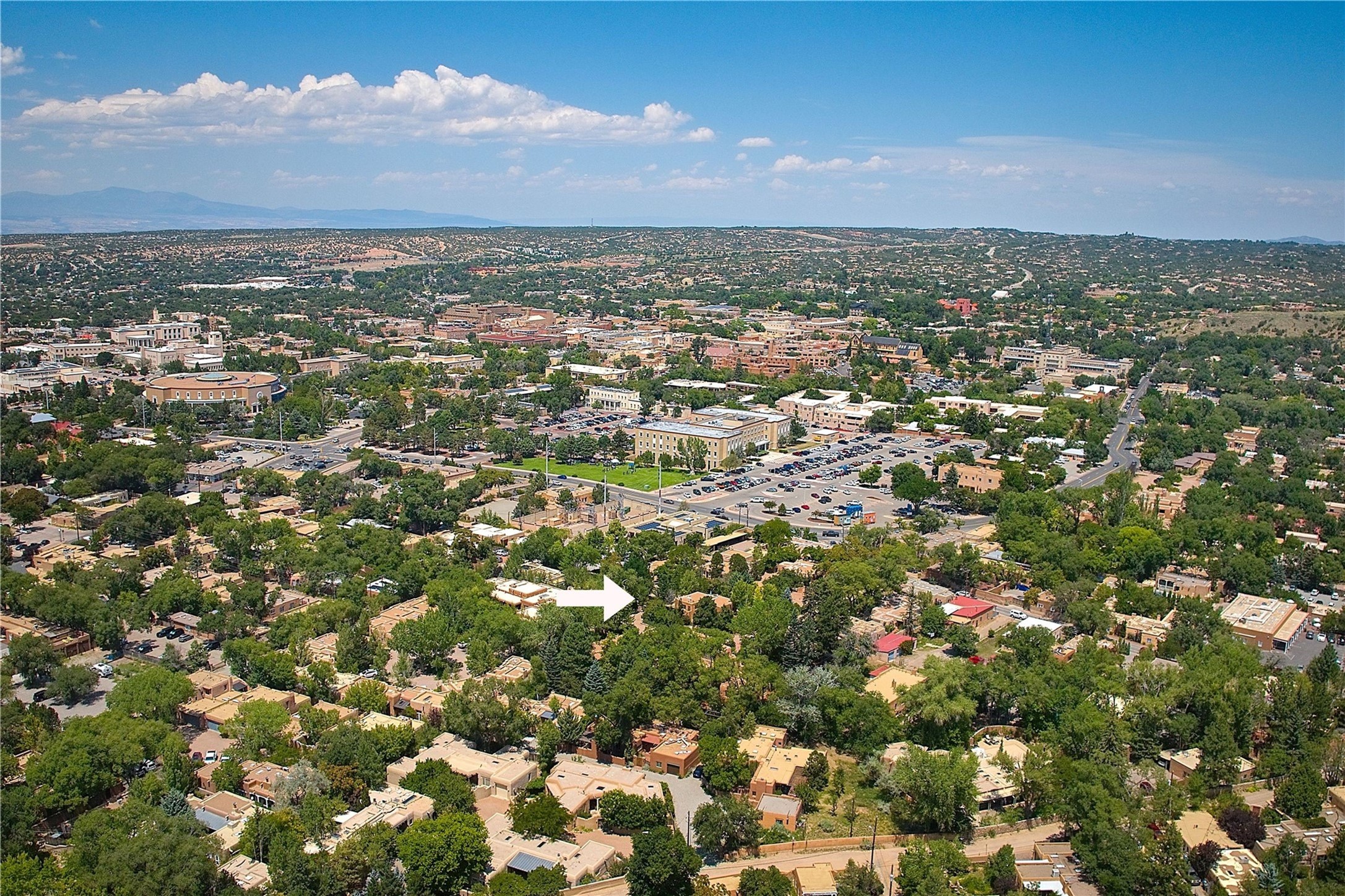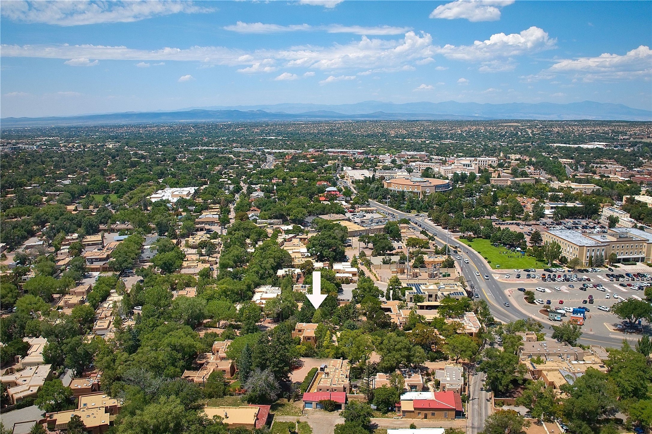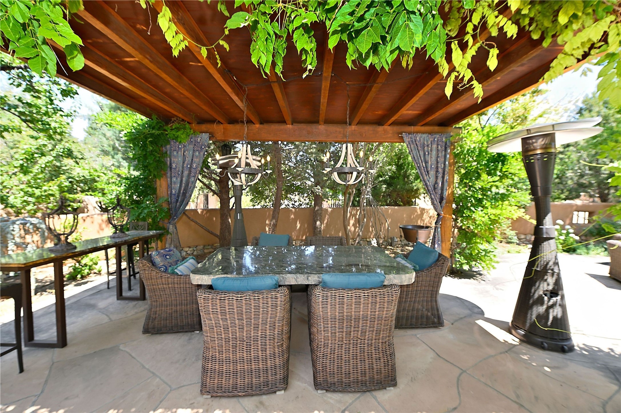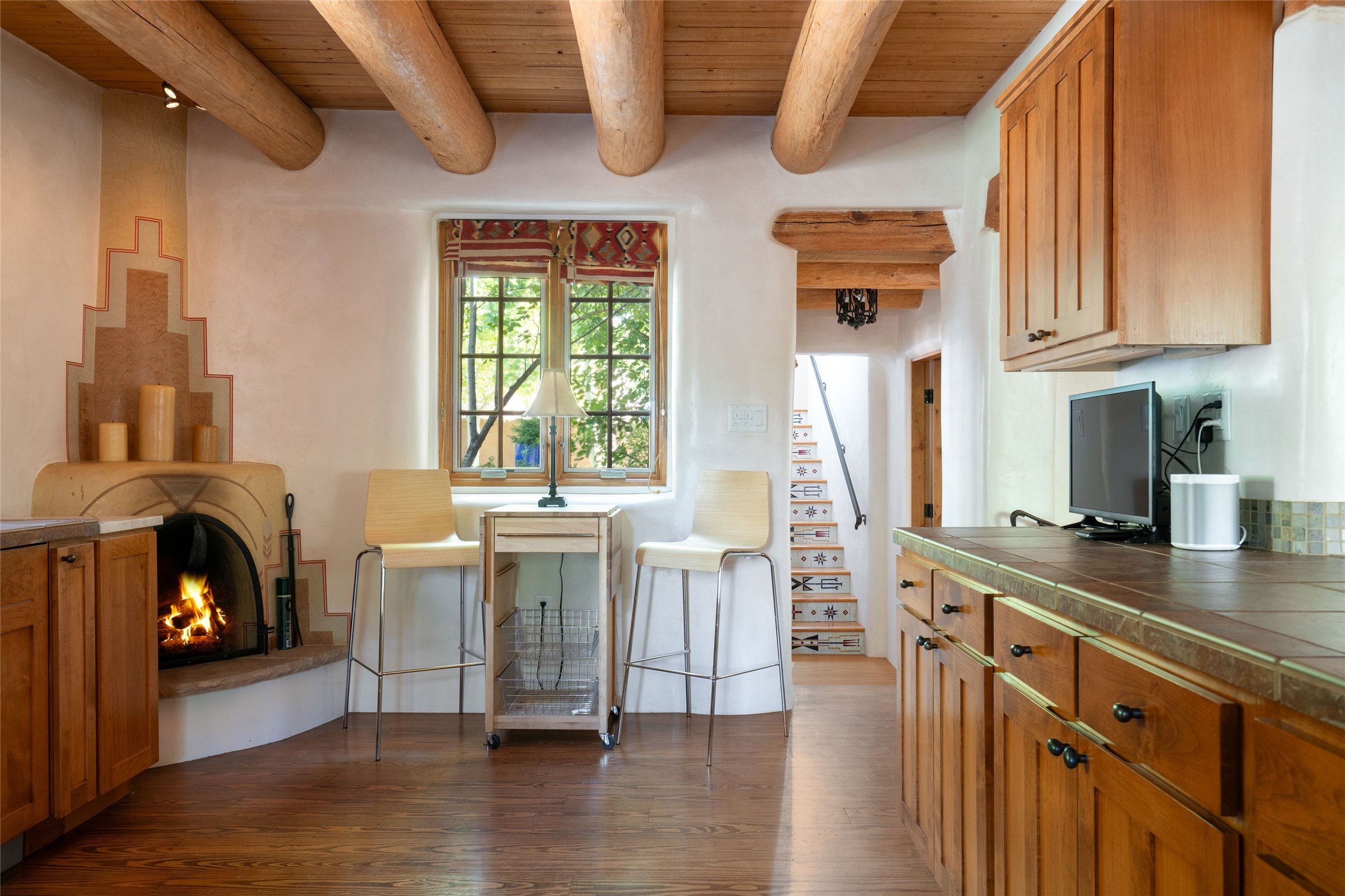 Historic Eastside Plaza Chamisal home on two development rights double lot creating an extra-large property that offers not one, but two breathtaking, lush entertainment areas that are simply irresistible for vibrant gatherings and luxurious living. This 3 bedroom, 3 bath residence, originally constructed in the 1930s by the legendary aviatrix Katherine Stinson Otero, turned architect, has undergone a breathtaking transformation. With an award-winning remodel completed in 2004 by the talented Lloyd Martinez of Sage Builders and architect Wayne Lloyd, this once humble carriage house is now a rare jewel. The custom kitchen features a hooded Wolf range with mosaic tile backsplash and gas kiva fireplace. The spacious primary suite with walk out to a rooftop deck and a large ensuite with soaking tub and kiva fireplace, is a year-round retreat. The third bedroom provides flexibility for office or workout space. Exquisite details throughout reflect the craftsmanship of master artisans, including Venetian plaster finish walls, wood floors, stunning mosaic tile stair risers, vigas, and carved wood accents. Exterior spaces extend living to the outdoors with two large, verdant entertainment spaces, multiple seating areas, fire pit, and 2 fountains, perfect for hosting gatherings or simply enjoying the serenity of your surroundings. Newer roof (2022), rooftop deck rebuilt and refinished in 2025 and two dedicated parking spots. Rare opportunity to own a piece of history in Santa Fe