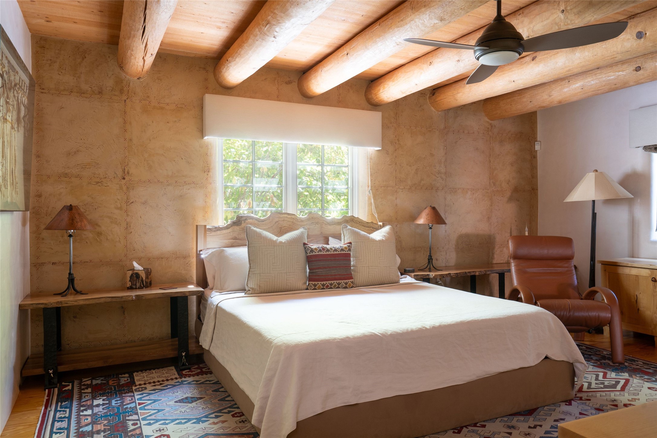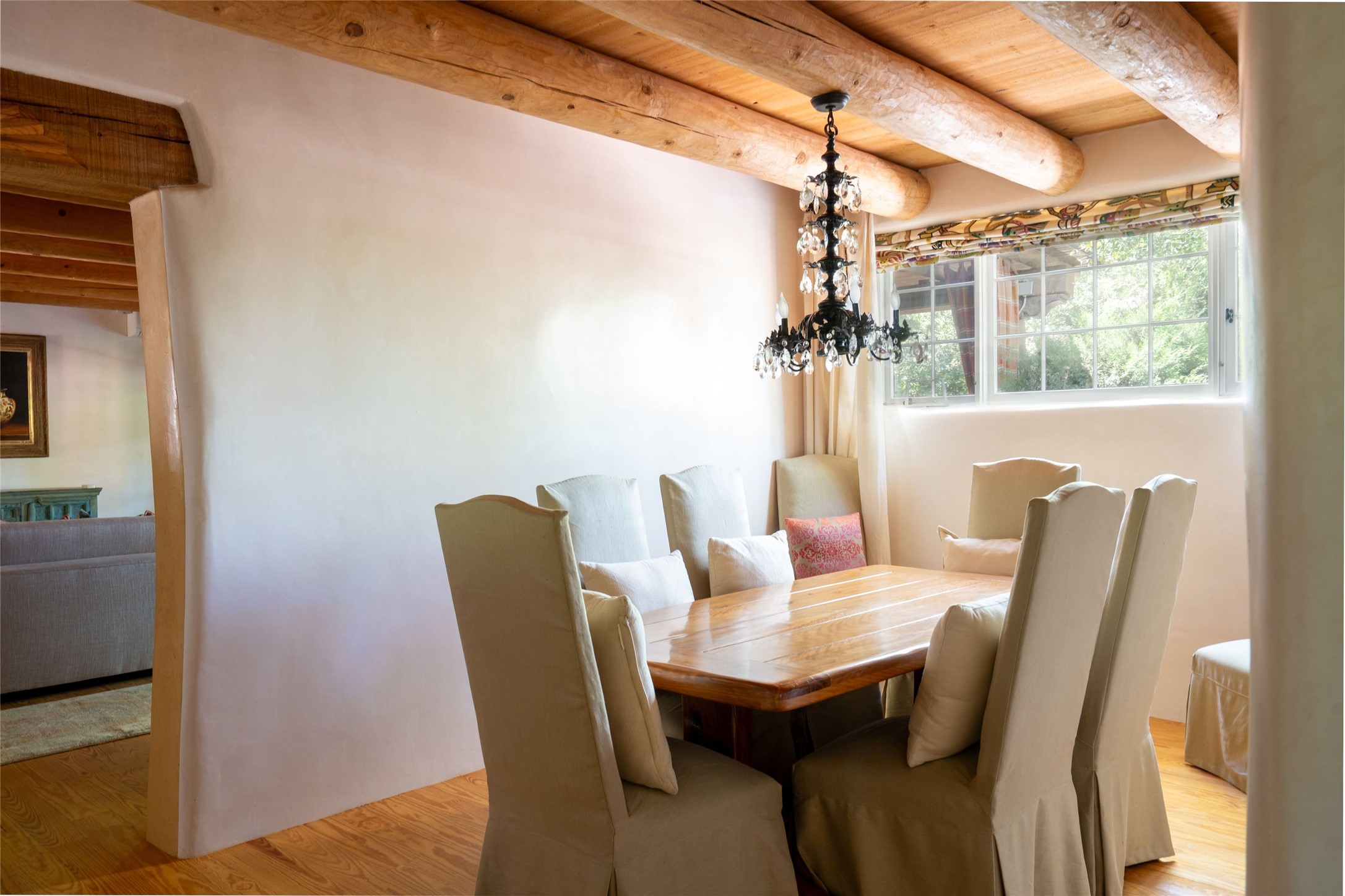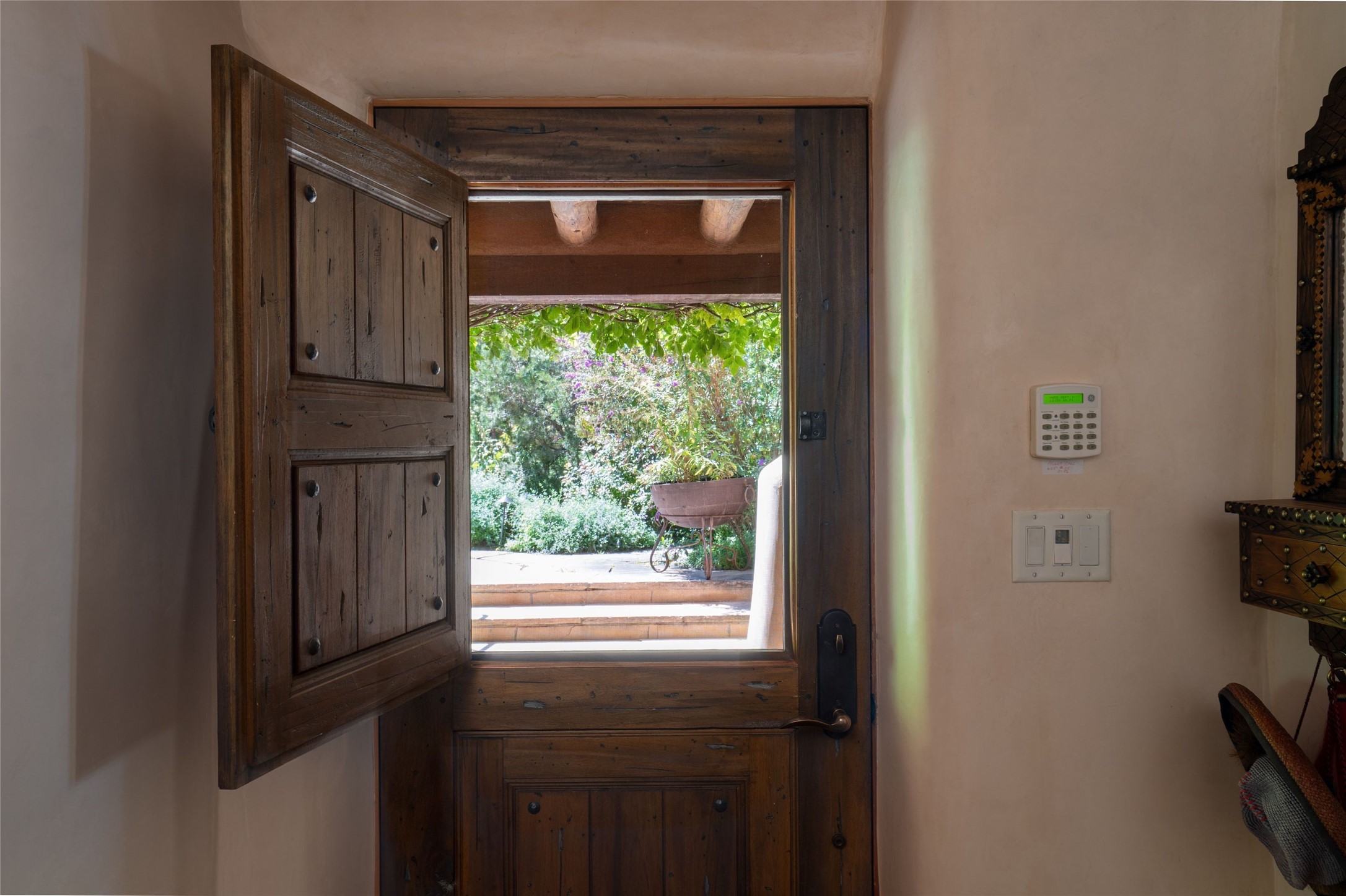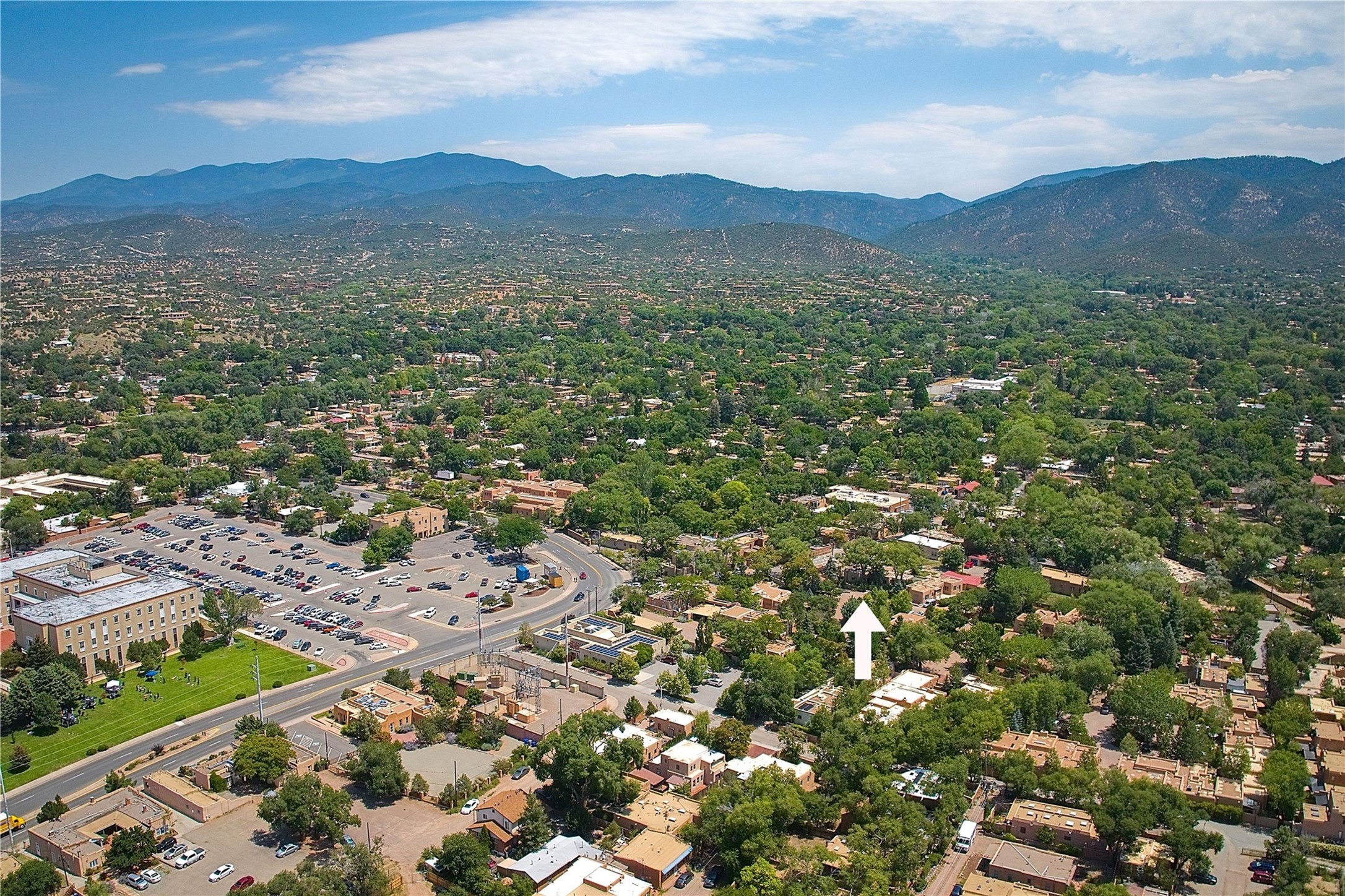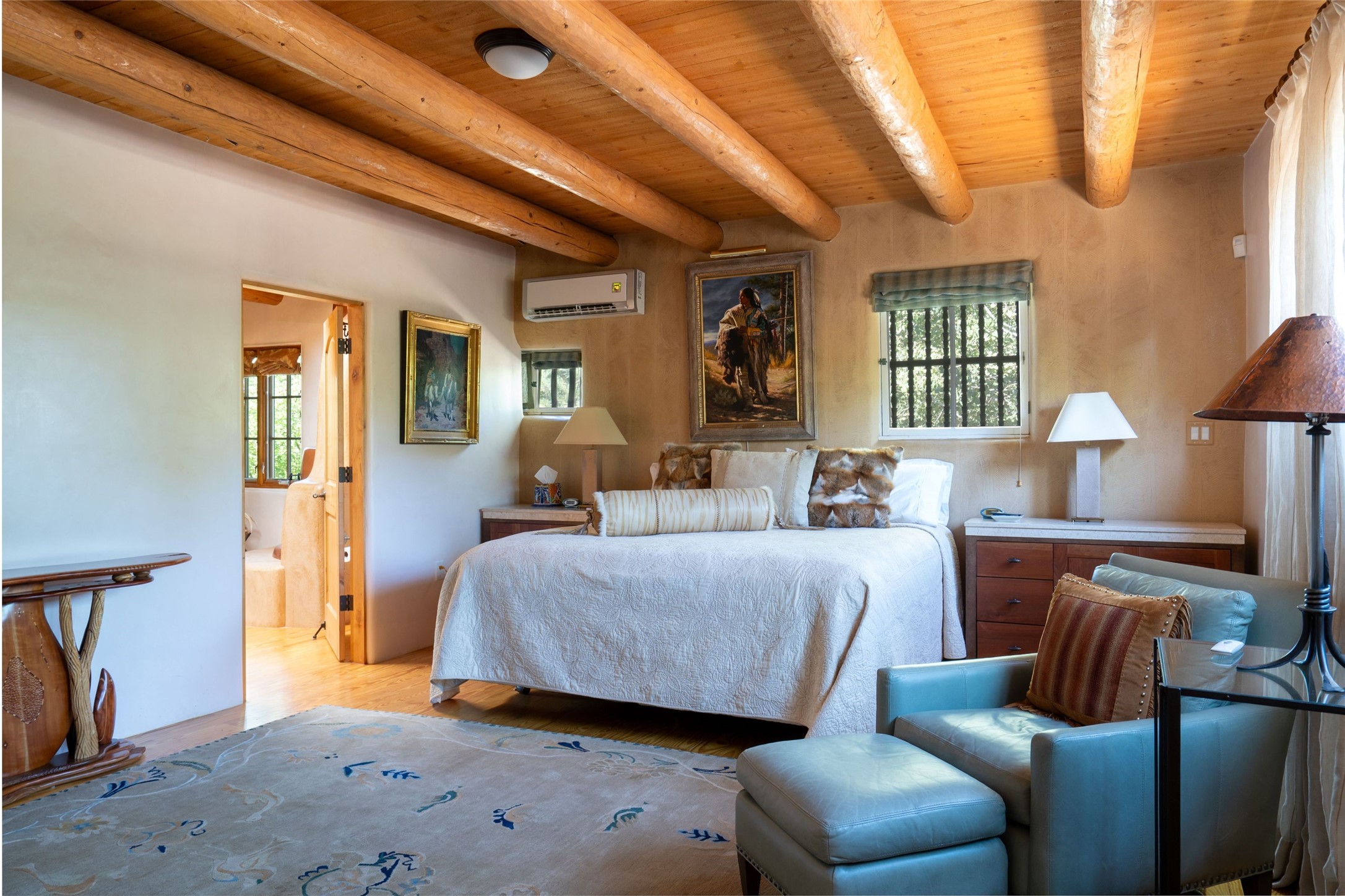Historic Eastside Plaza Chamisal home on two development rights double lot creating an extra-large property that offers not one, but two breathtaking, lush entertainment areas that are simply irresistible for vibrant gatherings and luxurious living. This 3 bedroom, 3 bath residence, originally constructed in the 1930s by the legendary aviatrix Katherine Stinson Otero, turned architect, has undergone a breathtaking transformation. With an award-winning remodel completed in 2004 by the talented Lloyd Martinez of Sage Builders and architect Wayne Lloyd, this once humble carriage house is now a rare jewel. The custom kitchen features a hooded Wolf range with mosaic tile backsplash and gas kiva fireplace. The spacious primary suite with walk out to a rooftop deck and a large ensuite with soaking tub and kiva fireplace, is a year-round retreat. The third bedroom provides flexibility for office or workout space. Exquisite details throughout reflect the craftsmanship of master artisans, including Venetian plaster finish walls, wood floors, stunning mosaic tile stair risers, vigas, and carved wood accents. Exterior spaces extend living to the outdoors with two large, verdant entertainment spaces, multiple seating areas, fire pit, and 2 fountains, perfect for hosting gatherings or simply enjoying the serenity of your surroundings. Newer roof (2022), rooftop deck rebuilt and refinished in 2025 and two dedicated parking spots. Rare opportunity to own a piece of history in Santa Fe