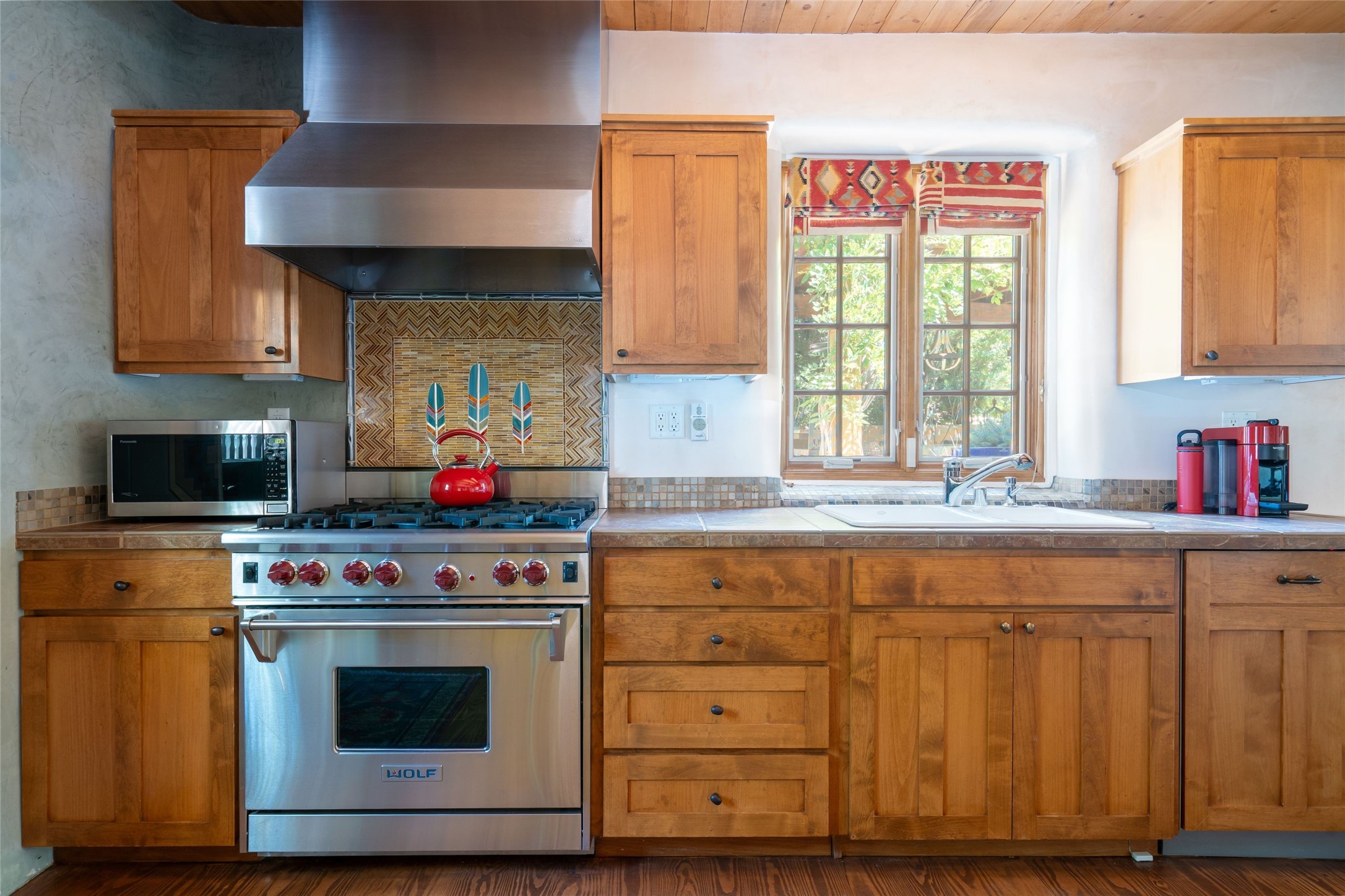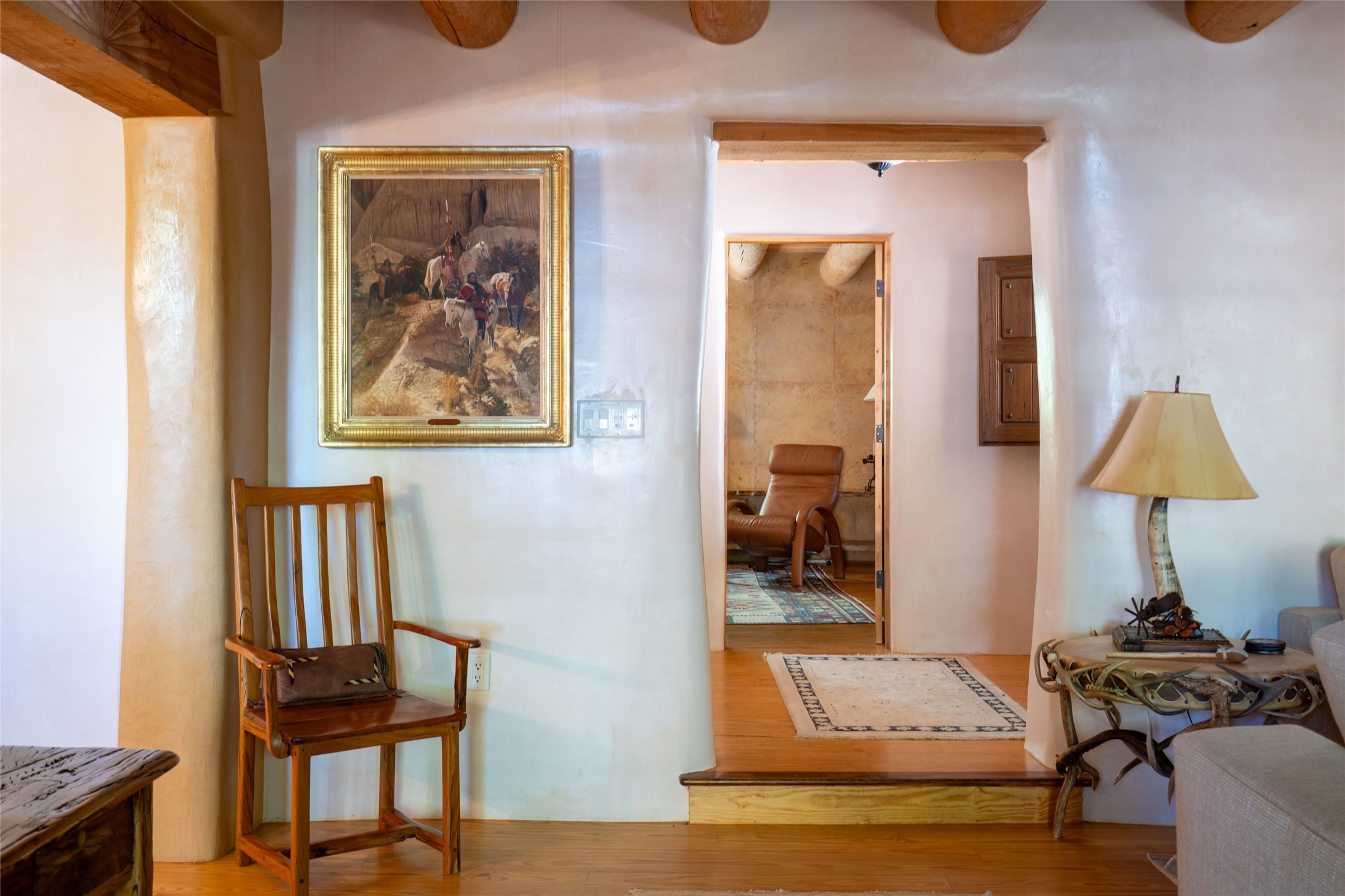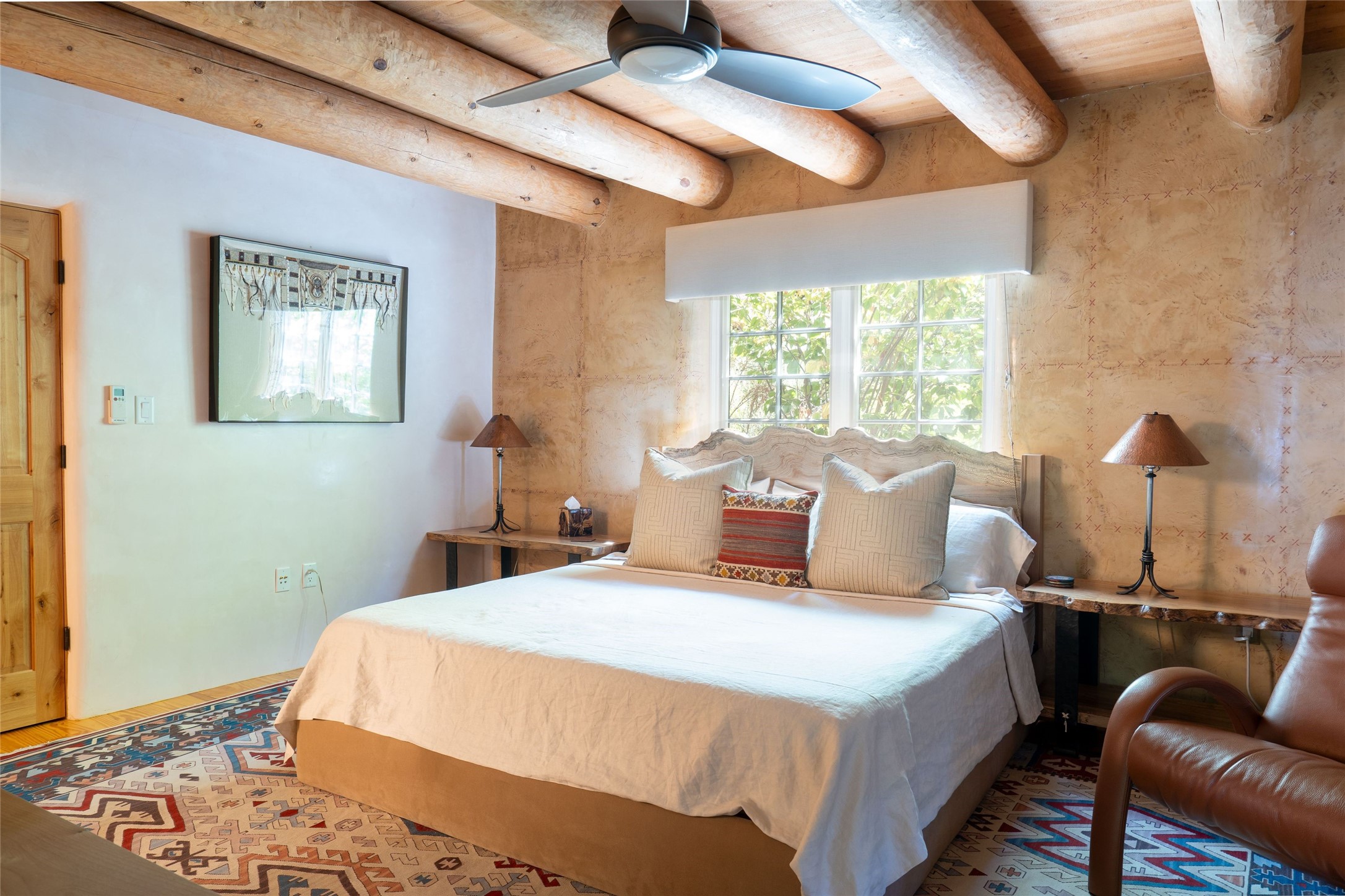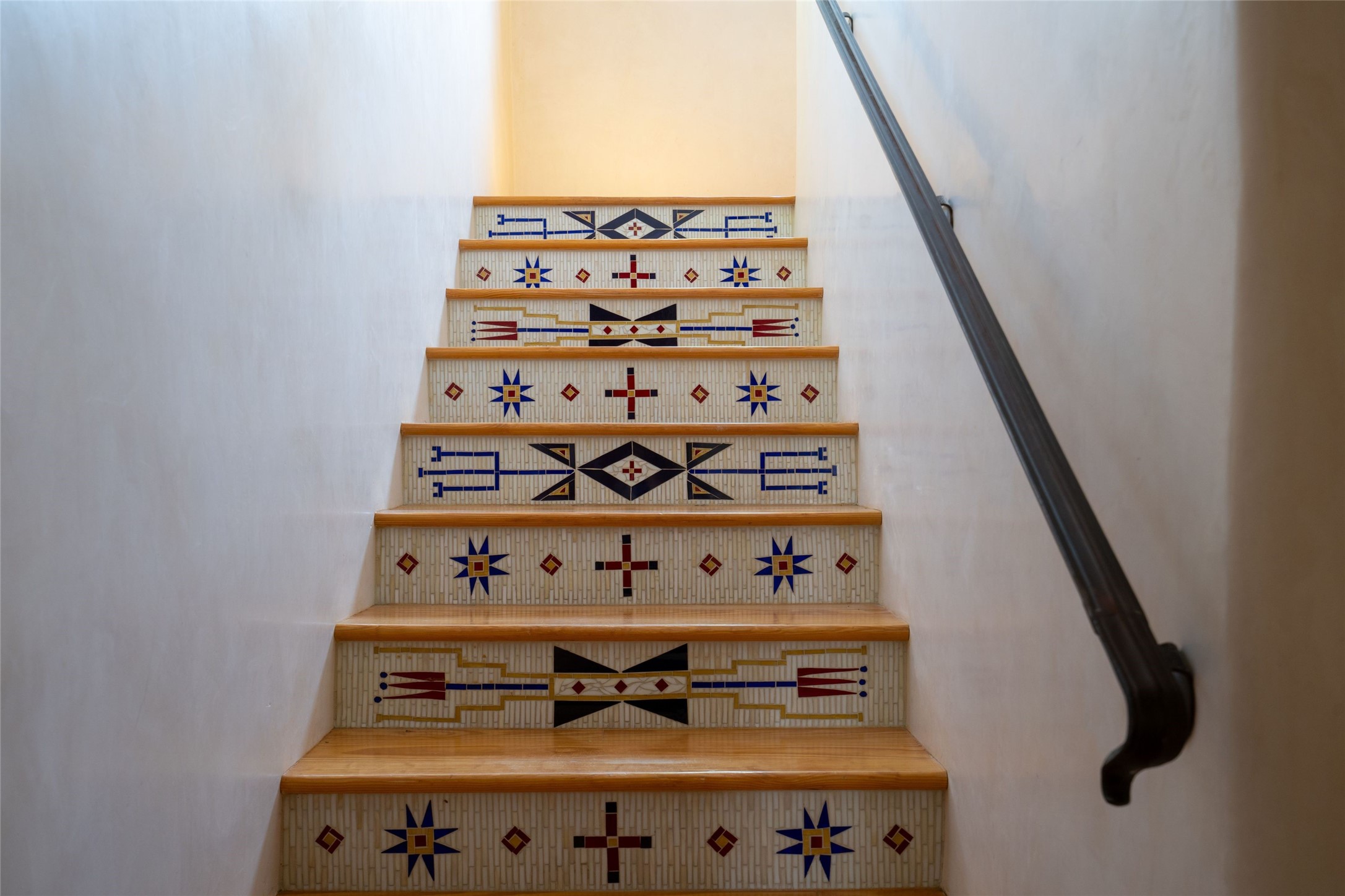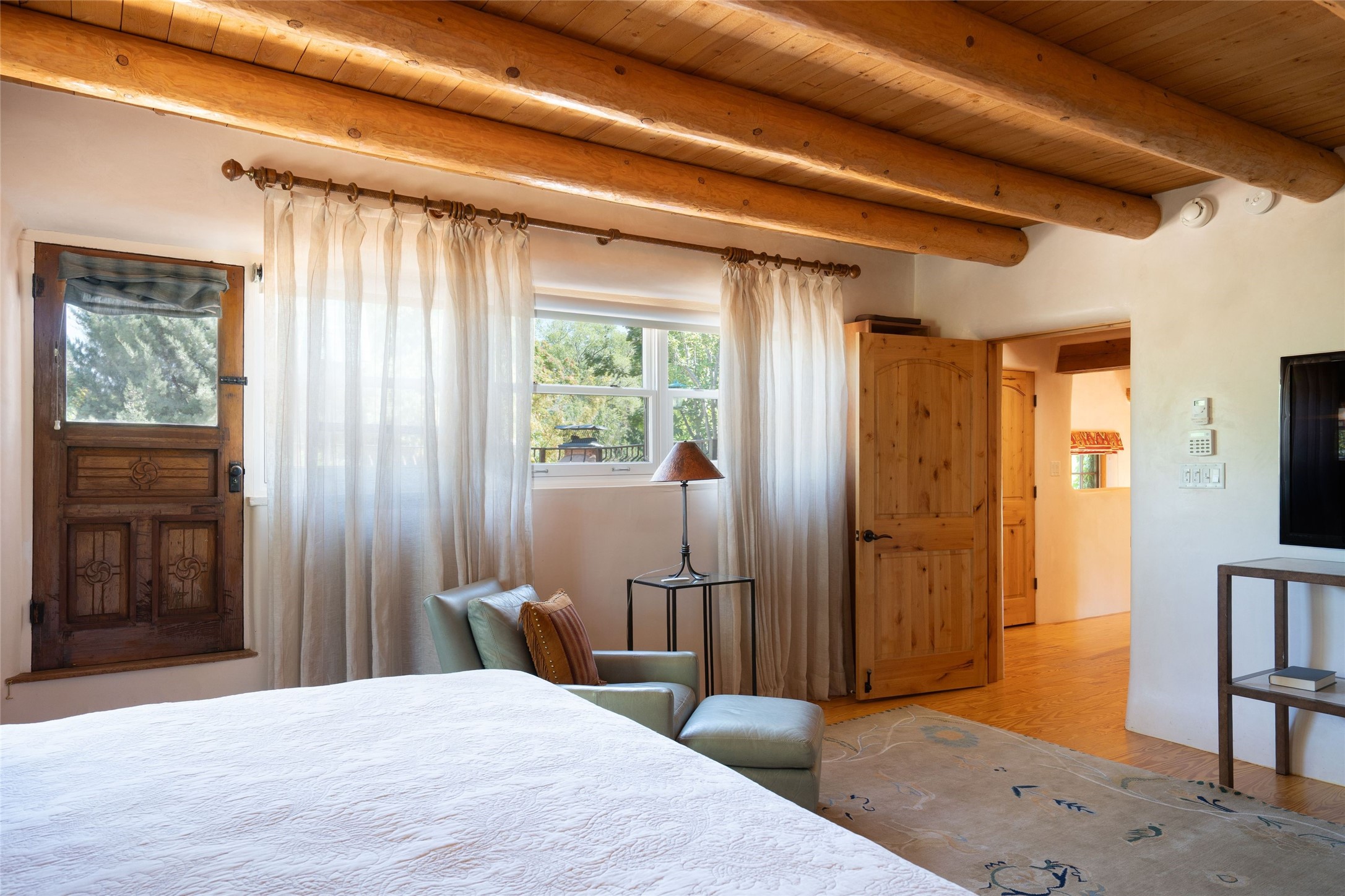 Historic Eastside Plaza Chamisal home on two development rights double lot creating an extra-large property that offers not one, but two breathtaking, lush entertainment areas that are simply irresistible for vibrant gatherings and luxurious living. This 3 bedroom, 3 bath residence, originally constructed in the 1930s by the legendary aviatrix Katherine Stinson Otero, turned architect, has undergone a breathtaking transformation. With an award-winning remodel completed in 2004 by the talented Lloyd Martinez of Sage Builders and architect Wayne Lloyd, this once humble carriage house is now a rare jewel. The custom kitchen features a hooded Wolf range with mosaic tile backsplash and gas kiva fireplace. The spacious primary suite with walk out to a rooftop deck and a large ensuite with soaking tub and kiva fireplace, is a year-round retreat. The third bedroom provides flexibility for office or workout space. Exquisite details throughout reflect the craftsmanship of master artisans, including Venetian plaster finish walls, wood floors, stunning mosaic tile stair risers, vigas, and carved wood accents. Exterior spaces extend living to the outdoors with two large, verdant entertainment spaces, multiple seating areas, fire pit, and 2 fountains, perfect for hosting gatherings or simply enjoying the serenity of your surroundings. Newer roof (2022), rooftop deck rebuilt and refinished in 2025 and two dedicated parking spots. Rare opportunity to own a piece of history in Santa Fe
