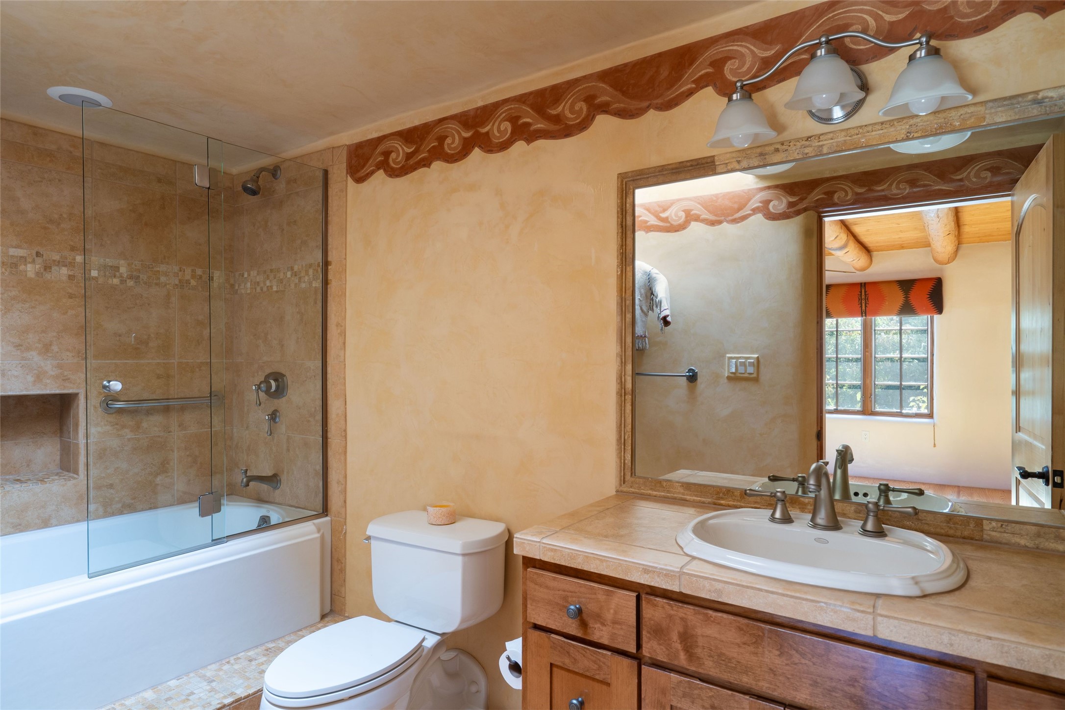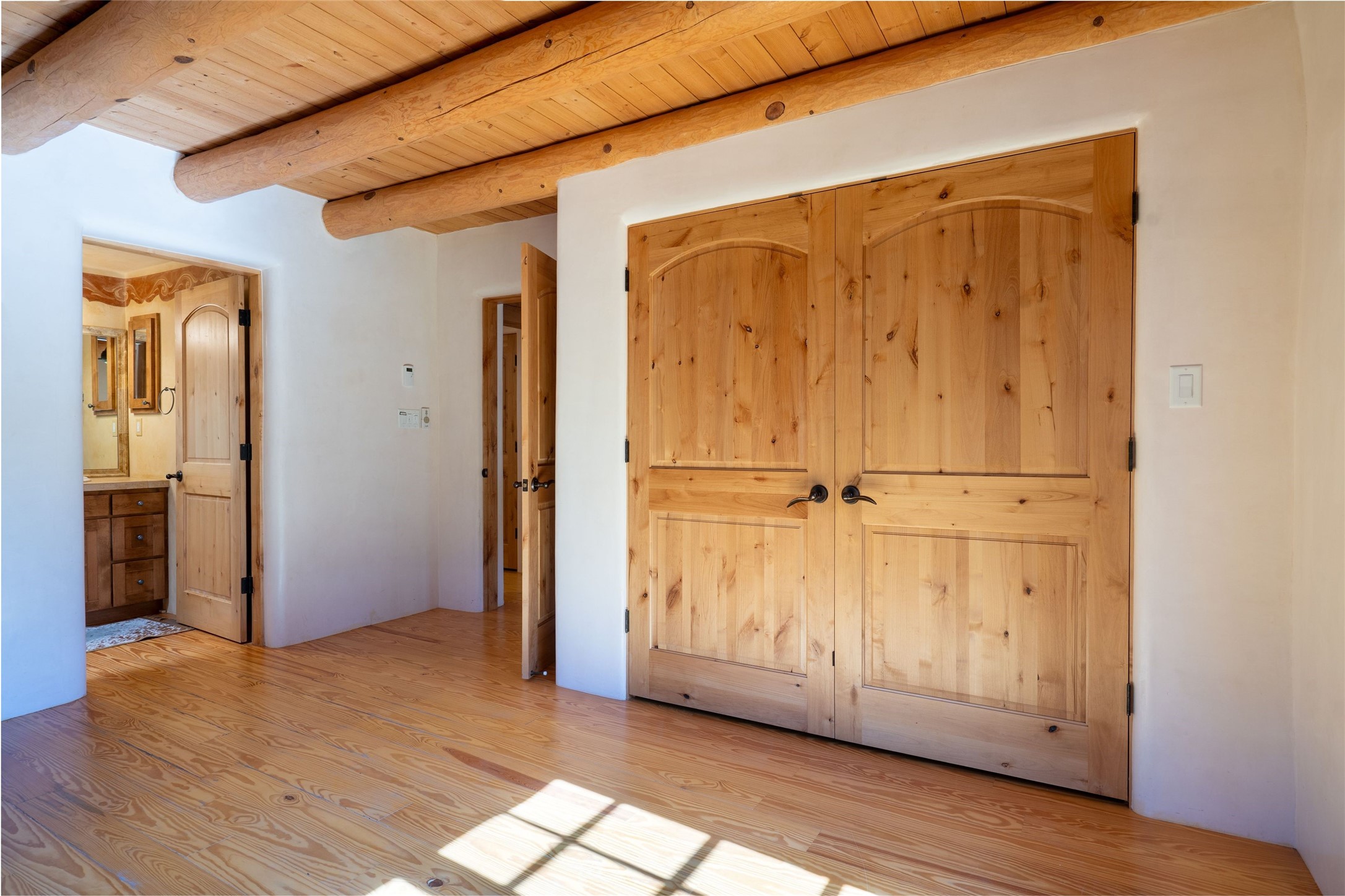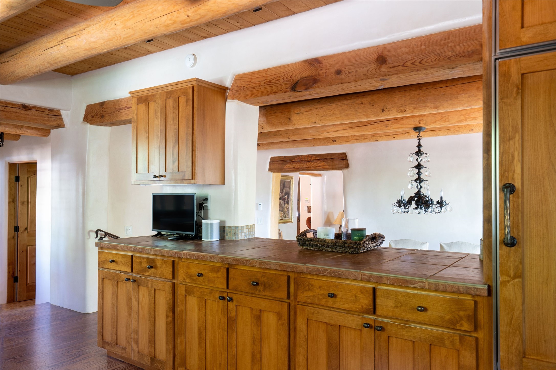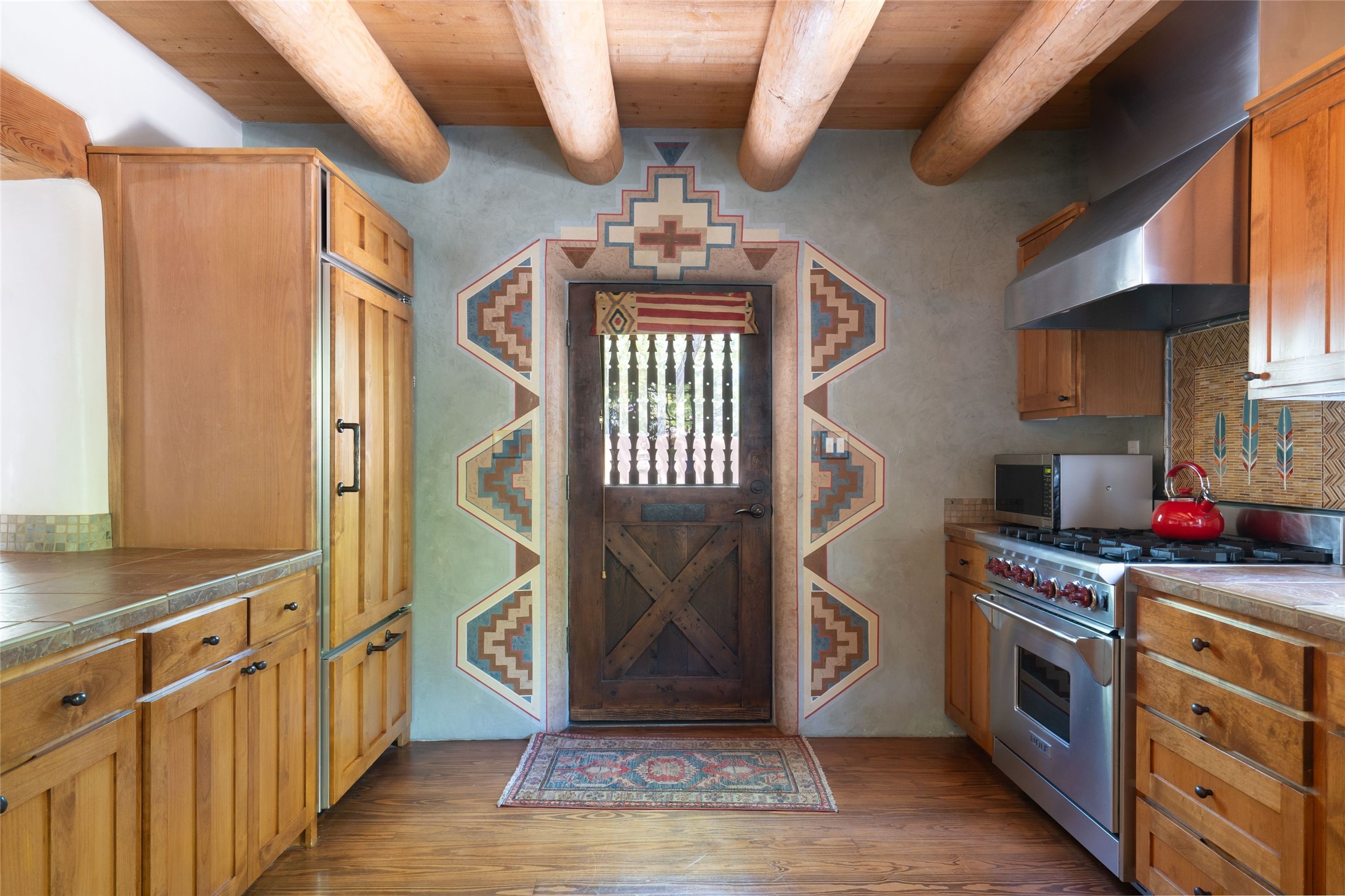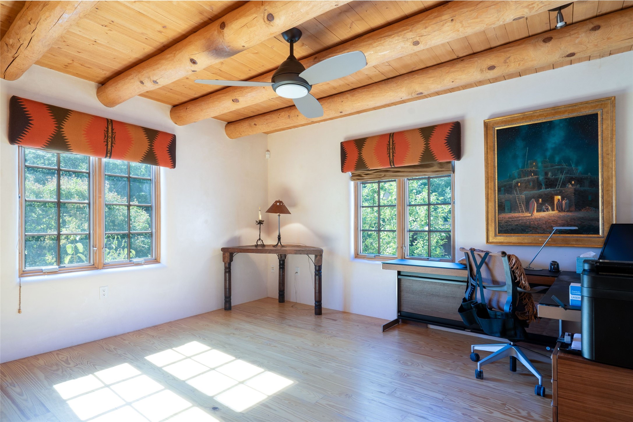 Historic Eastside Plaza Chamisal home on two development rights double lot creating an extra-large property that offers not one, but two breathtaking, lush entertainment areas that are simply irresistible for vibrant gatherings and luxurious living. This 3 bedroom, 3 bath residence, originally constructed in the 1930s by the legendary aviatrix Katherine Stinson Otero, turned architect, has undergone a breathtaking transformation. With an award-winning remodel completed in 2004 by the talented Lloyd Martinez of Sage Builders and architect Wayne Lloyd, this once humble carriage house is now a rare jewel. The custom kitchen features a hooded Wolf range with mosaic tile backsplash and gas kiva fireplace. The spacious primary suite with walk out to a rooftop deck and a large ensuite with soaking tub and kiva fireplace, is a year-round retreat. The third bedroom provides flexibility for office or workout space. Exquisite details throughout reflect the craftsmanship of master artisans, including Venetian plaster finish walls, wood floors, stunning mosaic tile stair risers, vigas, and carved wood accents. Exterior spaces extend living to the outdoors with two large, verdant entertainment spaces, multiple seating areas, fire pit, and 2 fountains, perfect for hosting gatherings or simply enjoying the serenity of your surroundings. Newer roof (2022), rooftop deck rebuilt and refinished in 2025 and two dedicated parking spots. Rare opportunity to own a piece of history in Santa Fe