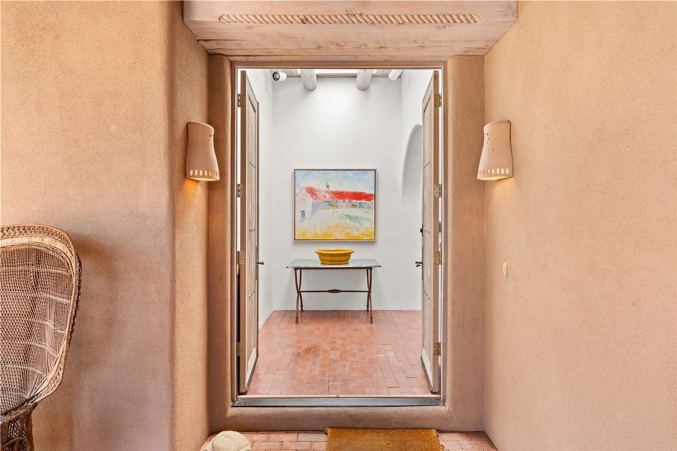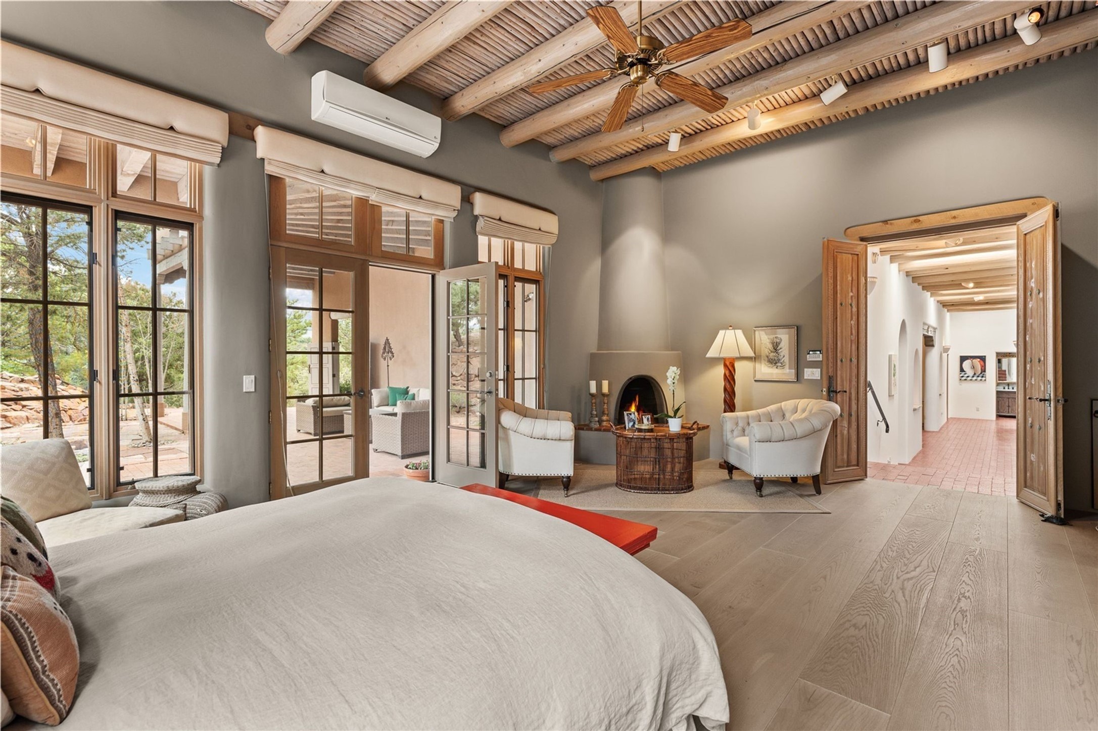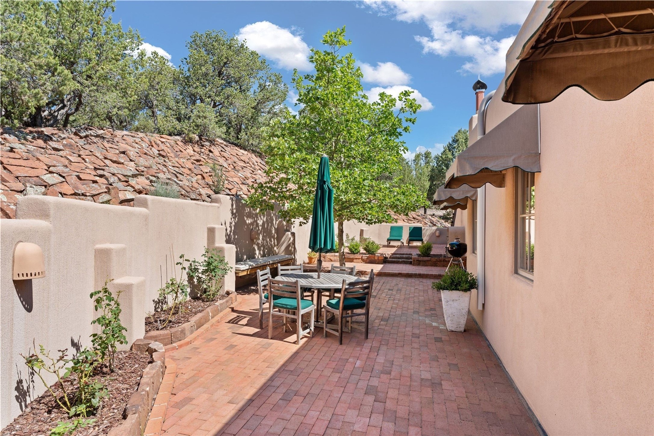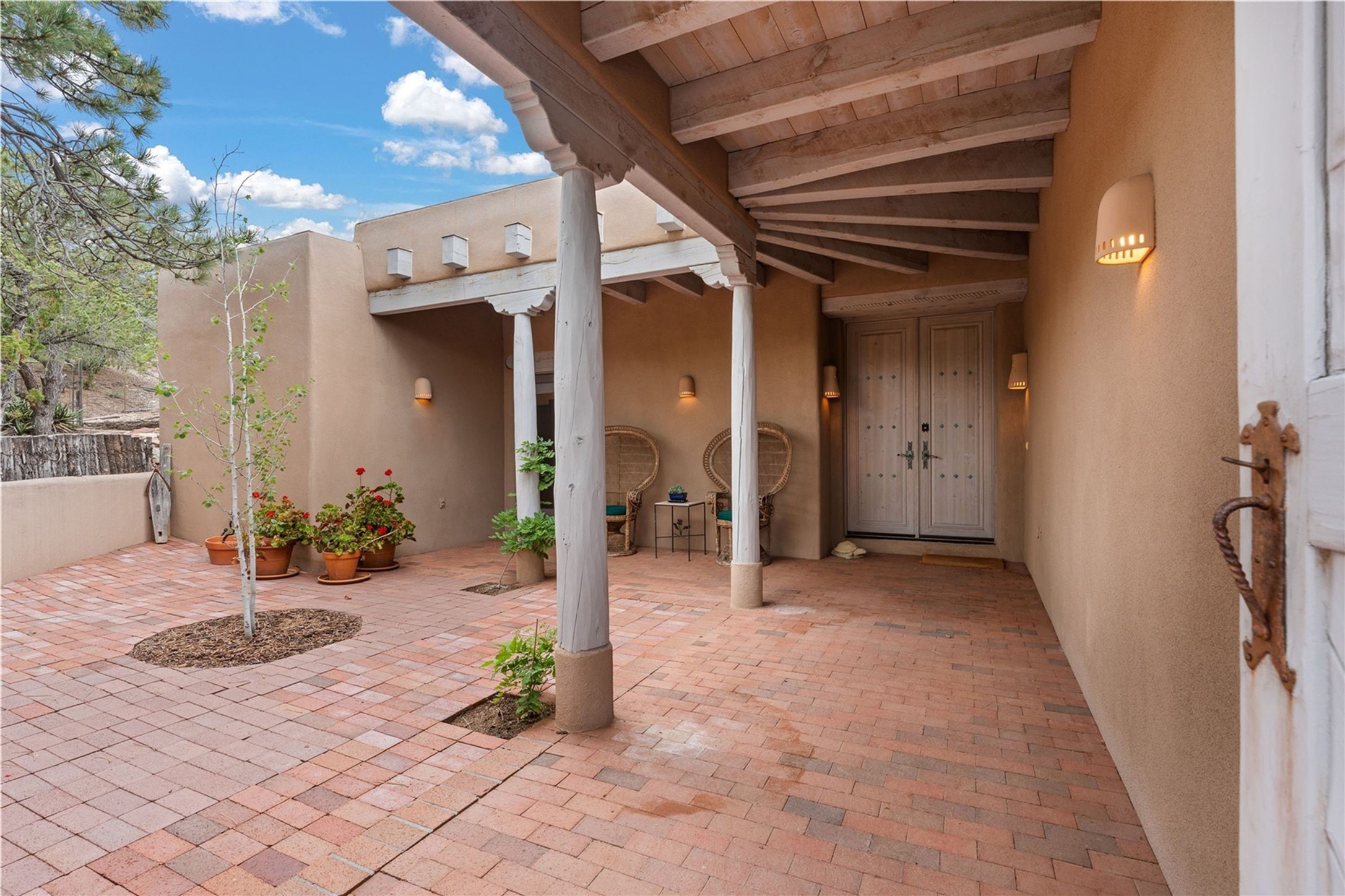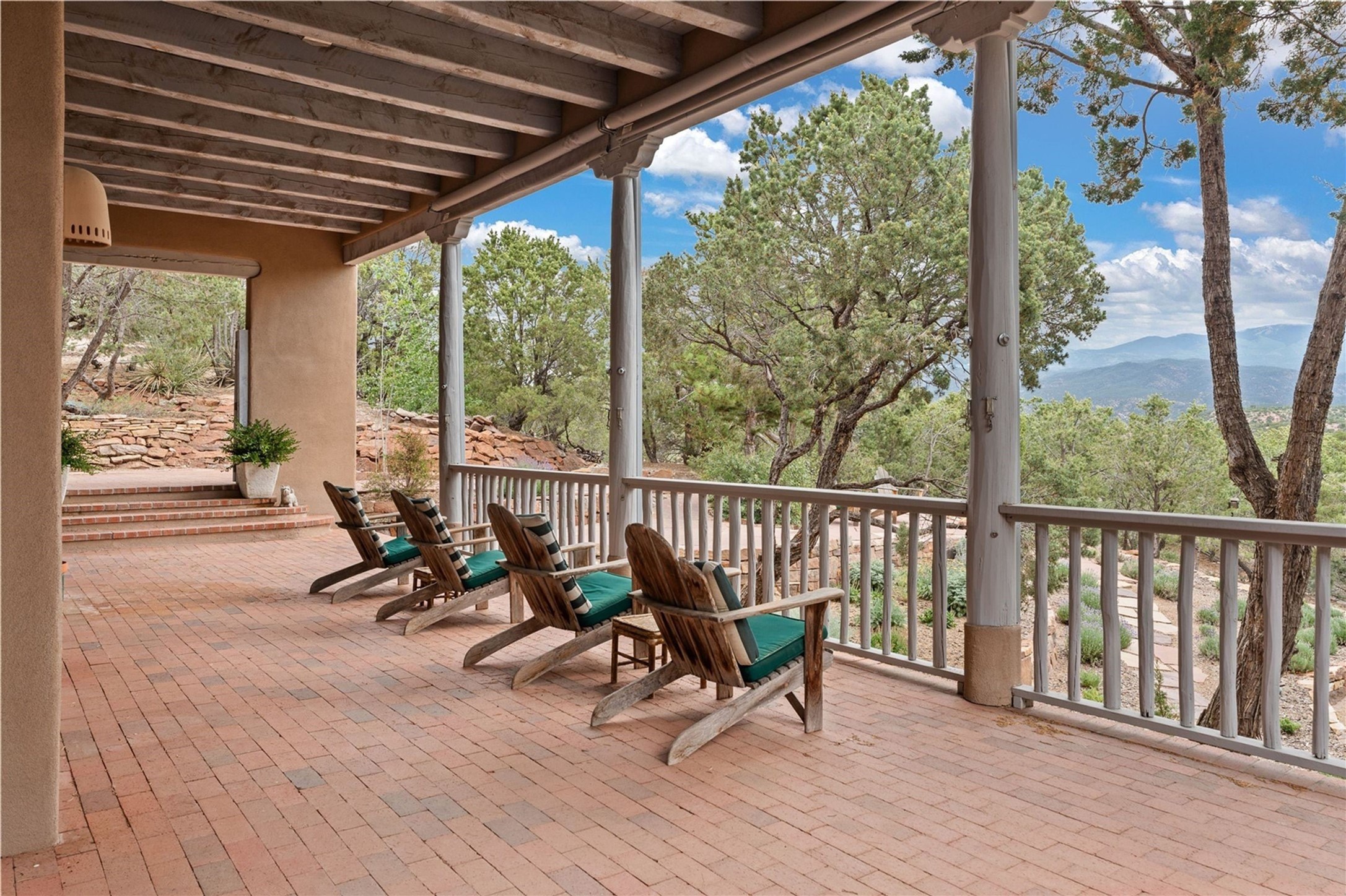 Gated Sangre de Cristo Estates 3 bedroom, 3.5 bath, single level, custom-built home with spectacular Sangre de Cristo Mountain views. Quality design features throughout include high ceilings, spacious rooms, vigas and beams, wood and brick floors, diamond finish plaster walls and arched doorways. Many recent improvements such as new (2023) membrane roof, completely renovated kitchen and baths, and brick driveways. Light and airy living room with stately fireplace. Spacious gourmet kitchen with high-end Bosch appliances, center island with Wolf gas range top, plentiful cabinetry and an informal breakfast room. Dining room with French doors and built in cabinetry. Dedicated personal library with a wood burning kiva fireplace and French doors to the outside in addition to a second living area or media room. There are 3-bedroom suites set apart from one another. Primary suite includes a kiva fireplace, sitting area and a wall of doors to the outside. Bonus flex space can be a personal gym or office. 2-car attached garage. The deep portals provide space for large events or leisurely relaxation in a secluded setting among mature pinons and aspens, established landscaping, and sweeping mountain views. Conveniently located with easy access to 84/285 and only minutes away from the Santa Fe Opera and the historic downtown Plaza.
