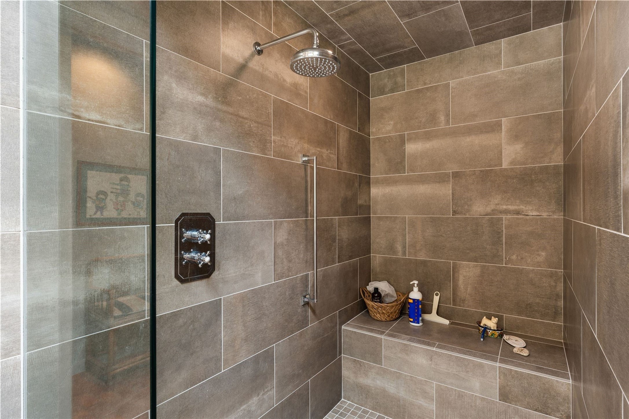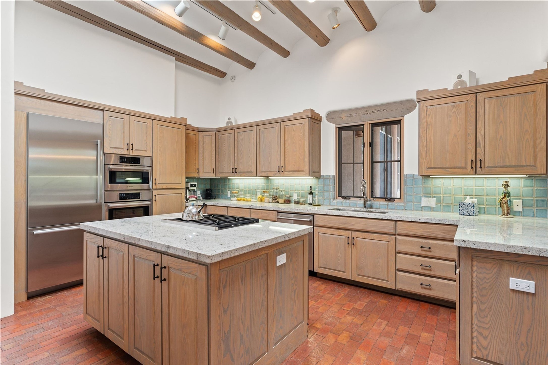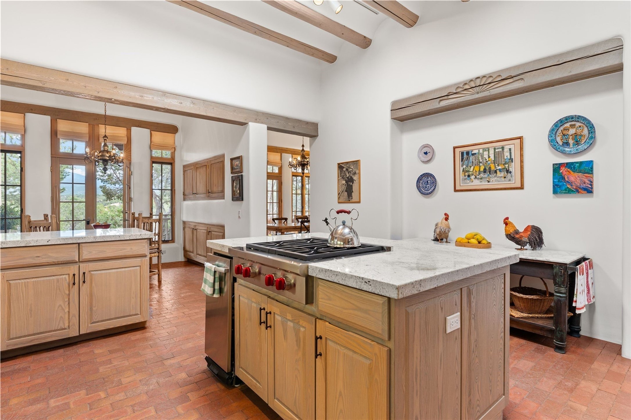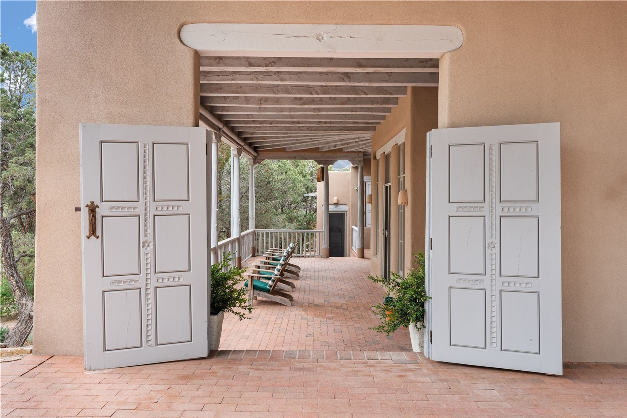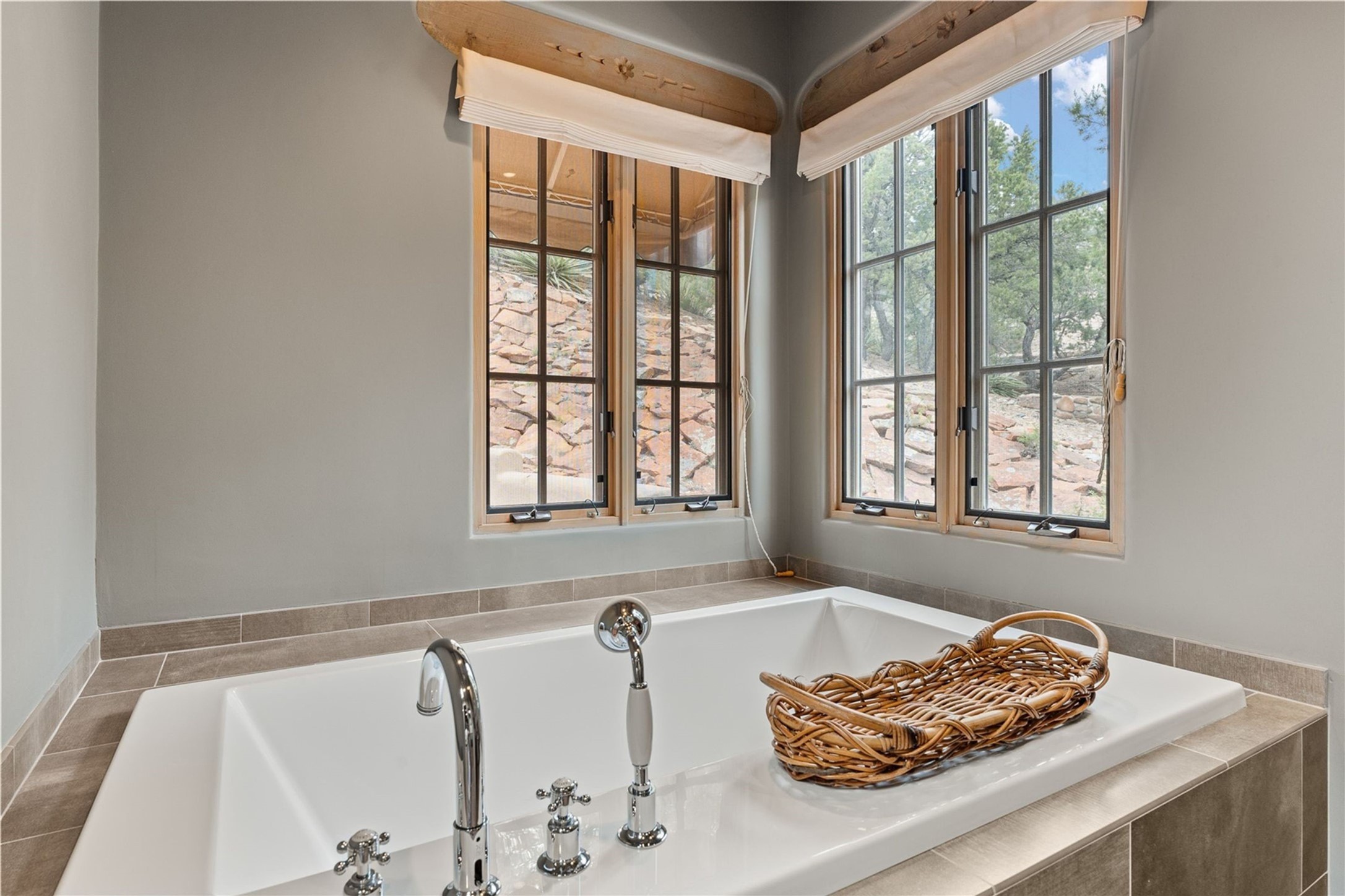 Gated Sangre de Cristo Estates 3 bedroom, 3.5 bath, single level, custom-built home with spectacular Sangre de Cristo Mountain views. Quality design features throughout include high ceilings, spacious rooms, vigas and beams, wood and brick floors, diamond finish plaster walls and arched doorways. Many recent improvements such as new (2023) membrane roof, completely renovated kitchen and baths, and brick driveways. Light and airy living room with stately fireplace. Spacious gourmet kitchen with high-end Bosch appliances, center island with Wolf gas range top, plentiful cabinetry and an informal breakfast room. Dining room with French doors and built in cabinetry. Dedicated personal library with a wood burning kiva fireplace and French doors to the outside in addition to a second living area or media room. There are 3-bedroom suites set apart from one another. Primary suite includes a kiva fireplace, sitting area and a wall of doors to the outside. Bonus flex space can be a personal gym or office. 2-car attached garage. The deep portals provide space for large events or leisurely relaxation in a secluded setting among mature pinons and aspens, established landscaping, and sweeping mountain views. Conveniently located with easy access to 84/285 and only minutes away from the Santa Fe Opera and the historic downtown Plaza.