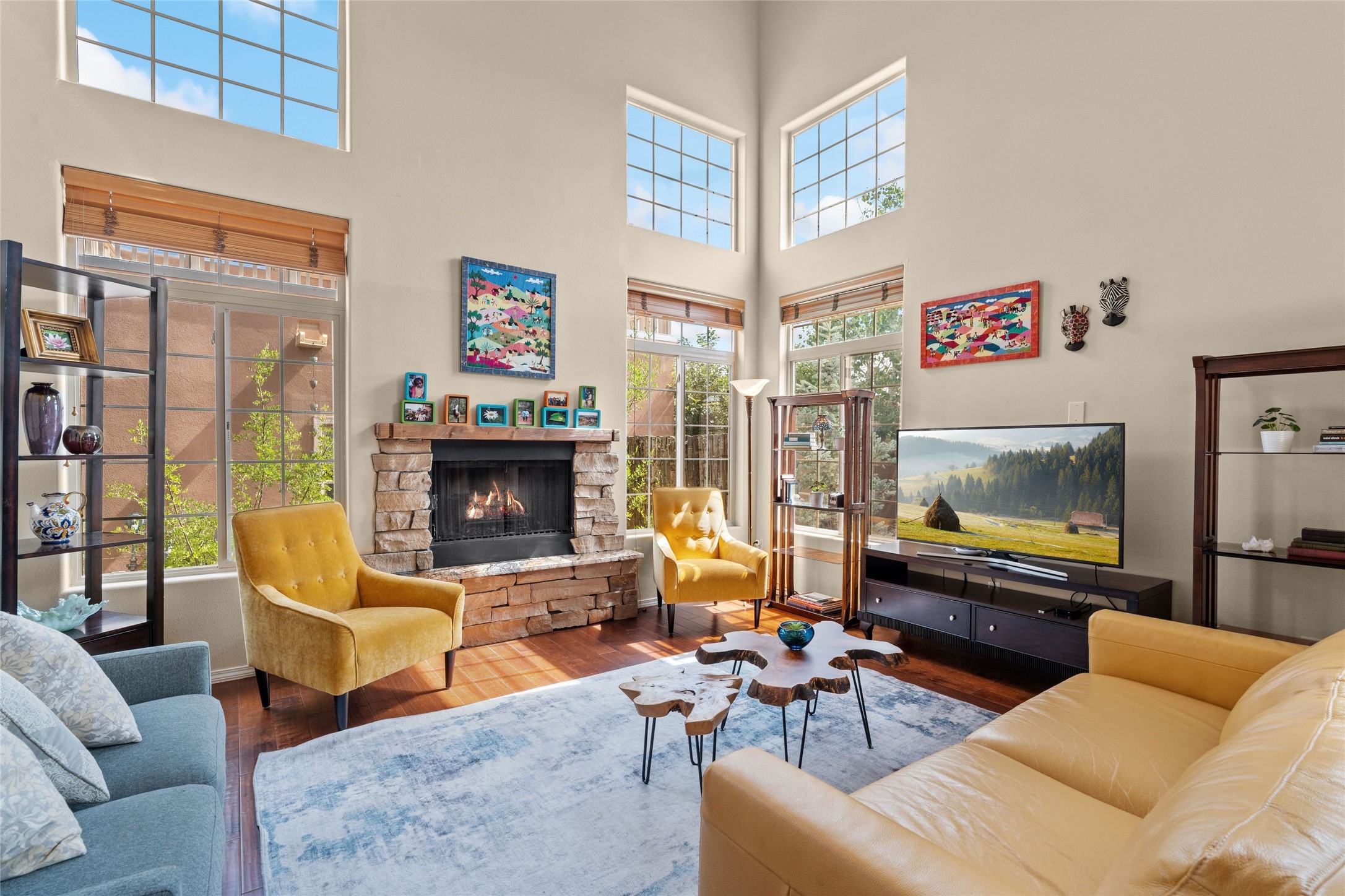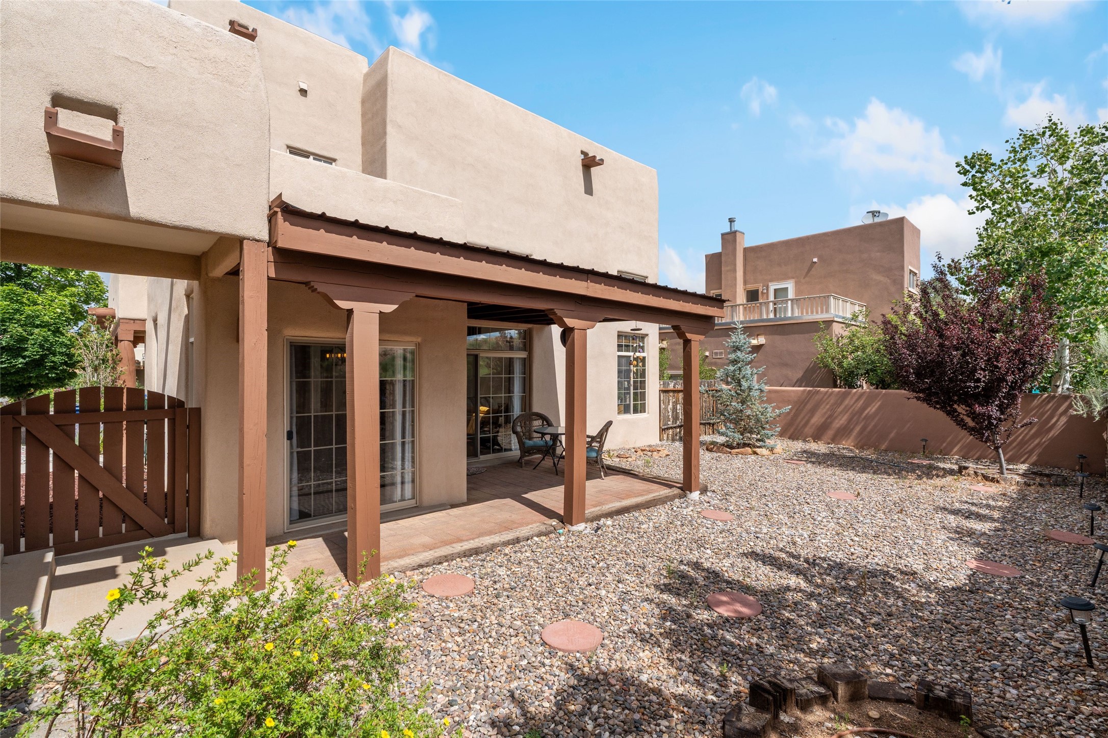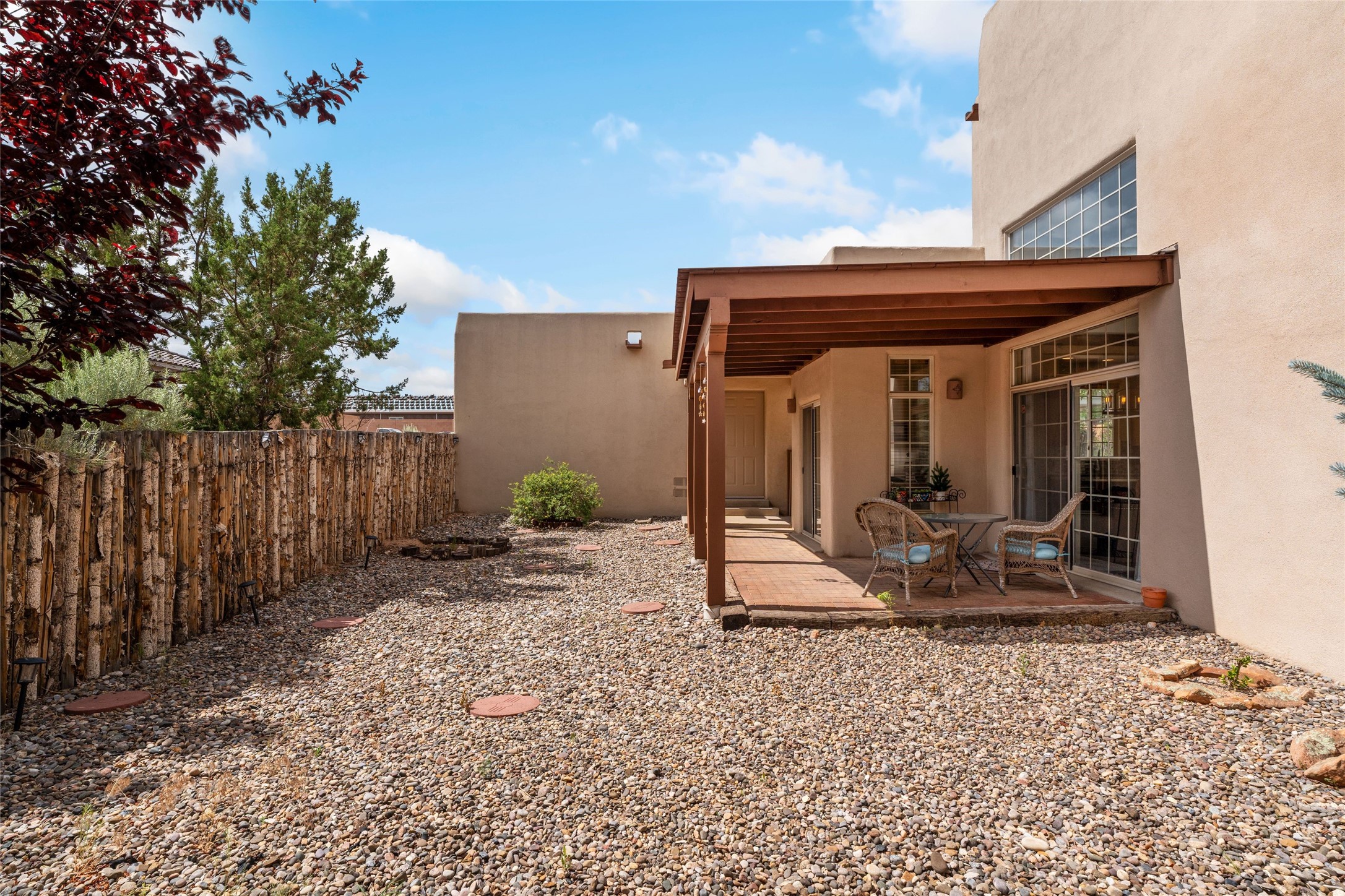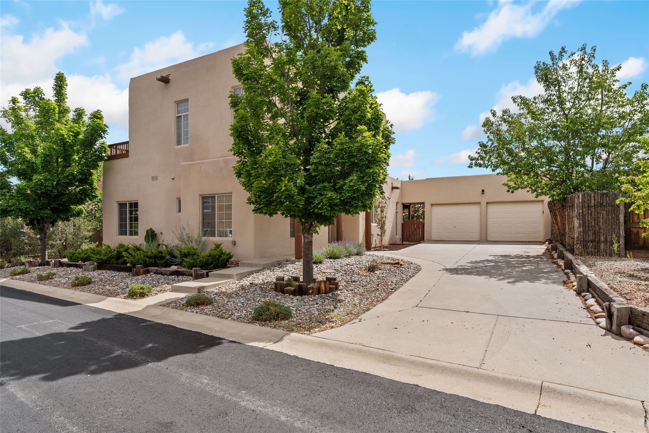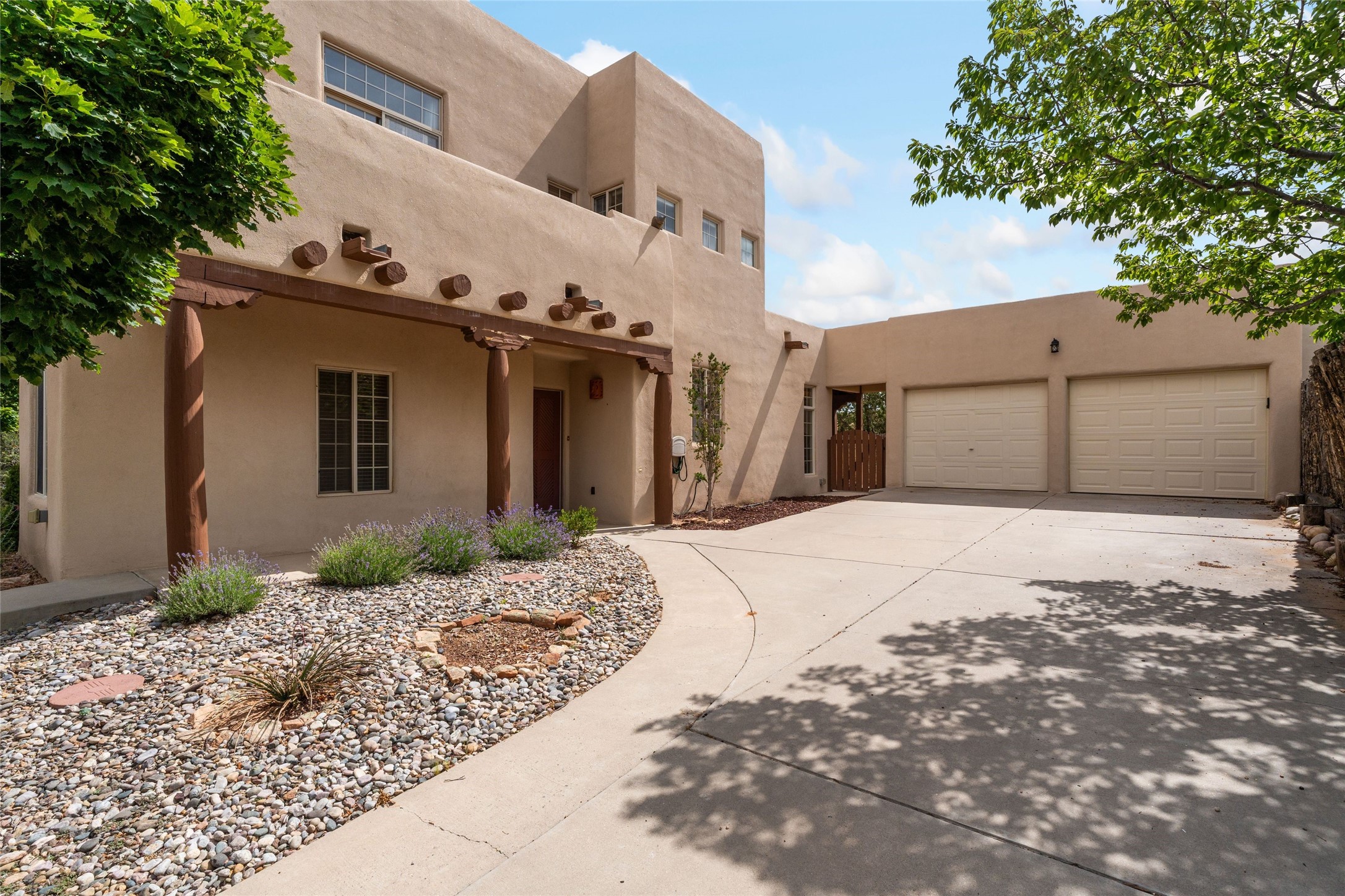 Attractive 3-bedroom, 2-bath residence in the desirable planned community of Nava Ade. Step inside to be greeted by soaring high ceilings and natural light streaming in through large windows. Elegant, stacked stone fireplace adds style to the living room. The kitchen is appointed with a spacious island, stainless steel appliances, and granite countertops. Retreat to the upstairs primary suite, offering a generous walk-in closet, two private balconies and a bathroom with a walk-in shower and a soaking tub. Guest rooms offer flex space as office, studio or exercise room. Detached 2-car garage with garage access from backyard. Enjoy the community's extensive walking trails and open spaces, along with amenities including a swimming pool, rejuvenating hot tub, a steam room, and a workout facility. Conveniently located near Santa Fe Community College and the Genoveva Chavez Community Center.