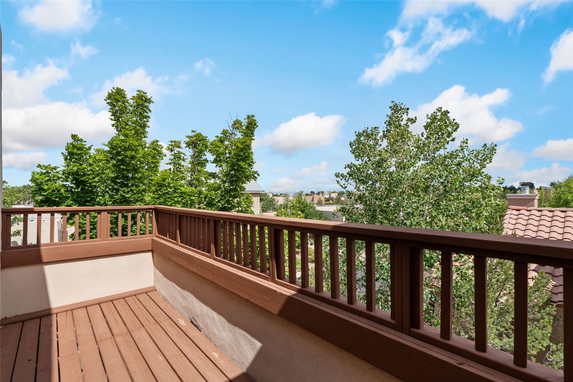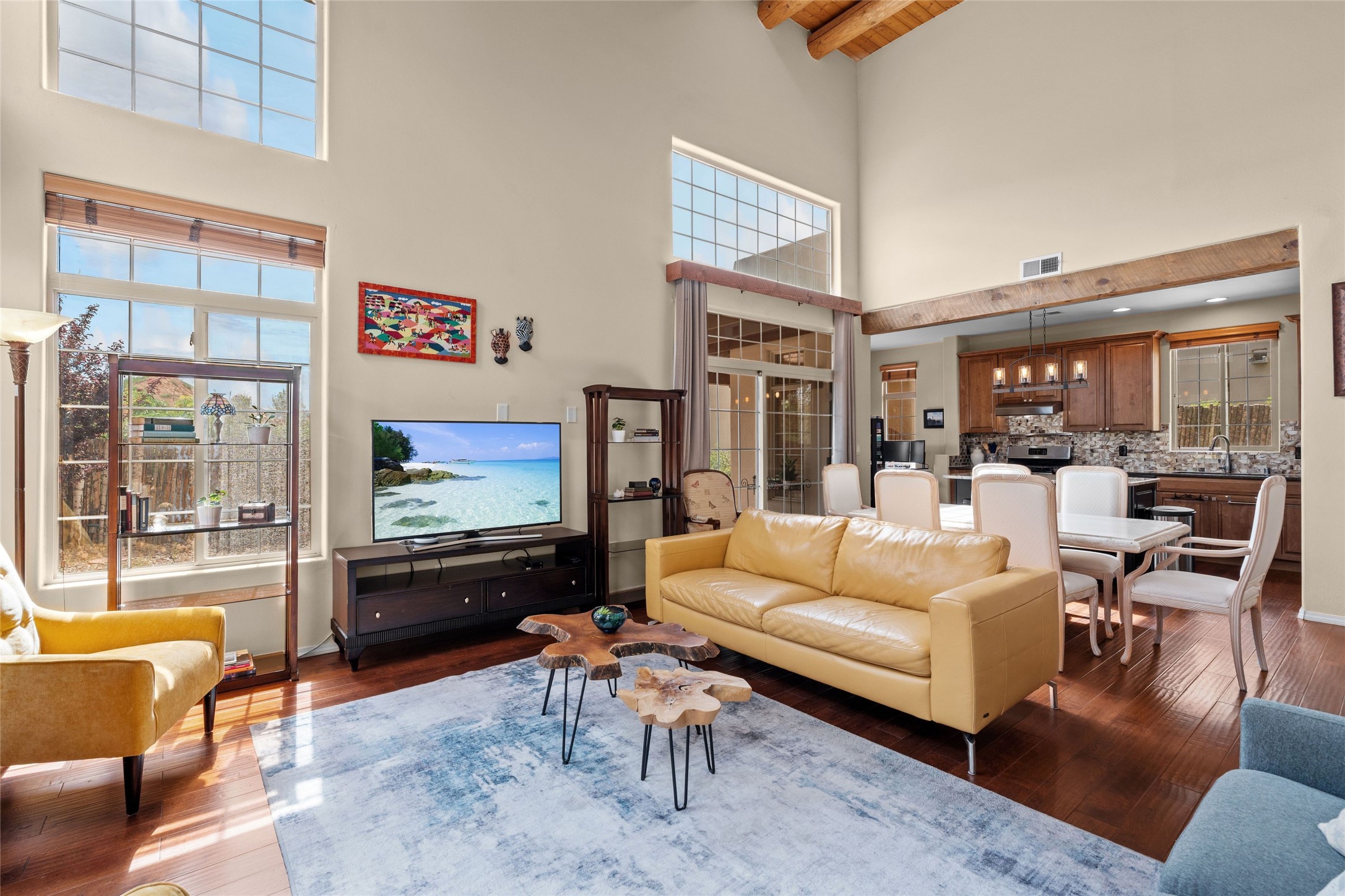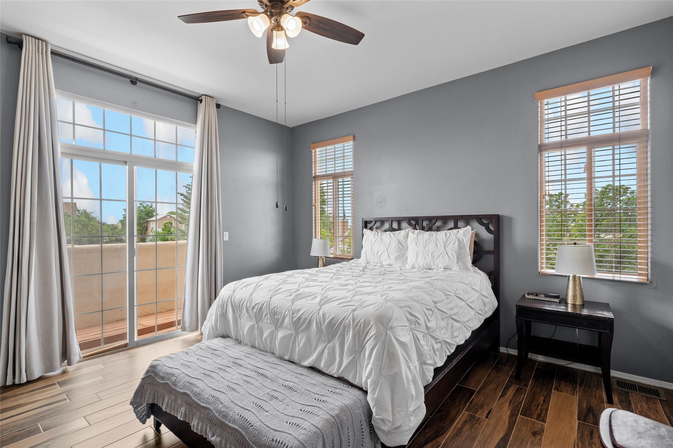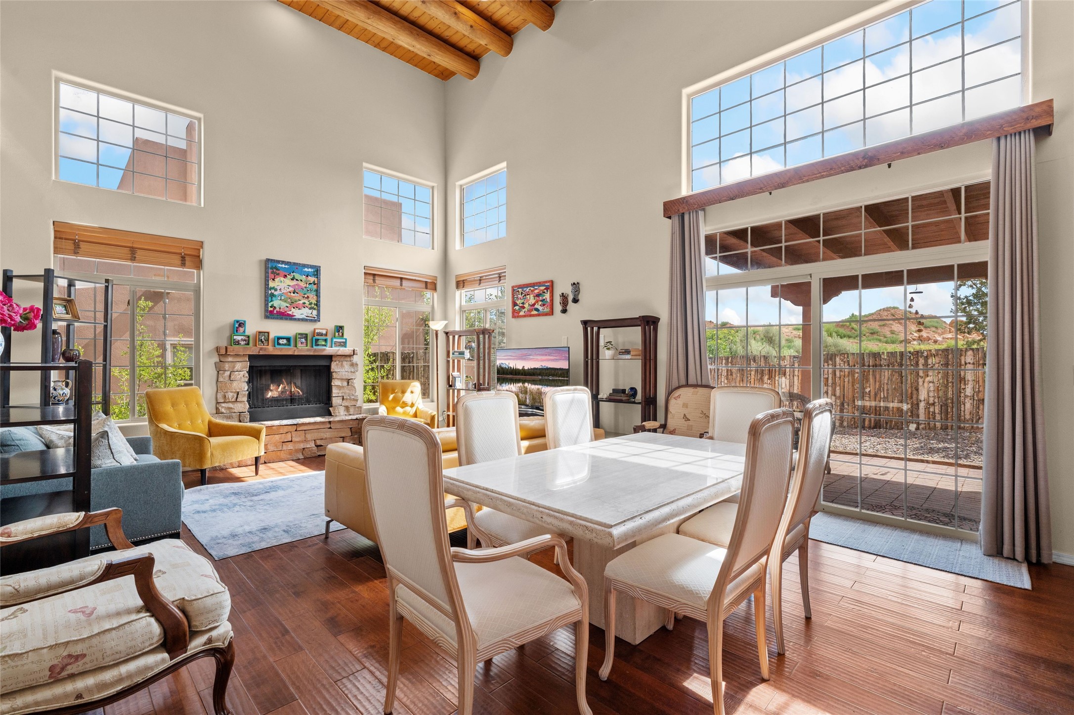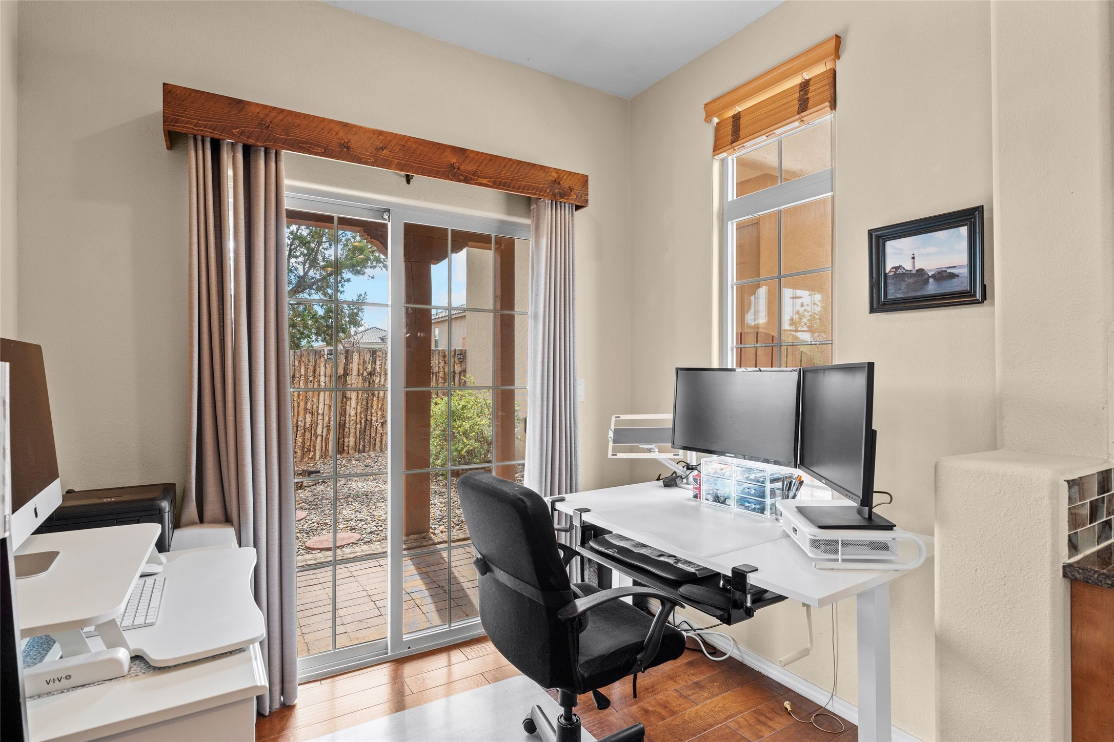 Attractive 3-bedroom, 2-bath residence in the desirable planned community of Nava Ade. Step inside to be greeted by soaring high ceilings and natural light streaming in through large windows. Elegant, stacked stone fireplace adds style to the living room. The kitchen is appointed with a spacious island, stainless steel appliances, and granite countertops. Retreat to the upstairs primary suite, offering a generous walk-in closet, two private balconies and a bathroom with a walk-in shower and a soaking tub. Guest rooms offer flex space as office, studio or exercise room. Detached 2-car garage with garage access from backyard. Enjoy the community's extensive walking trails and open spaces, along with amenities including a swimming pool, rejuvenating hot tub, a steam room, and a workout facility. Conveniently located near Santa Fe Community College and the Genoveva Chavez Community Center.